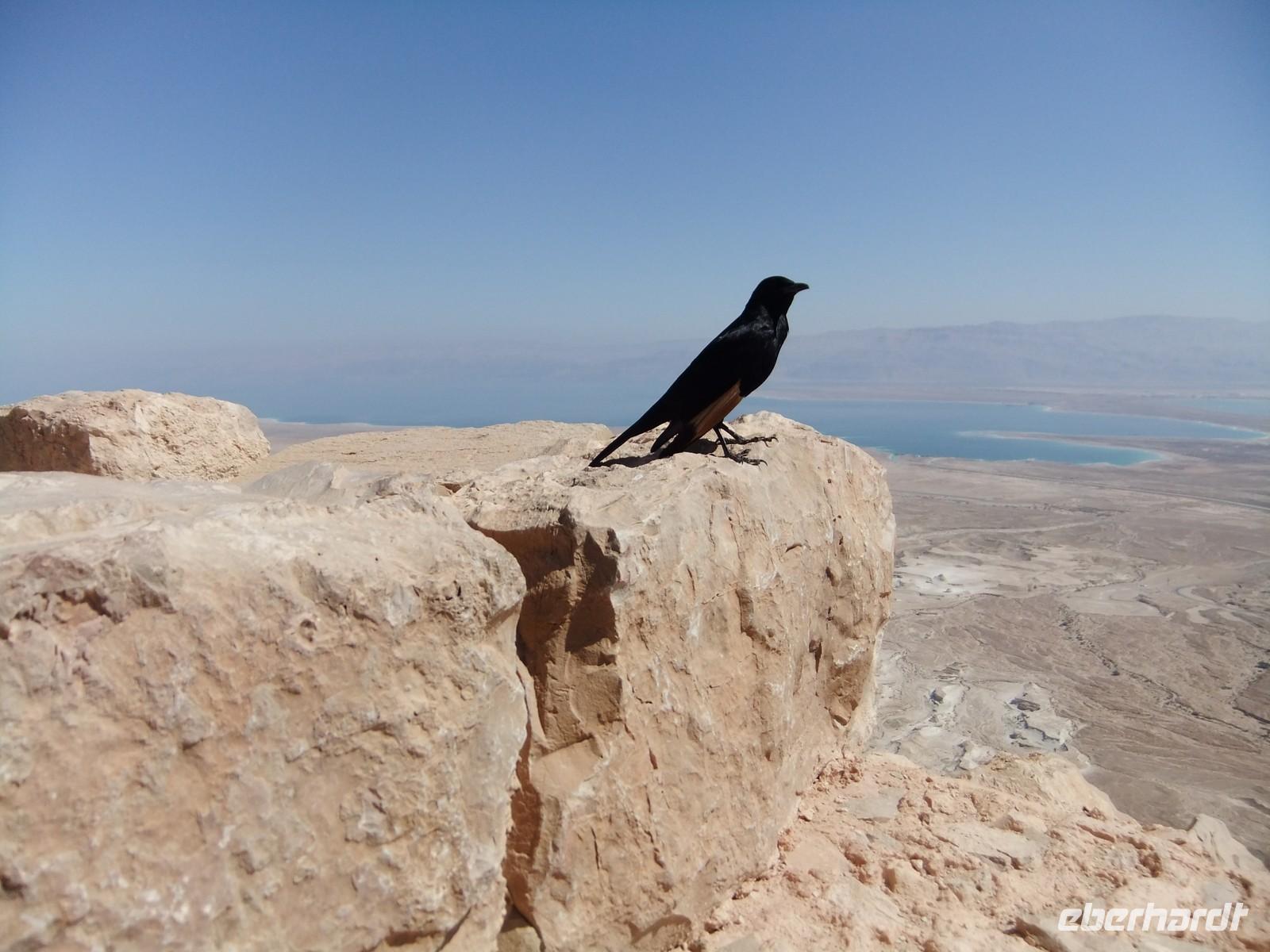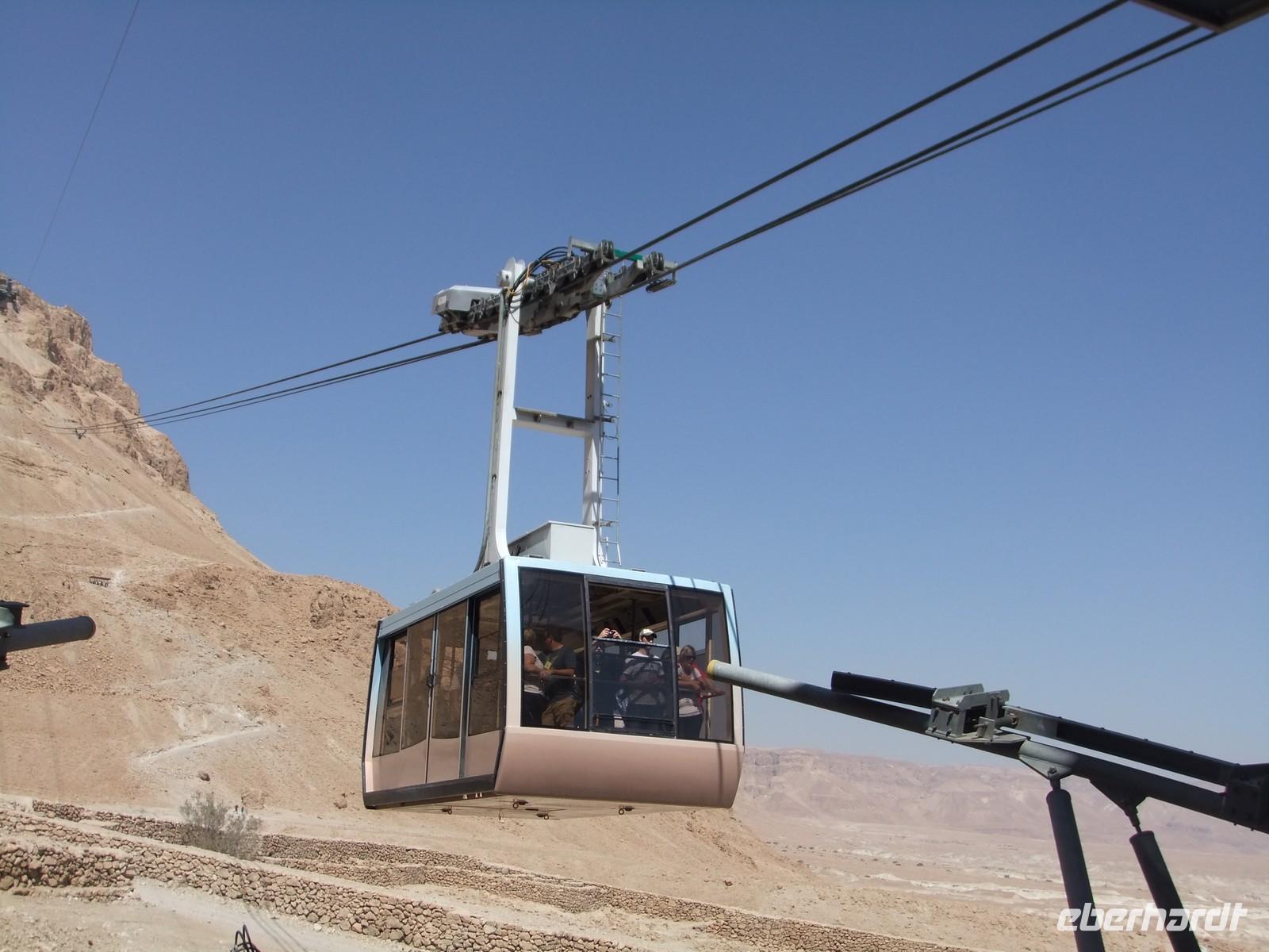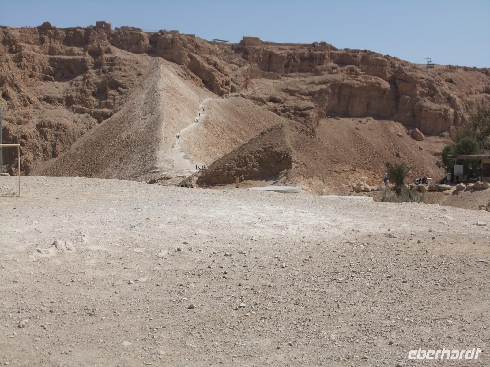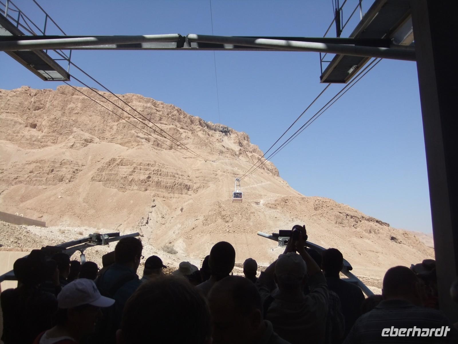 Massada ist jedem Juden bekannt. Auch diesmal besuchen wieder viele Kinder das Plateau des Tafelberges, 400 m über dem Toten Meer, zu dem man etwas mühselig auf den Schlangenpfad gelangt. Wir nutzen aber die Seilbahn. Massada ist nicht nur die Grenzfestung der Makkabäer und die Schutzburg des Herodes des Großen, der an der nach Norden gerichtete Felsnase des Berges 3 Paläste übereinander bauen ließ. Massada war aber auch der Zufluchtsort von jüdischen Rebellen nach der Zerstörung Jerusalems und seines Tempels. Knapp 1000 Juden trotzten monatelang der römischen Übermacht. Gewaltige Zisternenanlagen und große Vorratsspeicher ermöglichten ein langes Standhalten bei einer Belagerung. Am Ende siegte jedoch römische Technik und eine Überzahl von Soldaten und jüdischen Sklaven, die eine Rampe für das Heranbringen mächtiger Belagerungsmaschinen bauen mussten. Die besiegten jüdischen Kämpfer begingen kollektiven Selbstmord. Das Schlagwort: "Massada darf nie wieder fallen !" ist Bestandteil des Bewusstseins des heutigen Israel. Von Massada aus hat man einen weiten Blick über die gelb-bräunliche Wüstenlandschaft, über das leuchtend blaue Tote Meer bis zu den Bergen Jordaniens in der. Wir steigen über die römische Rampe herab und fahren über Arad in unseren Kibbuz zurück, nachdem wir auf einer Terrasse direkt am Toten Meer eine Kaffeepause eingelegt hatten..