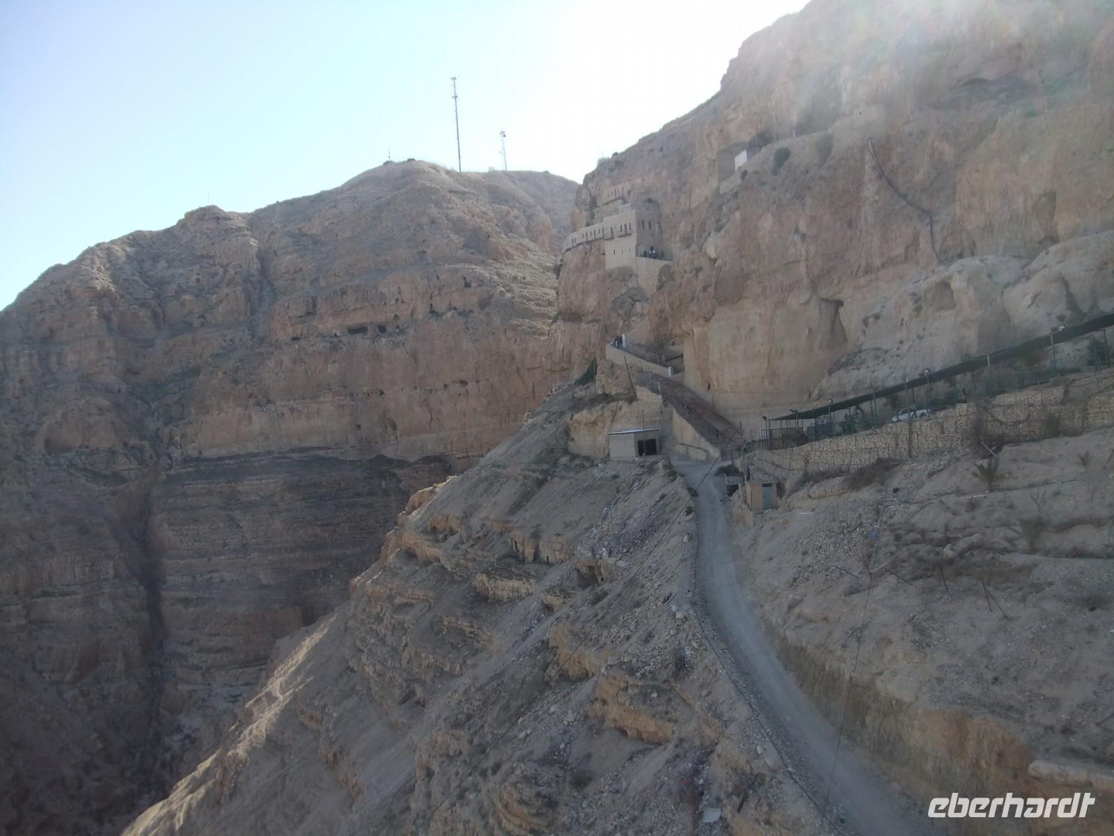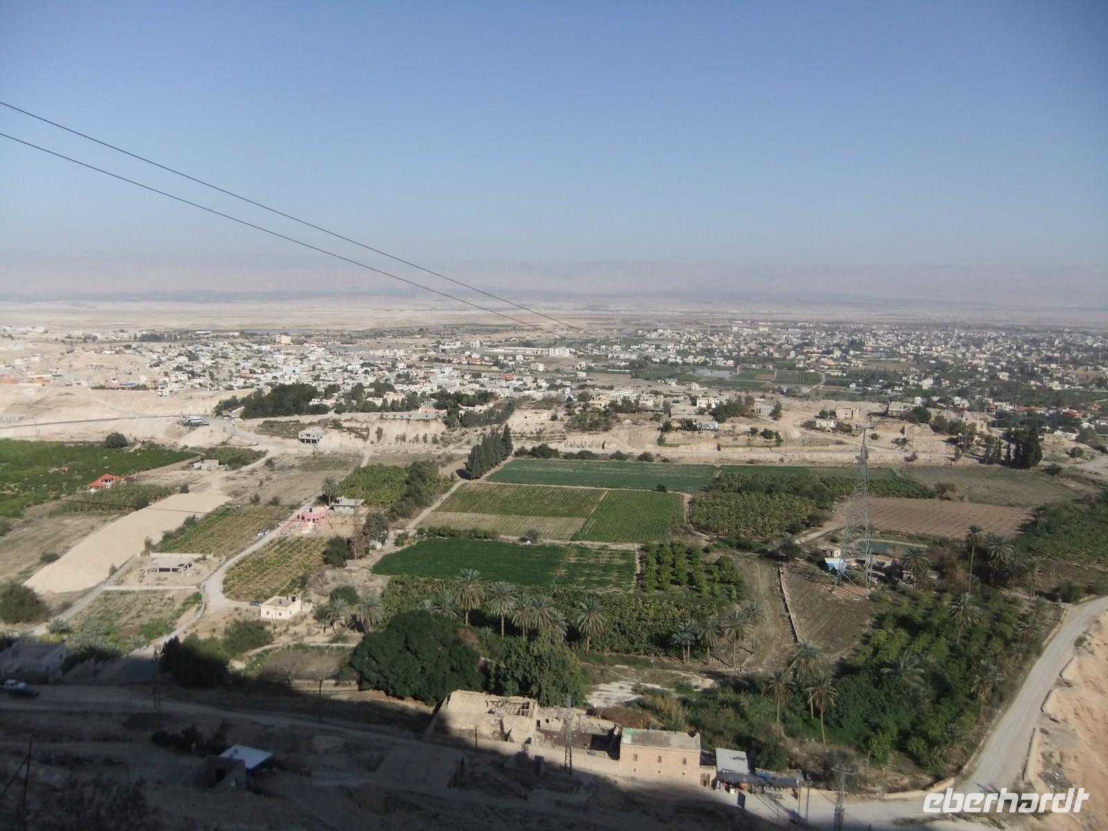 Die Stadt hat eine 10.000 Jahre alte Geschichte und schmückt sich deshalb mit dem Titel ?älteste Stadt der Welt". Sie wurde 2 Dutzend Male zerstört und entstand immer wieder, denn hier lieferten 5 Quellen reichlich Wasser. Jericho gehört zur Zone A im Westjordanland, die Stadt hat eigene palästinensische Sicherheits- und Verwaltungshoheit. Ungestört bewegen sich viele Touristen im Ort. Mit einer Gondelbahn gelangen wir schnell auf halbe Höhe des Berges der Versuchung, auf dem Jesus 40 Tage lang gefastet haben soll. Hier wurde im 19.Jhrhundert ein griechisch-orthodoxes Kloster an den Felsen angebaut, das wir besuchen. Ein herrlicher Blick auf Jericho belohnt den kurzen und bequemen Aufstieg von der Seilbahnstation zum Kloster.