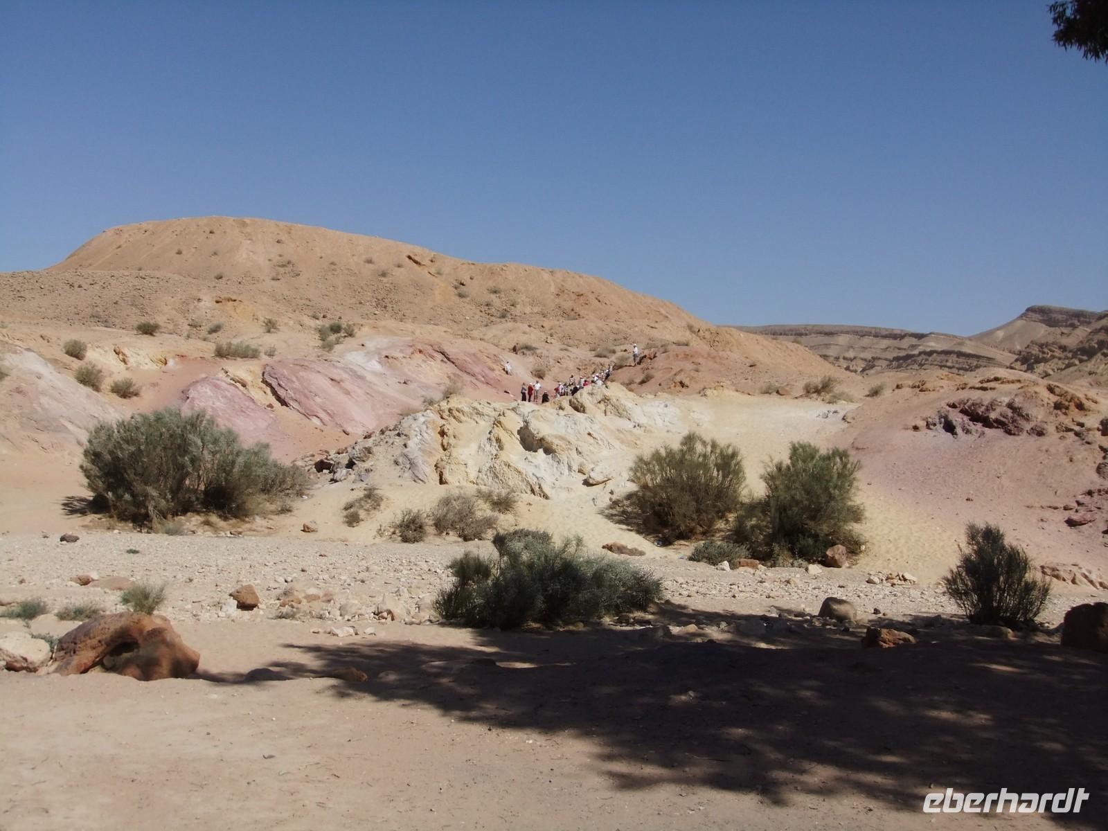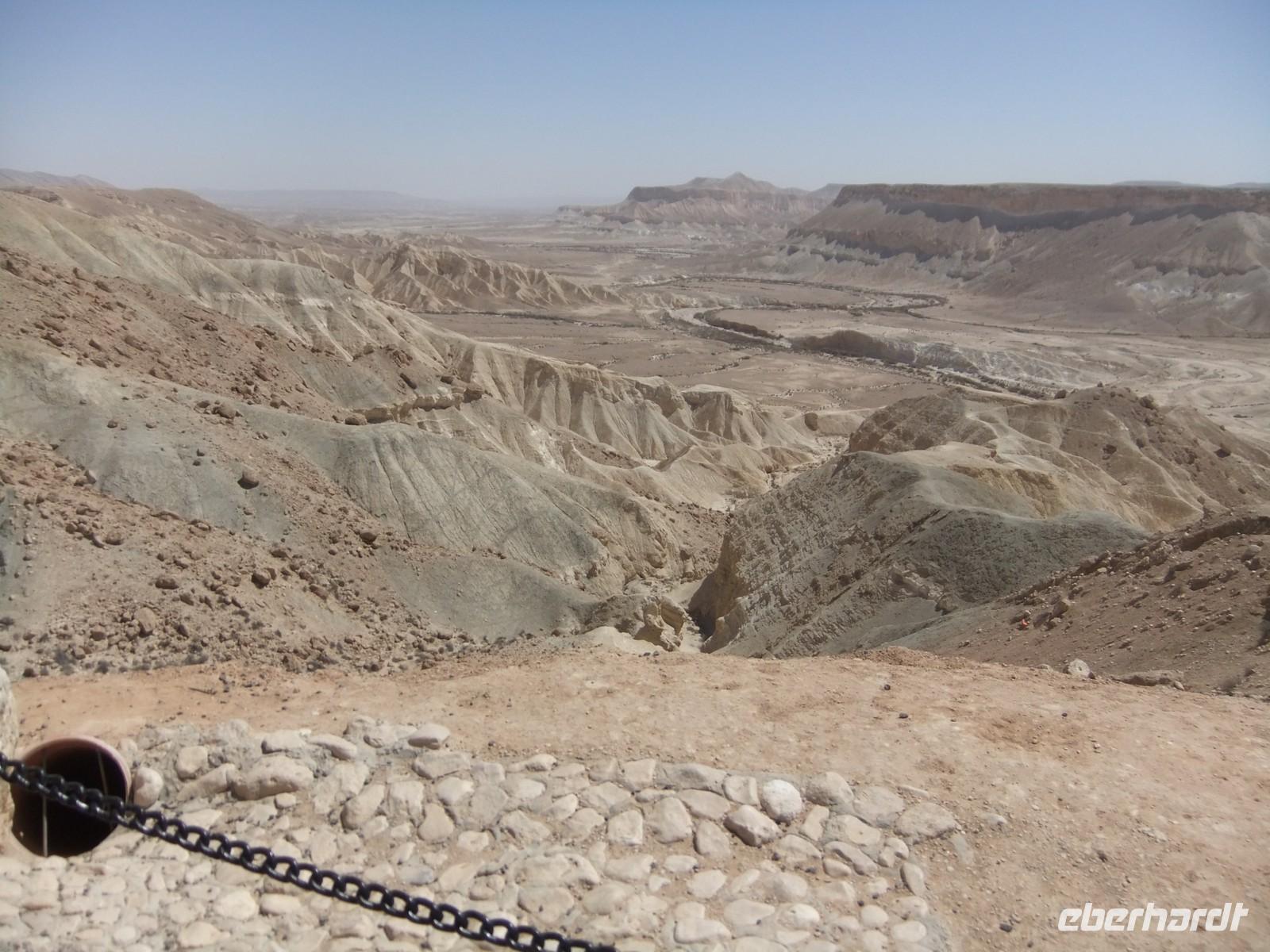 In der Halbwüste gibt es nicht nur Beduinensiedlungen zu sehen, Schafherden, von schwarzgekleideten Frauen gehütet, eine Stelle mit farbigen Sanden, sondern auch 3 tiefe, ellipsenförmige Krater, die die gleiche Ausrichtung haben. Nachdem wir einen kleineren Krater durchfahren haben, stehen wir am Rande des größten Kraters bei Mitzpe Ramon, 300 m tief. Die Krater sollen nach Erdeinbrüchen und/oder durch Erosion von Flüssen in Richtung des Grabenbruches am Toten Meer entstanden sein. Meine Theorie, ein Asteroid habe sich beim Eintritt in die Atmosphäre in 3 große Teile zerlegt, die hier einschlugen, findet noch zu wenig Anhänger.
