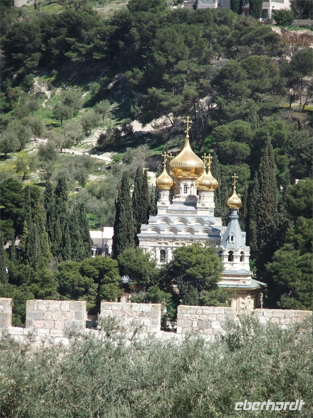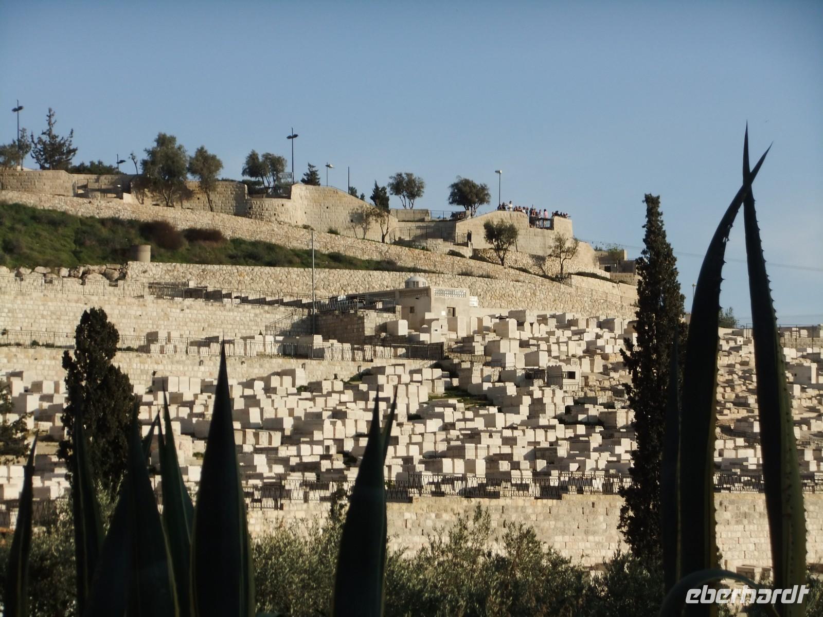 Nach etwas Freizeit fahren wir noch einmal auf den Ölberg, genießen von hier aus, diesmal am Tag, das Panorama der Heiligen Stadt. Und wieder sind es heilige Stätten der Christenheit: die Kirche Dominus Flevit an der Stelle, an der Jesus im Wissen um die kommende Zerstörung Jerusalems trauerte und der Garten Gethsemane mir seinen uralten Ölbaumen, in dem Jesus betete und mit dem Tode rang.