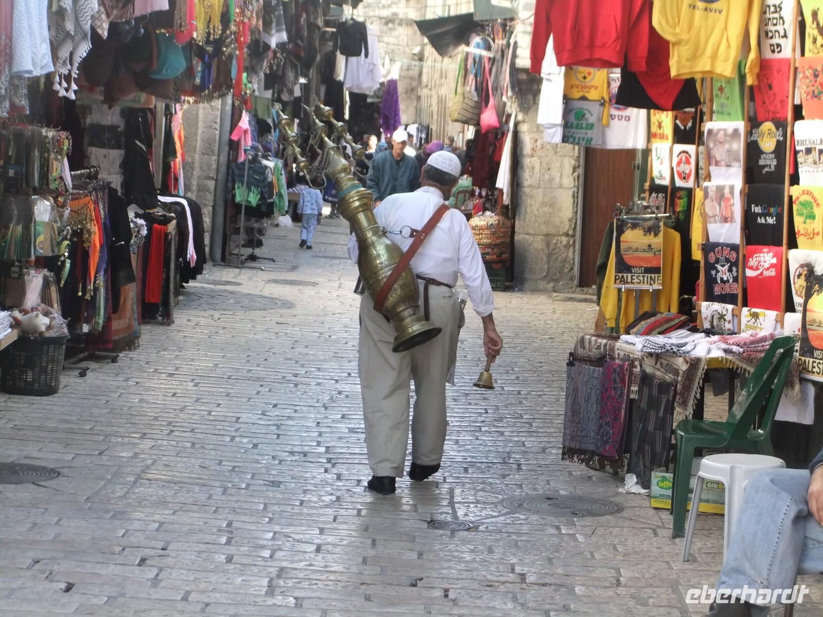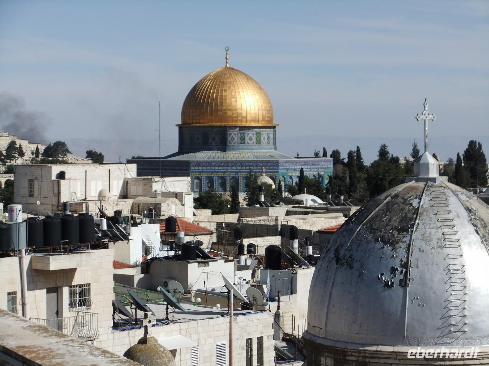 Hauptachsen teilen die weniger als 1 km² große Altstadt hinter den gewaltigen Mauern aus türkischer Zeit in 4 Viertel, die den Armeniern, Christen, Juden und Moslimen zugeordnet sind. Jedes Viertel hat seinen eigenen Charakter. Vom Jaffator gelangen wir auf die Cardo, die Ost-West-Hauptachse. Wie viele Kirchen, Klöster, Synagogen, Moscheen gibt es in dieser Altstadt ? Es sind ja nicht nur die 3 Hauptreligionen, die den gemeinsamen Stammvater Abraham haben, es sind ja auch verschiedene Glaubensrichtungen. Am Tempelberg wird schmerzhaft sichtbar, dass bei allem friedlichen Zusammenleben ein Riss durch die Stadt geht. Vom Tempelberg ist den gläubigen Juden die Klagemauer geblieben, für den Islam ist der Tempelberg nach Mekka und Medina das dritte große Heiligtum.