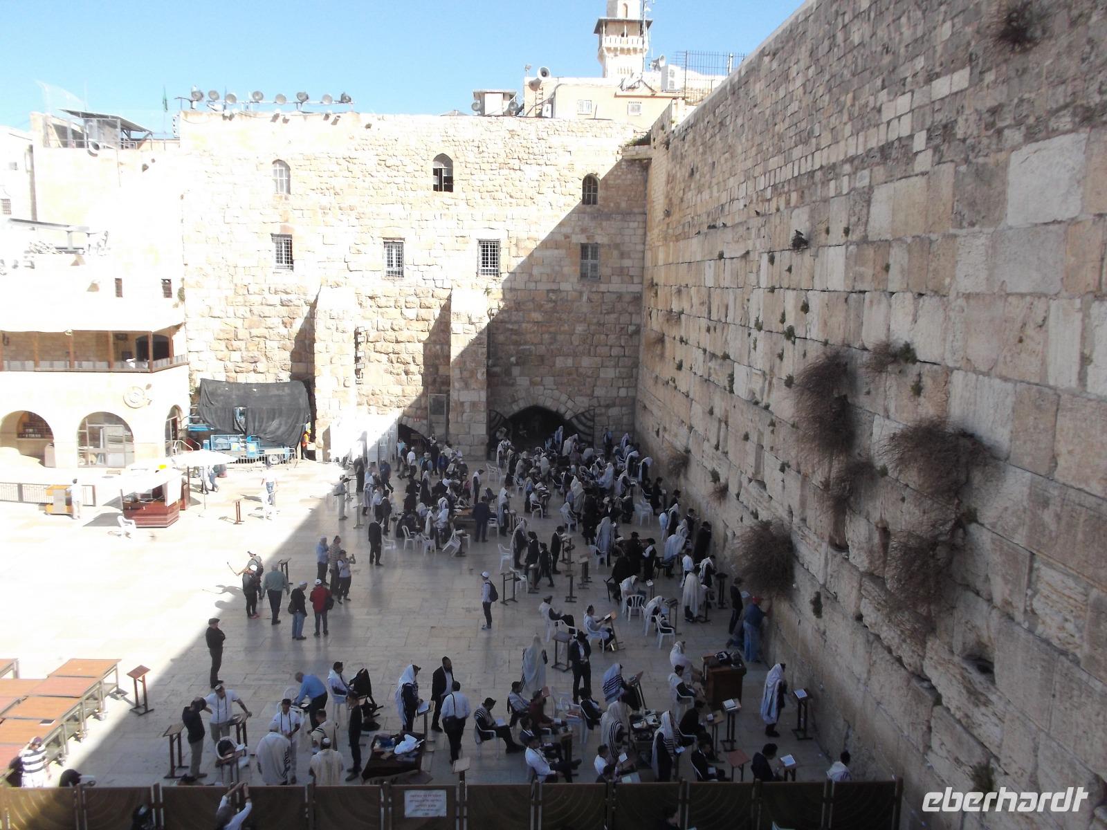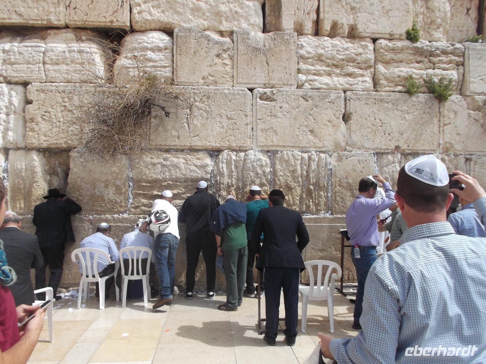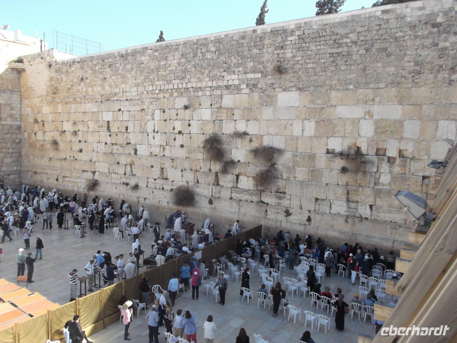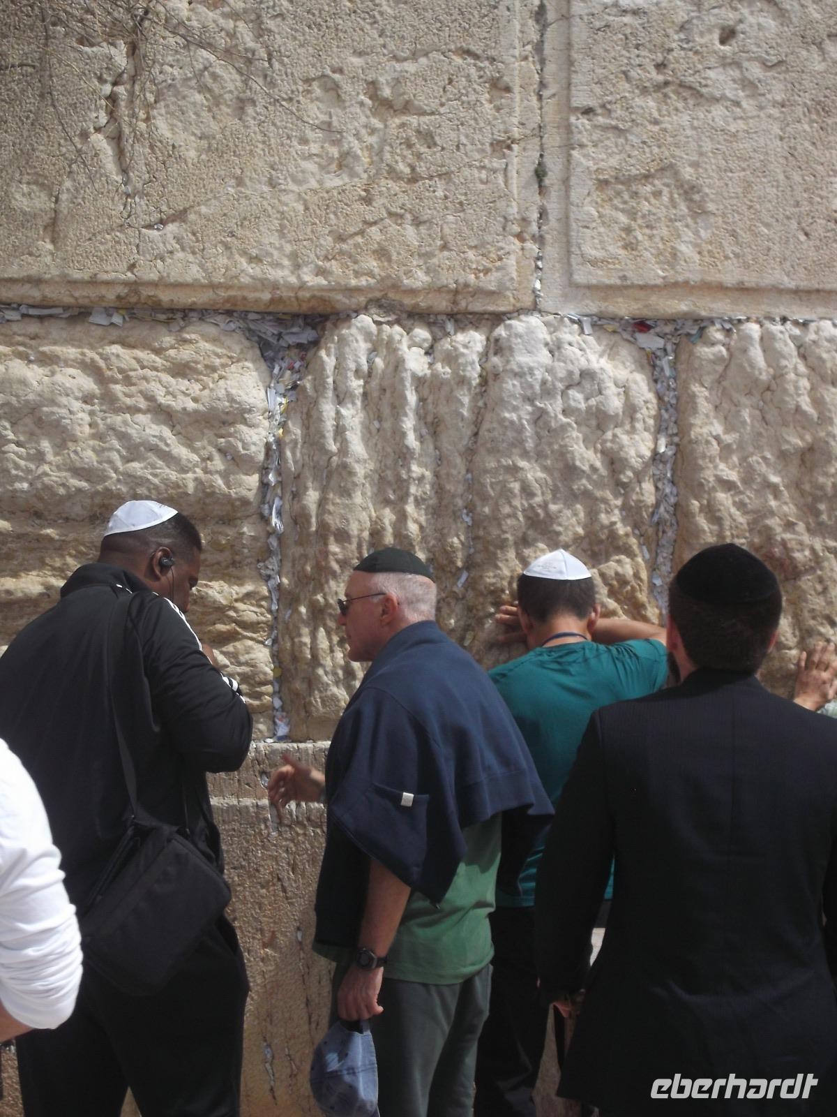 Von diesem geschichts- und bibelträchtigen Ort wanderten wir durch das Kidrontal, das den Ölberg von der Altstadt Jerusalems trennt und gelangen vorbei an der Maria-Magdalenen-Kirche mit ihren vergoldeten Zwiebeltürmchen, dem Mariengrab und der Stephanskirche zu den Felsengräbern des Tales, von denen das gewaltige Absalom-Grabmal das bedeutendste ist. Wieder an den Mauern von Jerusalems Altstadt angelangt, durchquerten wir wie am Tag zuvor das „Mist-Tor", hatten aber dieses Mal nicht den Tempelberg, sondern die Klagemauer zum Ziel. Diese vielleicht bedeutendste Stätte es religiösen Judentums ist der letzte Überrest des einstigen Tempels der Juden und eigentlich nur die Westmauer des ehemaligen Tempelplateaus. Sie besteht aus mächtigen, ohne Mörtel zusammengefügten Blöcken aus Jerusalemer Kalkstein und wurde wohl zu Zeiten des Königs Herodes errichtet. Aufgrund der immer wieder ausbrechenden Spannungen in Jerusalem muss man vor dem Betreten des heiligen Bereichs recht strenge Sicherheitskontrollen passieren. Bei unserem Besuch war der Platz vor der Klagemauer voller Menschen, denn an diesem Donnerstag wurde für viele Jungen die Bar Mitzwa gefeiert, das Mündigkeitsfest, bei dem sie das erste Mal öffentlich aus der Tora, der hebräischen Bibel, vorlesen dürfen.