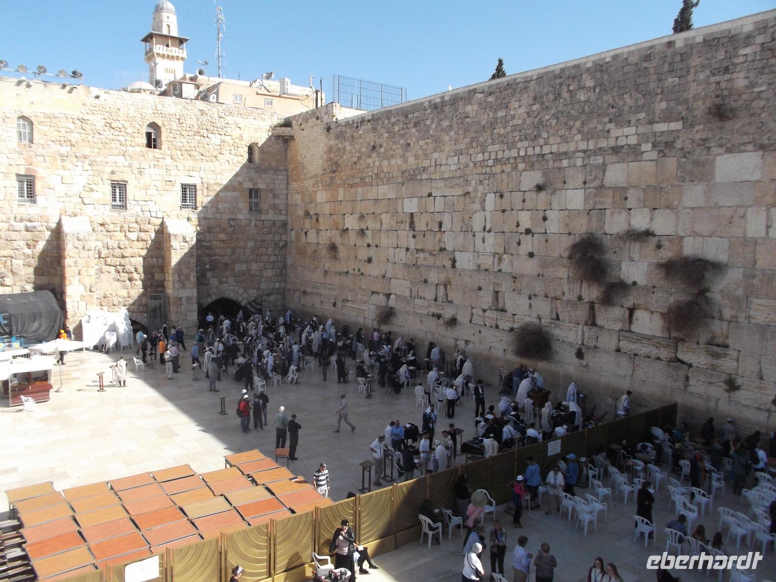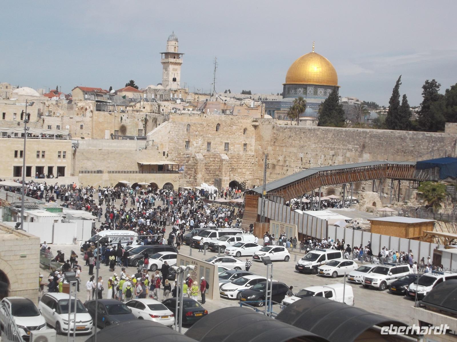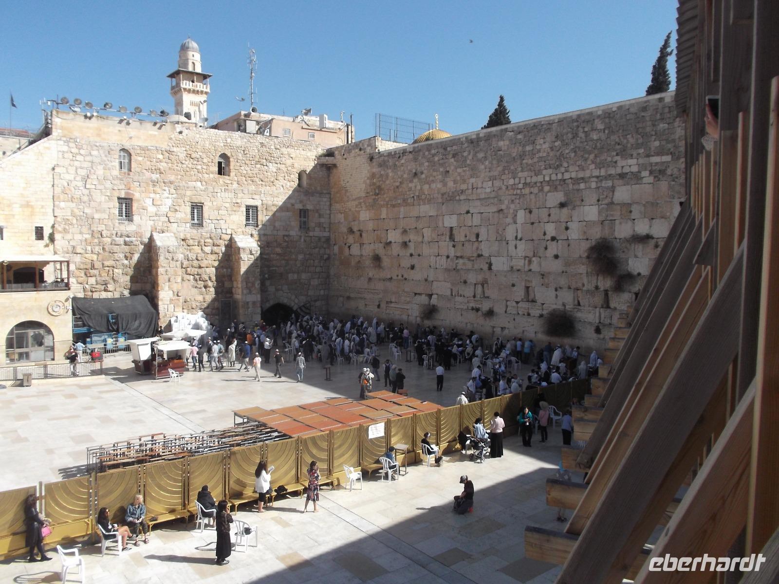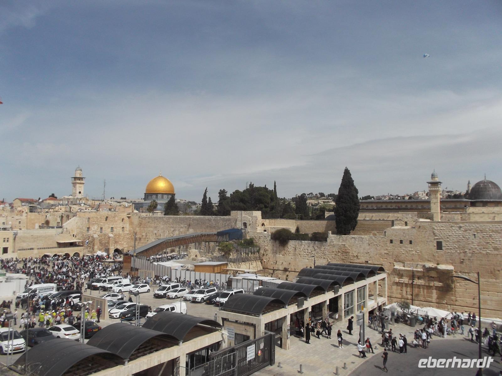 Von diesem geschichts- und bibelträchtigen Ort wanderten wir durch das Kidrontal, das den Ölberg von der Altstadt Jerusalems trennt und gelangen vorbei an der Maria-Magdalenen-Kirche mit ihren vergoldeten Zwiebeltürmchen, dem Mariengrab und der Stephanskirche zu den Felsengräbern des Tales, von denen das gewaltige Absalom-Grabmal das bedeutendste ist. Wieder an den Mauern von Jerusalems Altstadt angelangt, durchquerten wir wie am Tag zuvor das „Mist-Tor", hatten aber dieses Mal nicht den Tempelberg, sondern die Klagemauer zum Ziel. Diese vielleicht bedeutendste Stätte es religiösen Judentums ist der letzte Überrest des einstigen Tempels der Juden und eigentlich nur die Westmauer des ehemaligen Tempelplateaus. Sie besteht aus mächtigen, ohne Mörtel zusammengefügten Blöcken aus Jerusalemer Kalkstein und wurde wohl zu Zeiten des Königs Herodes errichtet. Aufgrund der immer wieder ausbrechenden Spannungen in Jerusalem muss man vor dem Betreten des heiligen Bereichs recht strenge Sicherheitskontrollen passieren. Bei unserem Besuch war der Platz vor der Klagemauer voller Menschen, denn an diesem Donnerstag wurde für viele Jungen die Bar Mitzwa gefeiert, das Mündigkeitsfest, bei dem sie das erste Mal öffentlich aus der Tora, der hebräischen Bibel, vorlesen dürfen.
