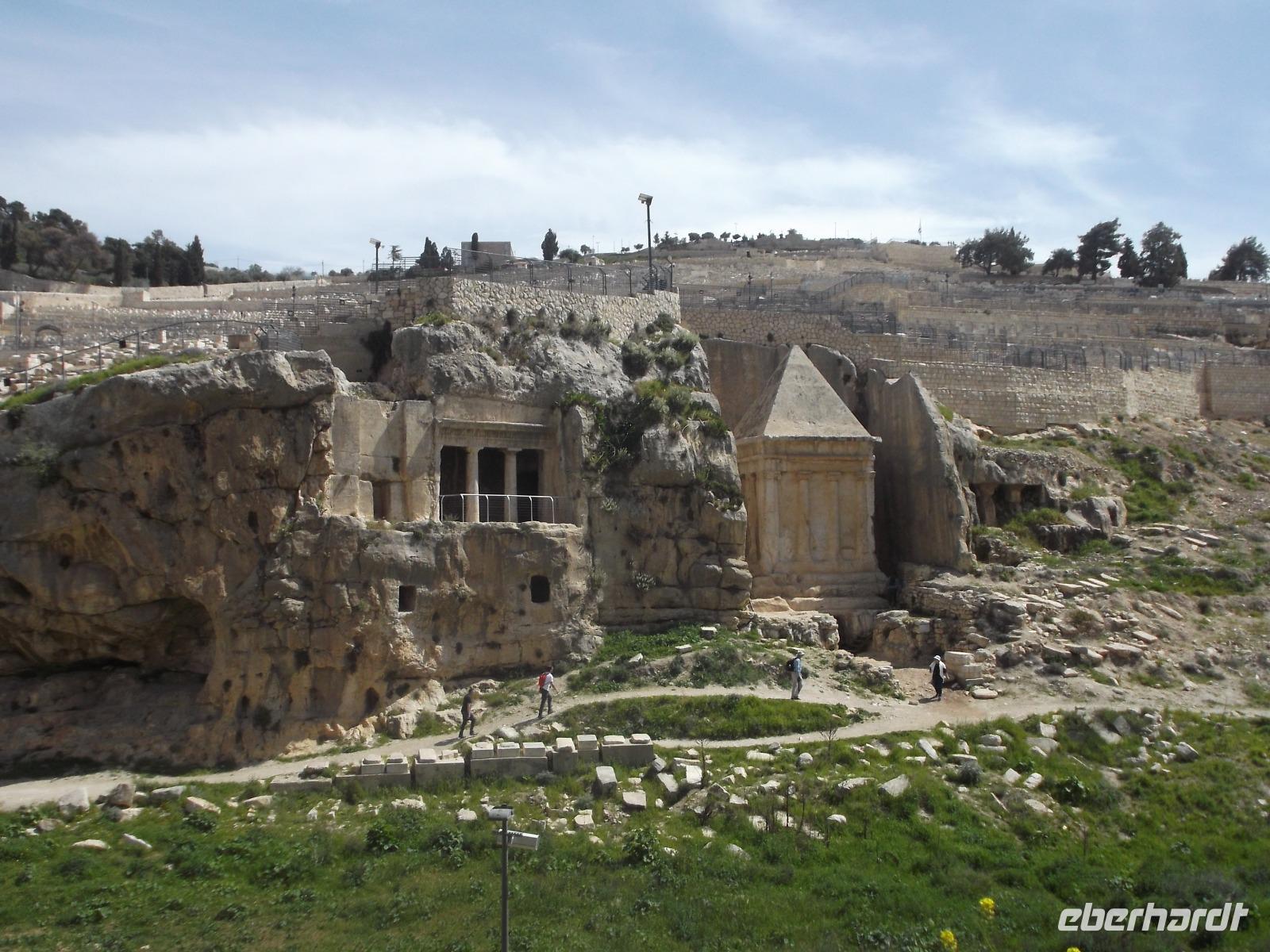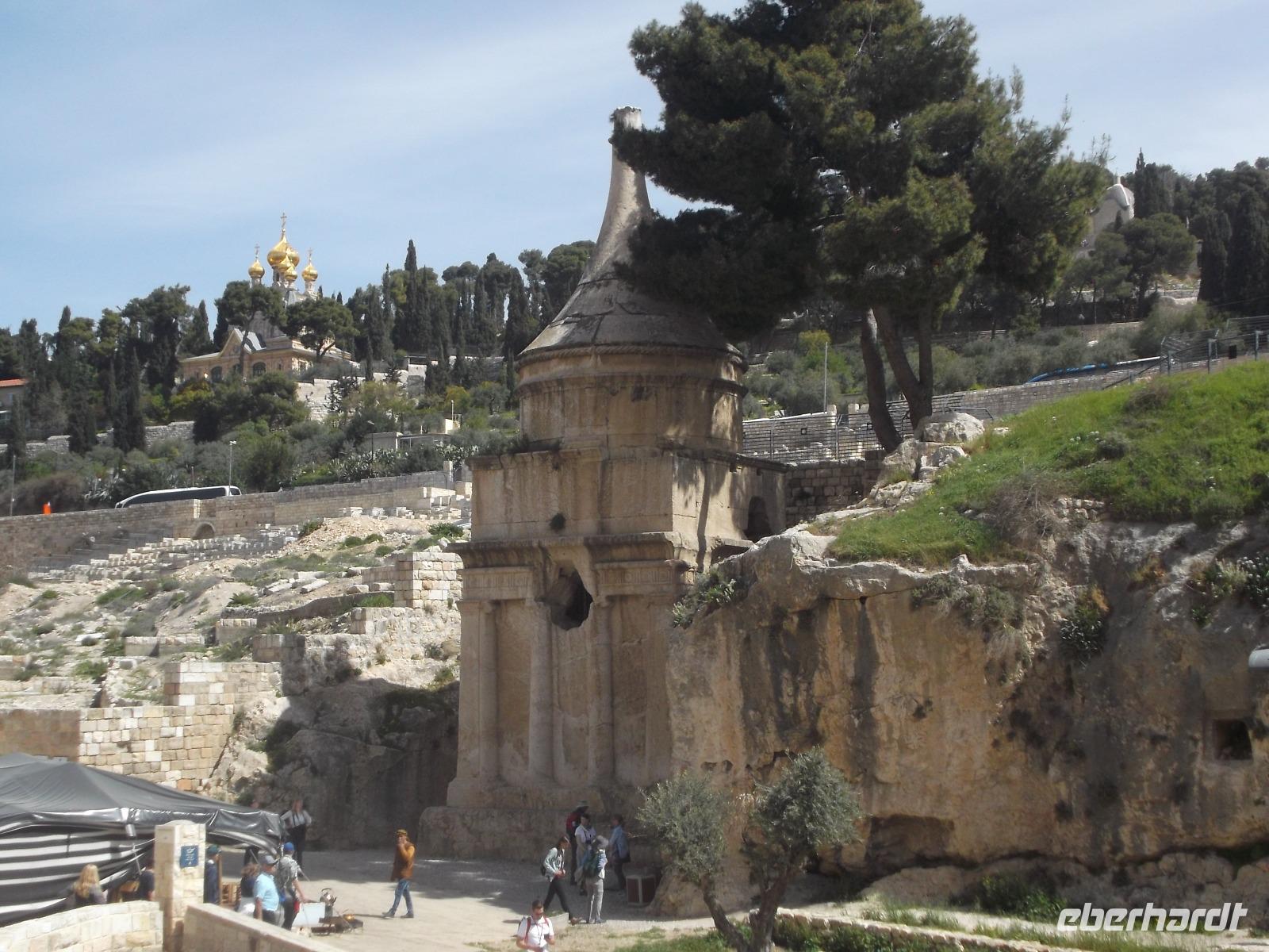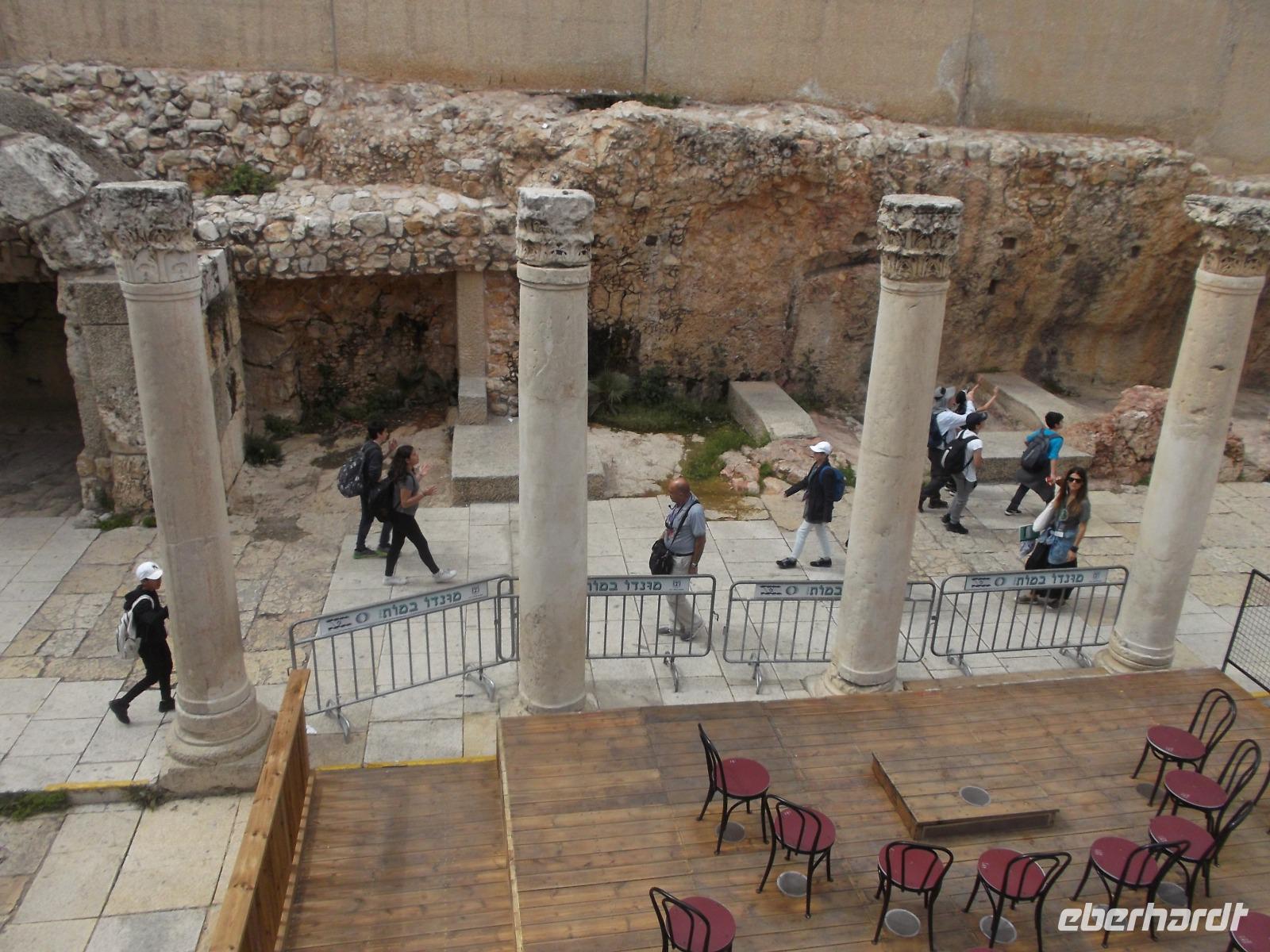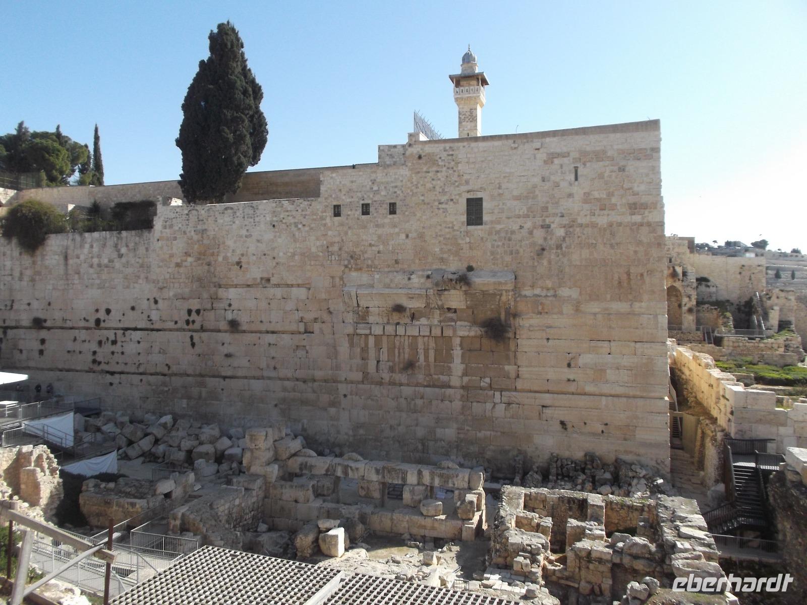 Von diesem geschichts- und bibelträchtigen Ort wanderten wir durch das Kidrontal, das den Ölberg von der Altstadt Jerusalems trennt und gelangen vorbei an der Maria-Magdalenen-Kirche mit ihren vergoldeten Zwiebeltürmchen, dem Mariengrab und der Stephanskirche zu den Felsengräbern des Tales, von denen das gewaltige Absalom-Grabmal das bedeutendste ist. Wieder an den Mauern von Jerusalems Altstadt angelangt, durchquerten wir wie am Tag zuvor das „Mist-Tor", hatten aber dieses Mal nicht den Tempelberg, sondern die Klagemauer zum Ziel. Diese vielleicht bedeutendste Stätte es religiösen Judentums ist der letzte Überrest des einstigen Tempels der Juden und eigentlich nur die Westmauer des ehemaligen Tempelplateaus. Sie besteht aus mächtigen, ohne Mörtel zusammengefügten Blöcken aus Jerusalemer Kalkstein und wurde wohl zu Zeiten des Königs Herodes errichtet. Aufgrund der immer wieder ausbrechenden Spannungen in Jerusalem muss man vor dem Betreten des heiligen Bereichs recht strenge Sicherheitskontrollen passieren. Bei unserem Besuch war der Platz vor der Klagemauer voller Menschen, denn an diesem Donnerstag wurde für viele Jungen die Bar Mitzwa gefeiert, das Mündigkeitsfest, bei dem sie das erste Mal öffentlich aus der Tora, der hebräischen Bibel, vorlesen dürfen.