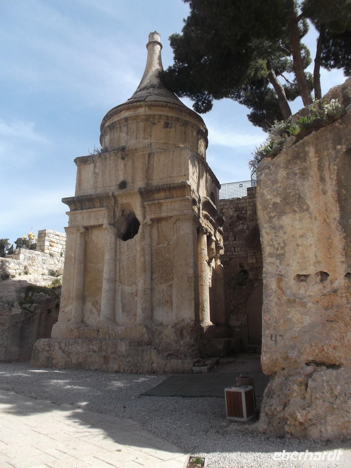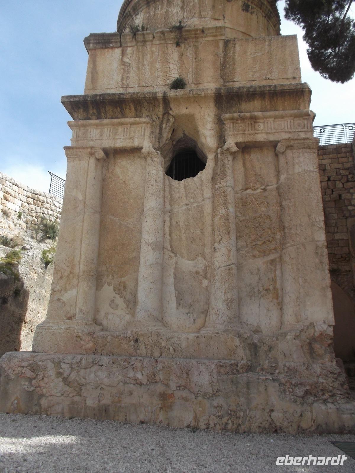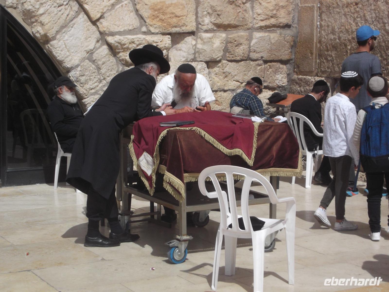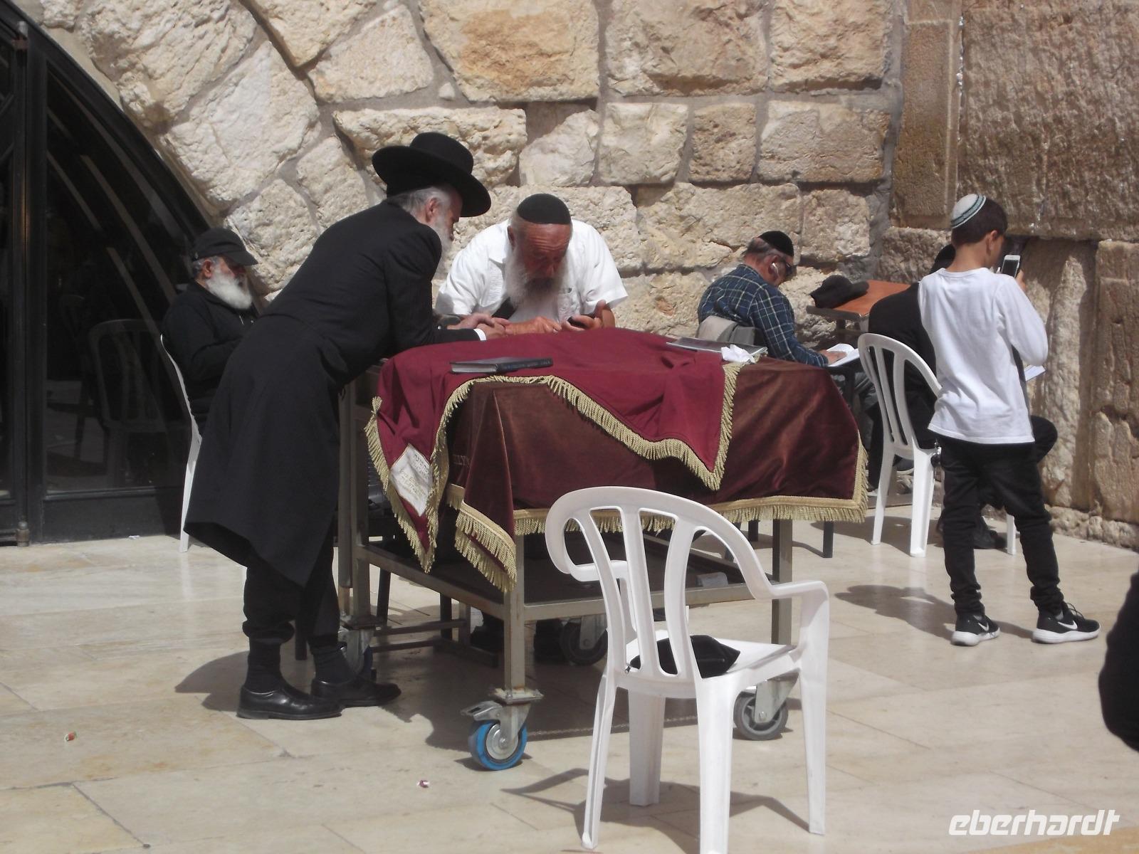 Von diesem geschichts- und bibelträchtigen Ort wanderten wir durch das Kidrontal, das den Ölberg von der Altstadt Jerusalems trennt und gelangen vorbei an der Maria-Magdalenen-Kirche mit ihren vergoldeten Zwiebeltürmchen, dem Mariengrab und der Stephanskirche zu den Felsengräbern des Tales, von denen das gewaltige Absalom-Grabmal das bedeutendste ist. Wieder an den Mauern von Jerusalems Altstadt angelangt, durchquerten wir wie am Tag zuvor das „Mist-Tor", hatten aber dieses Mal nicht den Tempelberg, sondern die Klagemauer zum Ziel. Diese vielleicht bedeutendste Stätte es religiösen Judentums ist der letzte Überrest des einstigen Tempels der Juden und eigentlich nur die Westmauer des ehemaligen Tempelplateaus. Sie besteht aus mächtigen, ohne Mörtel zusammengefügten Blöcken aus Jerusalemer Kalkstein und wurde wohl zu Zeiten des Königs Herodes errichtet. Aufgrund der immer wieder ausbrechenden Spannungen in Jerusalem muss man vor dem Betreten des heiligen Bereichs recht strenge Sicherheitskontrollen passieren. Bei unserem Besuch war der Platz vor der Klagemauer voller Menschen, denn an diesem Donnerstag wurde für viele Jungen die Bar Mitzwa gefeiert, das Mündigkeitsfest, bei dem sie das erste Mal öffentlich aus der Tora, der hebräischen Bibel, vorlesen dürfen.