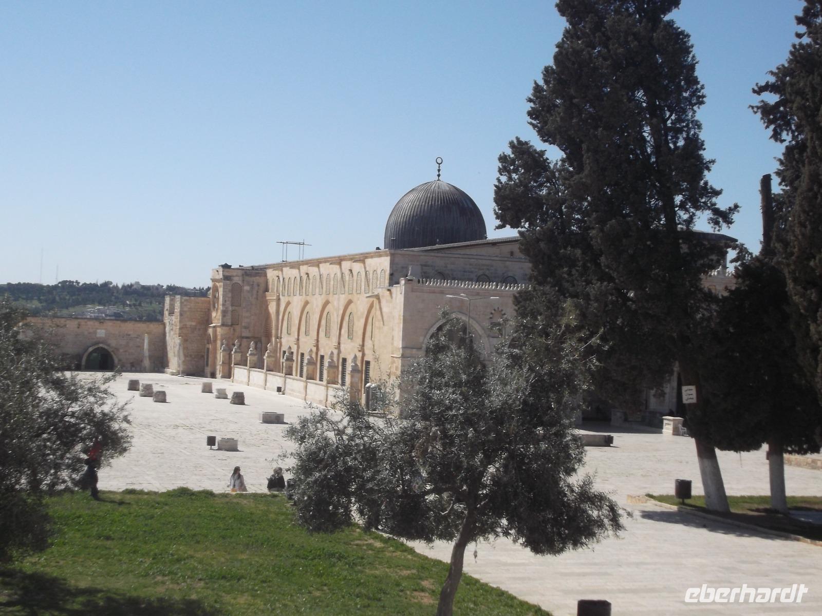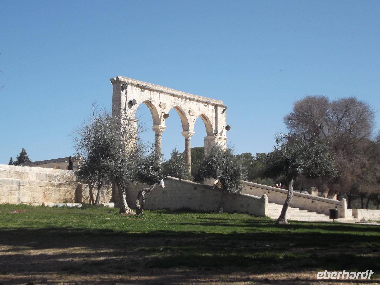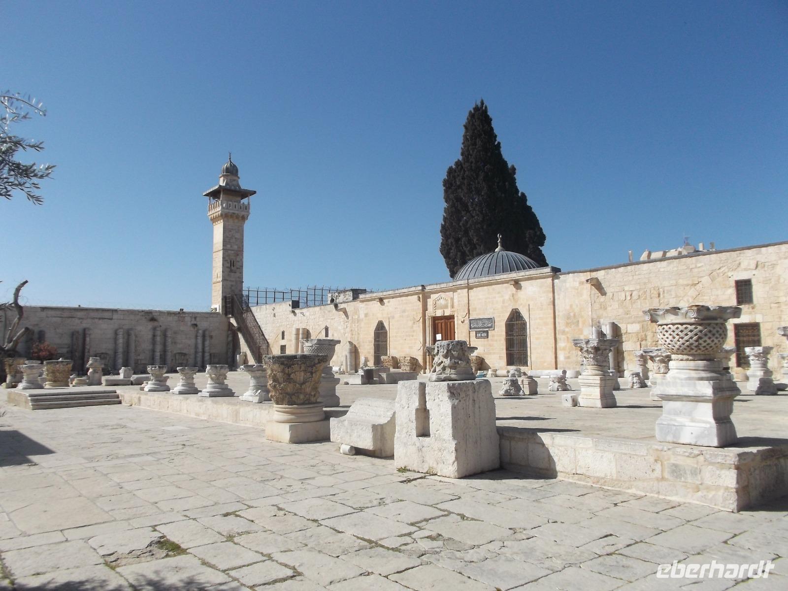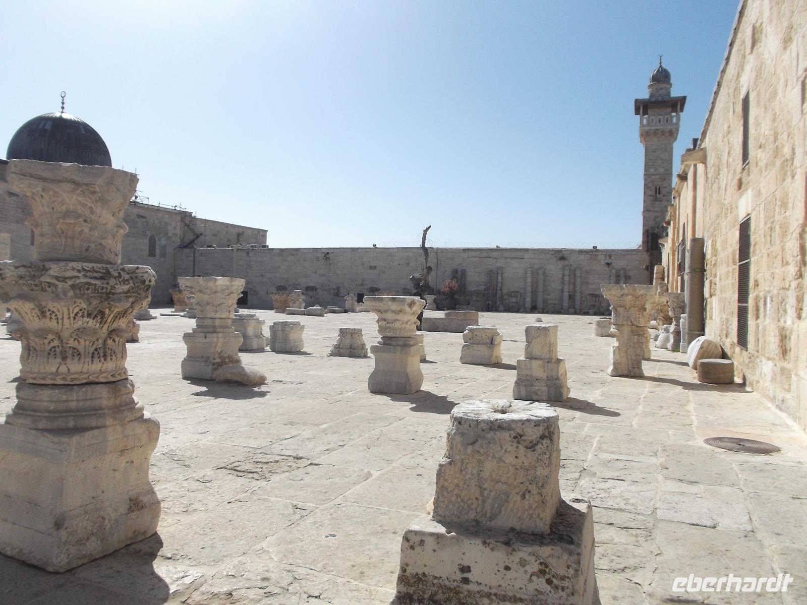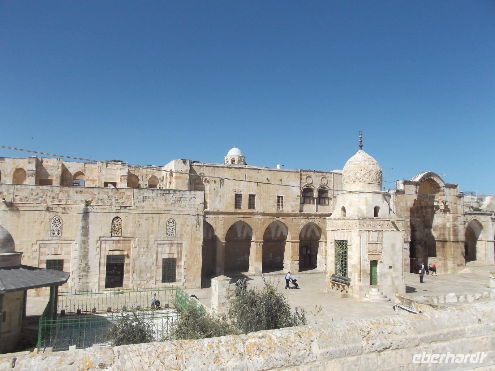 Auf dem Moriah-Hügel südöstlich der Altstadt gelegen, war er nicht nur der ursprüngliche Standort des Tempels der Juden, sondern trägt heute mit dem Felsendom und der Al-Aqsa-Moschee zwei der bedeutendsten Bauwerke des Islam. Dem sagenhaften König Salomo schreibt man die Errichtung des ersten Tempels der biblischen Israeliten zu, die seit dem 10. Jh. v. Chr. hier siedelten. Diesen Tempel ließ der babylonische König Nebukadnezar II. 586 v.Chr zerstören. Als zweiter Tempel soll er von den aus babylonischem Exil heimkehrenden Juden 516 v.Chr. wieder errichtet worden sein. Unter Herodes dem Großen wurde er kurz vor der Zeitenwende monumental ausgebaut und prunkvoll ausgestaltet und dann im Jüdischen Krieg durch die Römer im 1. nachchristlichen Jahrhundert vollständig zerstört. Bis heute erhielt die jüdische Religion nie wieder einen Haupttempel! Da, wo der legendäre Bau einst gestanden hatte, errichteten nach der muslimischen Eroberung im 7. Jh. n. Chr. die siegreichen Araber die heute noch bestehenden herrlichen Bauten: den Felsendom und kurz darauf die Al-Aqsa-Moschee errichtet. Genau an dieser Stelle soll das erste Quartier der vielleicht berühmtesten und legendärsten Kreuzritter gelegen haben - denn nach dem Tempelberg benannten sich während der Kreuzzüge auch die Ritter des Mönchsordens, der wohl 1118 genau hier gegründet wurde. Die „armen Ritter des salomonischen Tempels zu Jerusalem", kurz „Tempelritter" oder „Templer" genannt, wohnten wahrscheinlich in der oder in den Gewölben unter der damals umgebauten und zweckentfremdeten Al-Aqsa-Moschee.