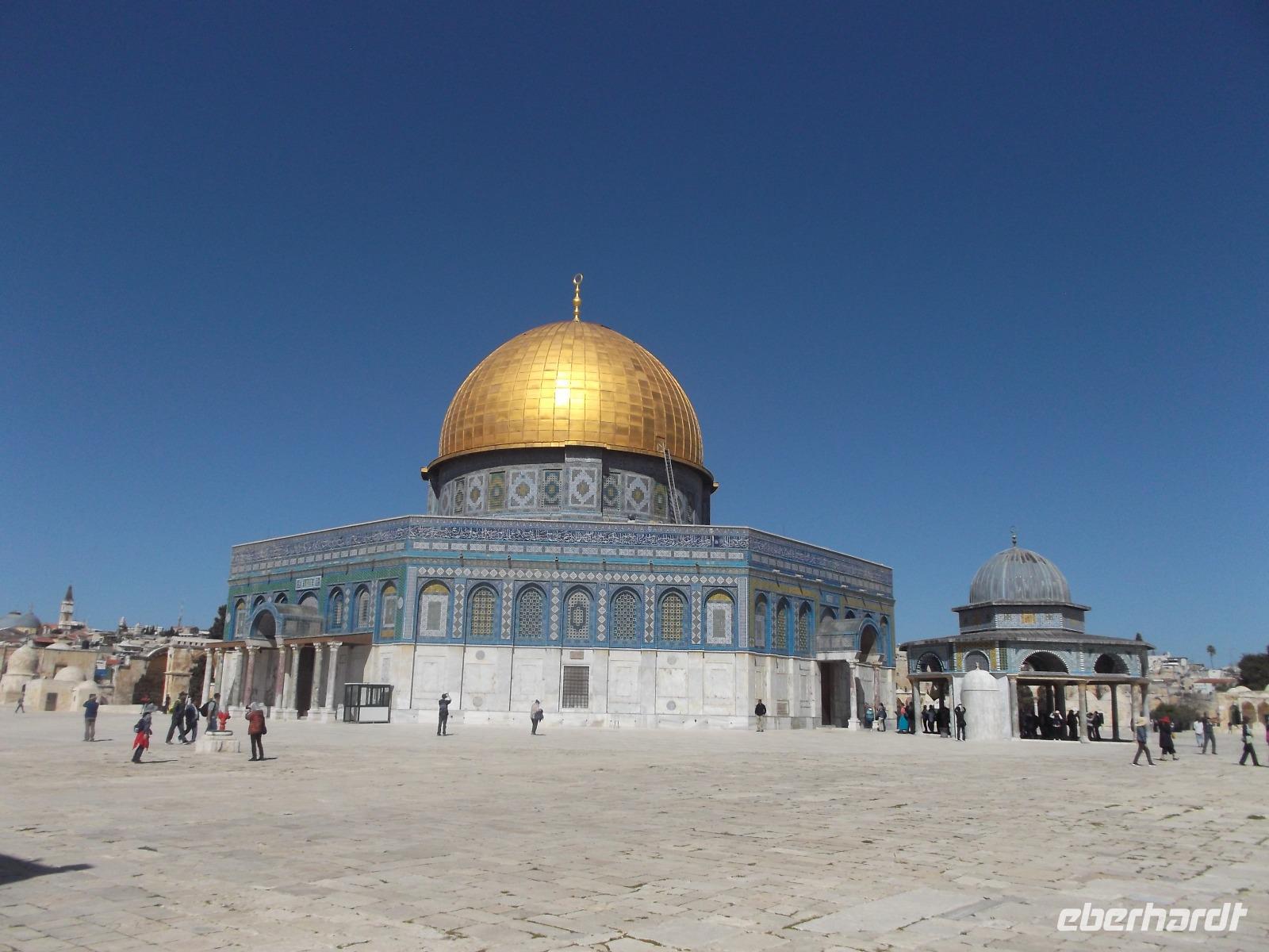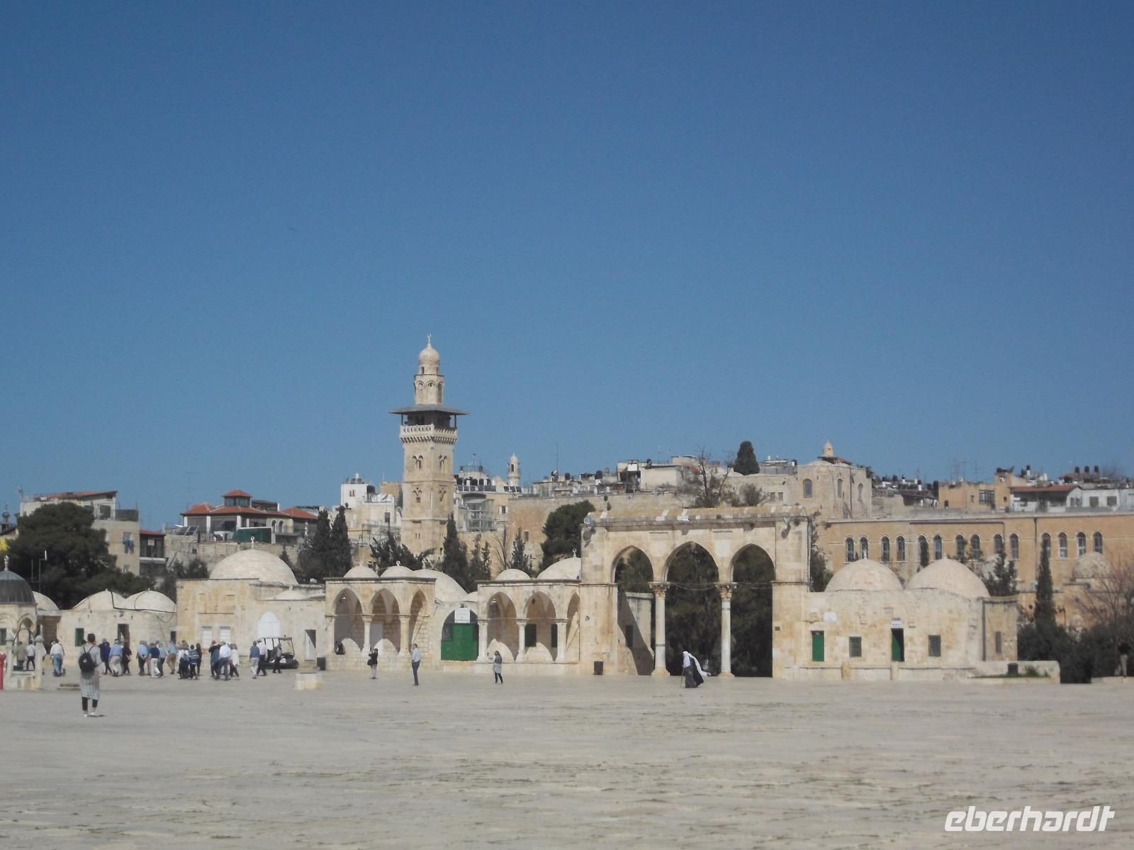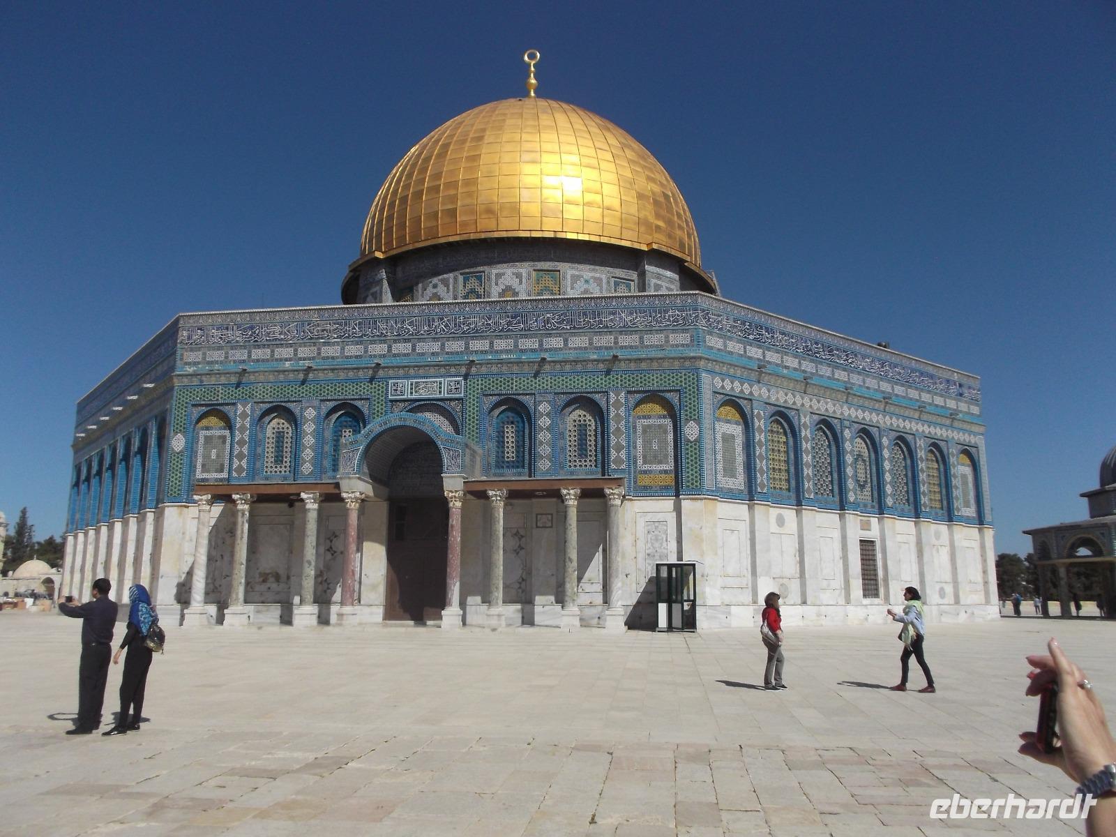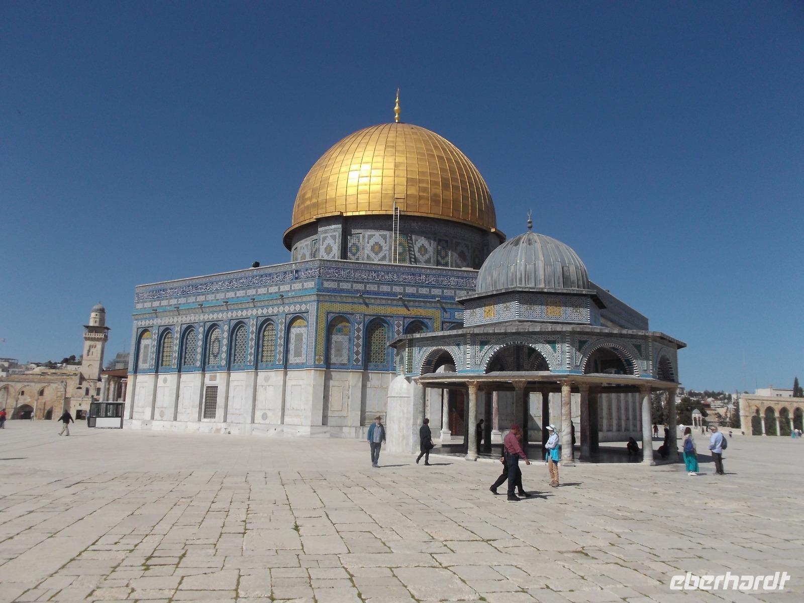 Unsere Besichtigung von Jerusalem heute begann mit dem Tempelberg, jenem von drei Weltreligionen als IHR Mittelpunkt beanspruchtem Ort, der das Herz der Stadt darstellt. Der weltberühmte Berg, eines der am meisten fotografierten Objekte der Weltgeschichte, ist vor allem in den Morgenstunden für Touristen zugänglich.