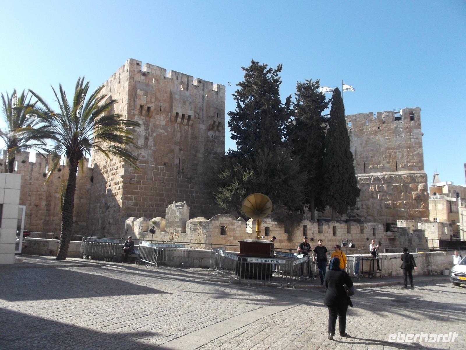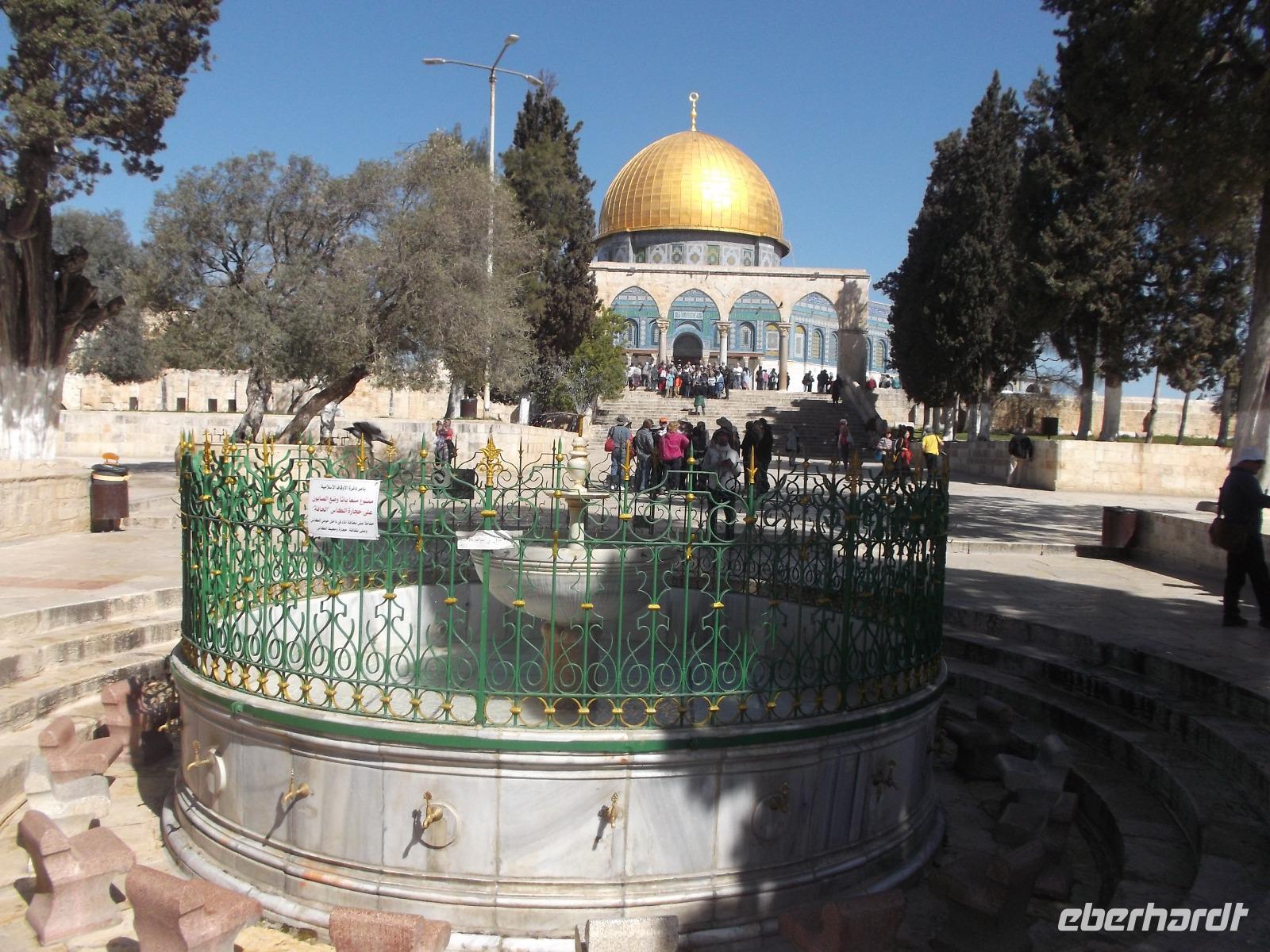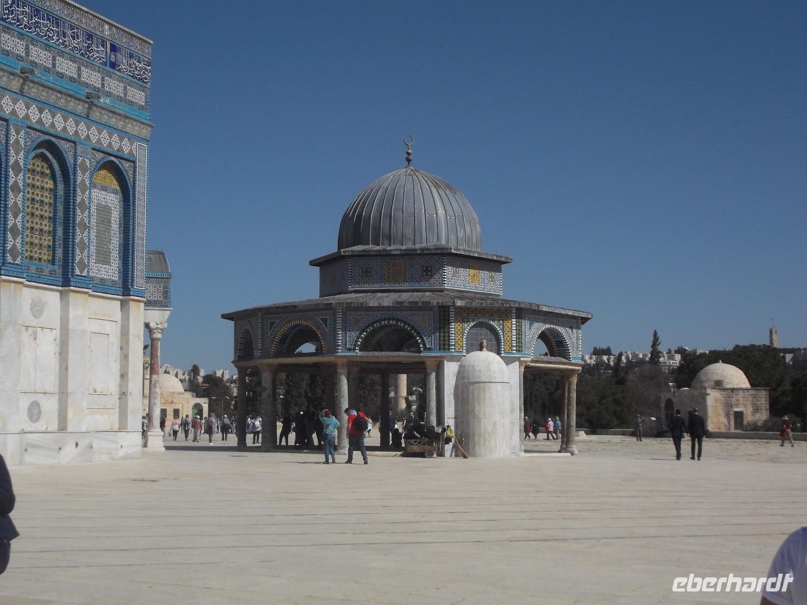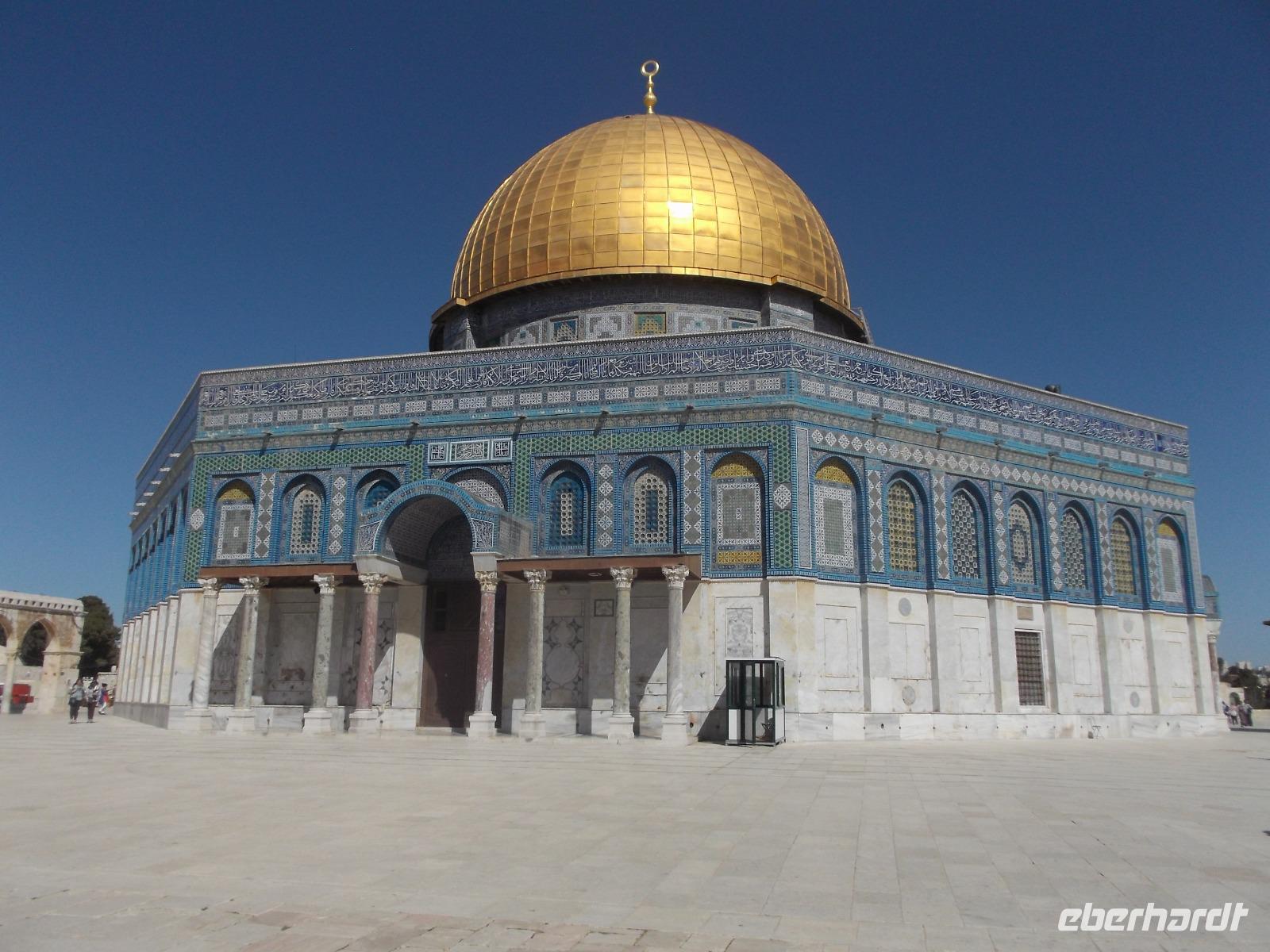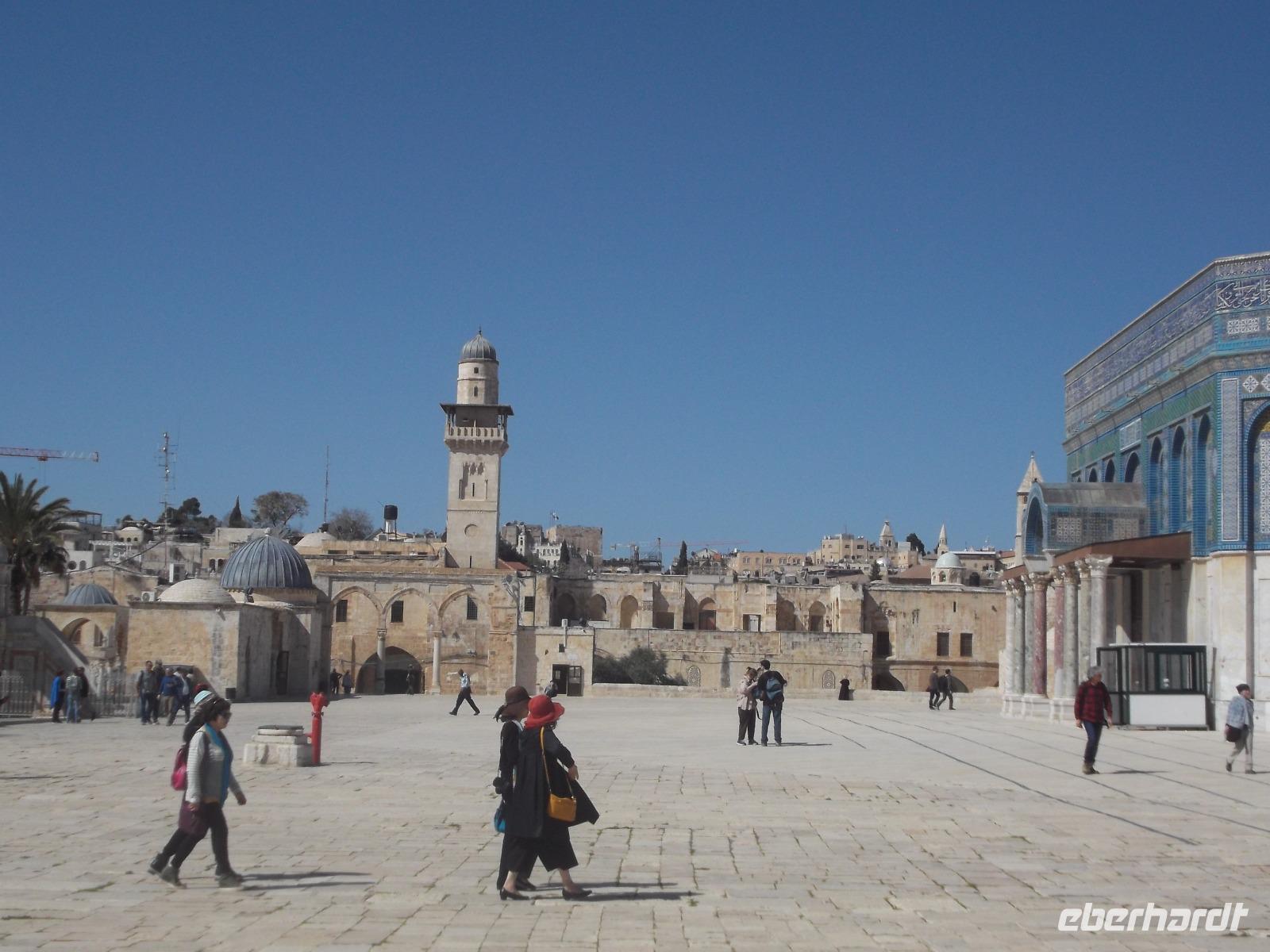 Unsere Besichtigung von Jerusalem heute begann mit dem Tempelberg, jenem von drei Weltreligionen als IHR Mittelpunkt beanspruchtem Ort, der das Herz der Stadt darstellt. Der weltberühmte Berg, eines der am meisten fotografierten Objekte der Weltgeschichte, ist vor allem in den Morgenstunden für Touristen zugänglich.