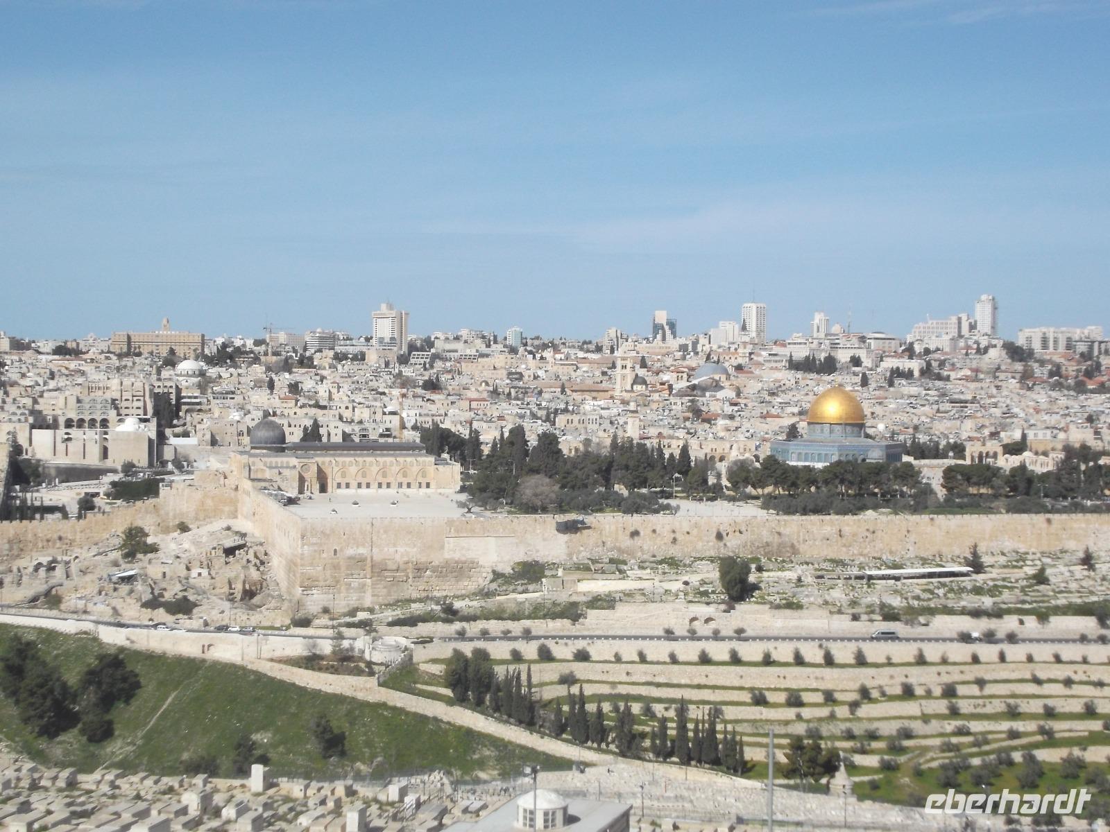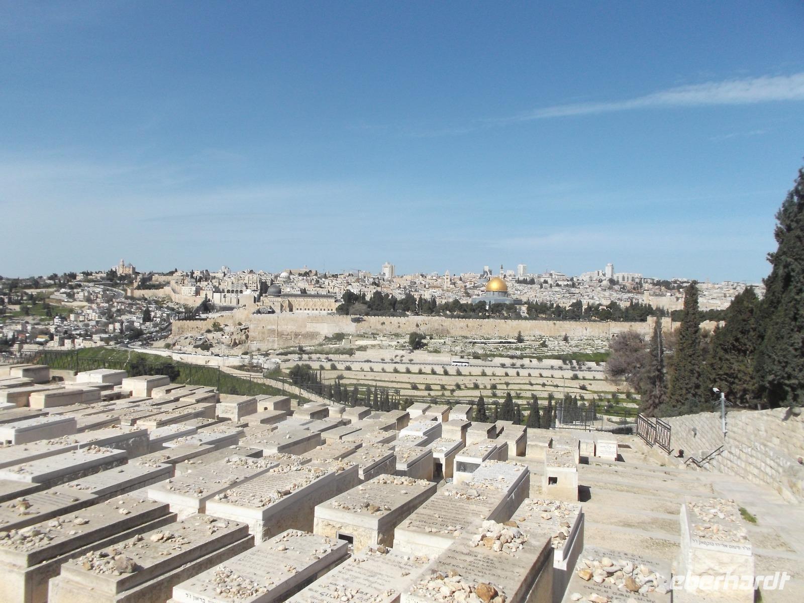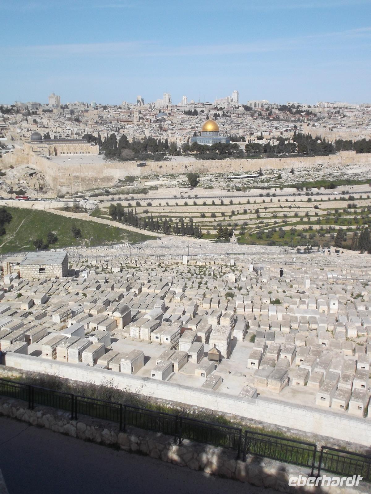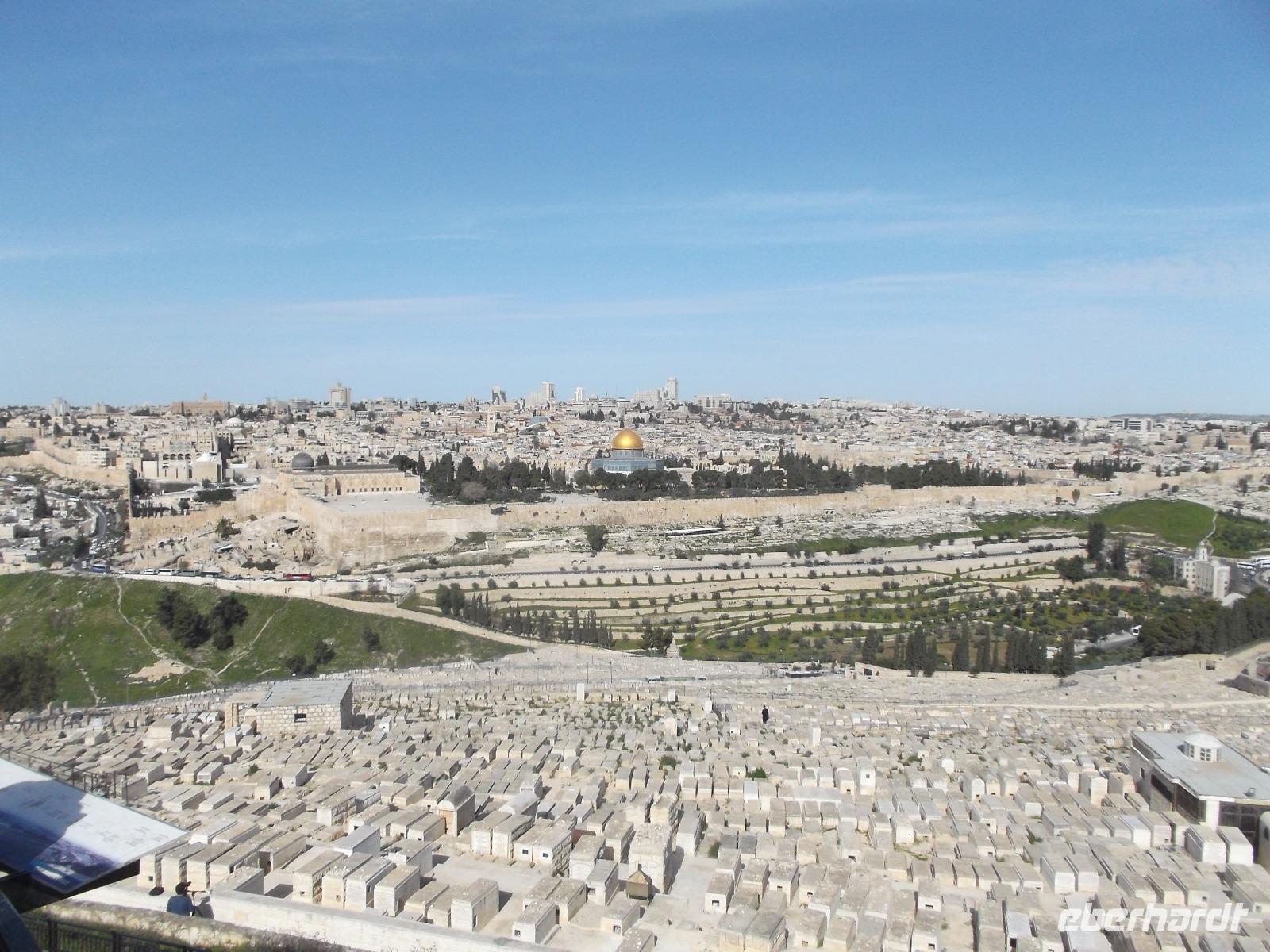 Ein Besuch des auch „Berg der Oliven" genannten Ölberges eröffnete den heutigen Tag mit einem atemberaubenden Panoramablick auf diese Stadt und besonders den Tempelberg. Der Felsendom mit seiner goldenen Kuppel lag, durch das Kidron-Tal vom Ölberg getrennt, genau gegenüber sozusagen am Beginn des Häusermeeres, das seltsam vertraut schien. Gut waren Freifläche, Felsendom und Al Aqsa-Moschee zu erkennen und natürlich das zugemauerte „Goldene Tor" in der Mauer des Tempelberges, durch das dereinst der Überlieferung nach, der Messias erscheinen soll, um, Gericht zu halten. Hier am Ölberg verbrachte Jesus Christus nach dem berühmten Abendmal den letzten Abend bzw. die Nacht mit seinen Jüngern und hier wurde er laut Überlieferung nach dem Verrat des Judas verhaftet. Und noch ein zweites Mal taucht der Ölberg in der biblischen Überlieferung auf, denn er soll auch Schauplatz von Christi Himmelfahrt gewesen sein, denn von diesem Berg wurde Jesus "aufgehoben gen Himmel und setzte sich zur Rechten Gottes", wie es in der Bibel heißt.