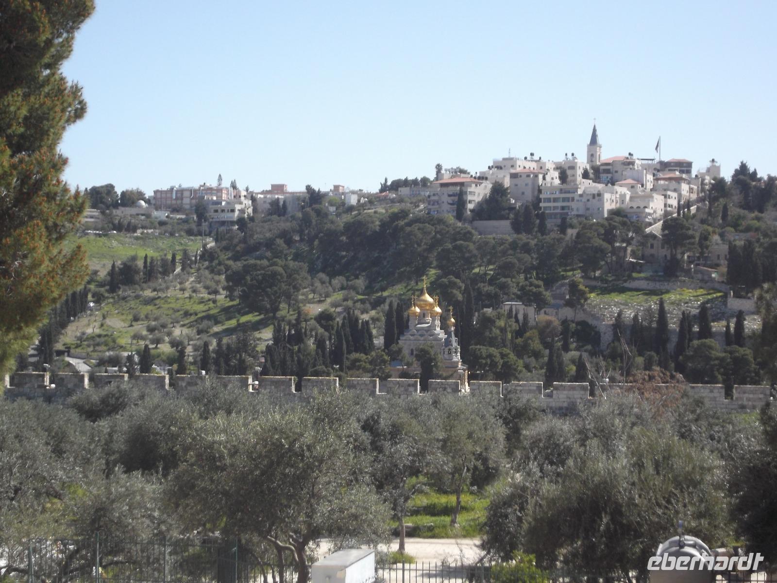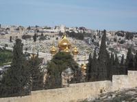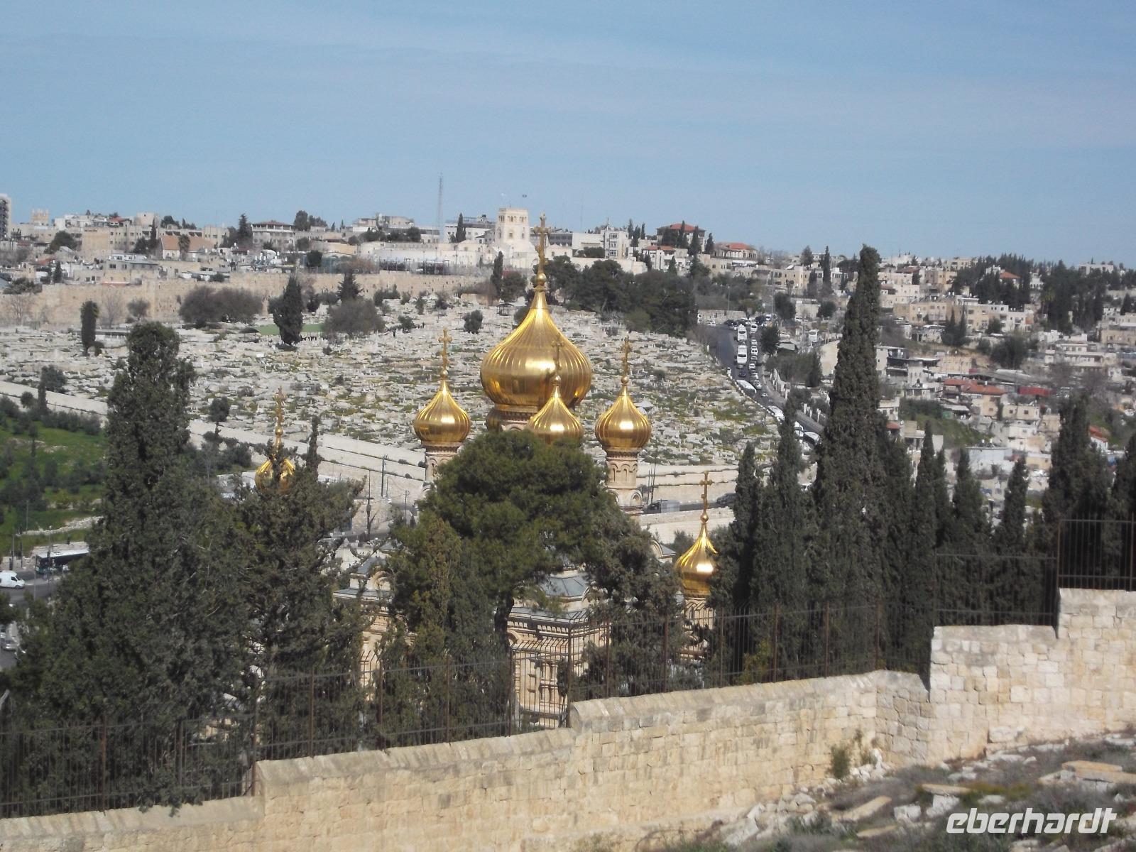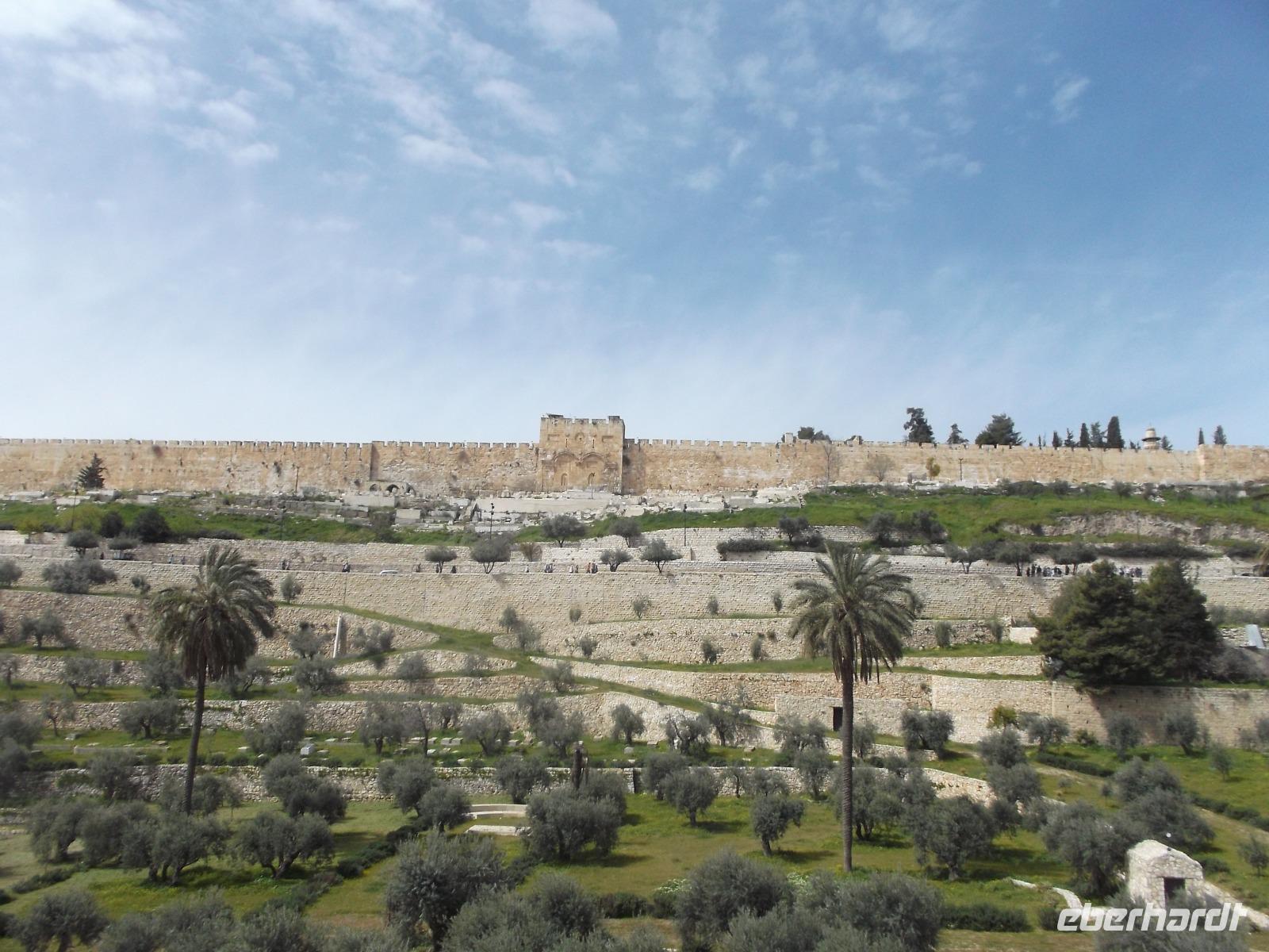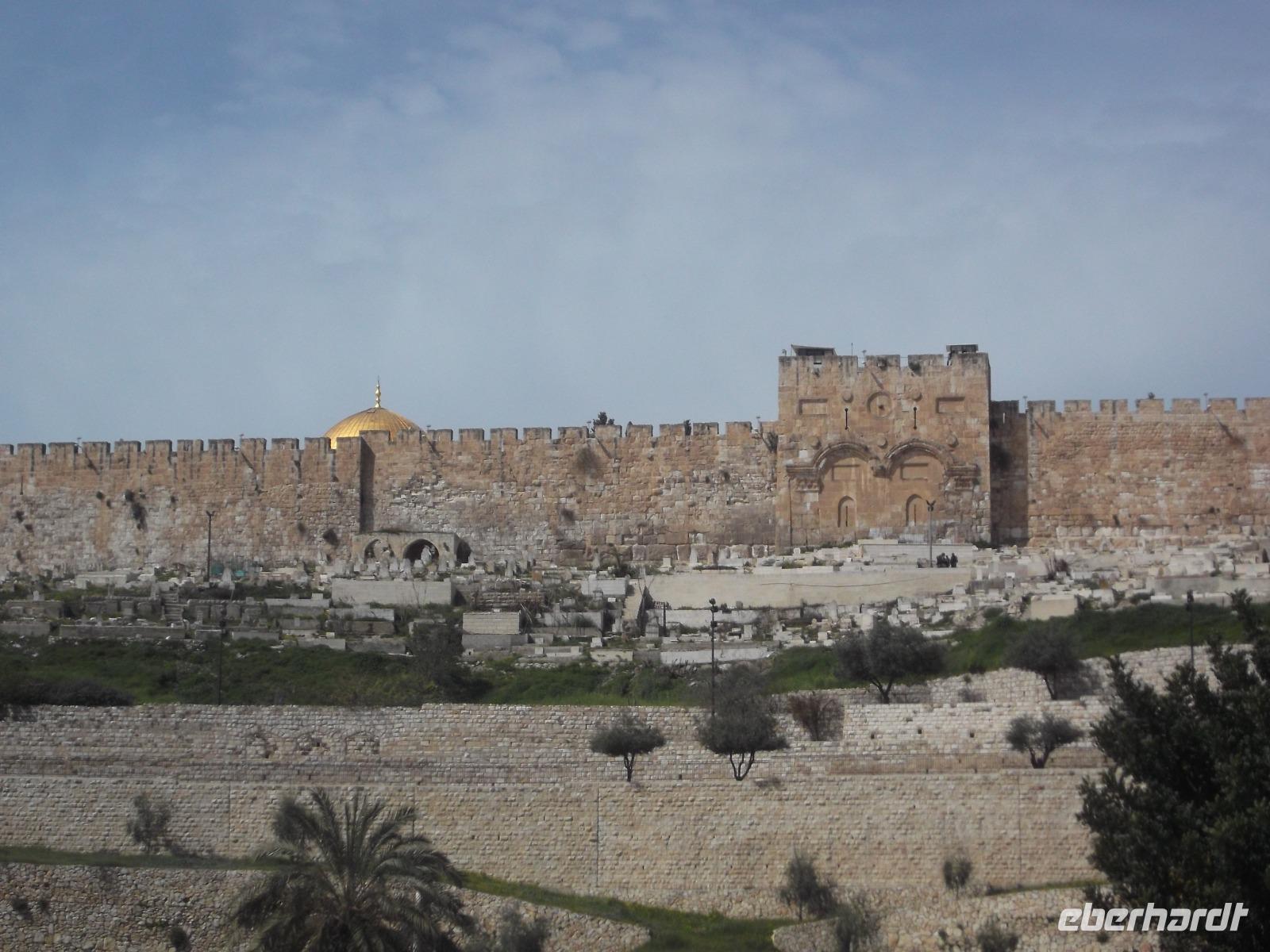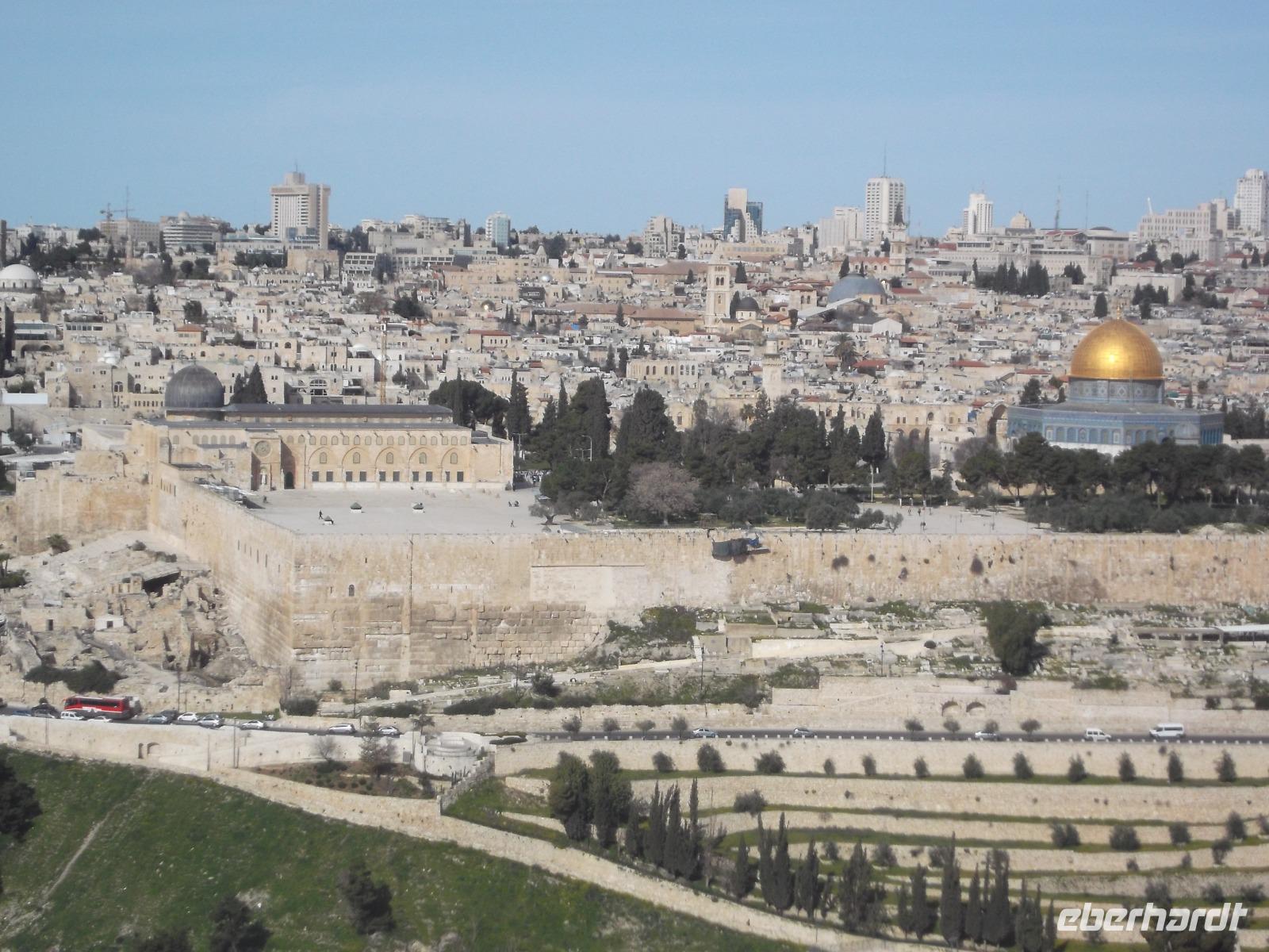 Ein Besuch des auch „Berg der Oliven" genannten Ölberges eröffnete den heutigen Tag mit einem atemberaubenden Panoramablick auf diese Stadt und besonders den Tempelberg. Der Felsendom mit seiner goldenen Kuppel lag, durch das Kidron-Tal vom Ölberg getrennt, genau gegenüber sozusagen am Beginn des Häusermeeres, das seltsam vertraut schien. Gut waren Freifläche, Felsendom und Al Aqsa-Moschee zu erkennen und natürlich das zugemauerte „Goldene Tor" in der Mauer des Tempelberges, durch das dereinst der Überlieferung nach, der Messias erscheinen soll, um, Gericht zu halten. Hier am Ölberg verbrachte Jesus Christus nach dem berühmten Abendmal den letzten Abend bzw. die Nacht mit seinen Jüngern und hier wurde er laut Überlieferung nach dem Verrat des Judas verhaftet. Und noch ein zweites Mal taucht der Ölberg in der biblischen Überlieferung auf, denn er soll auch Schauplatz von Christi Himmelfahrt gewesen sein, denn von diesem Berg wurde Jesus "aufgehoben gen Himmel und setzte sich zur Rechten Gottes", wie es in der Bibel heißt.
