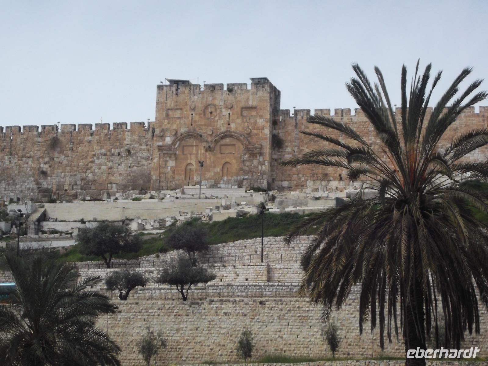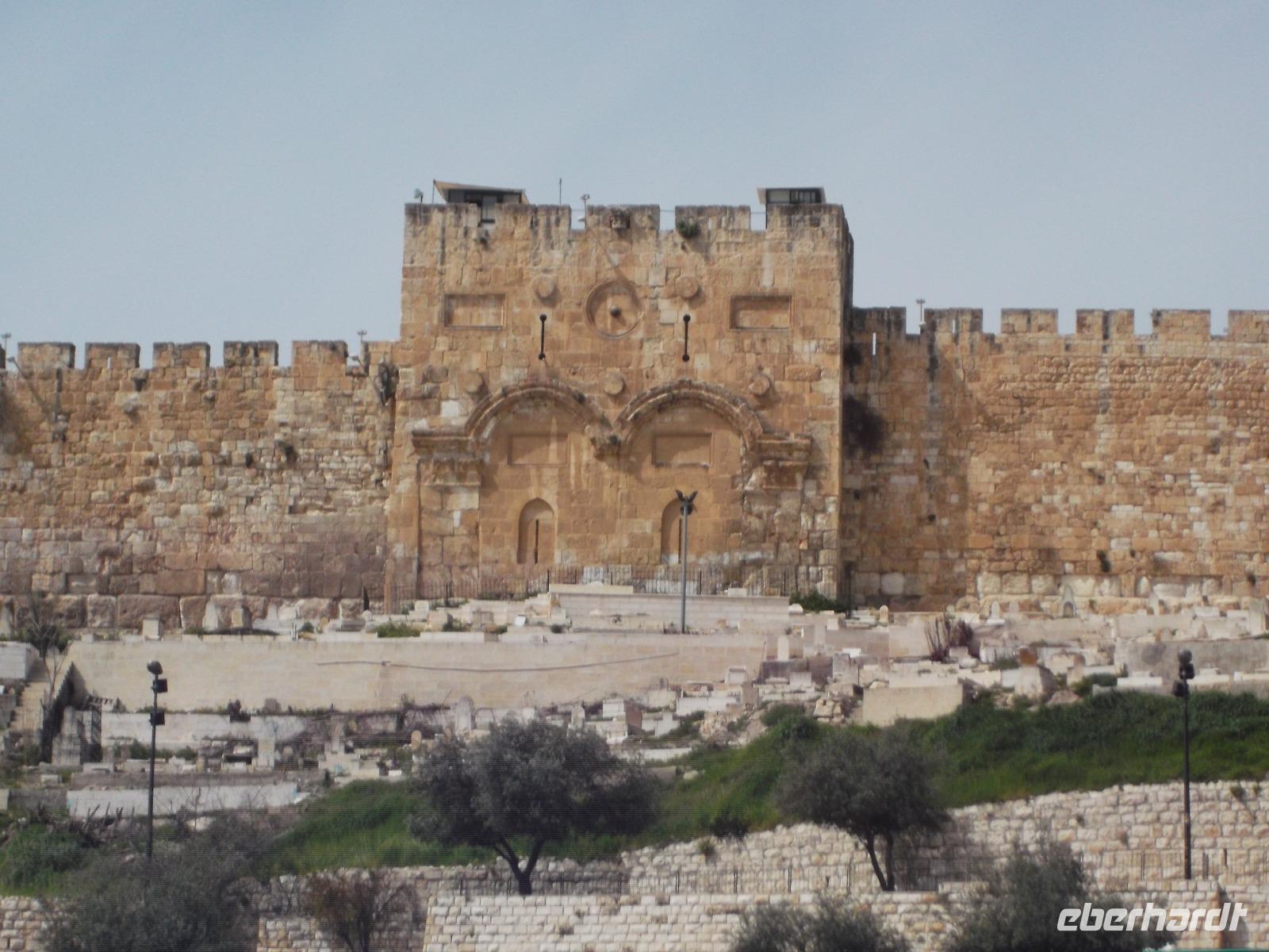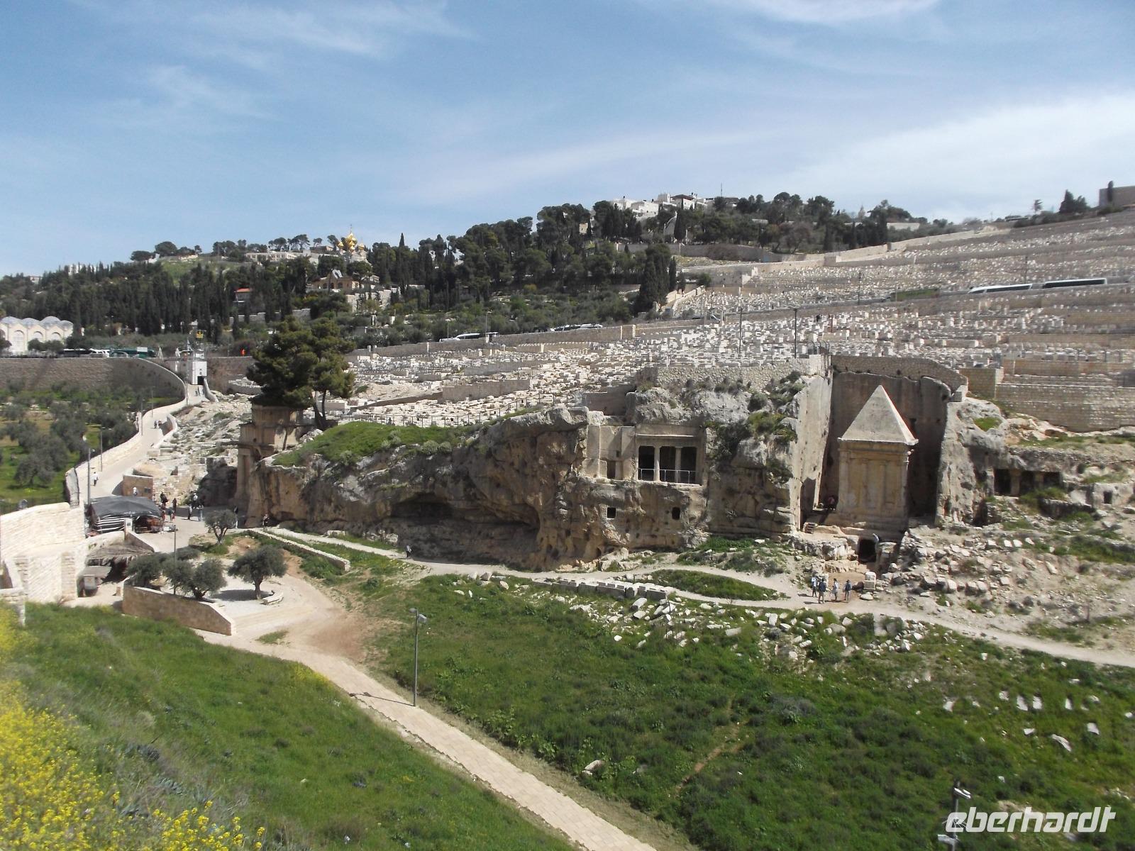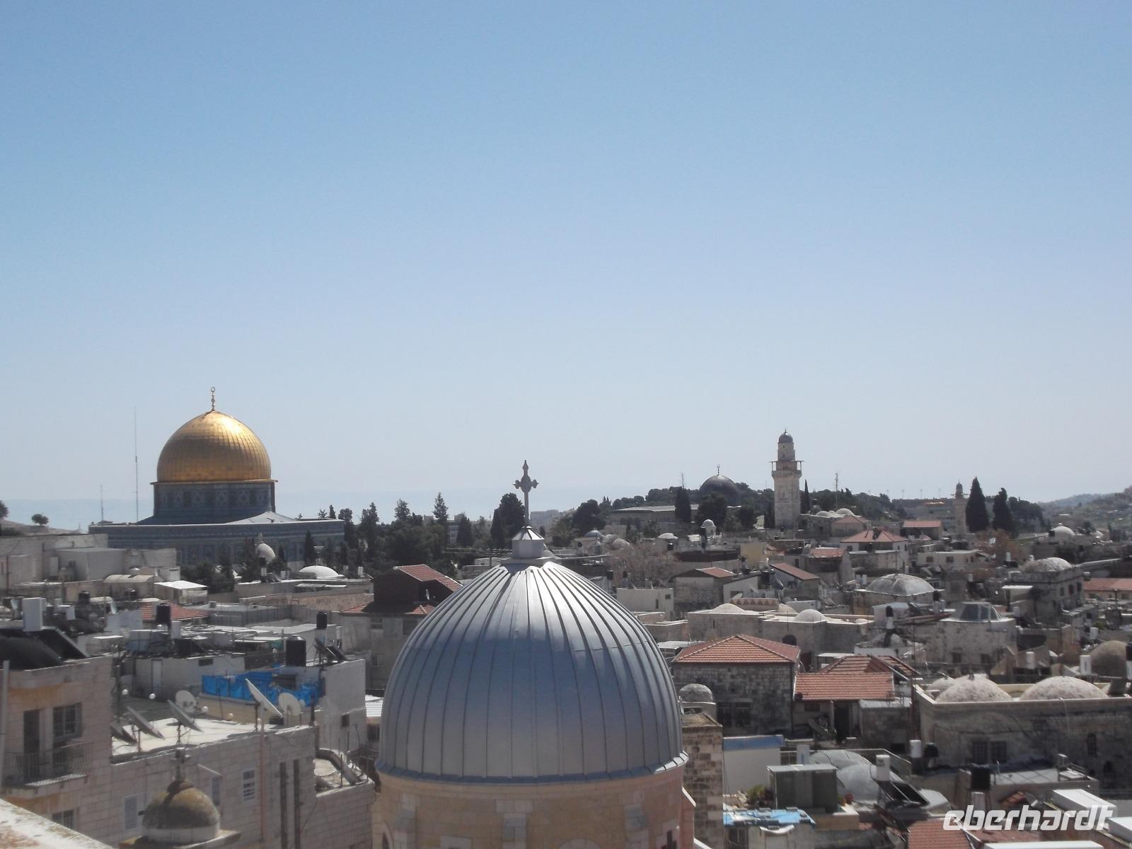 Ein Besuch des auch „Berg der Oliven" genannten Ölberges eröffnete den heutigen Tag mit einem atemberaubenden Panoramablick auf diese Stadt und besonders den Tempelberg. Der Felsendom mit seiner goldenen Kuppel lag, durch das Kidron-Tal vom Ölberg getrennt, genau gegenüber sozusagen am Beginn des Häusermeeres, das seltsam vertraut schien. Gut waren Freifläche, Felsendom und Al Aqsa-Moschee zu erkennen und natürlich das zugemauerte „Goldene Tor" in der Mauer des Tempelberges, durch das dereinst der Überlieferung nach, der Messias erscheinen soll, um, Gericht zu halten. Hier am Ölberg verbrachte Jesus Christus nach dem berühmten Abendmal den letzten Abend bzw. die Nacht mit seinen Jüngern und hier wurde er laut Überlieferung nach dem Verrat des Judas verhaftet. Und noch ein zweites Mal taucht der Ölberg in der biblischen Überlieferung auf, denn er soll auch Schauplatz von Christi Himmelfahrt gewesen sein, denn von diesem Berg wurde Jesus "aufgehoben gen Himmel und setzte sich zur Rechten Gottes", wie es in der Bibel heißt.