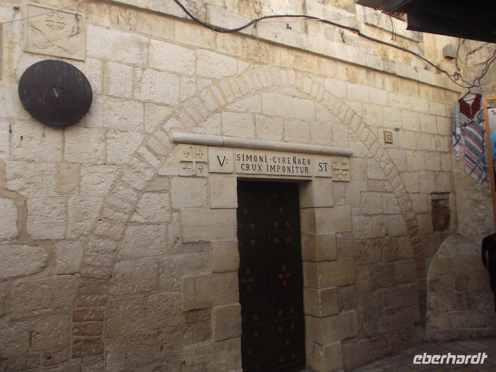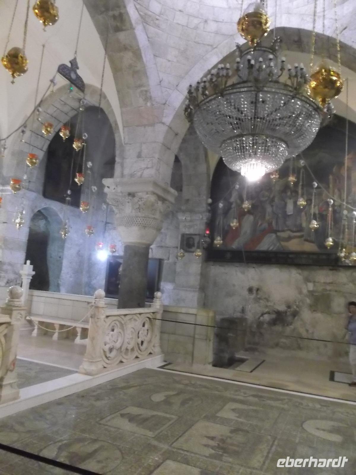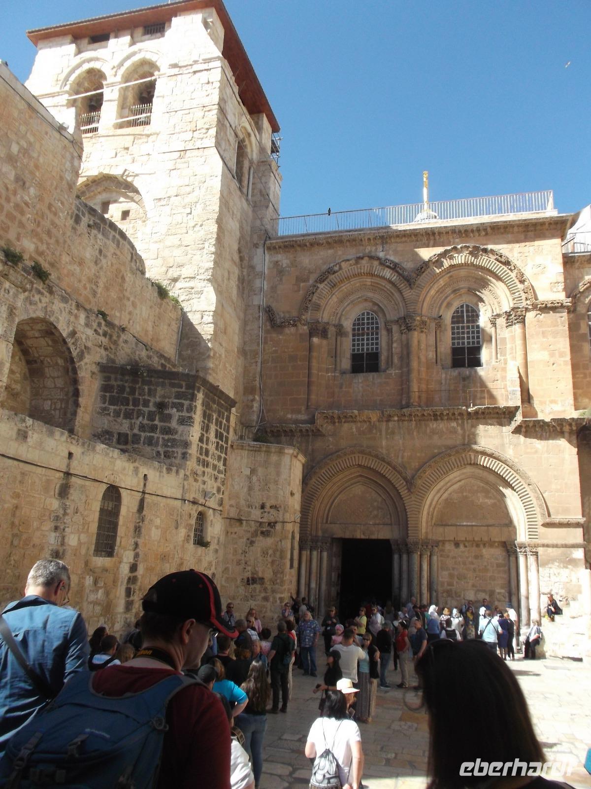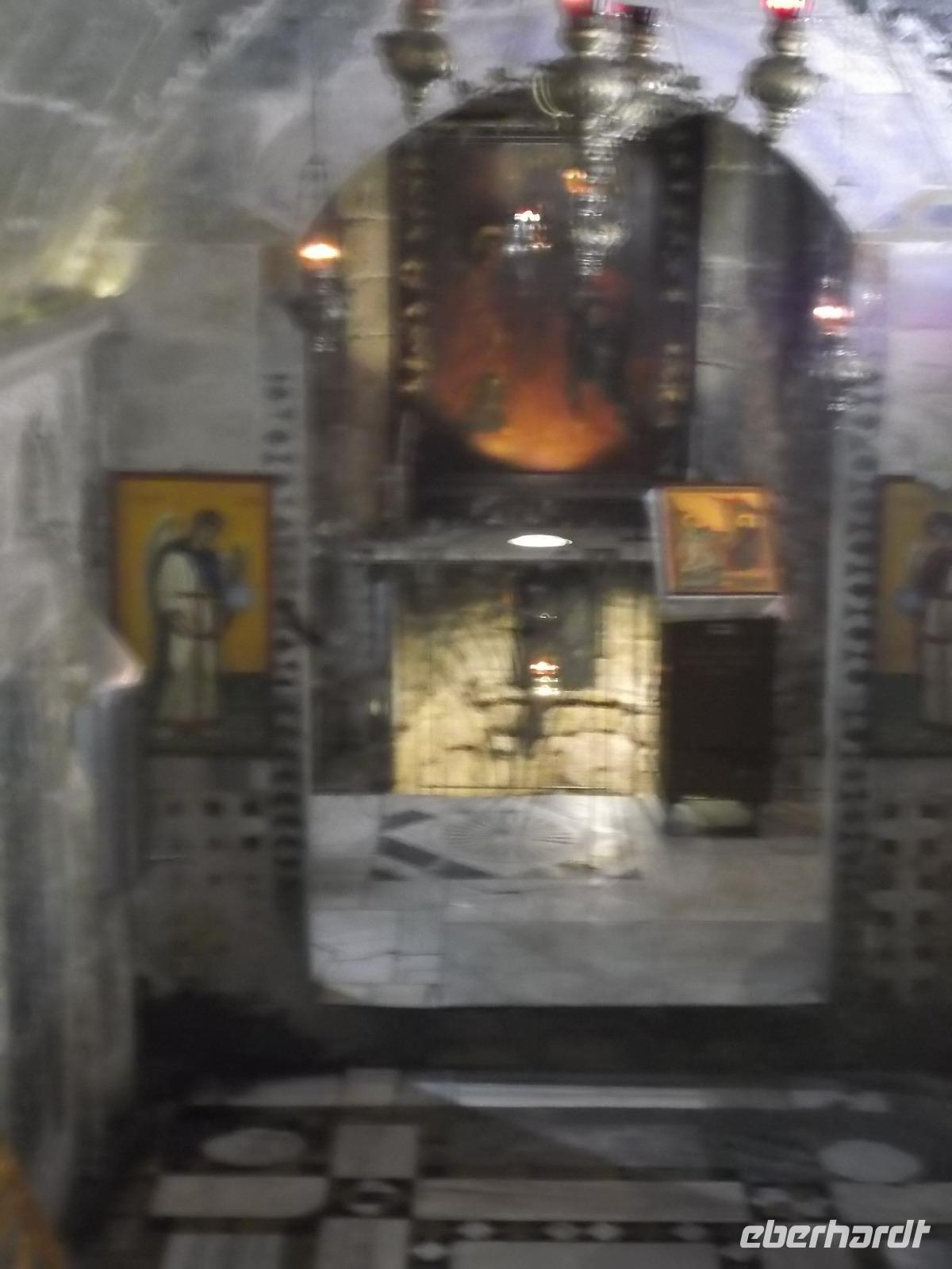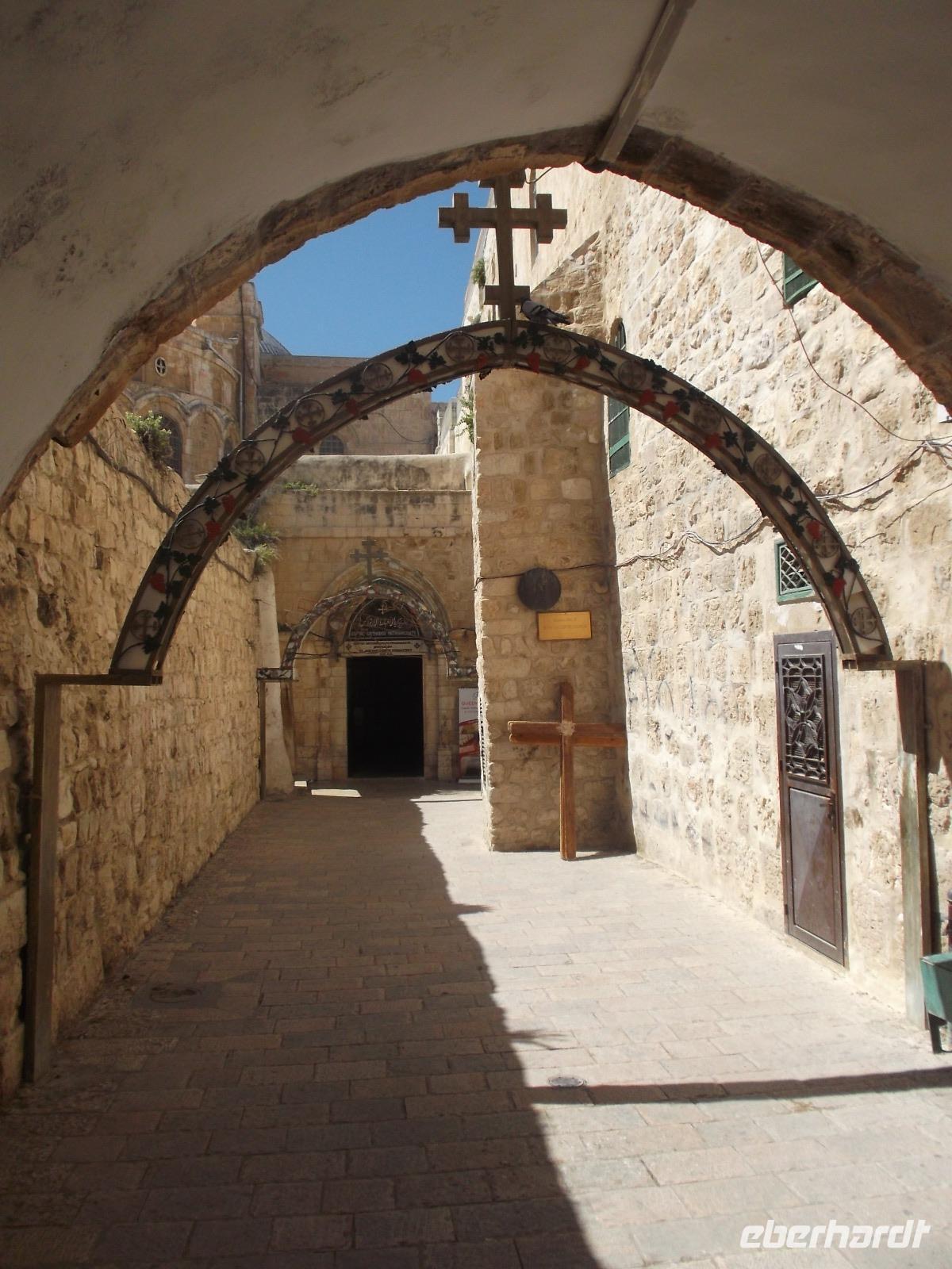 Durch das sogenannte Löwentor erhielten wir später Einlass in die Altstadt und gelangten nach kurzem Spaziergang in eine der berühmtesten Straßen der Christenheit und eine der bekanntesten der Jerusalemer Altstadt: die Via Dolorosa. Die „Straße der Schmerzen" ist der Leidensweg Christi, jener Weg, den laut den Evangelien des Neuen Testaments Jesus Christus nach seiner Verurteilung durch Pontius Pilatus nahm und den entlang er sein Kreuz zur Hinrichtungsstätte Golgotha tragen musste. In christlicher Überlieferung ist dieser Weg der Passion Christi fest verankert und bildet als Prozessionsweg das Vorbild aller Kreuzwege, die in christlichen Ländern und nahezu allen Kirchen zu Ostern die Leiden von Jesus nachvollziehen und an dem bei jeder der bekannten Fixpunkte gebetet wird. Während unseres Ganges entlang der Via Dolorosa besuchten wir einige der Stationen des Leidensweges, wie den Ort der Verurteilung, der Geißelung und andere Stationen des Weges - wo Jesus auf seine Mutter traf, Simon das Kreuz trug, Veronika das Gesicht Jesu trocknete und viele mehr. Zum Schluss erreichten wir die heutige Grabeskirche. Sie gehört zu den bedeutendsten Heiligtümern des Christentums, vereinigt sie doch unter ihrem Dach die überlieferten Stätten der Kreuzigung und Grablegung von Jesus Christus. Mehrere christliche Konfessionen „teilen" sich den heiligen Ort und so sieht man innerhalb des berühmten Bauwerkes unterschiedliche Stilrichtungen und kann an verschiedenen Verehrungsliturgien teilnehmen, denn sowohl römisch-katholische Priester wie auch Würdenträger der armenischen, der griechisch-orthodoxen, der äthiopischen Kirche wie auch anderer christlicher Glaubensrichtungen feiern hier Gottesdienste... Gleich hinter dem Eingang kann man den Salbungsstein erkennen, auf dem der Leichnam Christi zur Bestattung vorbereitet worden sein soll - die bedeutendsten Heiligtümer bilden aber der Golgathafelsen, auf dem der Überlieferung nach Jesus am Kreuz starb und ein nahegelegener kleiner Extra-Bau innerhalb der Kirche, eine Ädikula, die den Felsen mit der Grabgrotte beherbergt, in die einst der Leichnam Jesu gelegt worden sein soll und von der aus seine Auferstehung erfolgte. Sehr interessant ist auch die Helenakapelle, der später heiliggesprochenen Mutter des römischen Kaisers Konstantin des Großen geweiht, die hier das wirkliche Kreuz, an dem Jesus starb, gefunden haben soll. Ein Hauch der Geschichte weht durch diesen Baum, vor allem wenn man an den Wänden der Helenakapelle tausende eingeritzter Kreuze und Symbole bemerkt, die während der Zeit der Kreuzzüge vorwiegend im 12. Jh. hier von Kreuzrittern eingraviert wurden.