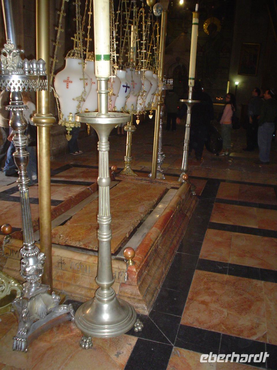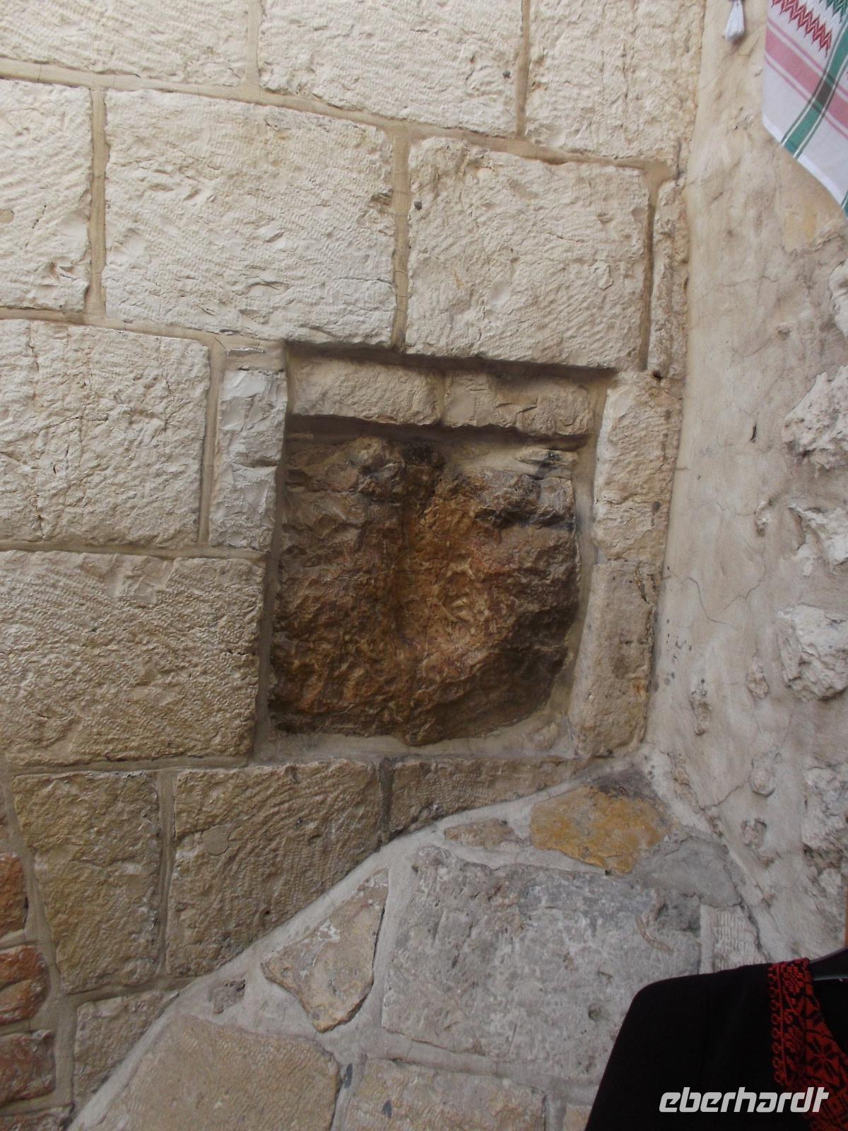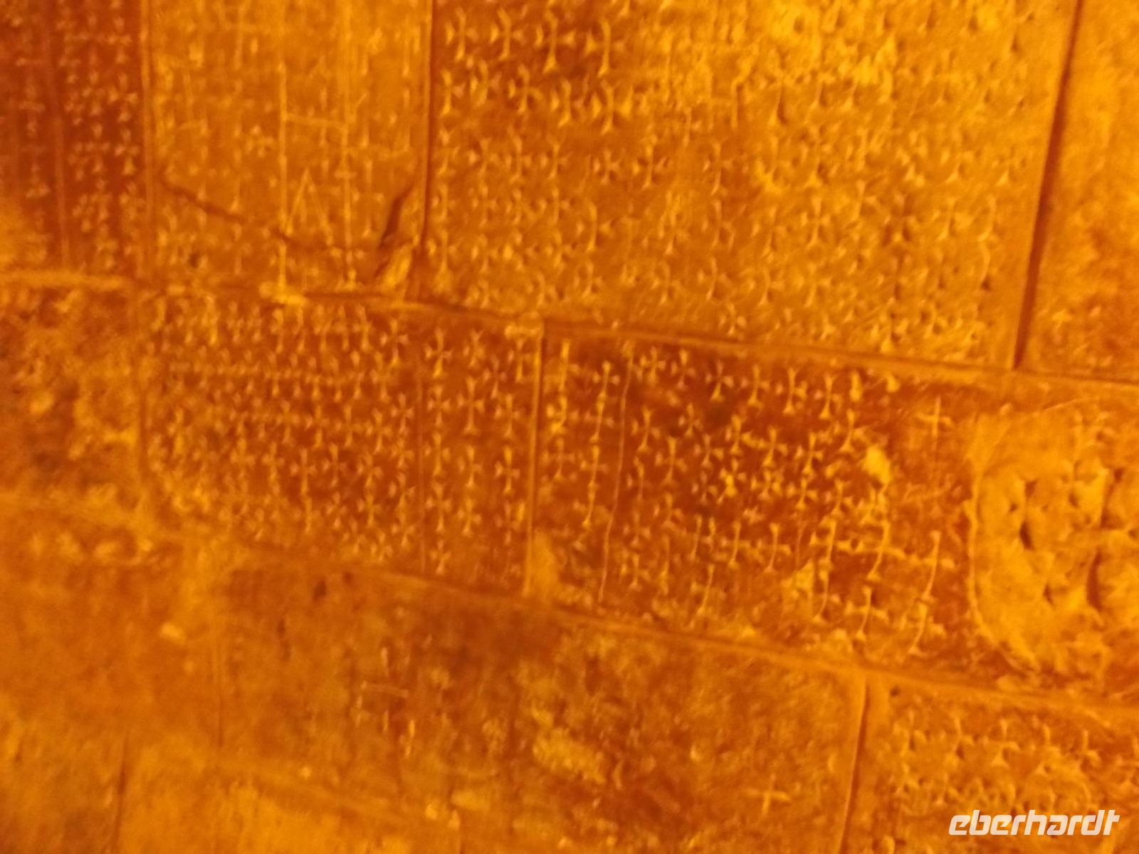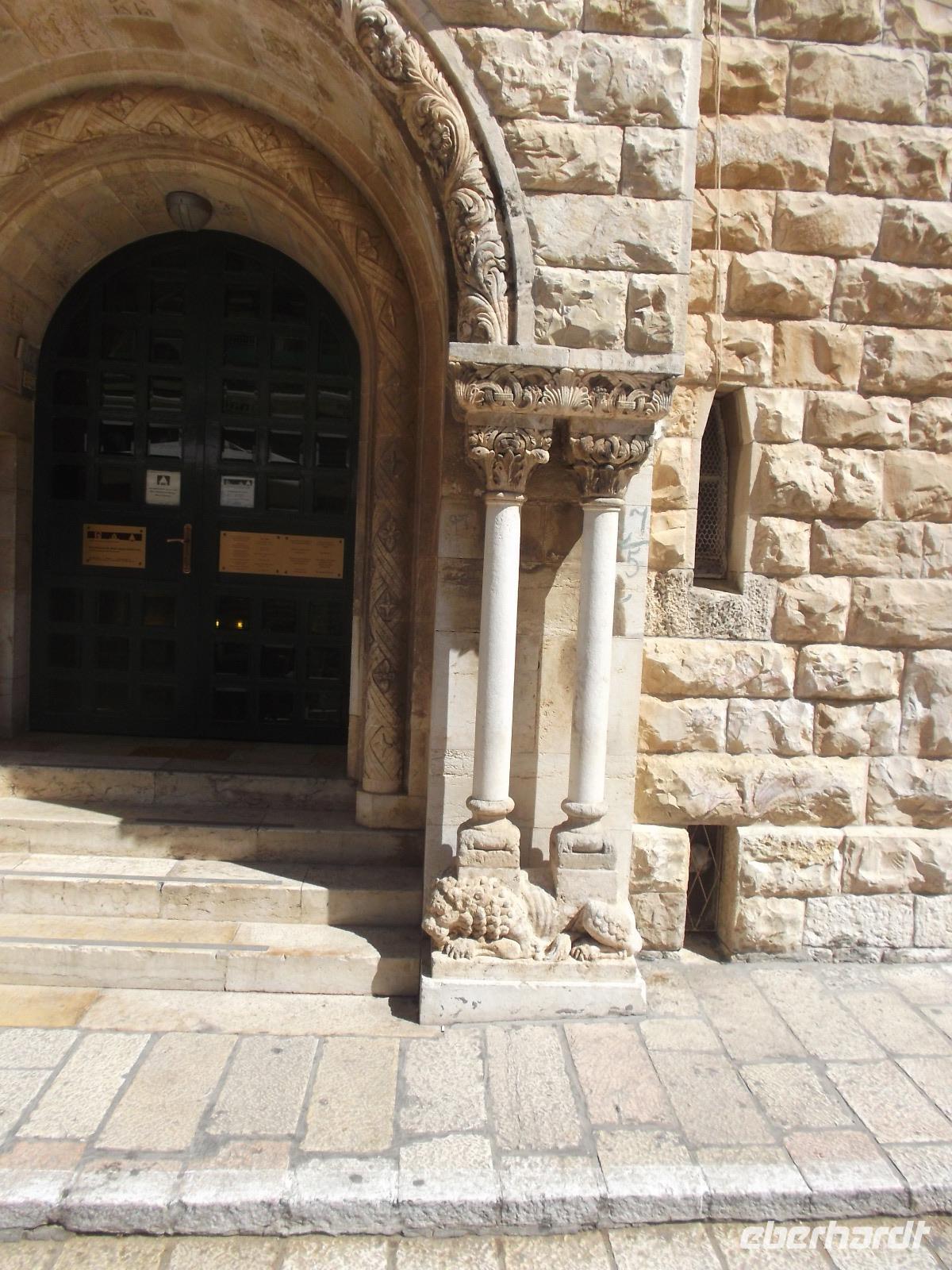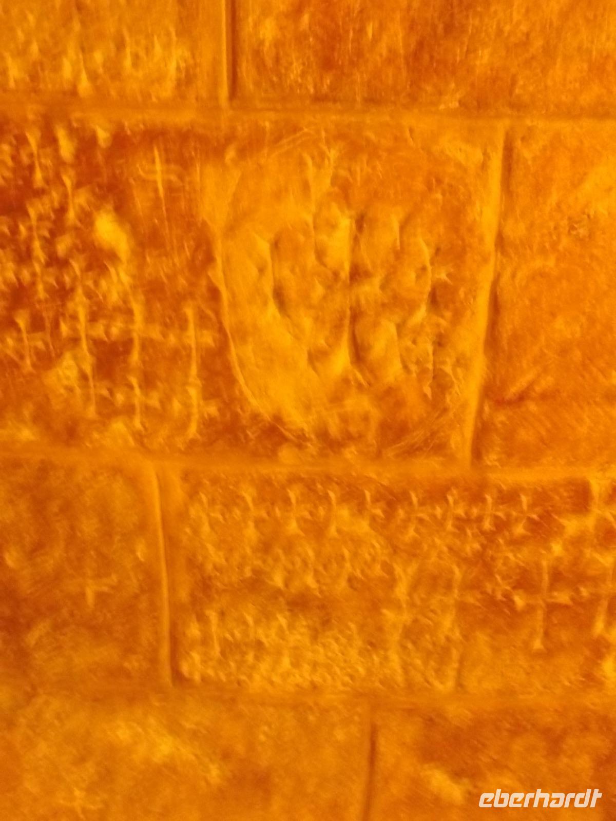 Durch das sogenannte Löwentor erhielten wir später Einlass in die Altstadt und gelangten nach kurzem Spaziergang in eine der berühmtesten Straßen der Christenheit und eine der bekanntesten der Jerusalemer Altstadt: die Via Dolorosa. Die „Straße der Schmerzen" ist der Leidensweg Christi, jener Weg, den laut den Evangelien des Neuen Testaments Jesus Christus nach seiner Verurteilung durch Pontius Pilatus nahm und den entlang er sein Kreuz zur Hinrichtungsstätte Golgotha tragen musste. In christlicher Überlieferung ist dieser Weg der Passion Christi fest verankert und bildet als Prozessionsweg das Vorbild aller Kreuzwege, die in christlichen Ländern und nahezu allen Kirchen zu Ostern die Leiden von Jesus nachvollziehen und an dem bei jeder der bekannten Fixpunkte gebetet wird. Während unseres Ganges entlang der Via Dolorosa besuchten wir einige der Stationen des Leidensweges, wie den Ort der Verurteilung, der Geißelung und andere Stationen des Weges - wo Jesus auf seine Mutter traf, Simon das Kreuz trug, Veronika das Gesicht Jesu trocknete und viele mehr. Zum Schluss erreichten wir die heutige Grabeskirche. Sie gehört zu den bedeutendsten Heiligtümern des Christentums, vereinigt sie doch unter ihrem Dach die überlieferten Stätten der Kreuzigung und Grablegung von Jesus Christus. Mehrere christliche Konfessionen „teilen" sich den heiligen Ort und so sieht man innerhalb des berühmten Bauwerkes unterschiedliche Stilrichtungen und kann an verschiedenen Verehrungsliturgien teilnehmen, denn sowohl römisch-katholische Priester wie auch Würdenträger der armenischen, der griechisch-orthodoxen, der äthiopischen Kirche wie auch anderer christlicher Glaubensrichtungen feiern hier Gottesdienste... Gleich hinter dem Eingang kann man den Salbungsstein erkennen, auf dem der Leichnam Christi zur Bestattung vorbereitet worden sein soll - die bedeutendsten Heiligtümer bilden aber der Golgathafelsen, auf dem der Überlieferung nach Jesus am Kreuz starb und ein nahegelegener kleiner Extra-Bau innerhalb der Kirche, eine Ädikula, die den Felsen mit der Grabgrotte beherbergt, in die einst der Leichnam Jesu gelegt worden sein soll und von der aus seine Auferstehung erfolgte. Sehr interessant ist auch die Helenakapelle, der später heiliggesprochenen Mutter des römischen Kaisers Konstantin des Großen geweiht, die hier das wirkliche Kreuz, an dem Jesus starb, gefunden haben soll. Ein Hauch der Geschichte weht durch diesen Baum, vor allem wenn man an den Wänden der Helenakapelle tausende eingeritzter Kreuze und Symbole bemerkt, die während der Zeit der Kreuzzüge vorwiegend im 12. Jh. hier von Kreuzrittern eingraviert wurden.