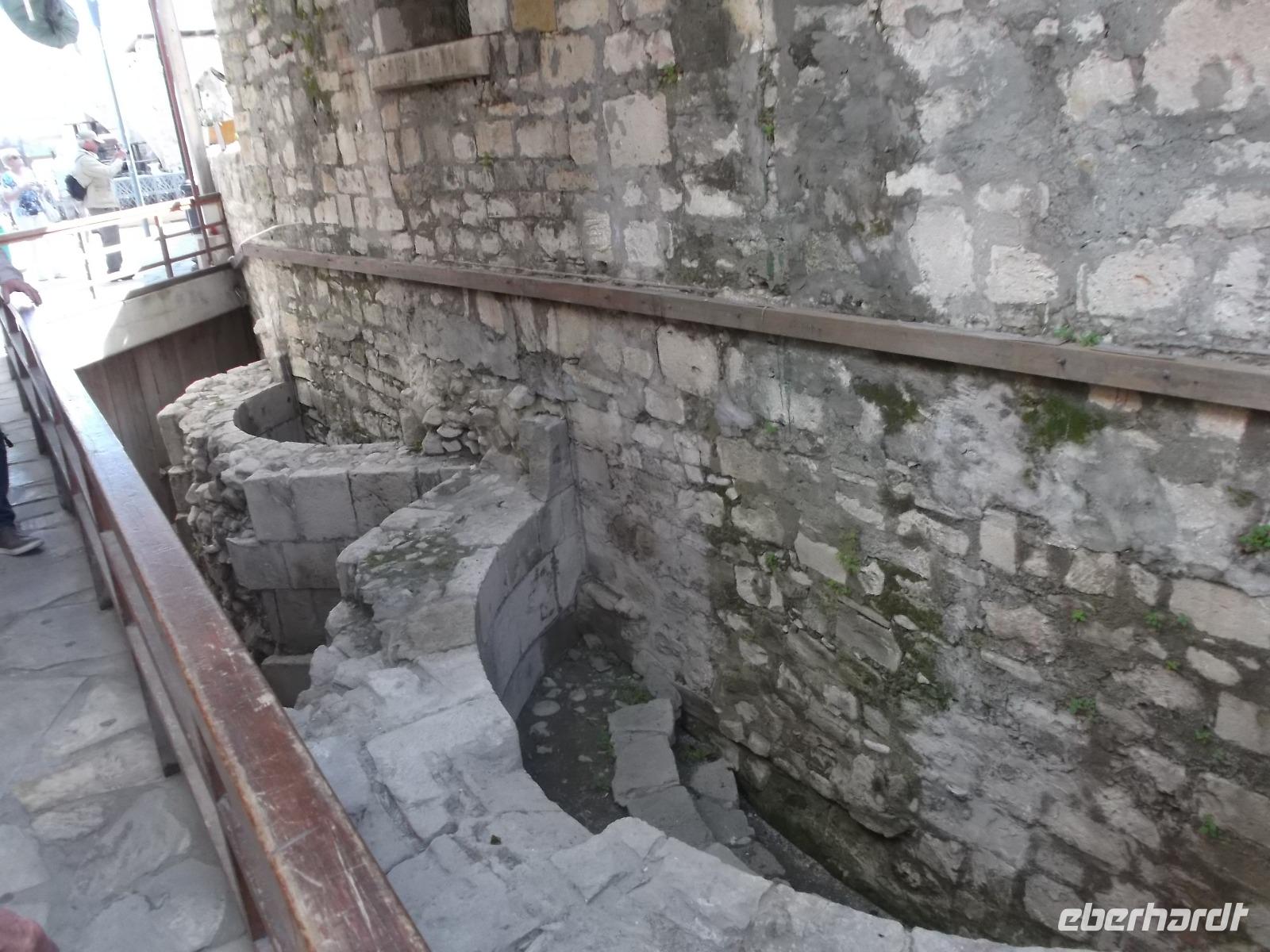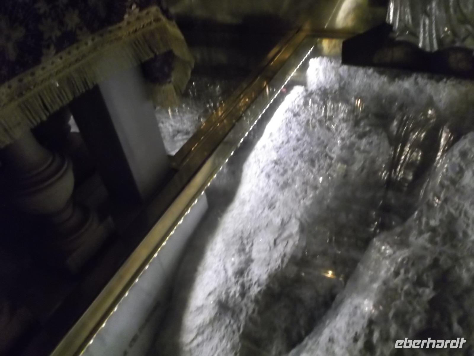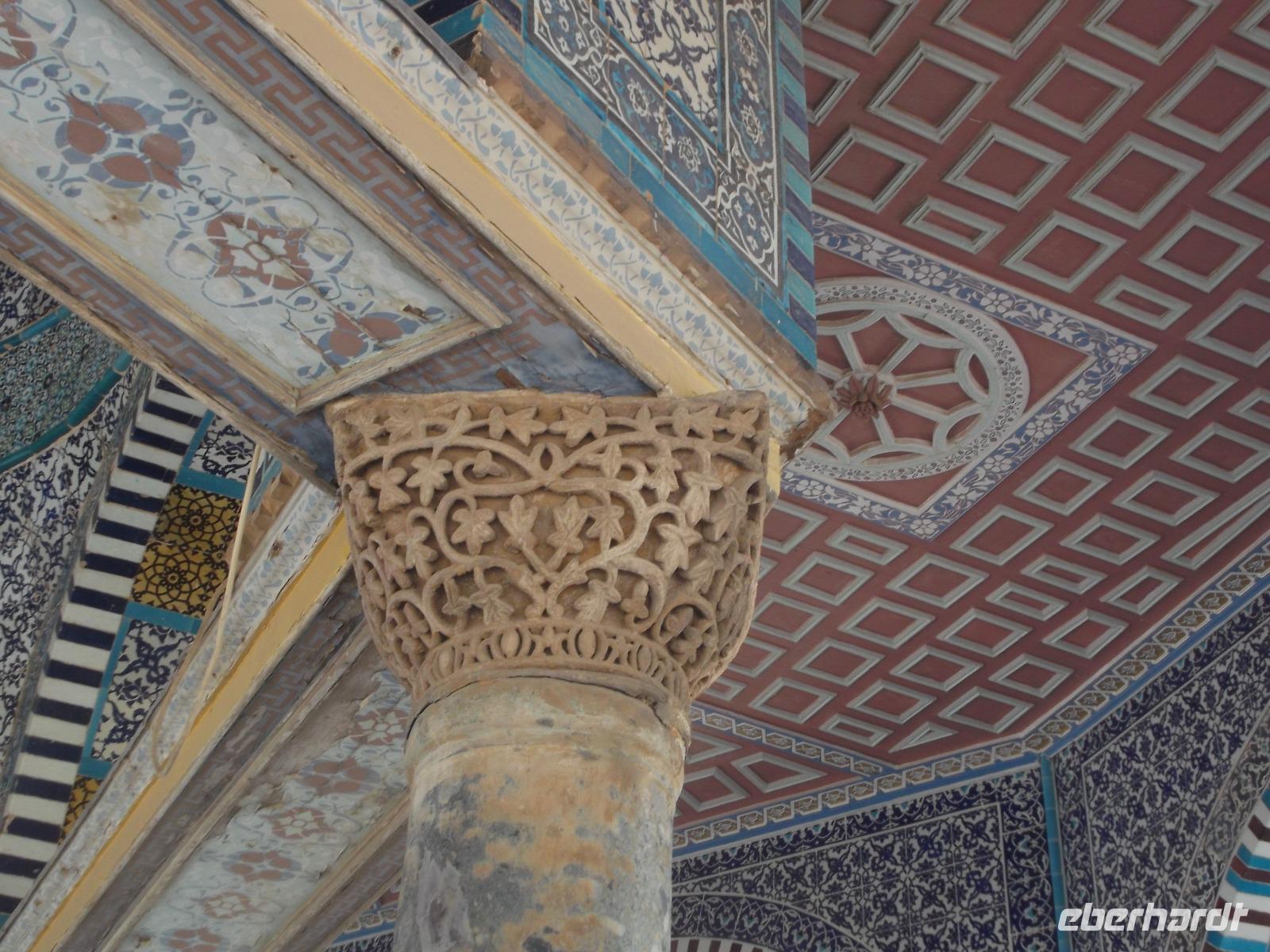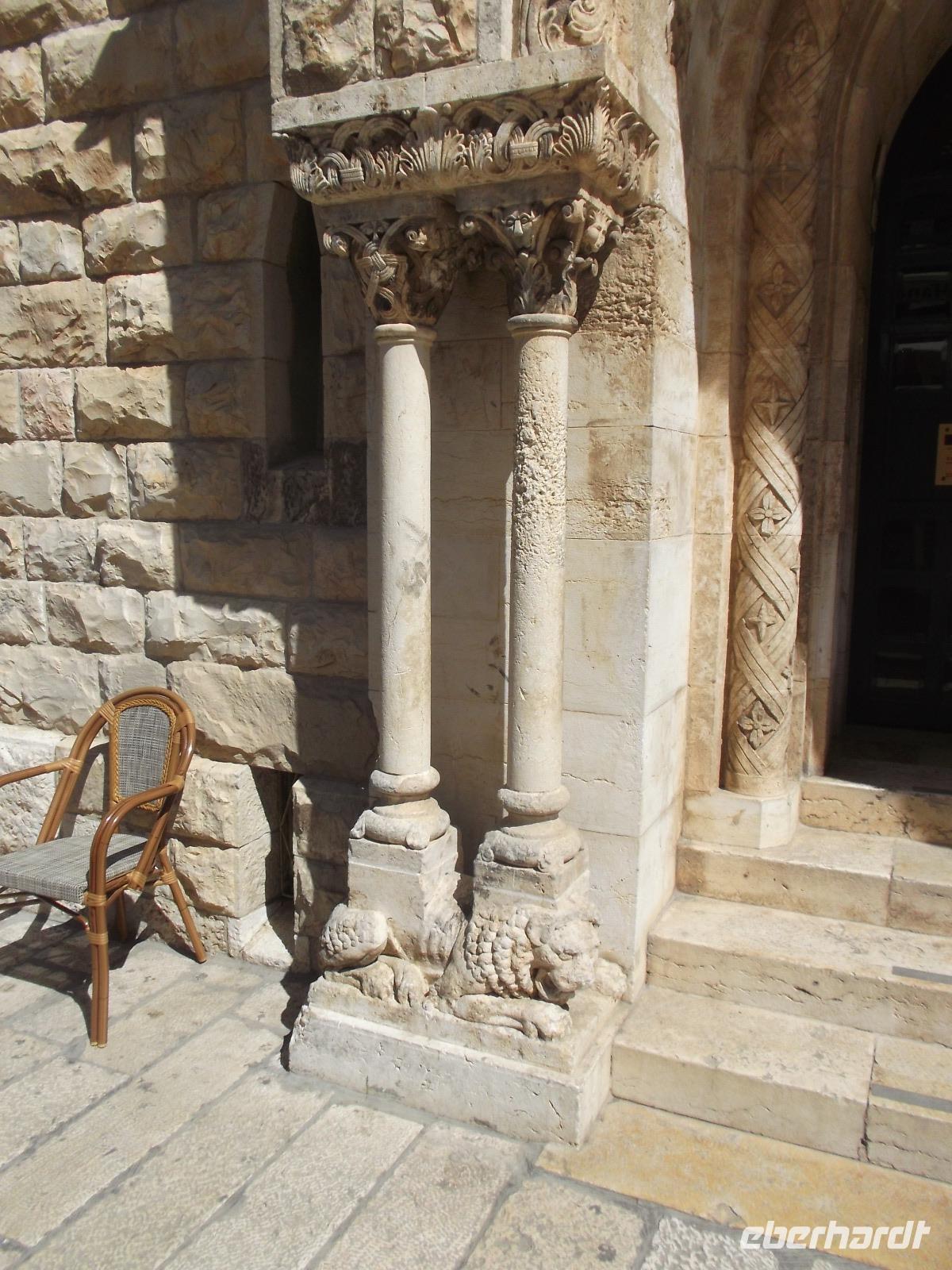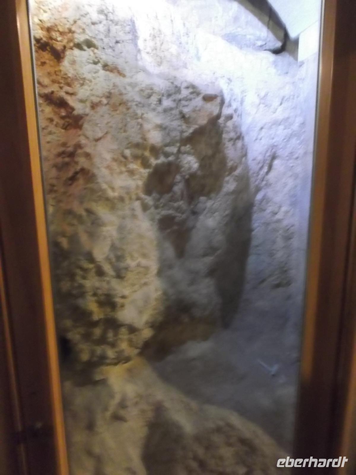 Durch das sogenannte Löwentor erhielten wir später Einlass in die Altstadt und gelangten nach kurzem Spaziergang in eine der berühmtesten Straßen der Christenheit und eine der bekanntesten der Jerusalemer Altstadt: die Via Dolorosa. Die „Straße der Schmerzen" ist der Leidensweg Christi, jener Weg, den laut den Evangelien des Neuen Testaments Jesus Christus nach seiner Verurteilung durch Pontius Pilatus nahm und den entlang er sein Kreuz zur Hinrichtungsstätte Golgotha tragen musste. In christlicher Überlieferung ist dieser Weg der Passion Christi fest verankert und bildet als Prozessionsweg das Vorbild aller Kreuzwege, die in christlichen Ländern und nahezu allen Kirchen zu Ostern die Leiden von Jesus nachvollziehen und an dem bei jeder der bekannten Fixpunkte gebetet wird. Während unseres Ganges entlang der Via Dolorosa besuchten wir einige der Stationen des Leidensweges, wie den Ort der Verurteilung, der Geißelung und andere Stationen des Weges - wo Jesus auf seine Mutter traf, Simon das Kreuz trug, Veronika das Gesicht Jesu trocknete und viele mehr. Zum Schluss erreichten wir die heutige Grabeskirche. Sie gehört zu den bedeutendsten Heiligtümern des Christentums, vereinigt sie doch unter ihrem Dach die überlieferten Stätten der Kreuzigung und Grablegung von Jesus Christus. Mehrere christliche Konfessionen „teilen" sich den heiligen Ort und so sieht man innerhalb des berühmten Bauwerkes unterschiedliche Stilrichtungen und kann an verschiedenen Verehrungsliturgien teilnehmen, denn sowohl römisch-katholische Priester wie auch Würdenträger der armenischen, der griechisch-orthodoxen, der äthiopischen Kirche wie auch anderer christlicher Glaubensrichtungen feiern hier Gottesdienste... Gleich hinter dem Eingang kann man den Salbungsstein erkennen, auf dem der Leichnam Christi zur Bestattung vorbereitet worden sein soll - die bedeutendsten Heiligtümer bilden aber der Golgathafelsen, auf dem der Überlieferung nach Jesus am Kreuz starb und ein nahegelegener kleiner Extra-Bau innerhalb der Kirche, eine Ädikula, die den Felsen mit der Grabgrotte beherbergt, in die einst der Leichnam Jesu gelegt worden sein soll und von der aus seine Auferstehung erfolgte. Sehr interessant ist auch die Helenakapelle, der später heiliggesprochenen Mutter des römischen Kaisers Konstantin des Großen geweiht, die hier das wirkliche Kreuz, an dem Jesus starb, gefunden haben soll. Ein Hauch der Geschichte weht durch diesen Baum, vor allem wenn man an den Wänden der Helenakapelle tausende eingeritzter Kreuze und Symbole bemerkt, die während der Zeit der Kreuzzüge vorwiegend im 12. Jh. hier von Kreuzrittern eingraviert wurden.