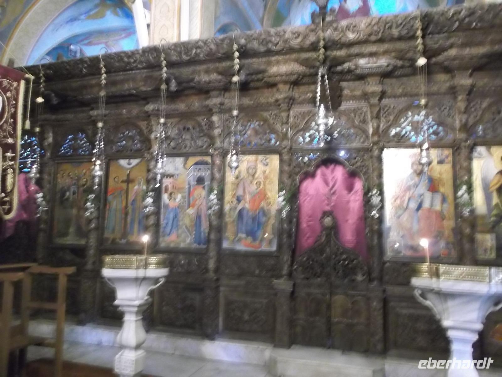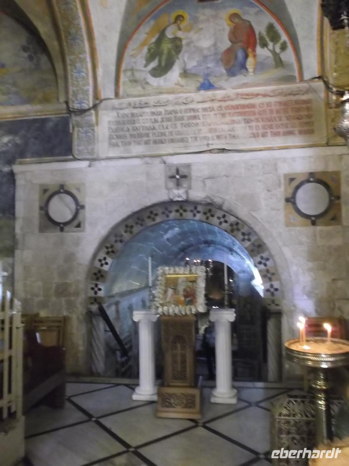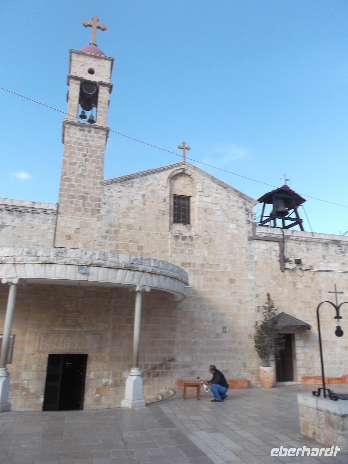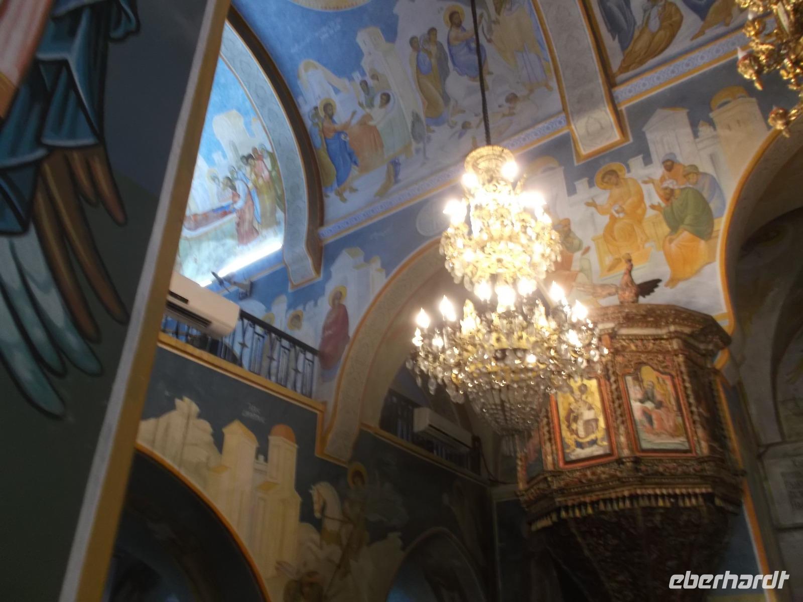 Nach ausgiebigem Besuch der Kirche hatte Reiseleiter Eitan noch eine kleine Überraschung parat: durch die Altstadt und über den kleinen Markt von Nazareth ging es zu einer weiteren Verkündigungskirche, jener nämlich, von der die orthodoxen Christen glauben, dass der Erzengel Gabriel HIER der Jungfrau Maria erschienen sei. Sie steht über einer ehemaligen Dorfquelle - ist im Inneren sehr hübsch bemalt und gegenüber dem gewaltigen katholischn Bau, den wir eine gute halbe Stunde zuvor besichtigt hatten, eher unscheinbar.