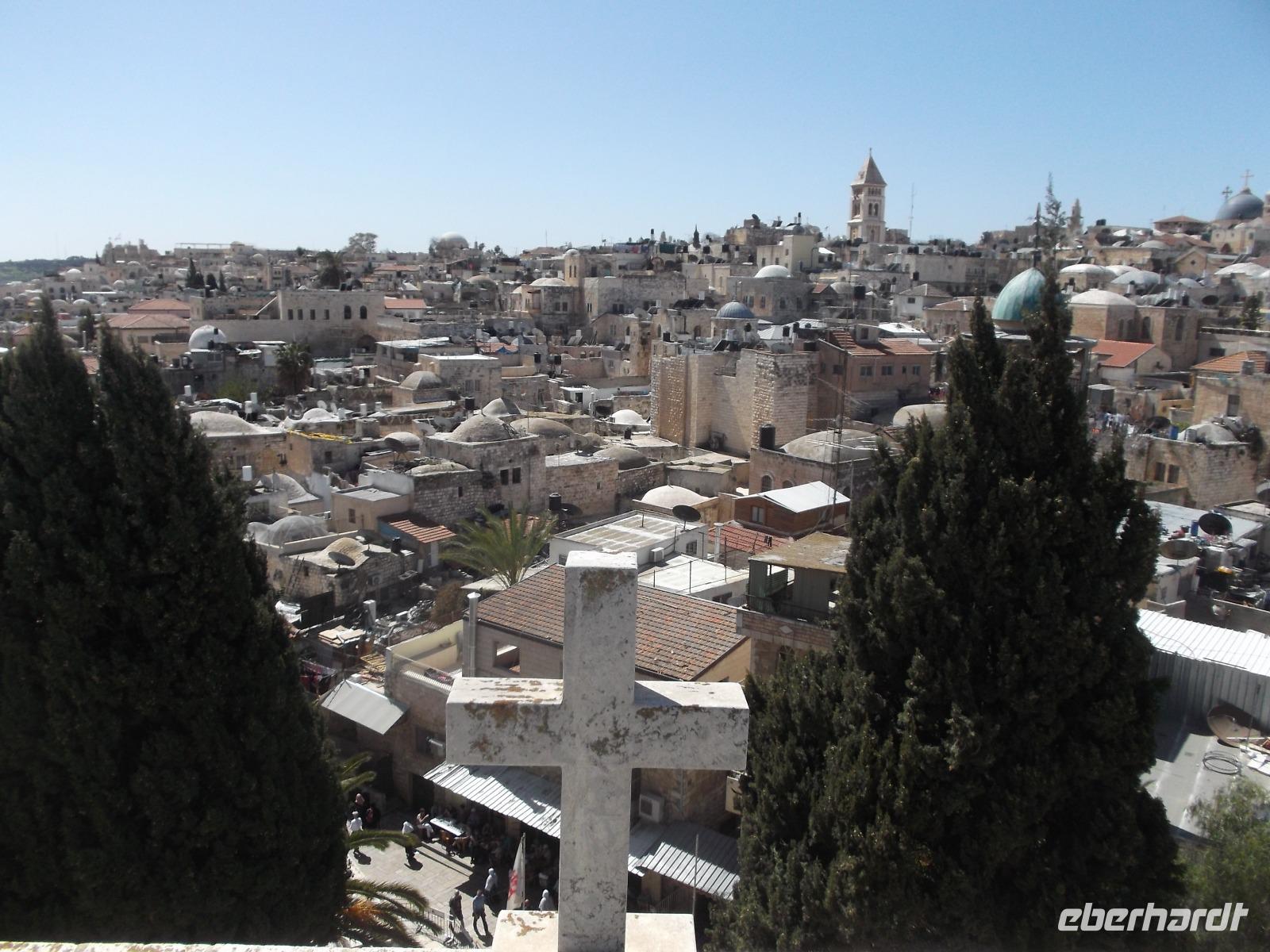 Stadt des Friedens nennt man das oft genug von Bewegung und Unruhen erschütterte Jerusalem in seltsam anmutendem Widerspruch - vielleicht, weil seit Jahrhunderten in ihrem Zentrum immer wieder die Unstimmigkeiten zwischen im Grunde friedlichen Konfessionen ausgetragen werden, wo doch die herrliche Stadt stets nichts dringender braucht als Frieden und die Botschaften - die von hier ausgehen - z.B. zu Ostern - Friedenserklärungen sind ...