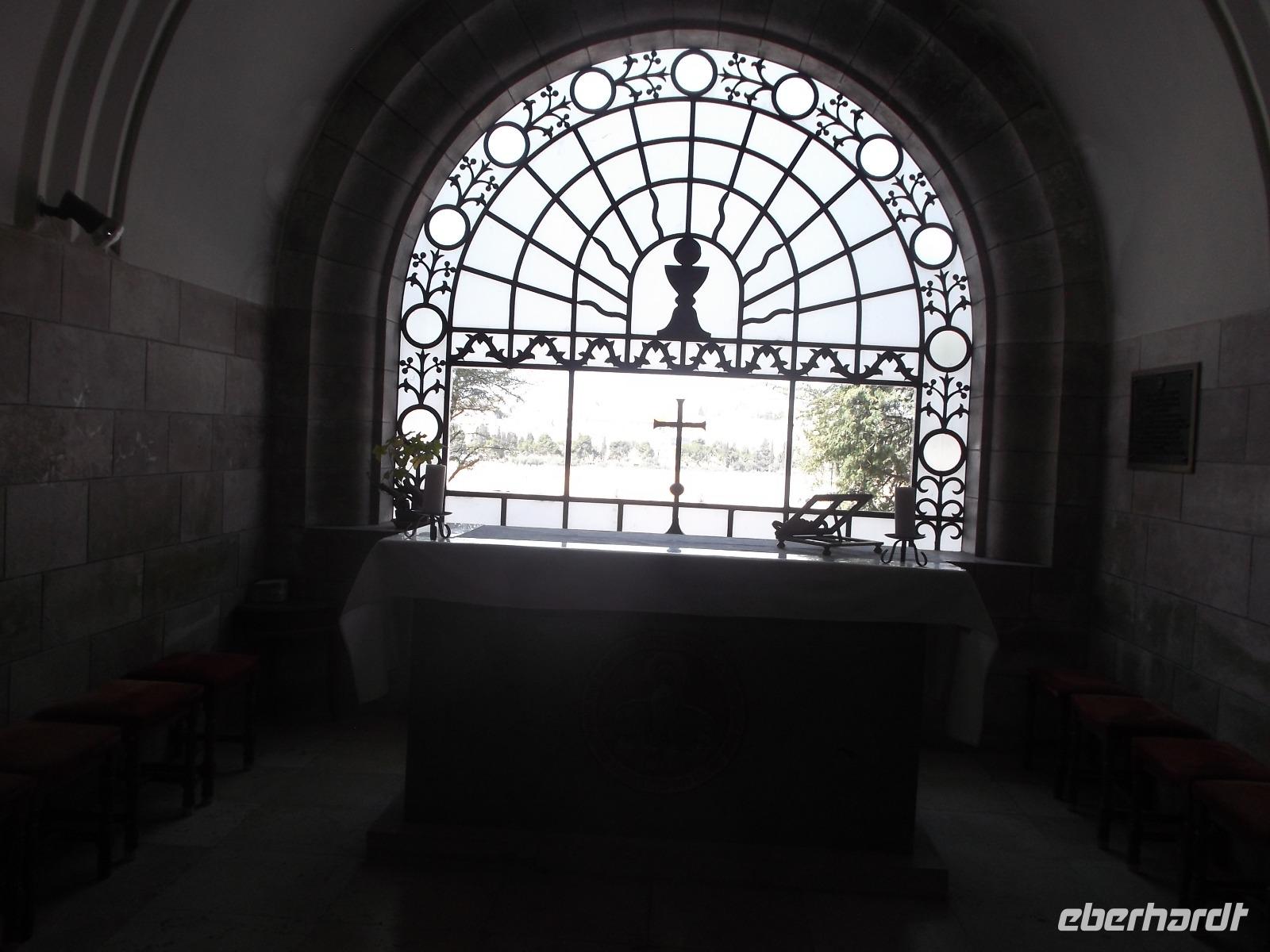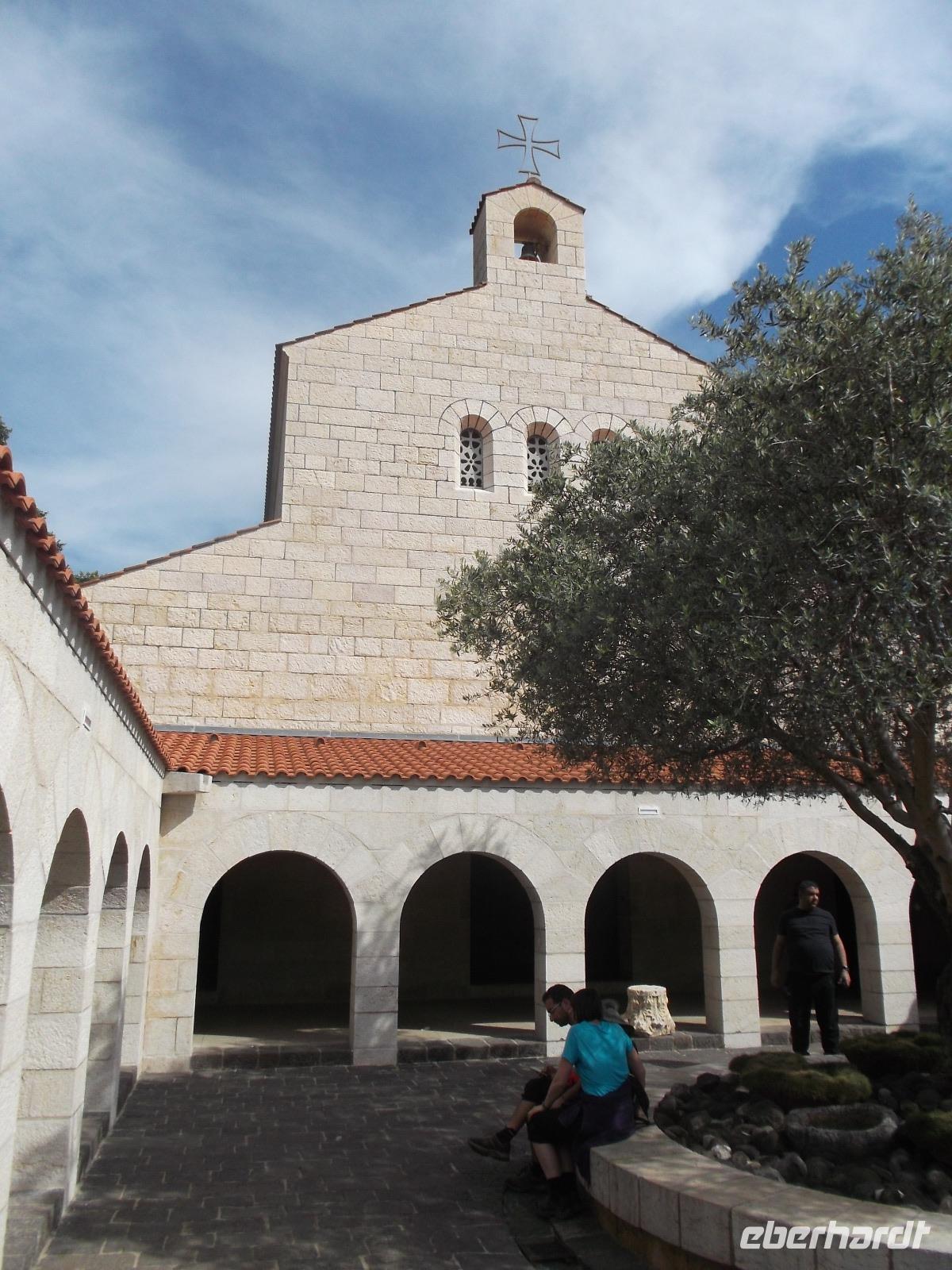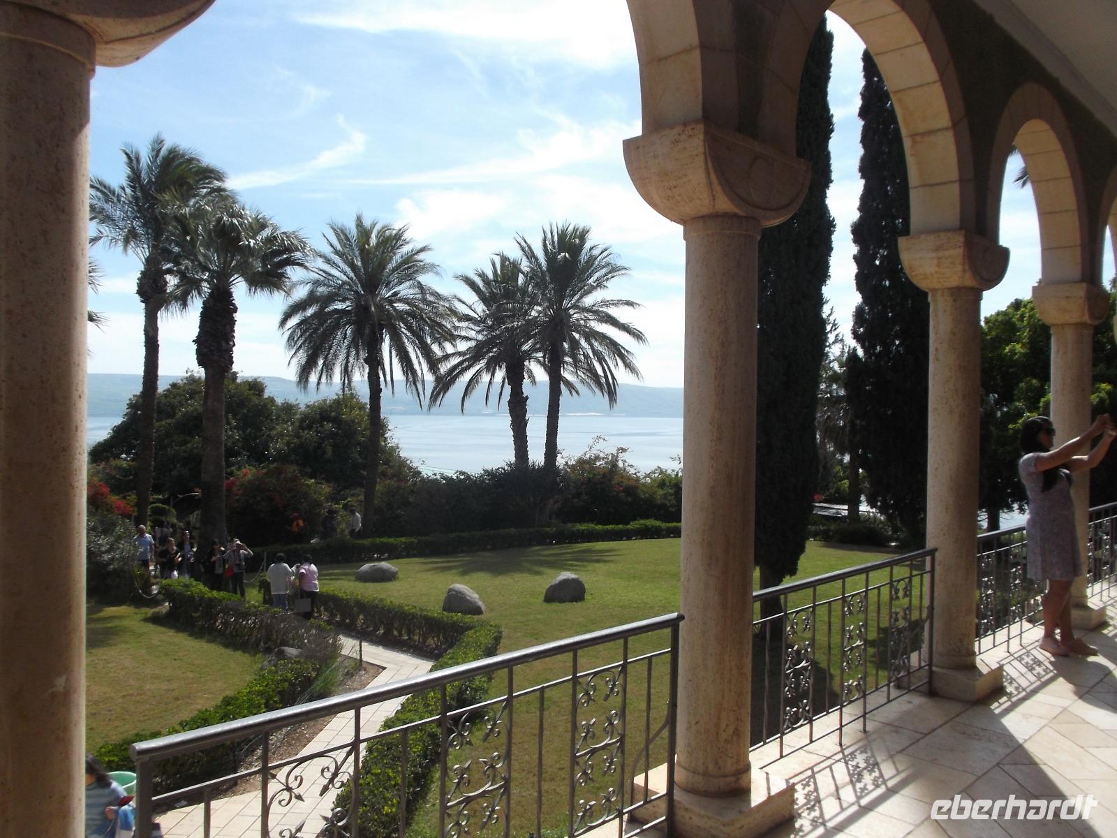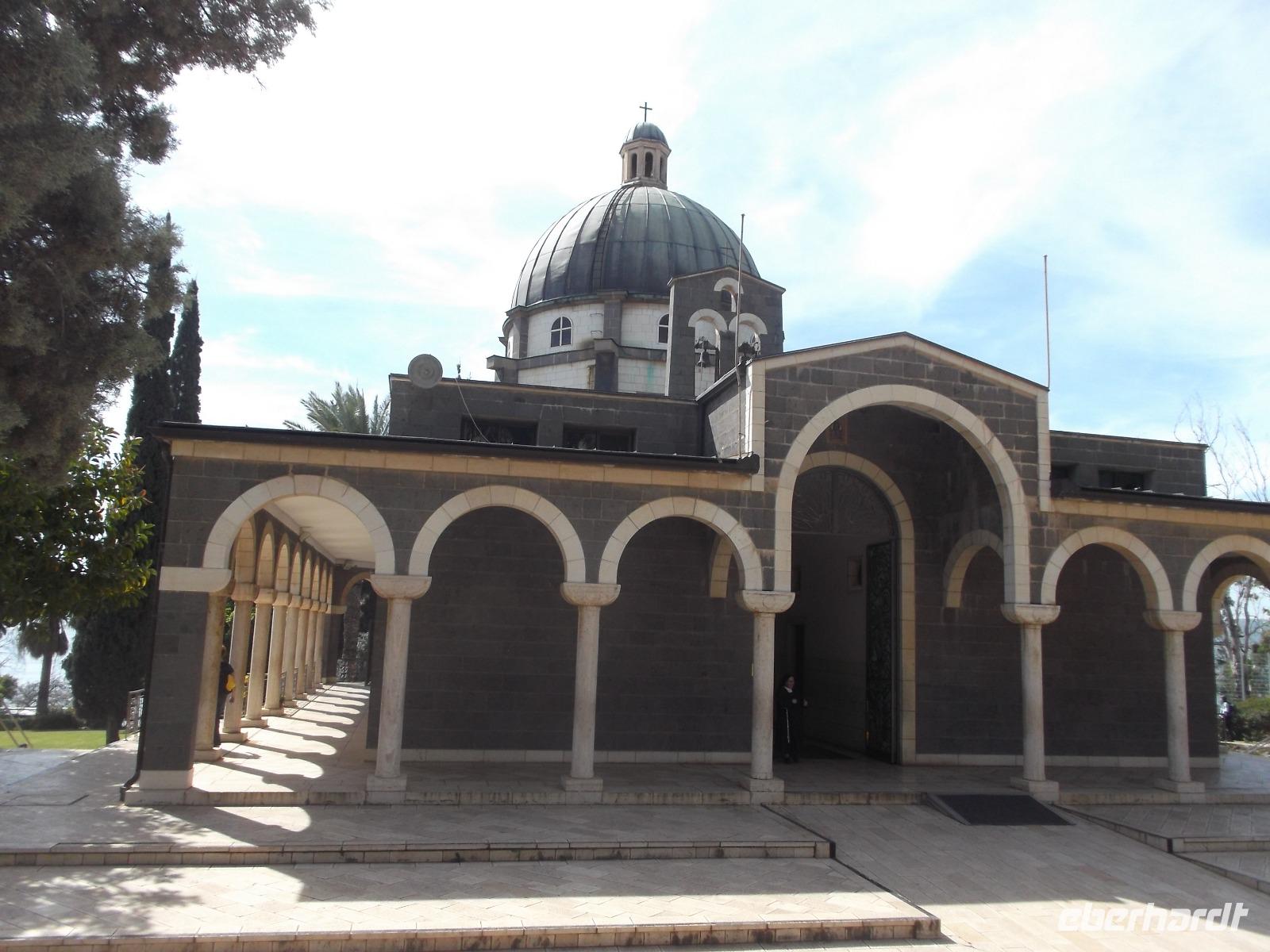 Den erneuten Weg entlang am See Genezareth unterbrachen wir heute für einen Abstecher zum Berg der Seligpreisungen. Sanft aufsteigend erhebt sich dieser vom Nordufer des Sees Genezareth aus in Richtung Norden und ist berühmt für seine Bergflanke, an der Jesus der Überlieferung nach seine berühmte Bergpredigt hielt. Heute ist der Haupt-Anziehungspunkt hier zweifellos die 1937 nach den Plänen von Antonio Barluzzi gebaute Kirche, deren „luftig" gehaltenes Inneres zum Gebet einlädt. Von ihrer Terrasse aus bietet sich eine wundervolle Aussicht über den See Genezareth.