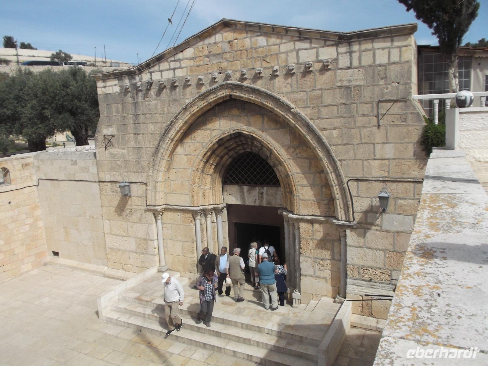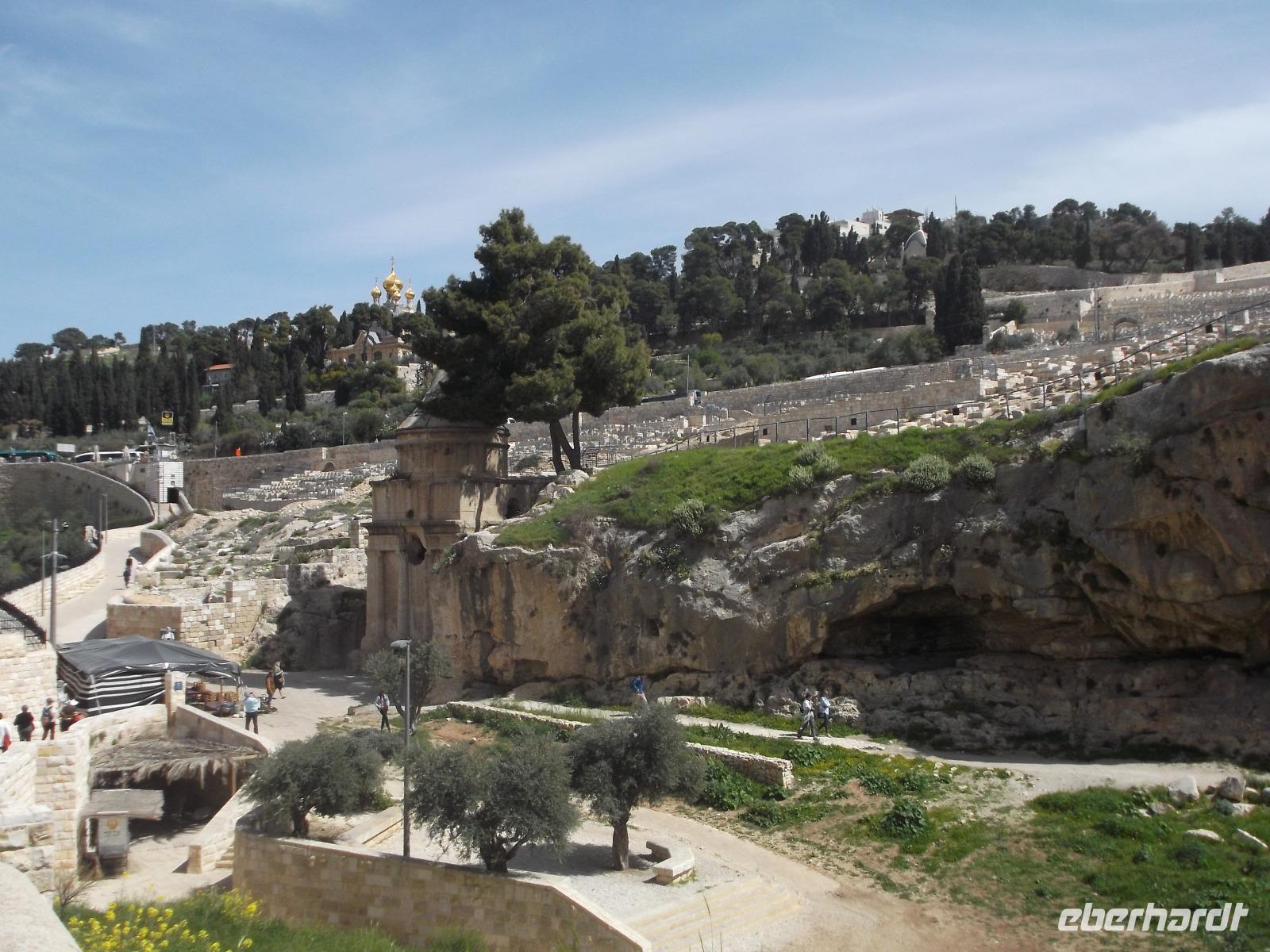 Auf dem Weg vom Ölberg zur Altstadt besuchten wir auch die berühmte römisch-katholische Dominus-Flevit-Kapelle ("Der Herr weinte"). Der im Äußeren an eine Glocke erinnernde Bau, 1955 nach Plänen des Architekten Antionio Barluzzi auf den Resten einer byzantinischen Kirche angelegt, soll an die Trauer von Jesus Christus im Wissen um die kommende Zerstörung Jerusalems erinnern. Als eine der wenigen katholischen Kirchen ist sie nicht nach Osten zur aufgehenden Sonne hin, sondern nach Westen zur Jerusalemer Altstadt ausgerichtet. soll. Auf dem jüdischen Friedhof, den man vom Ölberg aus in voller Größe schon sieht, erfahren Sie viel Wissenswertes über das Judentum. Später konnten wir im Garten Gethsemane, in dem sich Jesus mit seinen Jüngern traf und vor seiner Verhaftung durch die Römer betete, noch die „Kirche aller Nationen" besichtigen - einen auf den Resten einer byzantinischen Basilika und einer späteren Kreuzritterkirche errichteten Bau, der an jenem Ort steht, an dem den Evangelien zufolge Christus die Verzweiflung im Bewußtsein seines bevorstehenden Martyriums packte und deshalb mitunter auch „Todesangstkirche" genannt wird..