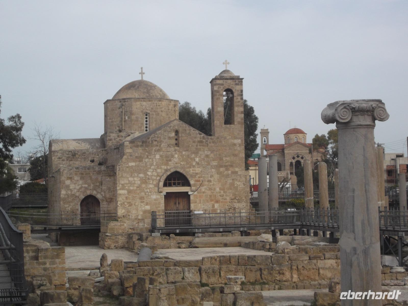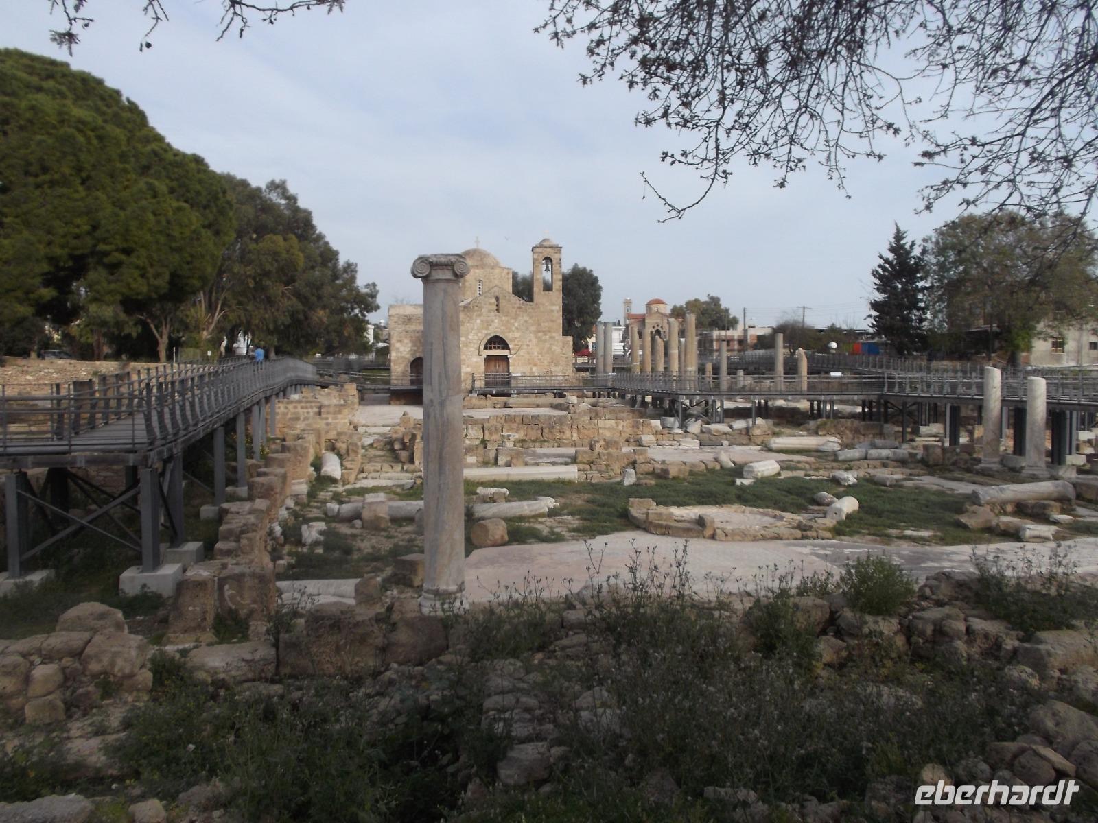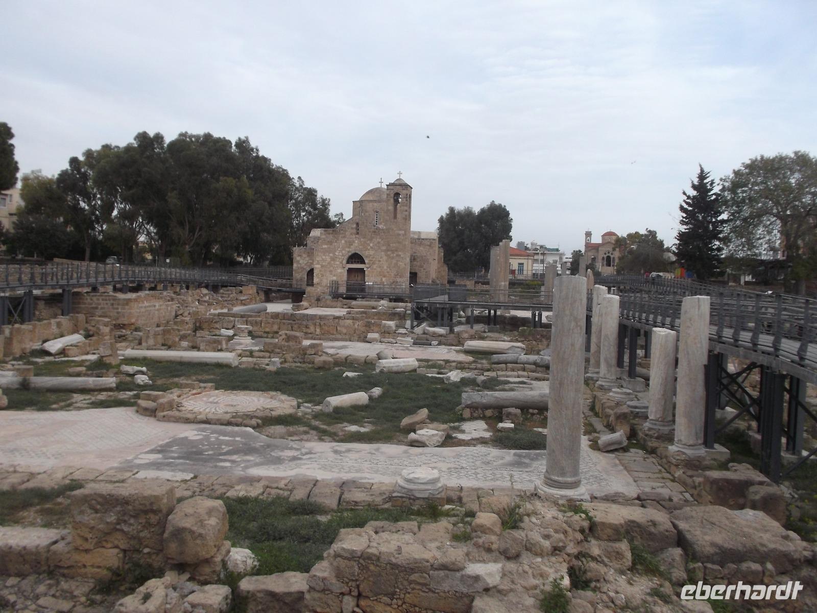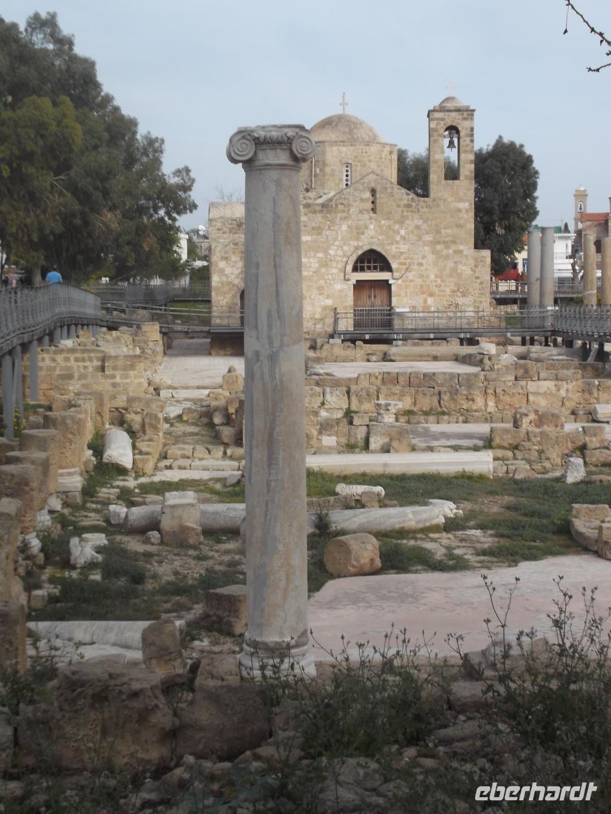 Später hielten wir uns noch am Hafen von Paphos mit der kleinen Kreuzritterfestung auf und besuchten zum Abschluss das abseits der archäologischen Zone gelegene Ruinerngelände um die spätbyzantinische Kreuzkuppelkirche Agia Kyriaki. Berühmtes Objekt des kleinen Ruinenfeldes um die Kirche aber ist ein kleiner marmorner Säulenstumpf, an dem der Überlieferung nach der Apostel Paulus gefesselt und gegeißelt worden sein soll. Diese und weitere Säulen sowie Überreste einer Franziskanerkirche aus dem Spätmittelalter und einer frühchristlichen Basilika kann man hier sehen.