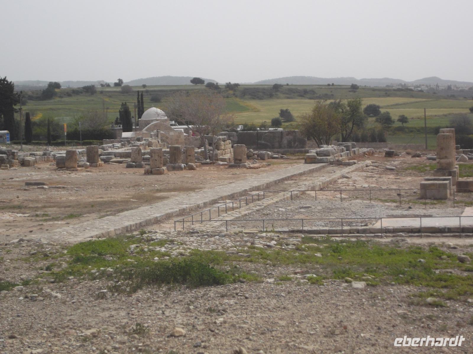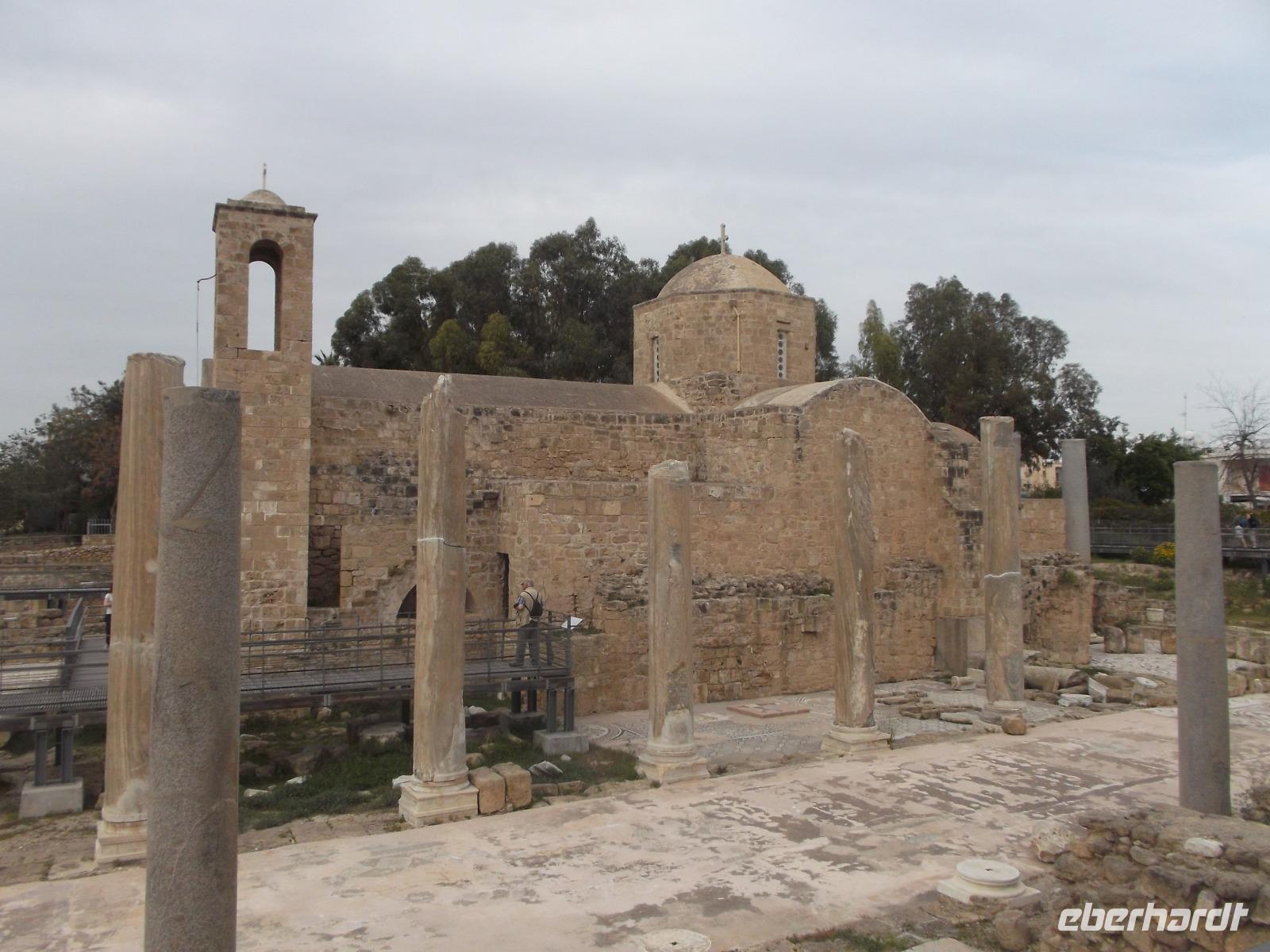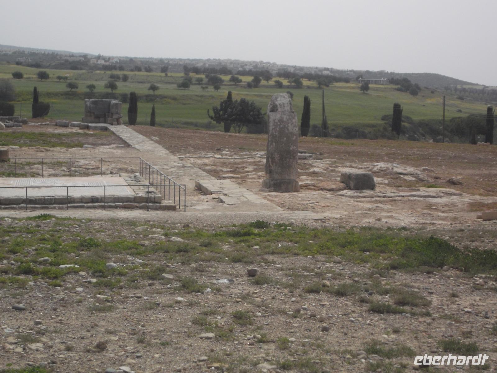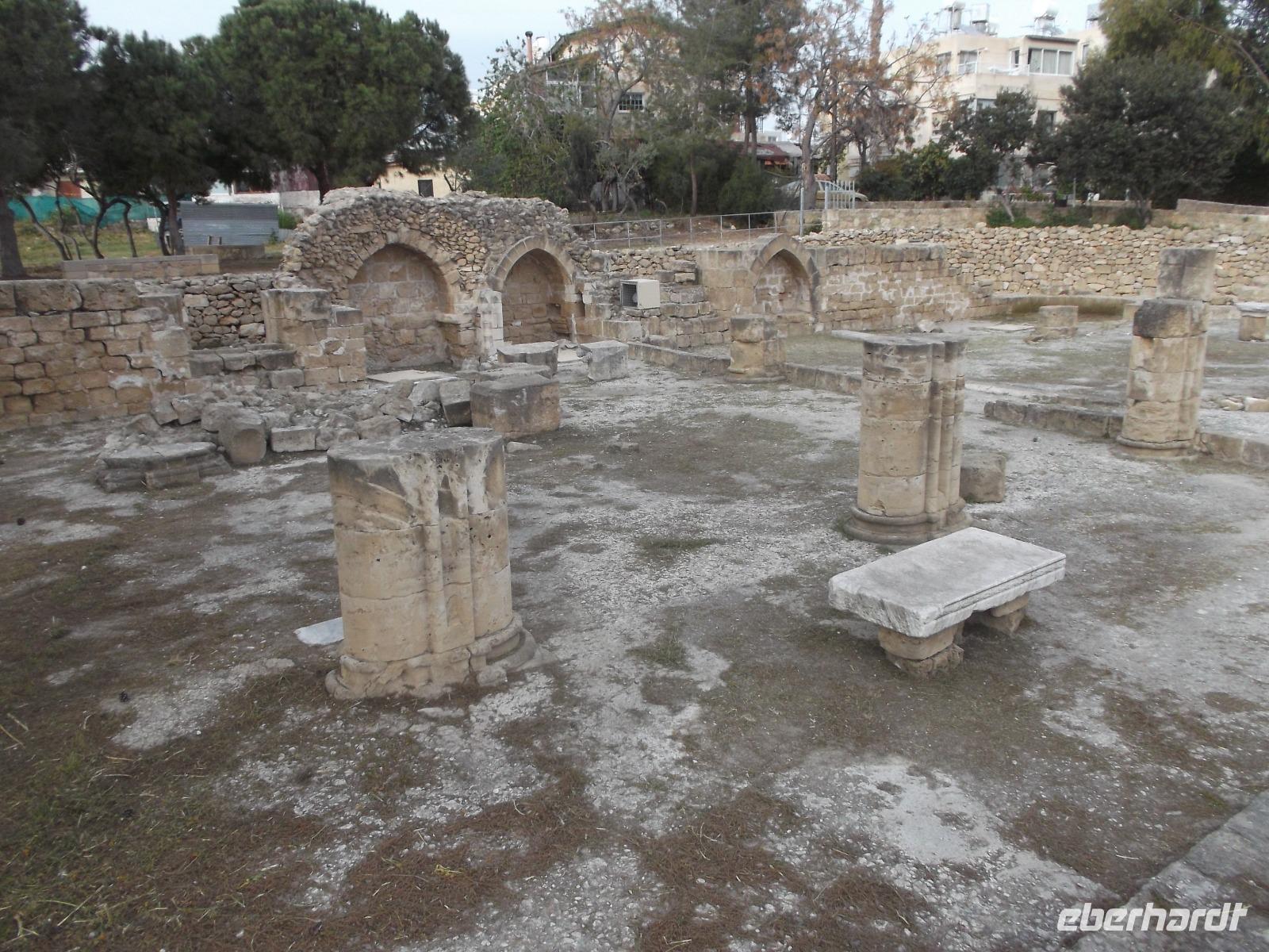 Später hielten wir uns noch am Hafen von Paphos mit der kleinen Kreuzritterfestung auf und besuchten zum Abschluss das abseits der archäologischen Zone gelegene Ruinerngelände um die spätbyzantinische Kreuzkuppelkirche Agia Kyriaki. Berühmtes Objekt des kleinen Ruinenfeldes um die Kirche aber ist ein kleiner marmorner Säulenstumpf, an dem der Überlieferung nach der Apostel Paulus gefesselt und gegeißelt worden sein soll. Diese und weitere Säulen sowie Überreste einer Franziskanerkirche aus dem Spätmittelalter und einer frühchristlichen Basilika kann man hier sehen.