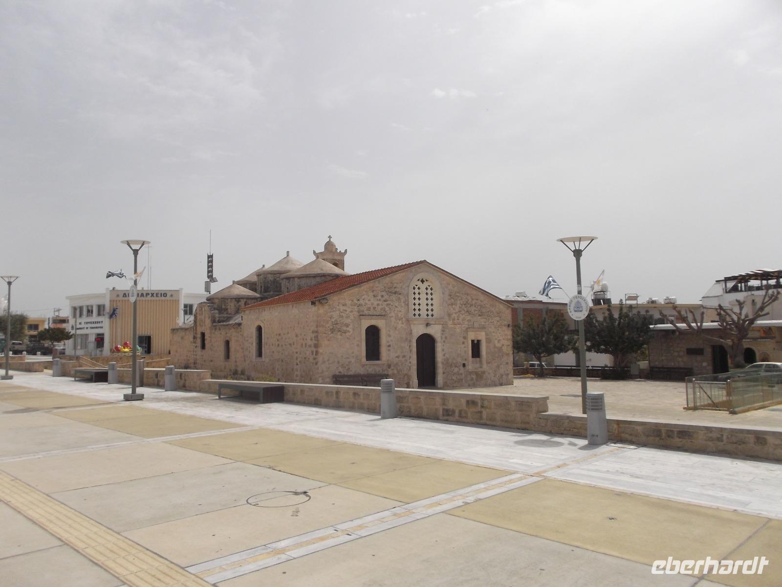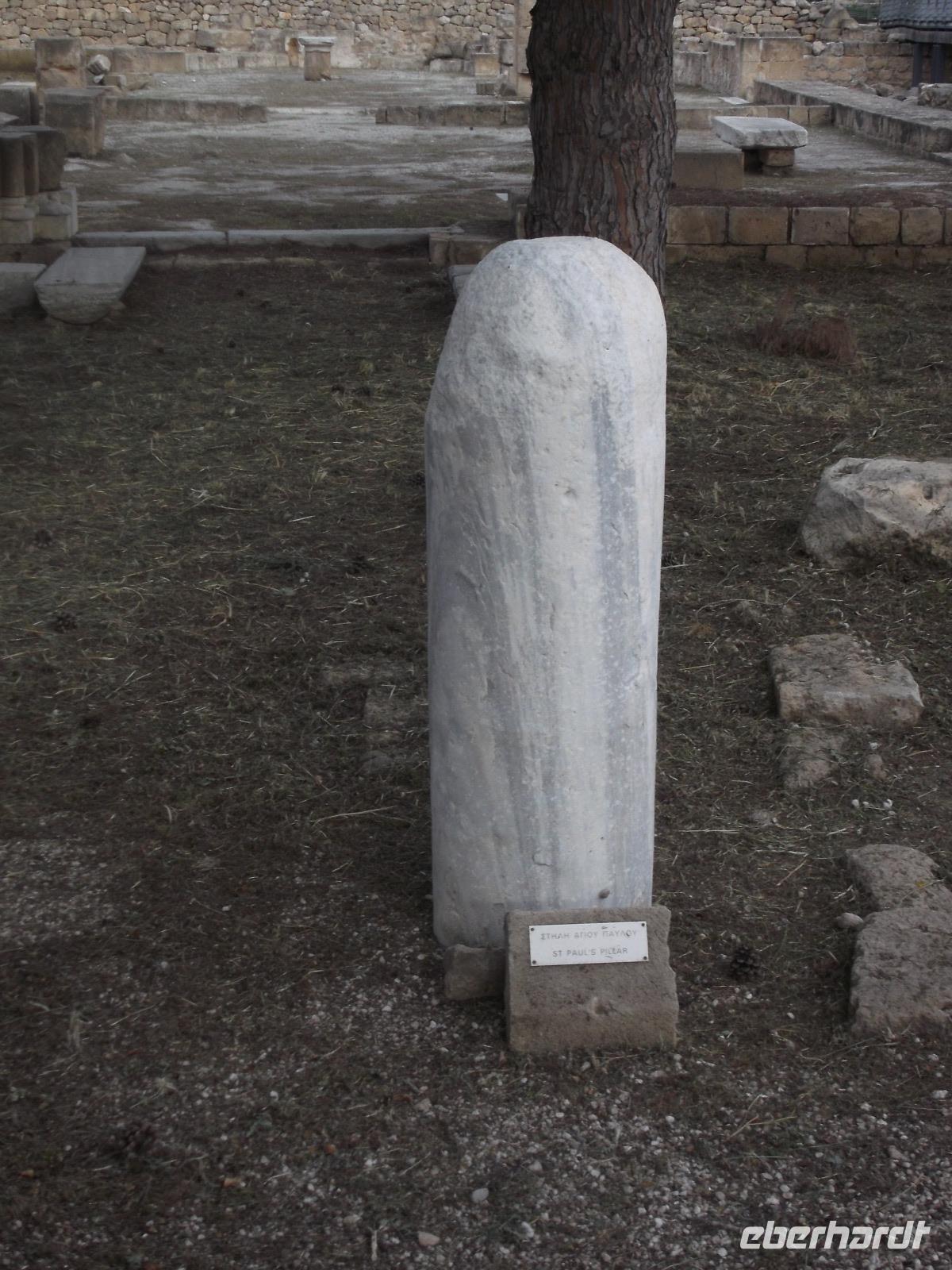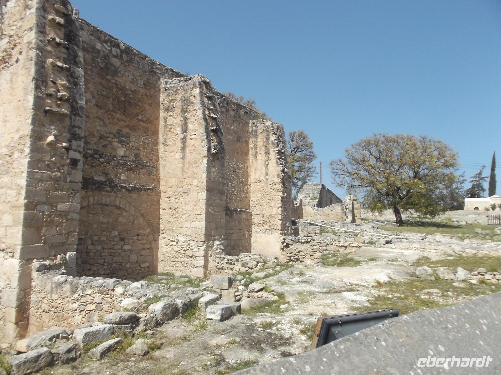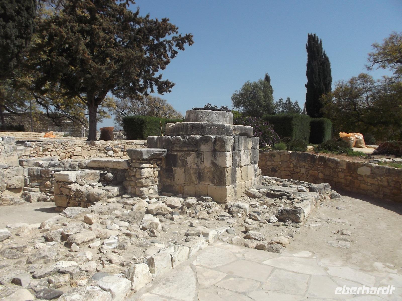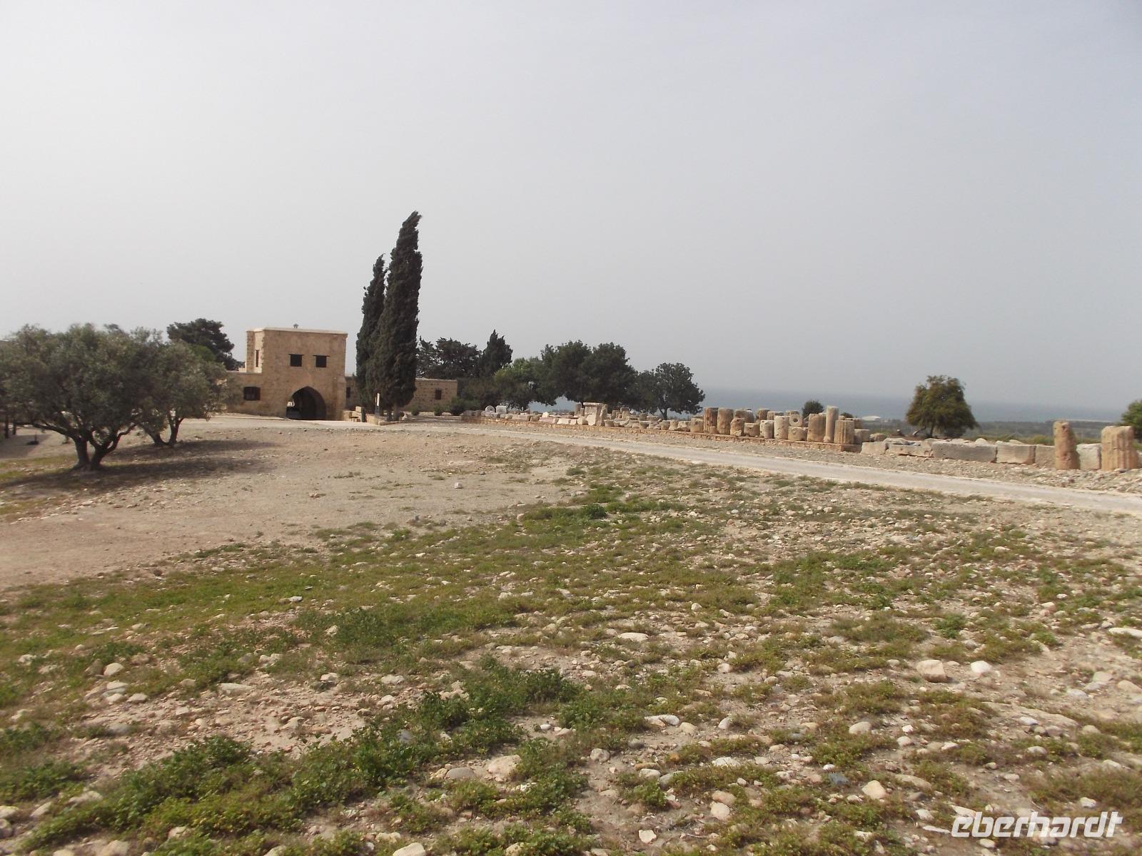 Später hielten wir uns noch am Hafen von Paphos mit der kleinen Kreuzritterfestung auf und besuchten zum Abschluss das abseits der archäologischen Zone gelegene Ruinerngelände um die spätbyzantinische Kreuzkuppelkirche Agia Kyriaki. Berühmtes Objekt des kleinen Ruinenfeldes um die Kirche aber ist ein kleiner marmorner Säulenstumpf, an dem der Überlieferung nach der Apostel Paulus gefesselt und gegeißelt worden sein soll. Diese und weitere Säulen sowie Überreste einer Franziskanerkirche aus dem Spätmittelalter und einer frühchristlichen Basilika kann man hier sehen.