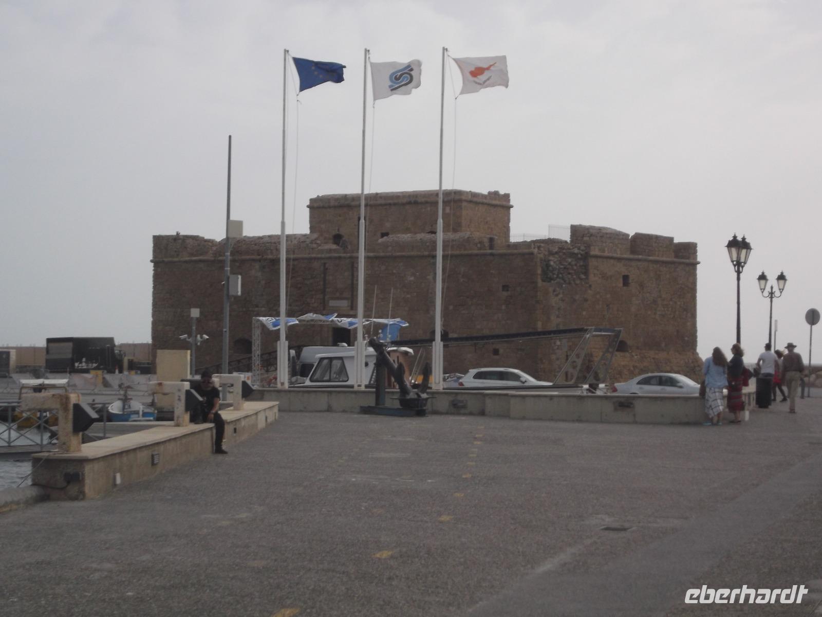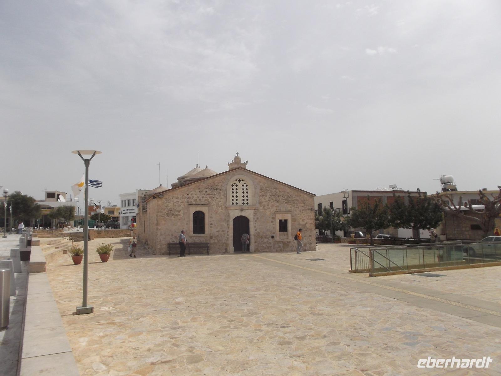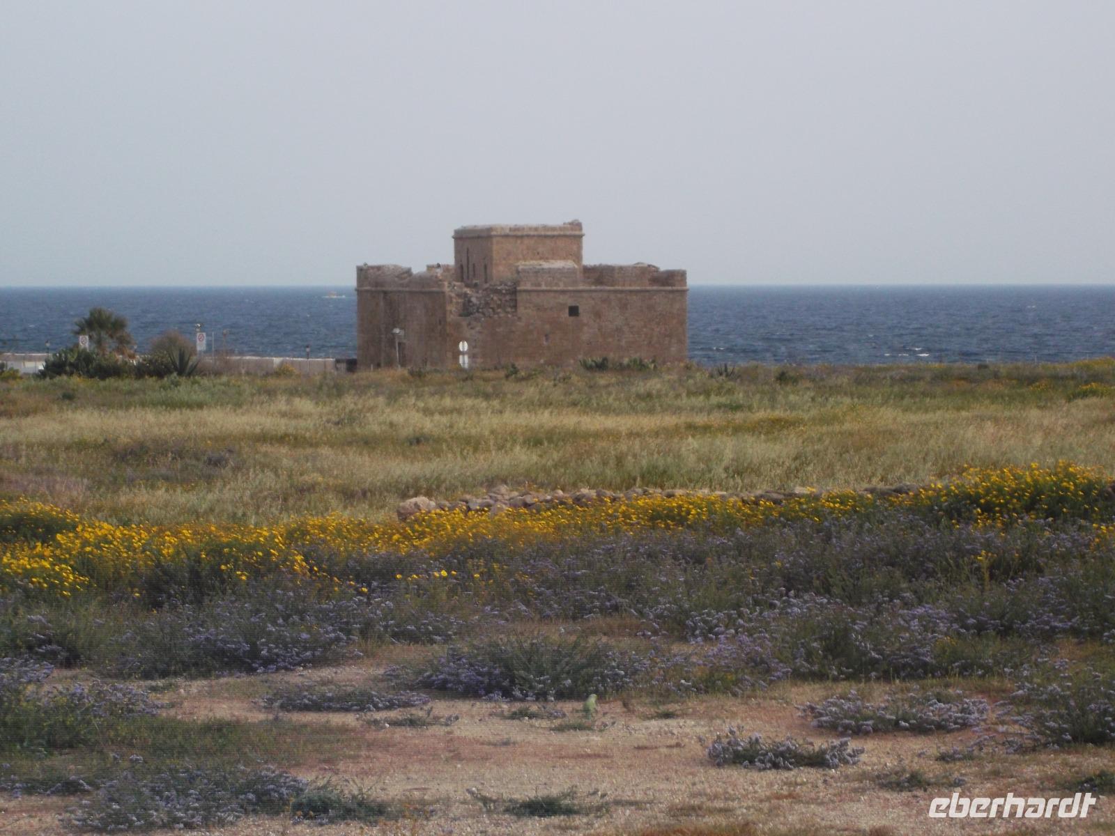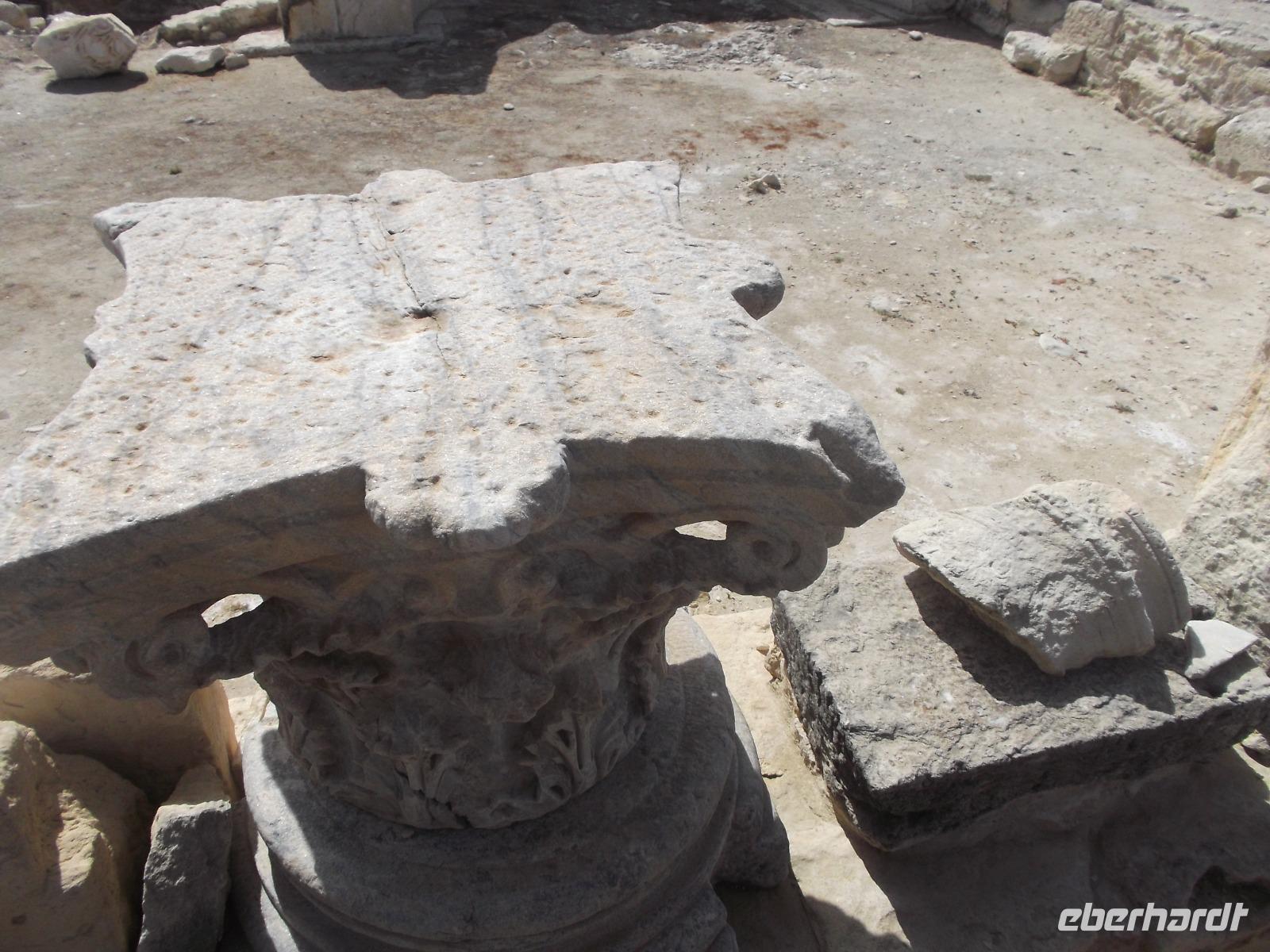 Später hielten wir uns noch am Hafen von Paphos mit der kleinen Kreuzritterfestung auf und besuchten zum Abschluss das abseits der archäologischen Zone gelegene Ruinerngelände um die spätbyzantinische Kreuzkuppelkirche Agia Kyriaki. Berühmtes Objekt des kleinen Ruinenfeldes um die Kirche aber ist ein kleiner marmorner Säulenstumpf, an dem der Überlieferung nach der Apostel Paulus gefesselt und gegeißelt worden sein soll. Diese und weitere Säulen sowie Überreste einer Franziskanerkirche aus dem Spätmittelalter und einer frühchristlichen Basilika kann man hier sehen.
