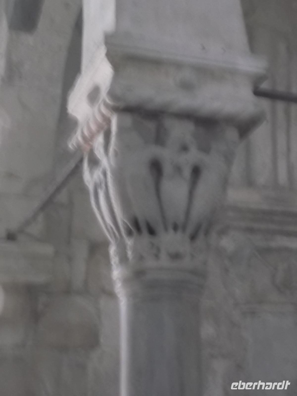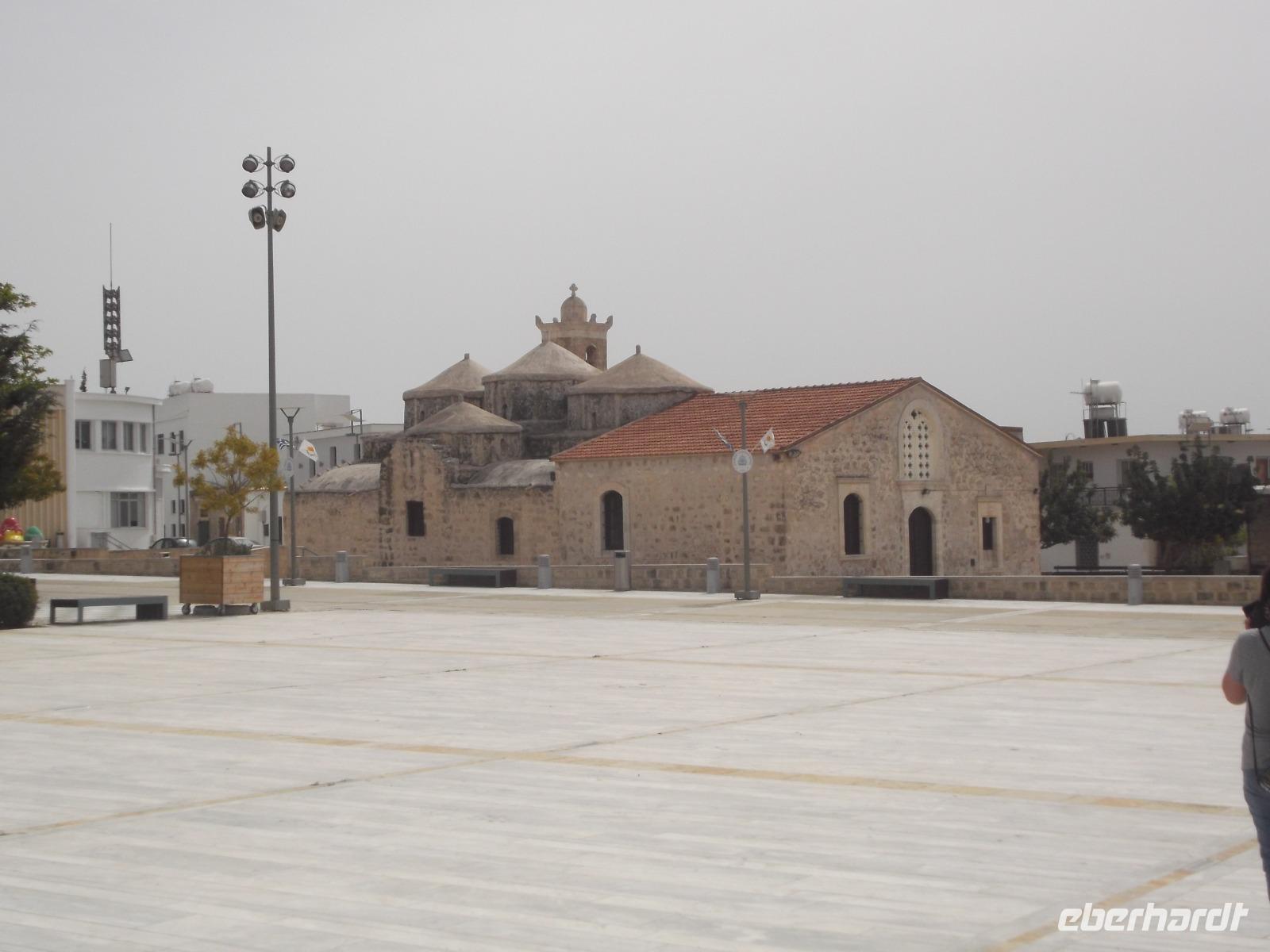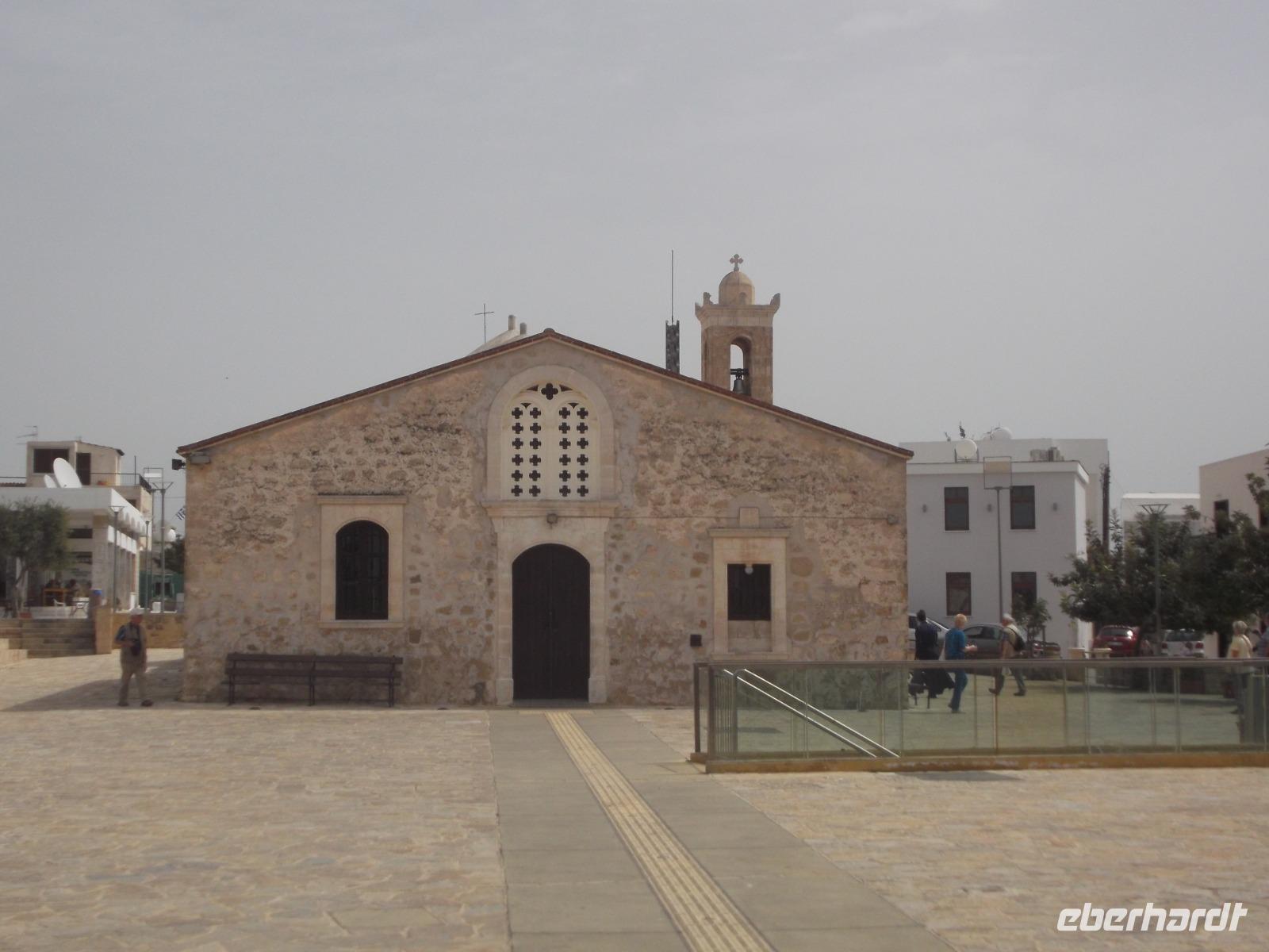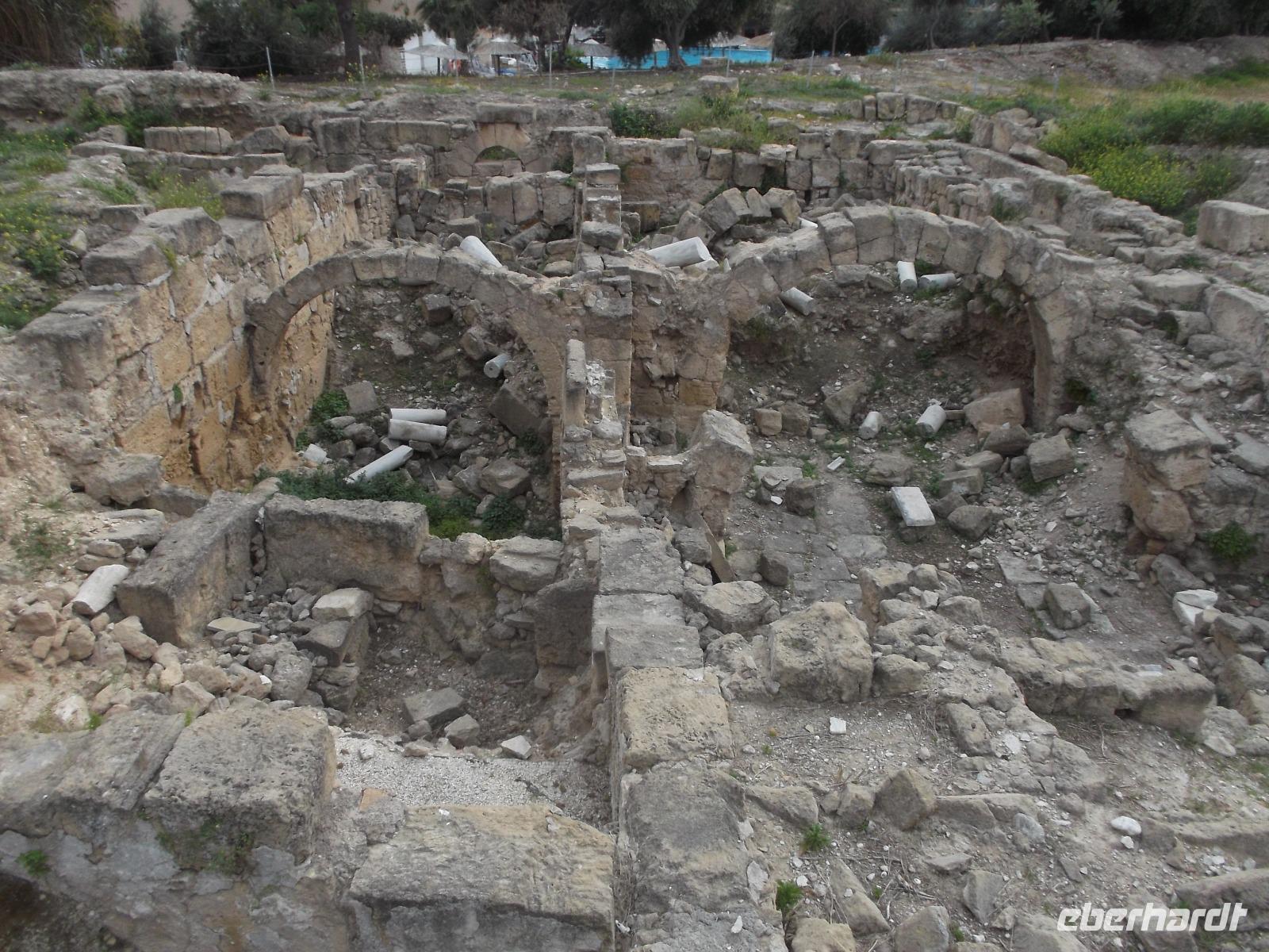 Später hielten wir uns noch am Hafen von Paphos mit der kleinen Kreuzritterfestung auf und besuchten zum Abschluss das abseits der archäologischen Zone gelegene Ruinerngelände um die spätbyzantinische Kreuzkuppelkirche Agia Kyriaki. Berühmtes Objekt des kleinen Ruinenfeldes um die Kirche aber ist ein kleiner marmorner Säulenstumpf, an dem der Überlieferung nach der Apostel Paulus gefesselt und gegeißelt worden sein soll. Diese und weitere Säulen sowie Überreste einer Franziskanerkirche aus dem Spätmittelalter und einer frühchristlichen Basilika kann man hier sehen.
