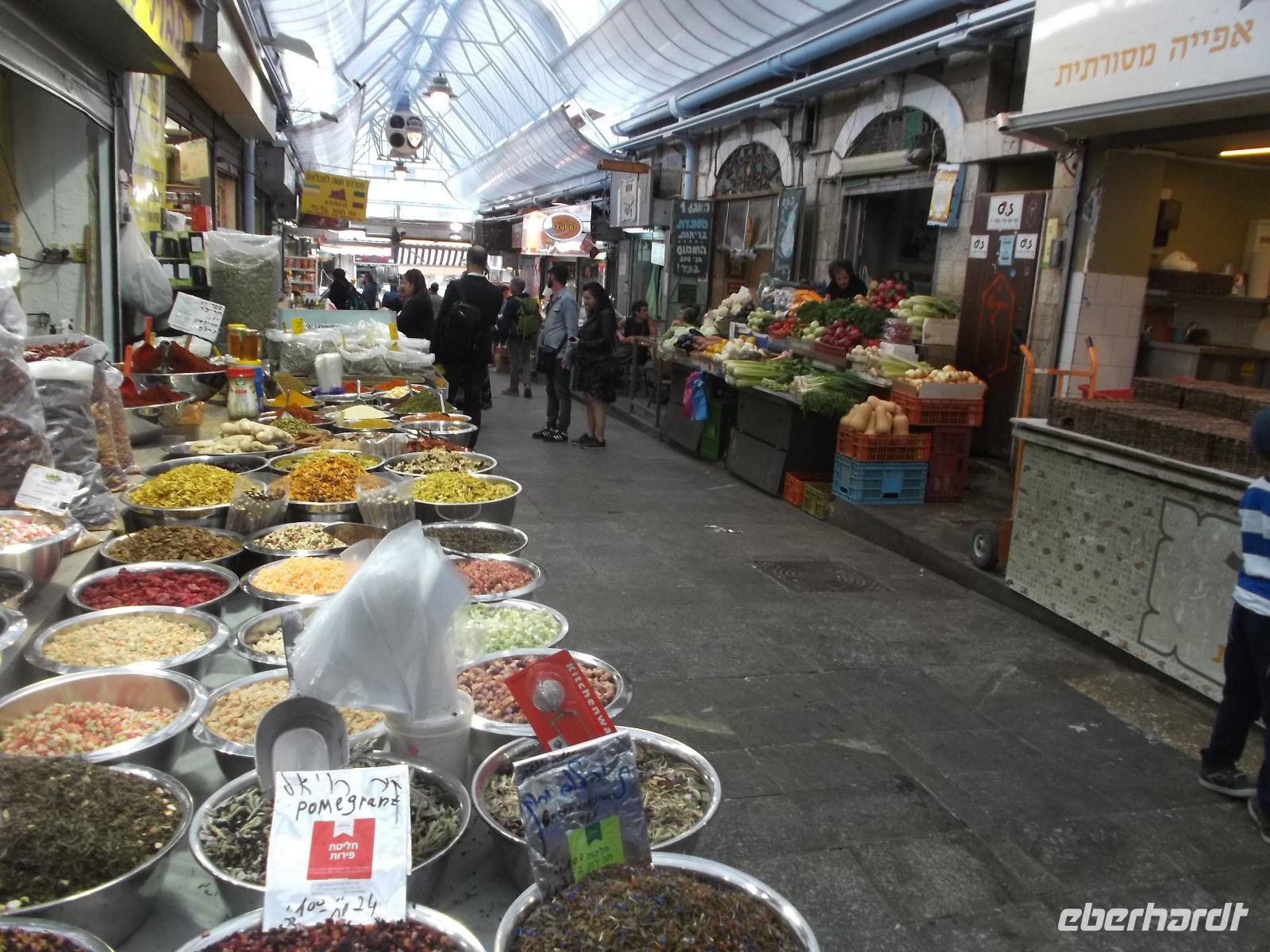Anschließend spazierten wir durch das jüdische Altstadtviertel Jerusalems, unter anderem auf dem Cardo, der alten römischen Hauptstraße, deren Straßenniveau etwa drei Meter unter dem heutigen liegt. Etwas Zeit hatten wir zur freien Verfügung, bevor es am Nachmittag noch zu den berühmten Markthallen Westjerusalems ging. Der Machana Yehuda-Markt mit seinen Obst- und Gemüseständen, Bäckereien und kleinen Kneipen ist exotisch, aufregend und äußerst anziehend. Nach gemeinsamem Bummel durch die bunten Marktstände hatten wir auch hier noch Zeit zur Verfügung, bevor es zurückging ins Hotel.
