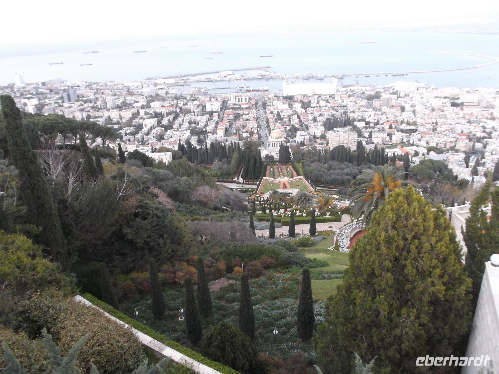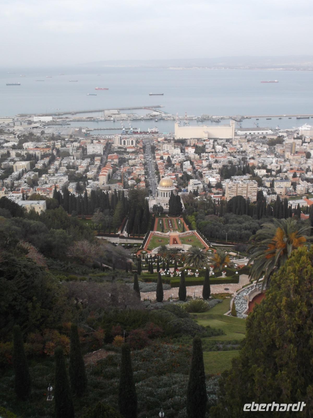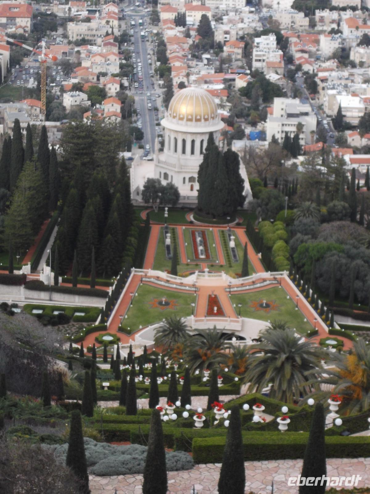 Dann waren es nur noch wenige Kilometer, teilweise entlang der Küste, bis zu unserem nächsten Ziel. Schon vom Bus eröffnete sich ein herrlicher Blick auf das Jesreel-Tal und die Berge Galiläas, bevor wir Haifa erreichten, Israels drittgrößte Stadt und Zentrum der IT-Branche. Die Großstadt erstreckt sich an einer sichelförmigen Bucht weit über die Hänge des Berges Karmel bis zum Meer. Als Besonderheit erwähnen viele Veröffentlichungen, dass gerade hier jüdische und arabische Israelis friedlich nebeneinander leben, was der Stadt zweifellos einen besonderen Charme verleiht und dazu führt, dass Haifa oft als bezaubernd und als schönste Stadt Israels apostrophiert wird. Hauptanziehungspunkt sind die persischen Gärten mit dem Schrein des Bab, die in den 90er Jahren des 20. Jh. beträchtlich erweitert wurden. Es ist das Grabmal von einem der Stifter der Religionsgemeinschaft der Bahai, die in Haifa auch ihren Hauptsitz hat. Von der oberen Terrasse aus konnten wir einen ausführlichen Blick auf die kunstvoll gepflegten Bahai'i-Gärten werfen. Das symmetrisch angelegte farbenfrohe Meisterwerk der Gartengestaltung und Landschaftsarchitektur gehört zusammen mit dem Schrein des Bab seit 2008 zum UNESCO-Weltkulturerbe.