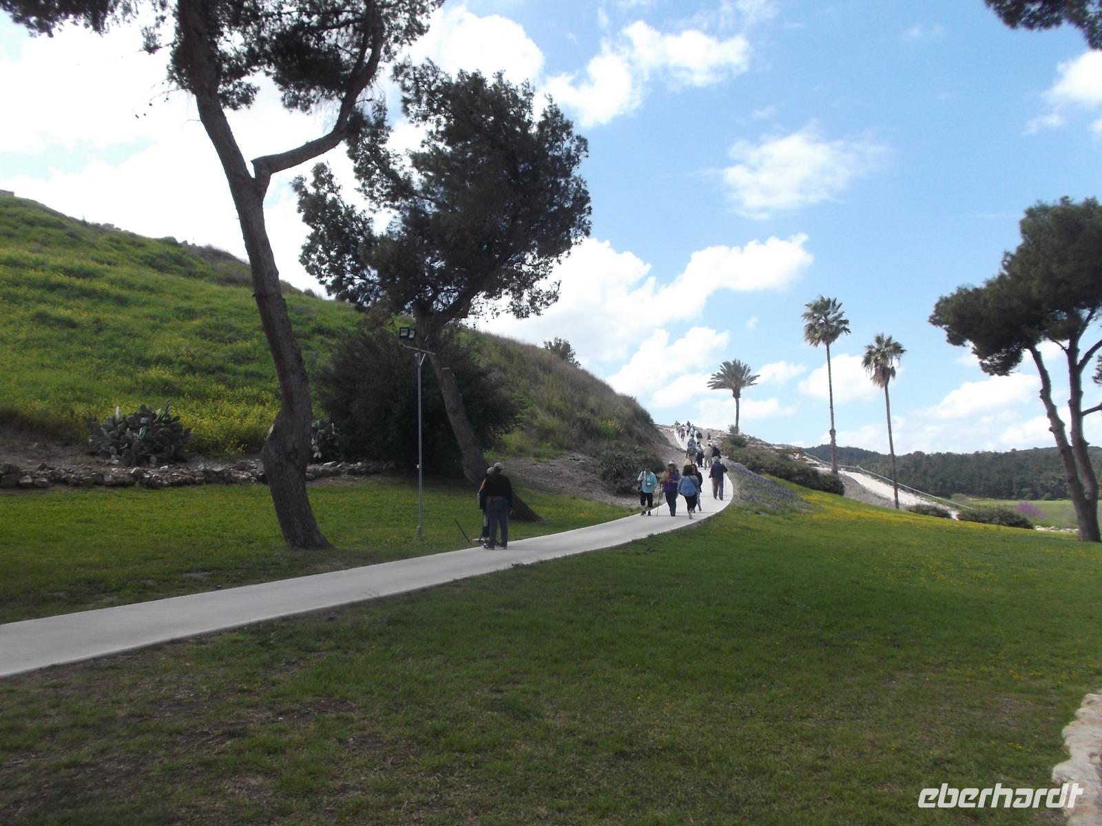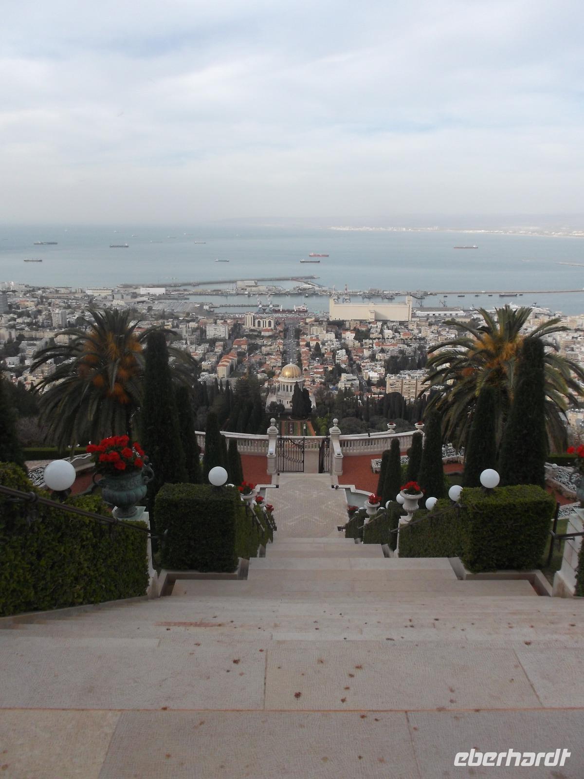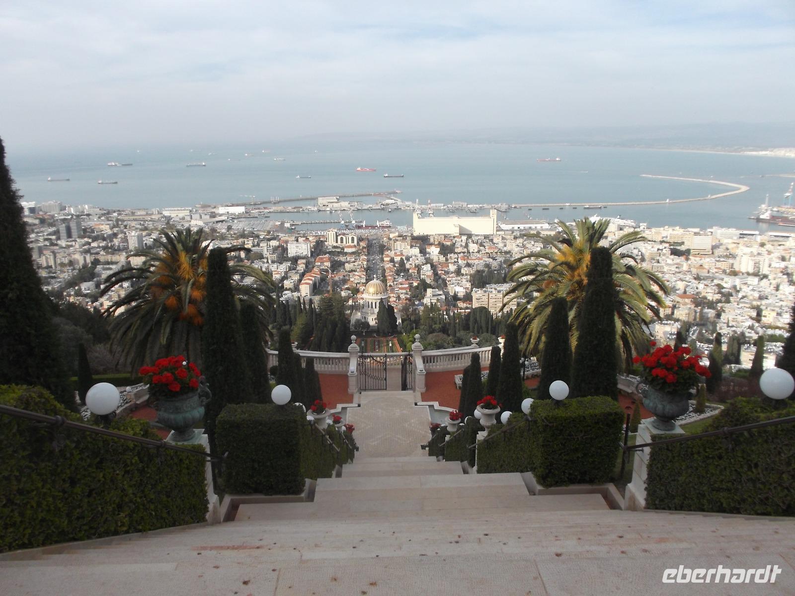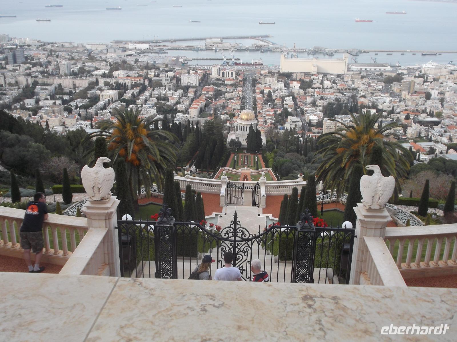 Dann waren es nur noch wenige Kilometer, teilweise entlang der Küste, bis zu unserem nächsten Ziel. Schon vom Bus eröffnete sich ein herrlicher Blick auf das Jesreel-Tal und die Berge Galiläas, bevor wir Haifa erreichten, Israels drittgrößte Stadt und Zentrum der IT-Branche. Die Großstadt erstreckt sich an einer sichelförmigen Bucht weit über die Hänge des Berges Karmel bis zum Meer. Als Besonderheit erwähnen viele Veröffentlichungen, dass gerade hier jüdische und arabische Israelis friedlich nebeneinander leben, was der Stadt zweifellos einen besonderen Charme verleiht und dazu führt, dass Haifa oft als bezaubernd und als schönste Stadt Israels apostrophiert wird. Hauptanziehungspunkt sind die persischen Gärten mit dem Schrein des Bab, die in den 90er Jahren des 20. Jh. beträchtlich erweitert wurden. Es ist das Grabmal von einem der Stifter der Religionsgemeinschaft der Bahai, die in Haifa auch ihren Hauptsitz hat. Von der oberen Terrasse aus konnten wir einen ausführlichen Blick auf die kunstvoll gepflegten Bahai'i-Gärten werfen. Das symmetrisch angelegte farbenfrohe Meisterwerk der Gartengestaltung und Landschaftsarchitektur gehört zusammen mit dem Schrein des Bab seit 2008 zum UNESCO-Weltkulturerbe.