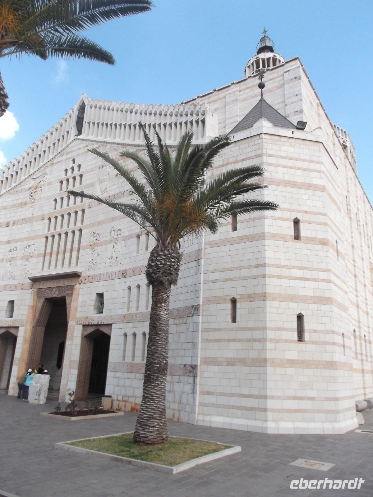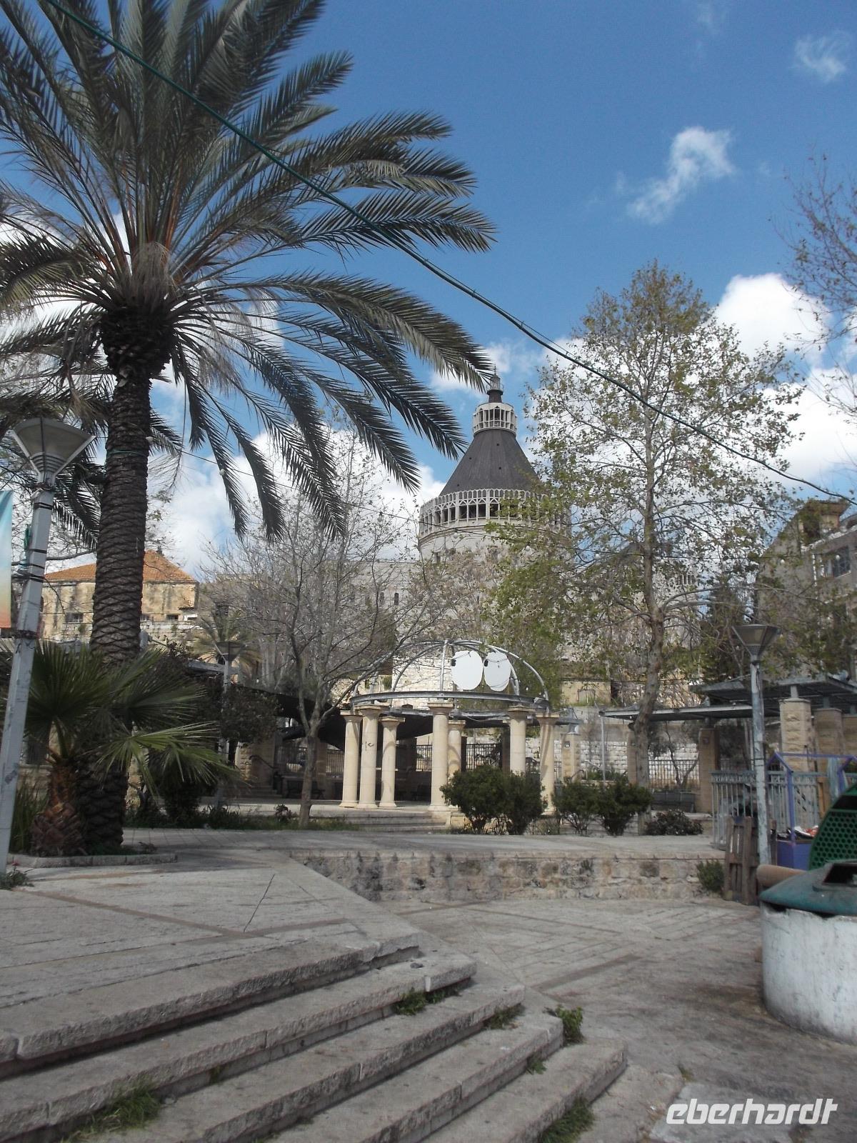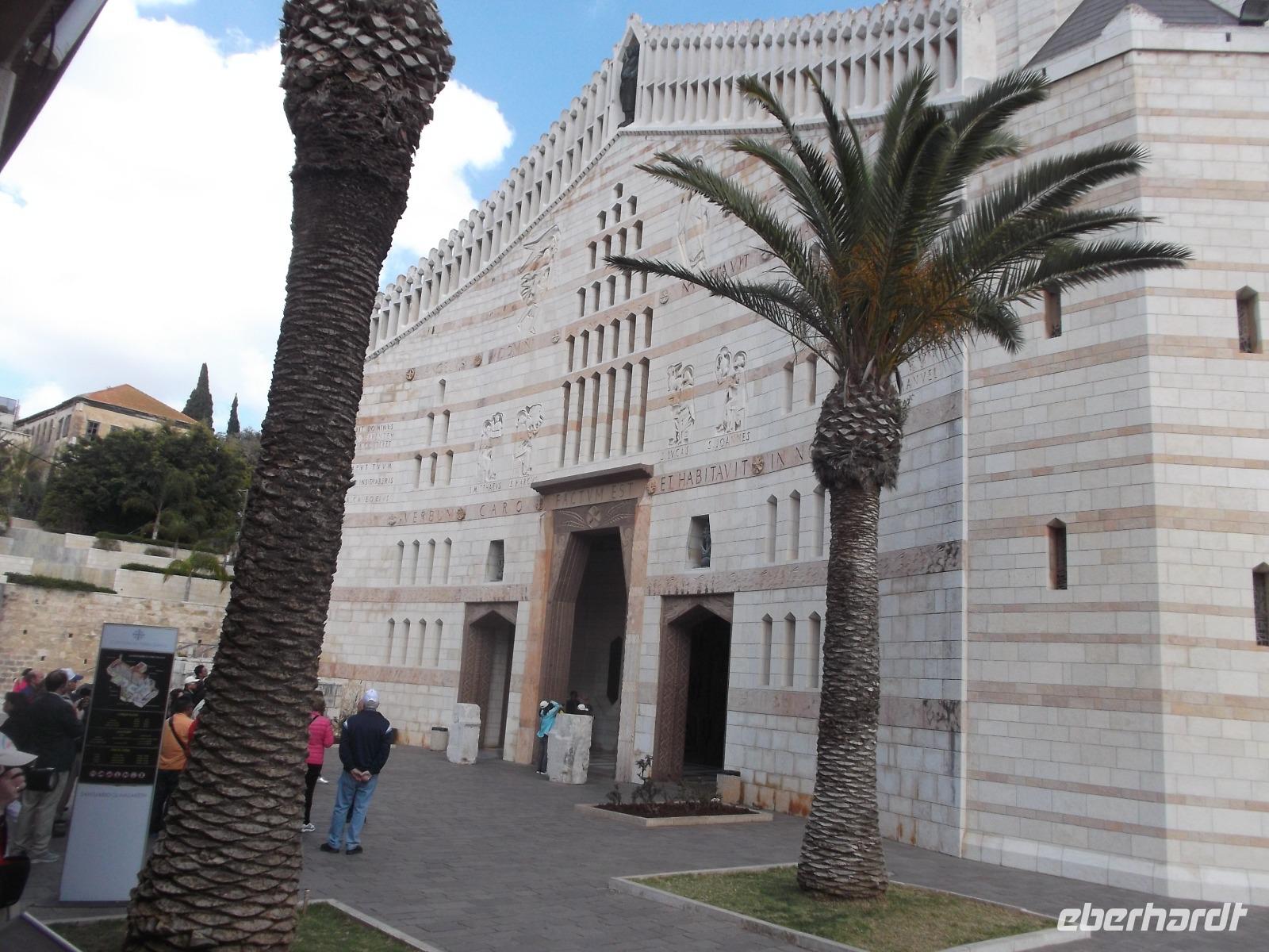 Am Nachmittag erreichten wir Nazareth, heute eine recht moderne, von arabischer Bevölkerung dominierte Stadt. Wäre da nicht die beherrschende Verkündigungskirche an dominierender Stelle, käme man nicht darauf, dass diese Stadt, die eigentlich gar nicht die sakrale Atmosphäre verströmt, die man von einem solchen Ort erwarten würde, eine große Rolle in der biblisch-christlichen Überlieferung spielt. Doch war, den Evangelien zufolge, durch einen Erzengel die Geburt Jesu verkündet worden und nach Nazareth kehrte die heilige Familie nach ihrer Flucht aus Ägypten zurück. Zum spirituellen Erlebnis für jeden Besucher wird der Besuch in der Verkündigungskirche, einer gewaltigen modernen Basilika aus der 2.Hälfte des 20.Jh. Sie wurde errichtet über jener Höhle in der Stadt Nazareth, in der laut Überlieferung der Erzengel Gabriel der Jungfrau Maria erschien und ihr die Geburt Jesu ankündigte. Die erst 1969 geweihte Basilika des italienischen Architekten Giovanni Muzio besteht aus zwei übereinanderliegenden Kirchen und im sie außen umgebenden Kreuzgang kann man herrliche verzierte Wandmosaiken mit Marienmotiven aus aller Welt erblicken. Im Inneren ist die Kirche sehr großzügig ausgestattet und über schmale Treppen ist es möglich, zur eigentlichen Verkündigungs-Grotte hinabzusteigen.