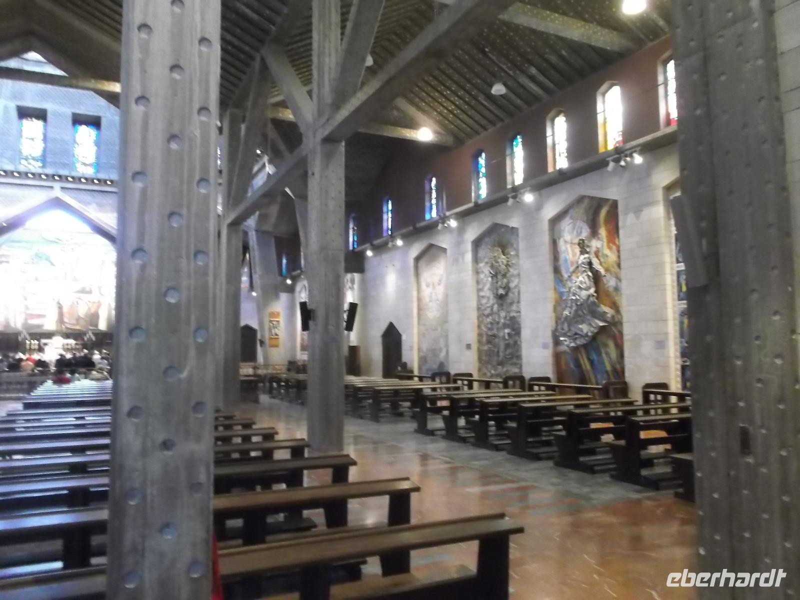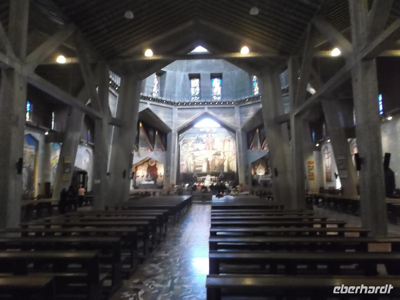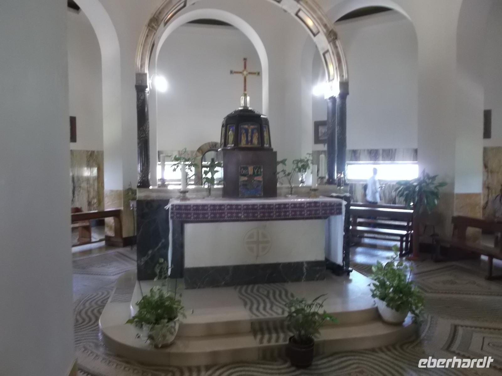 Am Nachmittag erreichten wir Nazareth, heute eine recht moderne, von arabischer Bevölkerung dominierte Stadt. Wäre da nicht die beherrschende Verkündigungskirche an dominierender Stelle, käme man nicht darauf, dass diese Stadt, die eigentlich gar nicht die sakrale Atmosphäre verströmt, die man von einem solchen Ort erwarten würde, eine große Rolle in der biblisch-christlichen Überlieferung spielt. Doch war, den Evangelien zufolge, durch einen Erzengel die Geburt Jesu verkündet worden und nach Nazareth kehrte die heilige Familie nach ihrer Flucht aus Ägypten zurück. Zum spirituellen Erlebnis für jeden Besucher wird der Besuch in der Verkündigungskirche, einer gewaltigen modernen Basilika aus der 2.Hälfte des 20.Jh. Sie wurde errichtet über jener Höhle in der Stadt Nazareth, in der laut Überlieferung der Erzengel Gabriel der Jungfrau Maria erschien und ihr die Geburt Jesu ankündigte. Die erst 1969 geweihte Basilika des italienischen Architekten Giovanni Muzio besteht aus zwei übereinanderliegenden Kirchen und im sie außen umgebenden Kreuzgang kann man herrliche verzierte Wandmosaiken mit Marienmotiven aus aller Welt erblicken. Im Inneren ist die Kirche sehr großzügig ausgestattet und über schmale Treppen ist es möglich, zur eigentlichen Verkündigungs-Grotte hinabzusteigen.