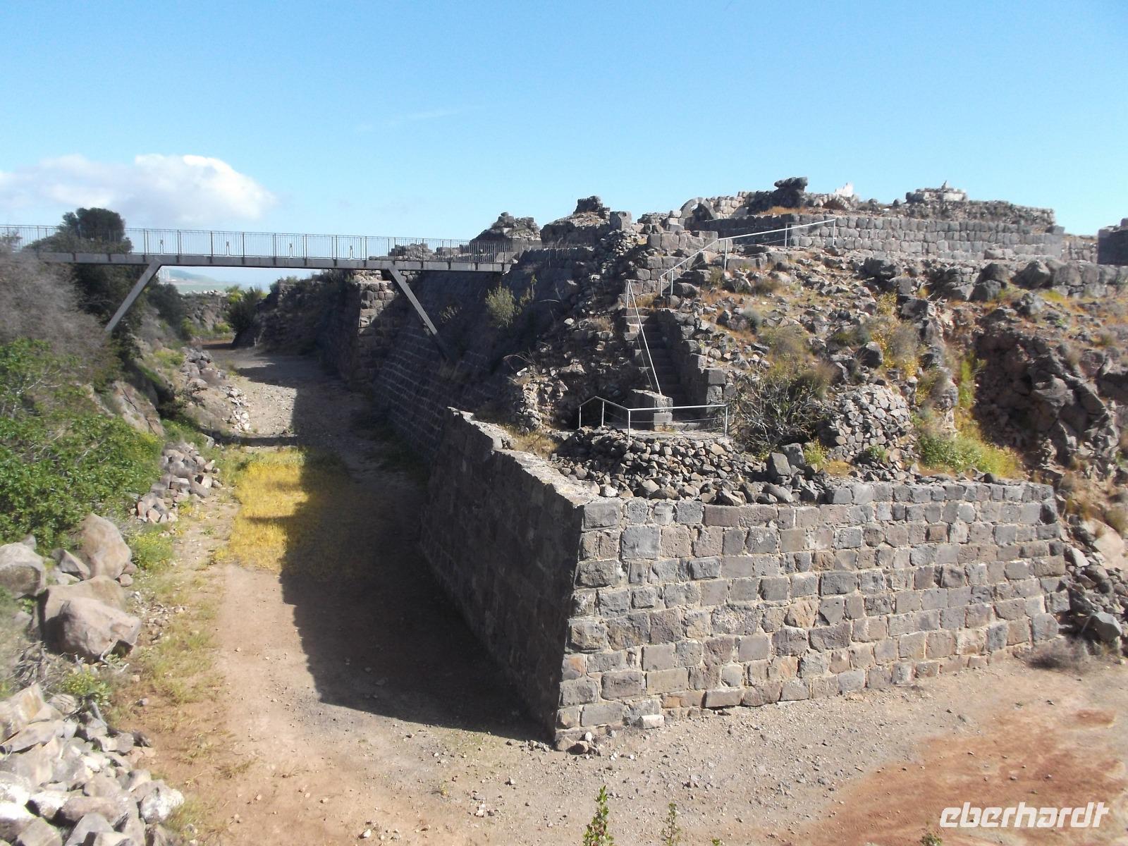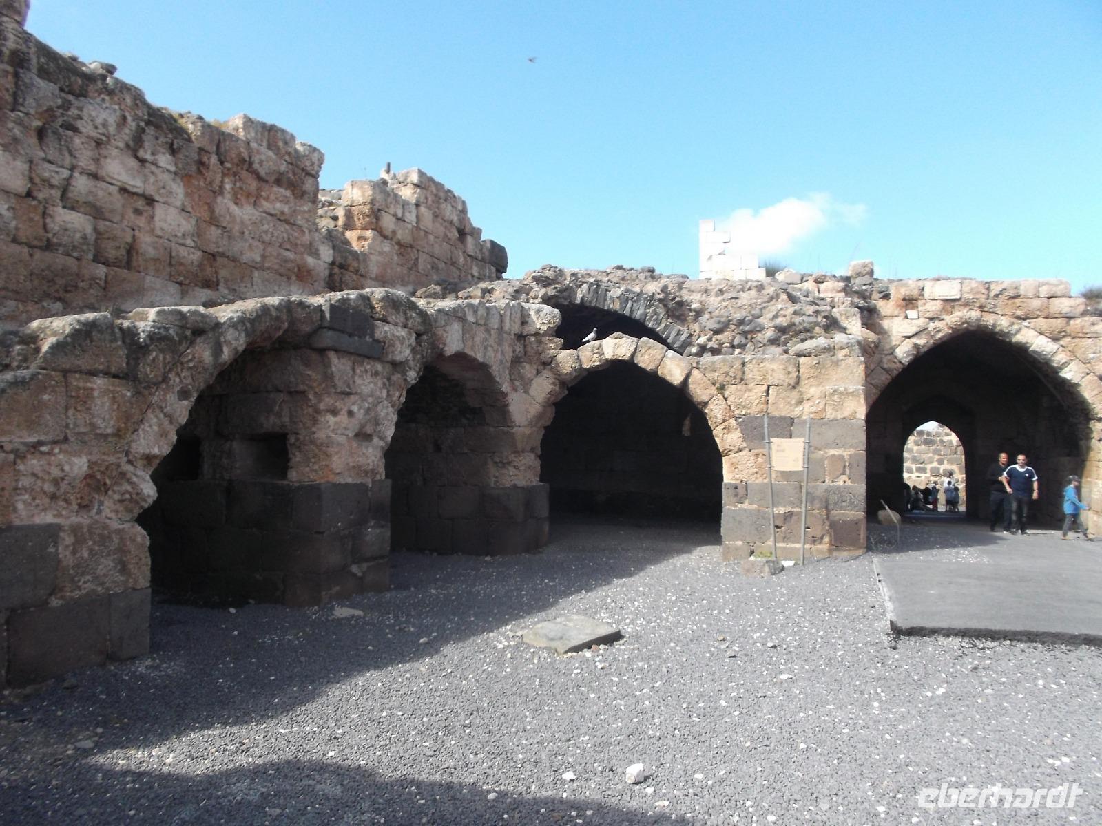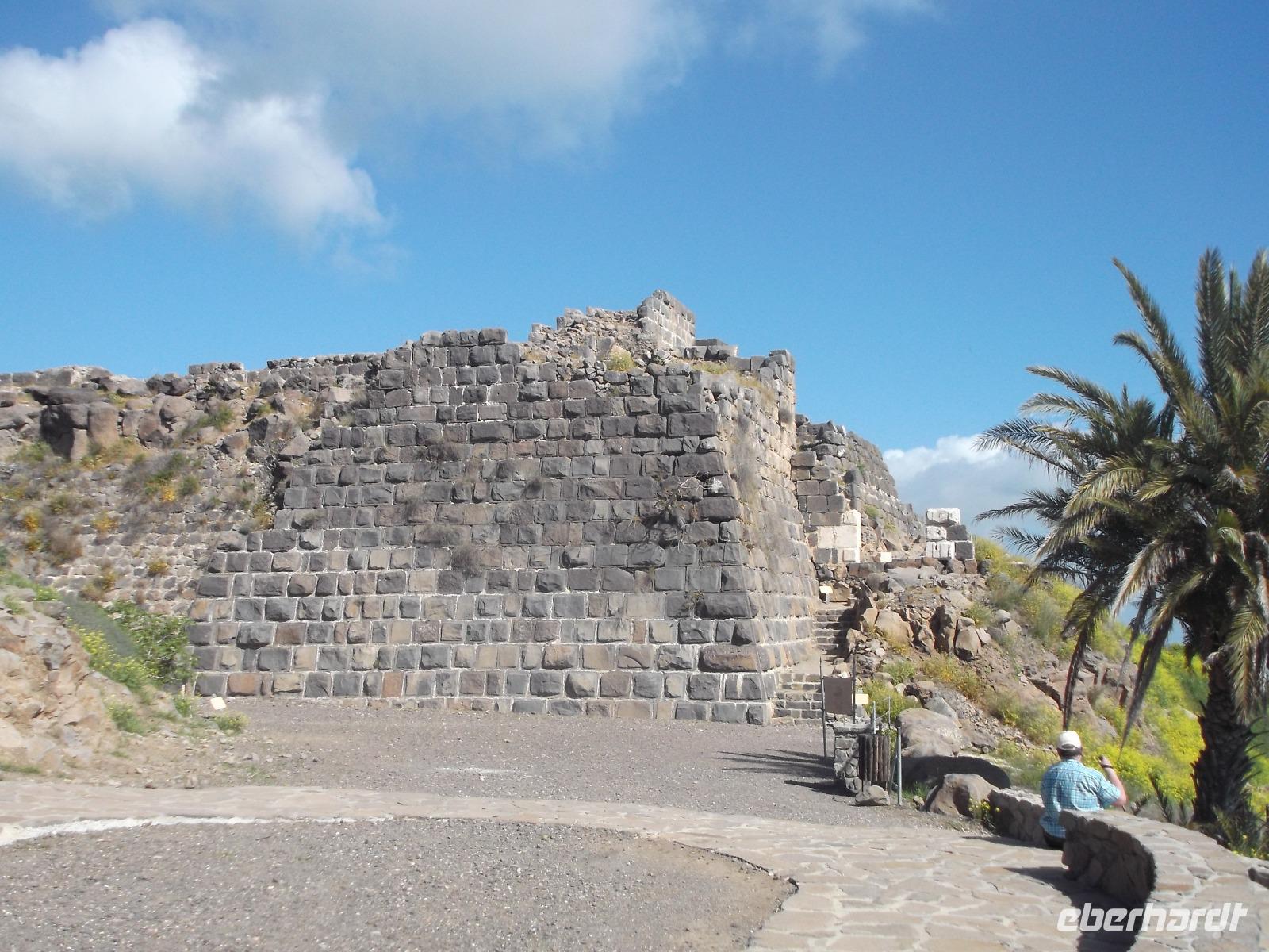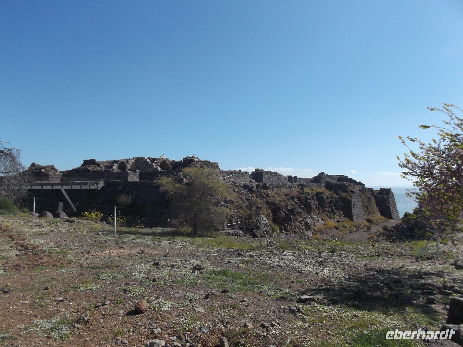 Die Burgruine Belvoir - eine Kreuzfahrerburg, die heute in einem israelischen Nationalpark liegt und vermutlich durch französische Tempelritter gebaut wurde - war unser erstes Ziel heute. Historisch belegt ist nur, dass die Festung 1168 an den Johanniterorden verkauft wurde, der daraus eine der spektakulärsten Burgen im Heiligen Land machte. Von der einstigen Stärke zeugen bis heute die imposanten Reste, die - 550 m über dem Jordantal gelegen - die Burg zu einer der schönsten und malerischsten zumindest im Heiligen Land machen. Vielleicht wird sie deshalb auf Hebräisch „Stern des Jordan" genannt. Vor allem bemerkenswert ist der über 20 m breite, in den Fels gehauene Burggraben, der die bedeutenden Ruinen der Burg mit ihrem fast quadratischen Grundriss umgibt. Wir hatten genug Zeit, um uns die malerische Ruine genauer anzusehen, bevor es weiterging zu den Golanhöhen.