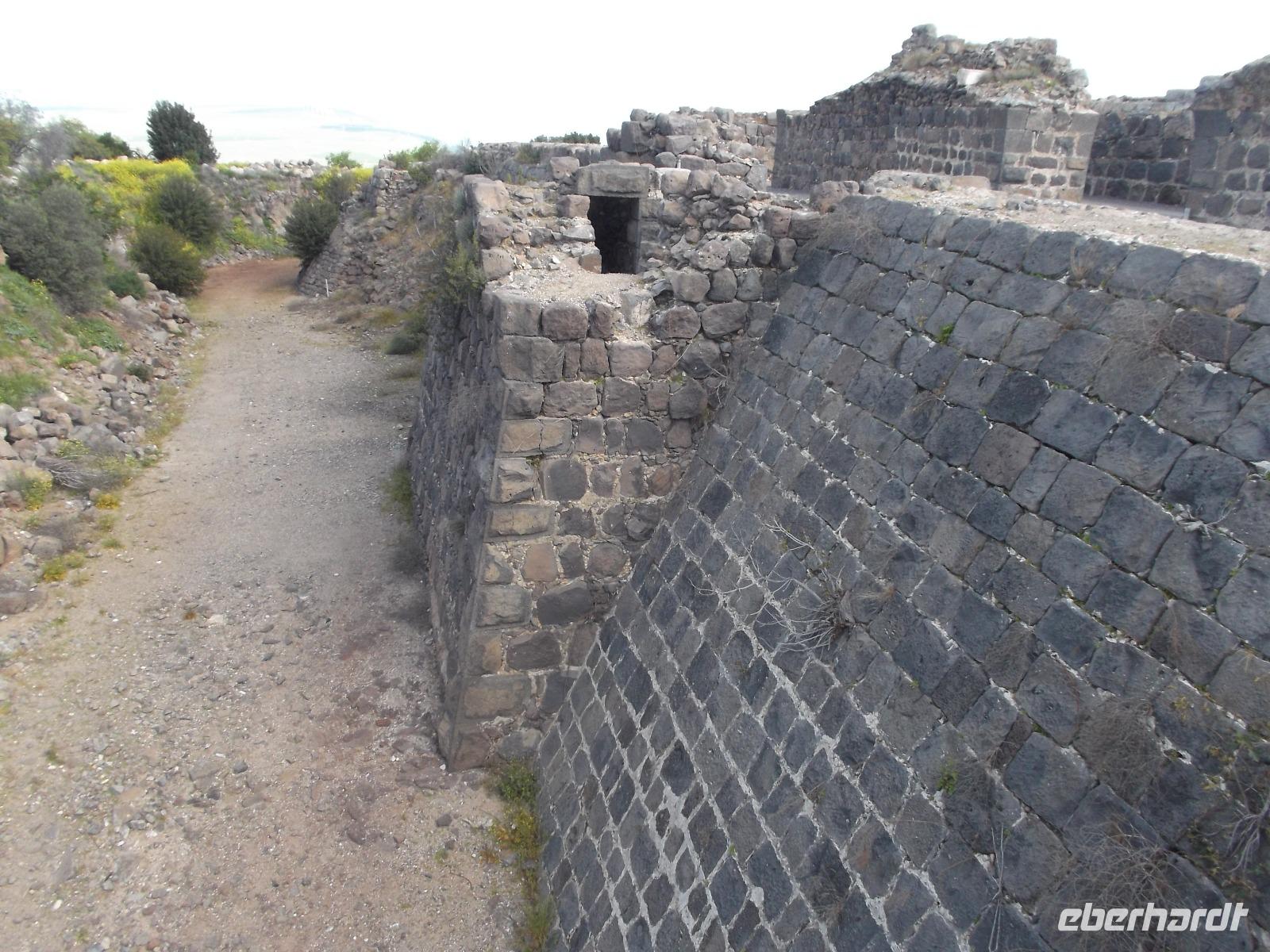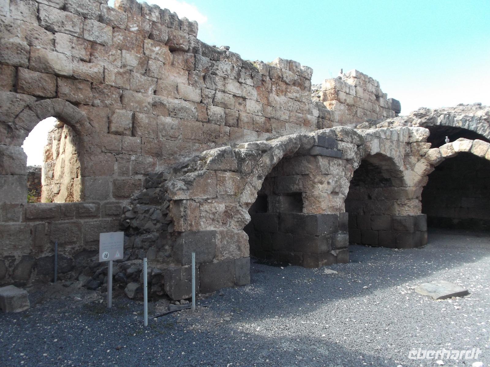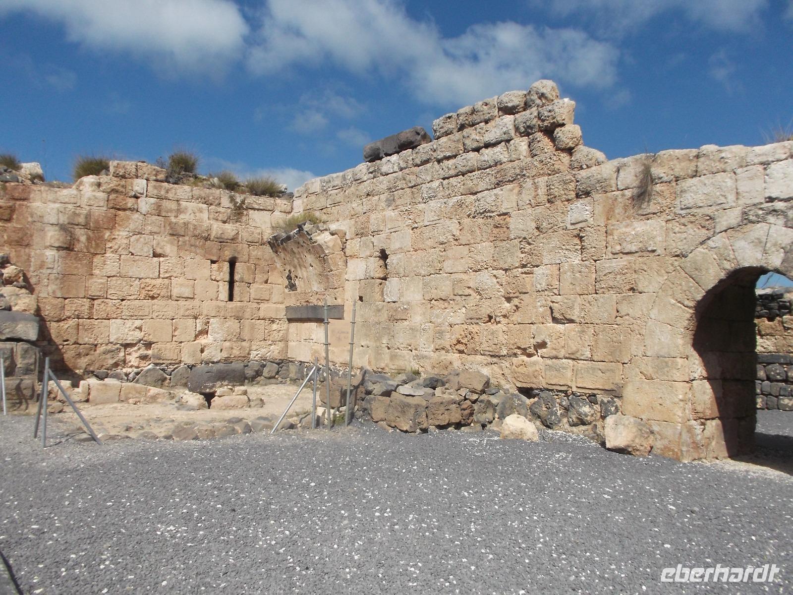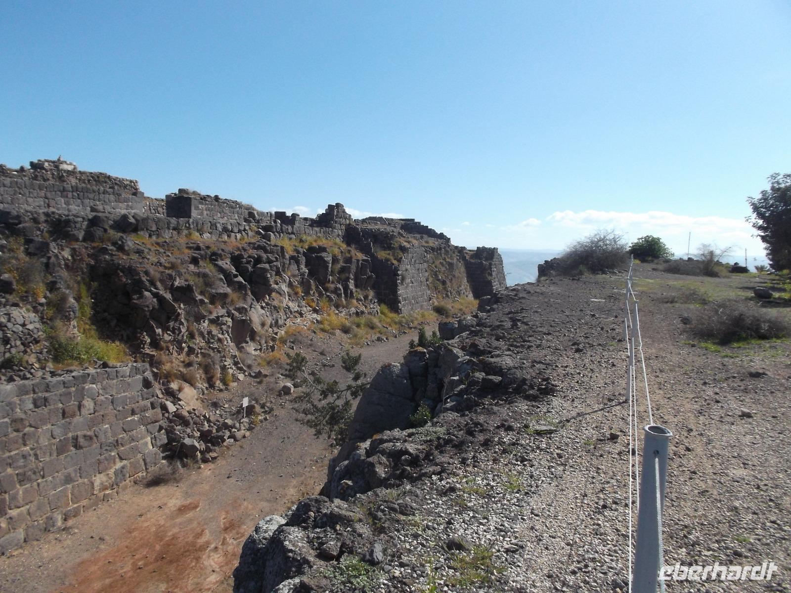Die Burgruine Belvoir - eine Kreuzfahrerburg, die heute in einem israelischen Nationalpark liegt und vermutlich durch französische Tempelritter gebaut wurde - war unser erstes Ziel heute. Historisch belegt ist nur, dass die Festung 1168 an den Johanniterorden verkauft wurde, der daraus eine der spektakulärsten Burgen im Heiligen Land machte. Von der einstigen Stärke zeugen bis heute die imposanten Reste, die - 550 m über dem Jordantal gelegen - die Burg zu einer der schönsten und malerischsten zumindest im Heiligen Land machen. Vielleicht wird sie deshalb auf Hebräisch „Stern des Jordan" genannt. Vor allem bemerkenswert ist der über 20 m breite, in den Fels gehauene Burggraben, der die bedeutenden Ruinen der Burg mit ihrem fast quadratischen Grundriss umgibt. Wir hatten genug Zeit, um uns die malerische Ruine genauer anzusehen, bevor es weiterging zu den Golanhöhen.