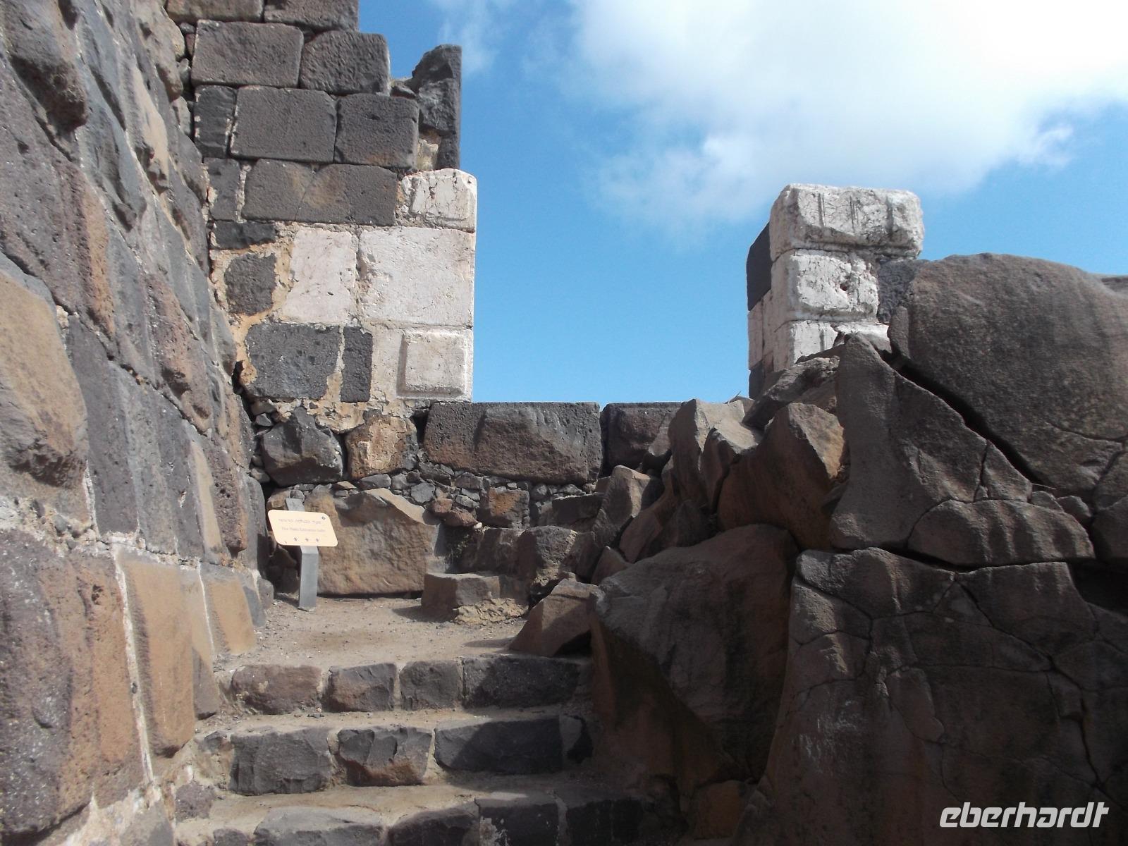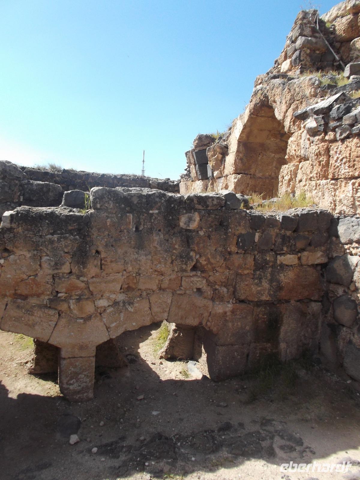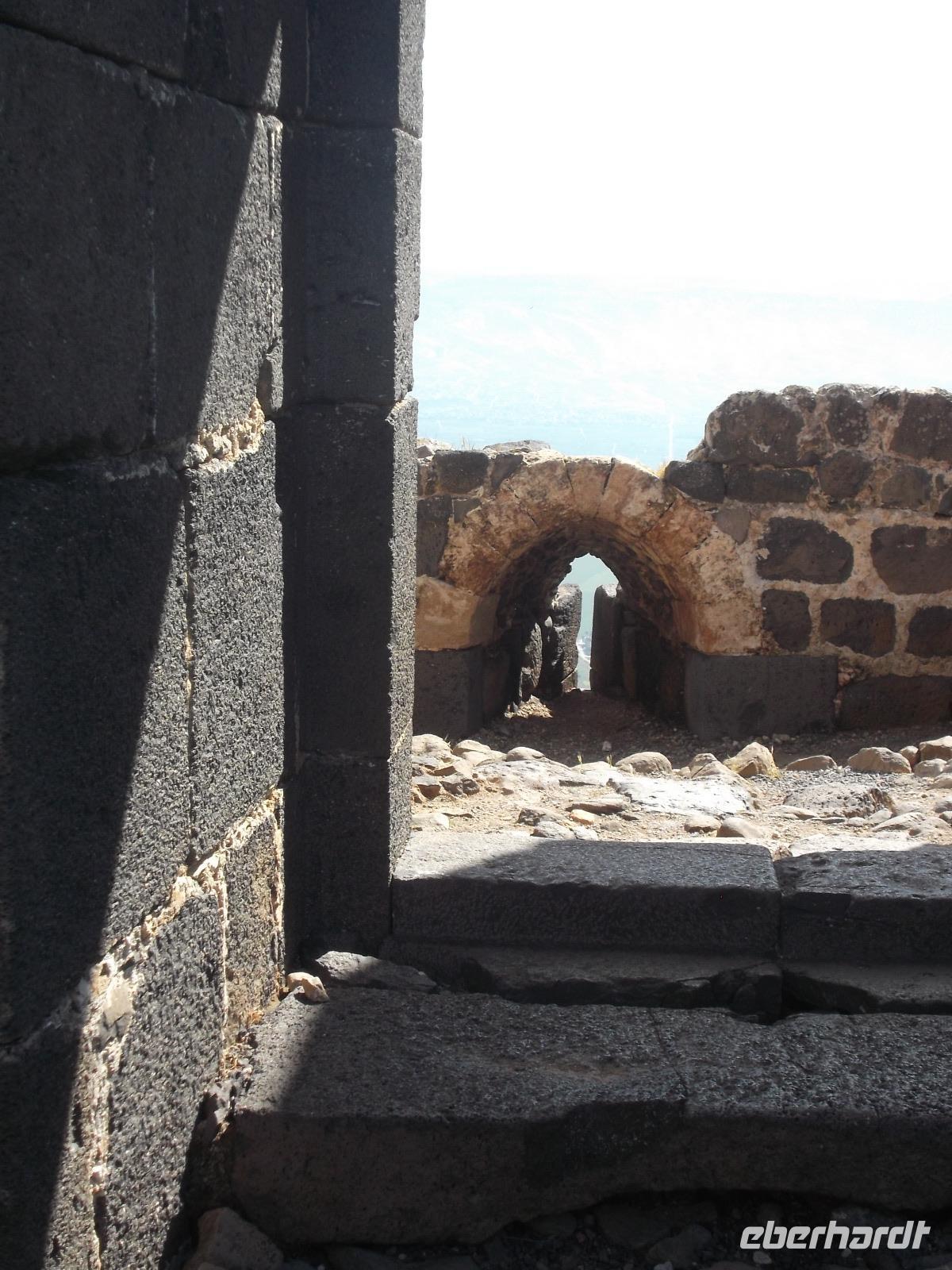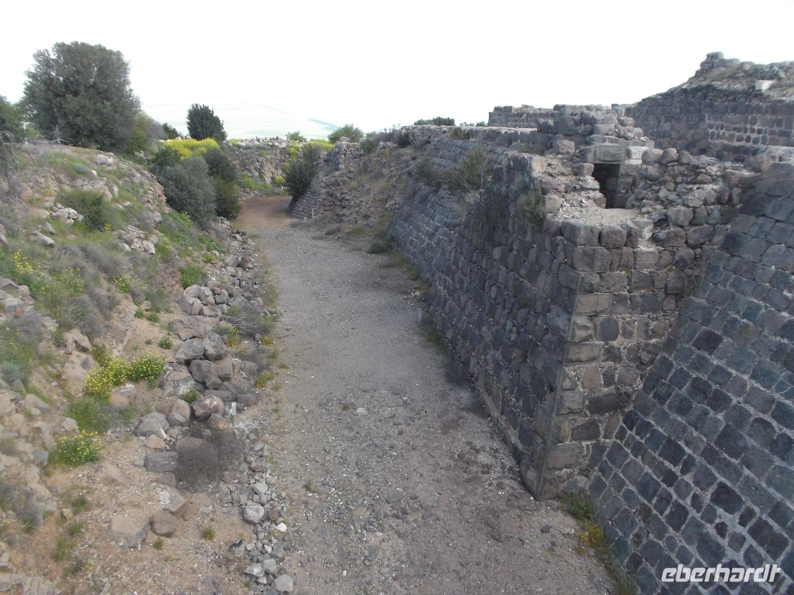 Die Burgruine Belvoir - eine Kreuzfahrerburg, die heute in einem israelischen Nationalpark liegt und vermutlich durch französische Tempelritter gebaut wurde - war unser erstes Ziel heute. Historisch belegt ist nur, dass die Festung 1168 an den Johanniterorden verkauft wurde, der daraus eine der spektakulärsten Burgen im Heiligen Land machte. Von der einstigen Stärke zeugen bis heute die imposanten Reste, die - 550 m über dem Jordantal gelegen - die Burg zu einer der schönsten und malerischsten zumindest im Heiligen Land machen. Vielleicht wird sie deshalb auf Hebräisch „Stern des Jordan" genannt. Vor allem bemerkenswert ist der über 20 m breite, in den Fels gehauene Burggraben, der die bedeutenden Ruinen der Burg mit ihrem fast quadratischen Grundriss umgibt. Wir hatten genug Zeit, um uns die malerische Ruine genauer anzusehen, bevor es weiterging zu den Golanhöhen.