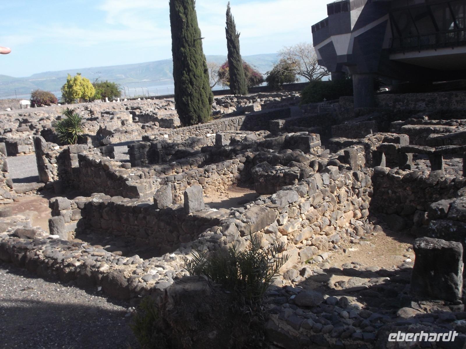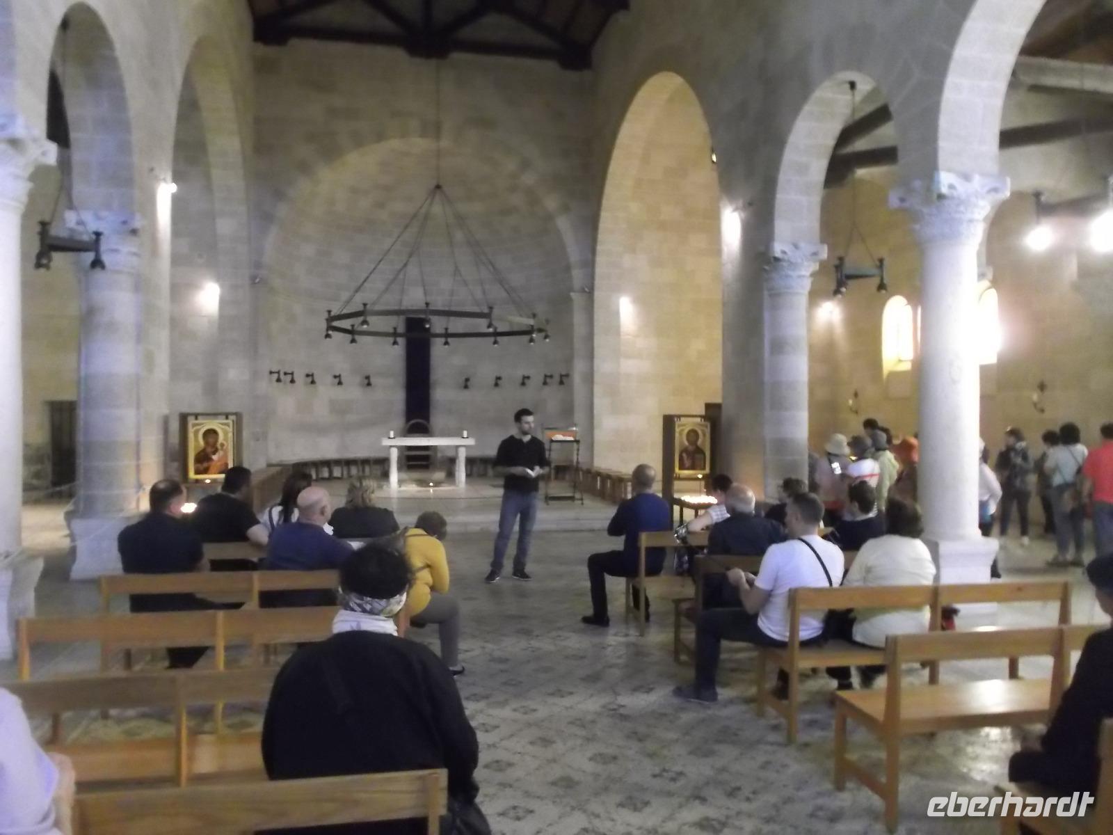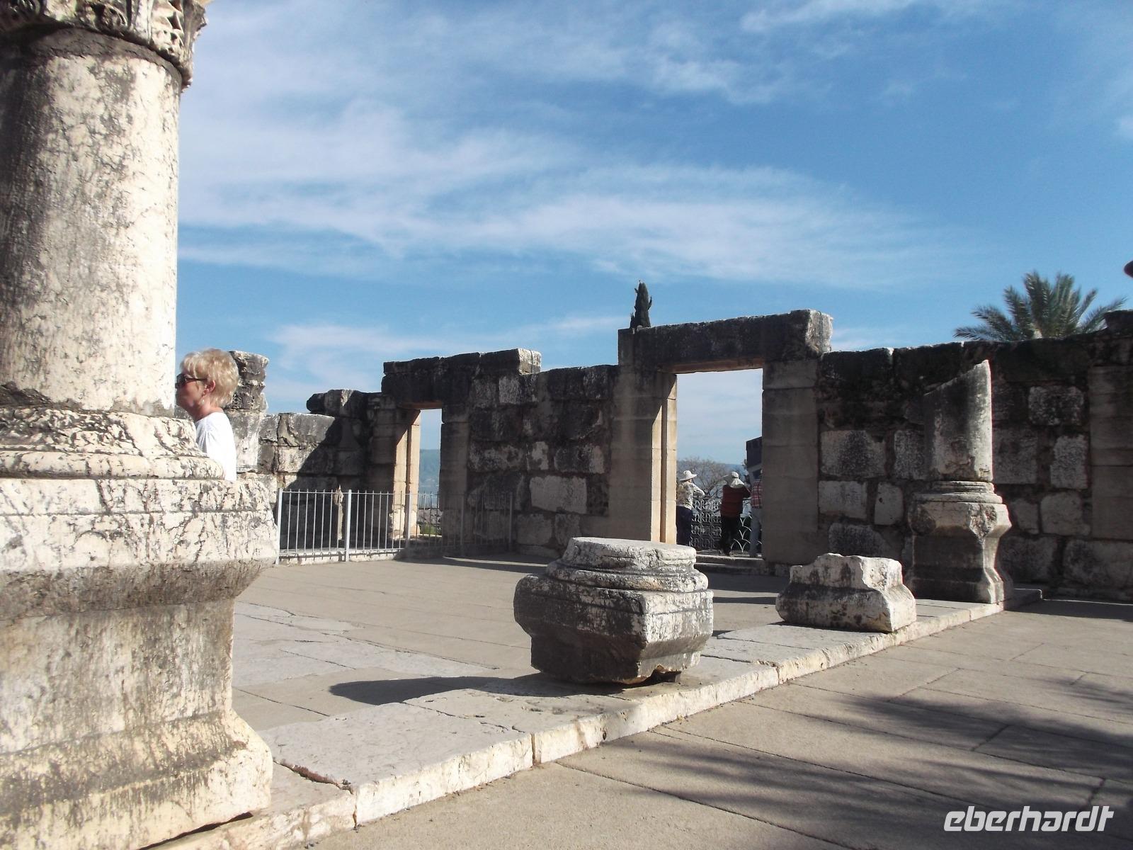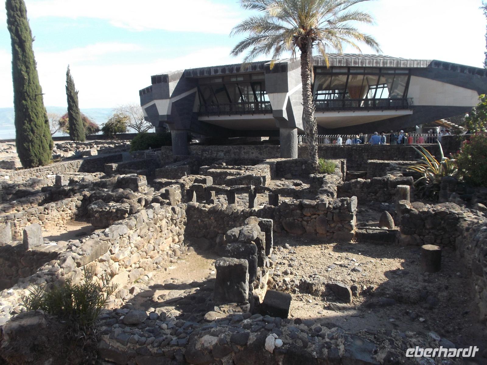 Als nächsten Höhepunkt des heutigen Tages erreichten wir die berühmte Brotvermehrungskirche, nahe Tabgha am See Genezareth. Hier soll laut dem Evangelium des Matthäus die "Die Speisung der Fünftausend" stattgefunden haben, in der durch das von Jesus gewirkte Wunder der Brotvermehrung über 5000 Zuhörer seiner Predigt von zwei Broten und fünf Fischen satt wurden. Schon früh entstanden an diesem legendären Ort und um den Brotz-Felsen Kirchen, bis heute kann man die Mosaikböden des 4. und 5. Jh. bewundern, die nach Ausgrabungen in den 30er Jahren des 20. Jh. als Schutz mit einer Notkirche überbaut wurden. 1980 - 1982 entstand dann das heutige Kirchengebäude, errichtet im byzantinischen Stil durch Kölner Architekten und auf den Grundmauern aus dem 5.Jahrhundert. Nach Besuch und etwas Freizeit hier in Tabgha ging es weiter nach Capernaum, jenem Ort, der in der Bibel als Wohnort von Simon-Petrus erwähnt wird. Hier soll Jesus Christus eine Weile gelebt haben - genauer gesagt hat er hier seine letzten Jahre zwischen seiner Taufe und seinem Kreuzestod verbracht. Gelebt haben soll er im Haus seines Freundes Simon, der später unter dem von Jesus verliehenen Namen Petrus der bedeutendste der Apostel und Bischof von Rom wurde. Die Ruinen seines Wohnhauses und vor allem die in Resten erhaltene Synagoge von Capernaum ließen bei uns wiederum einen ehrfürchtigen Schauer vor den antiken Bauten und den hier laut biblischer Überlieferung stattgefundenen Ereignissen aufkommen.