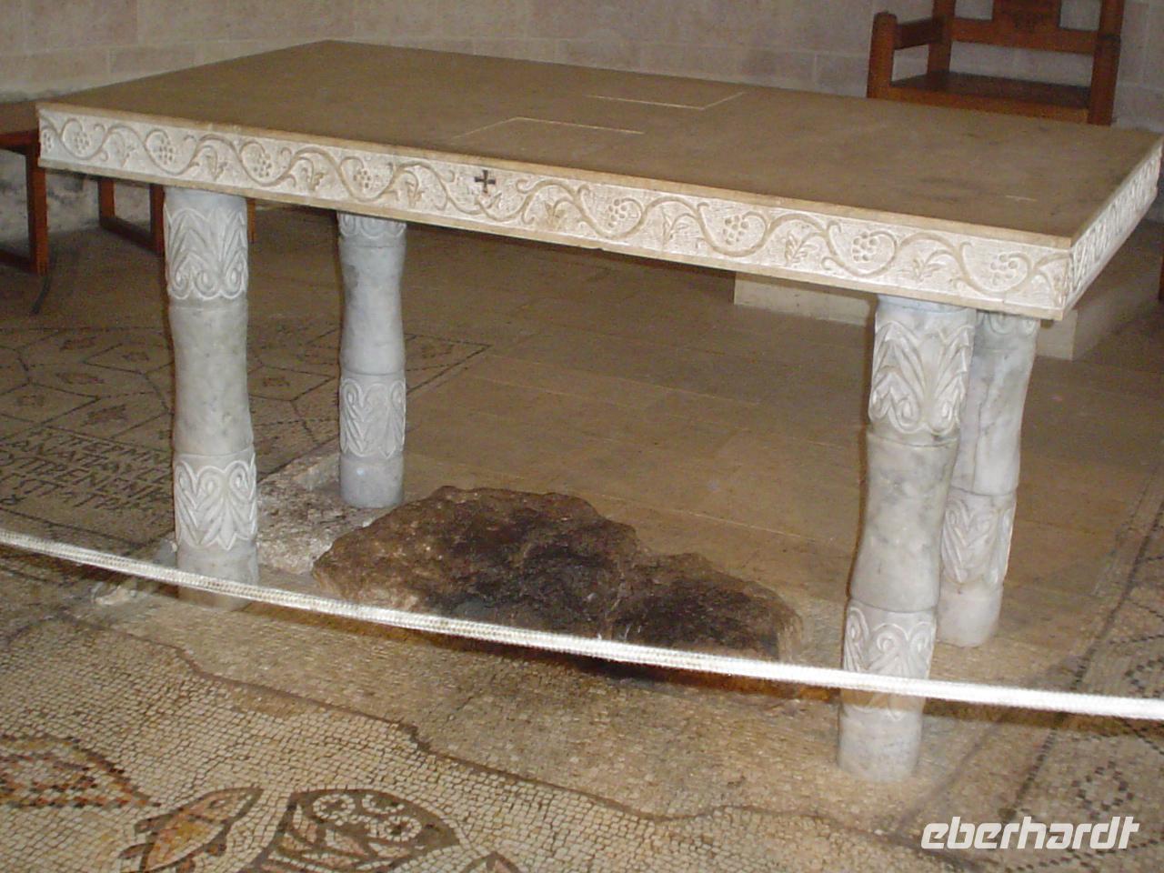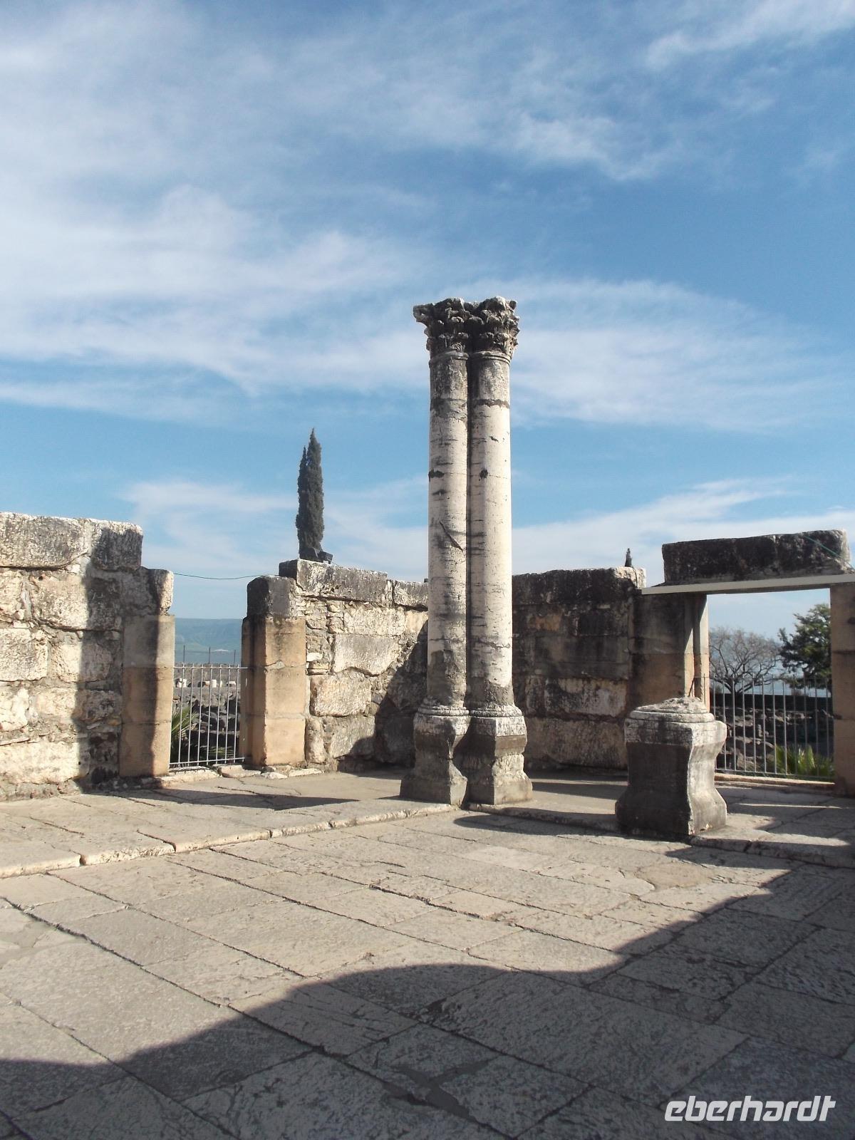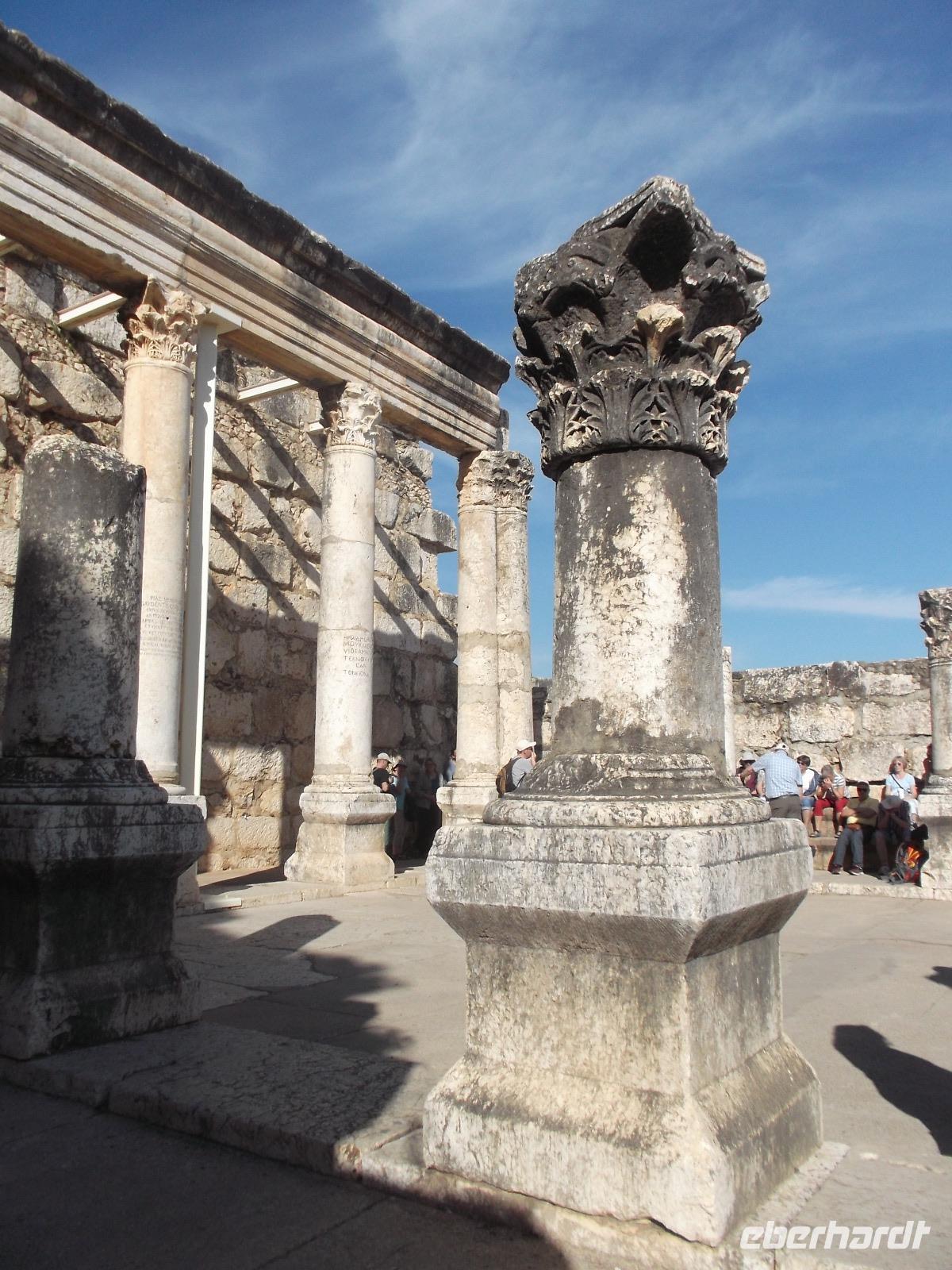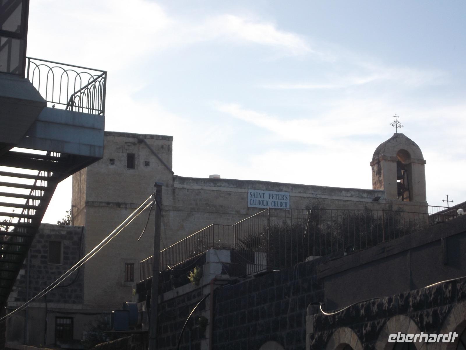 Als nächsten Höhepunkt des heutigen Tages erreichten wir die berühmte Brotvermehrungskirche, nahe Tabgha am See Genezareth. Hier soll laut dem Evangelium des Matthäus die "Die Speisung der Fünftausend" stattgefunden haben, in der durch das von Jesus gewirkte Wunder der Brotvermehrung über 5000 Zuhörer seiner Predigt von zwei Broten und fünf Fischen satt wurden. Schon früh entstanden an diesem legendären Ort und um den Brotz-Felsen Kirchen, bis heute kann man die Mosaikböden des 4. und 5. Jh. bewundern, die nach Ausgrabungen in den 30er Jahren des 20. Jh. als Schutz mit einer Notkirche überbaut wurden. 1980 - 1982 entstand dann das heutige Kirchengebäude, errichtet im byzantinischen Stil durch Kölner Architekten und auf den Grundmauern aus dem 5.Jahrhundert. Nach Besuch und etwas Freizeit hier in Tabgha ging es weiter nach Capernaum, jenem Ort, der in der Bibel als Wohnort von Simon-Petrus erwähnt wird. Hier soll Jesus Christus eine Weile gelebt haben - genauer gesagt hat er hier seine letzten Jahre zwischen seiner Taufe und seinem Kreuzestod verbracht. Gelebt haben soll er im Haus seines Freundes Simon, der später unter dem von Jesus verliehenen Namen Petrus der bedeutendste der Apostel und Bischof von Rom wurde. Die Ruinen seines Wohnhauses und vor allem die in Resten erhaltene Synagoge von Capernaum ließen bei uns wiederum einen ehrfürchtigen Schauer vor den antiken Bauten und den hier laut biblischer Überlieferung stattgefundenen Ereignissen aufkommen.