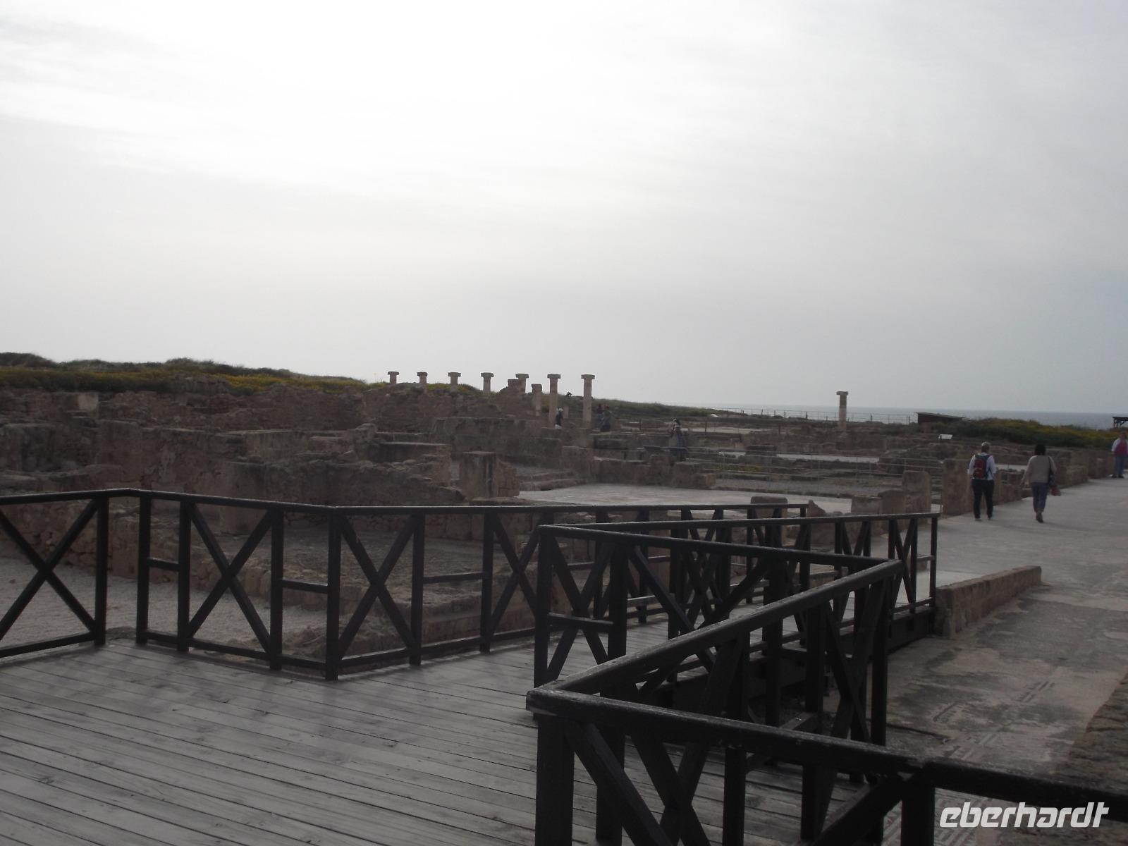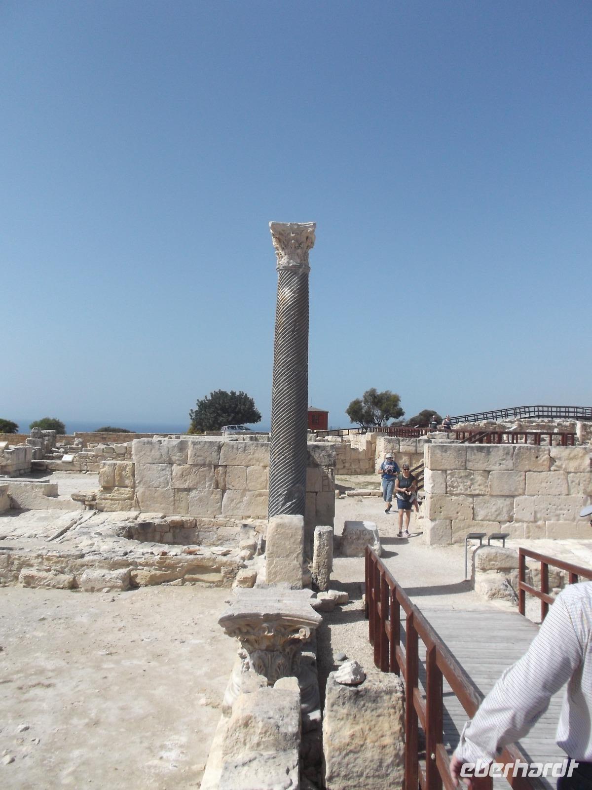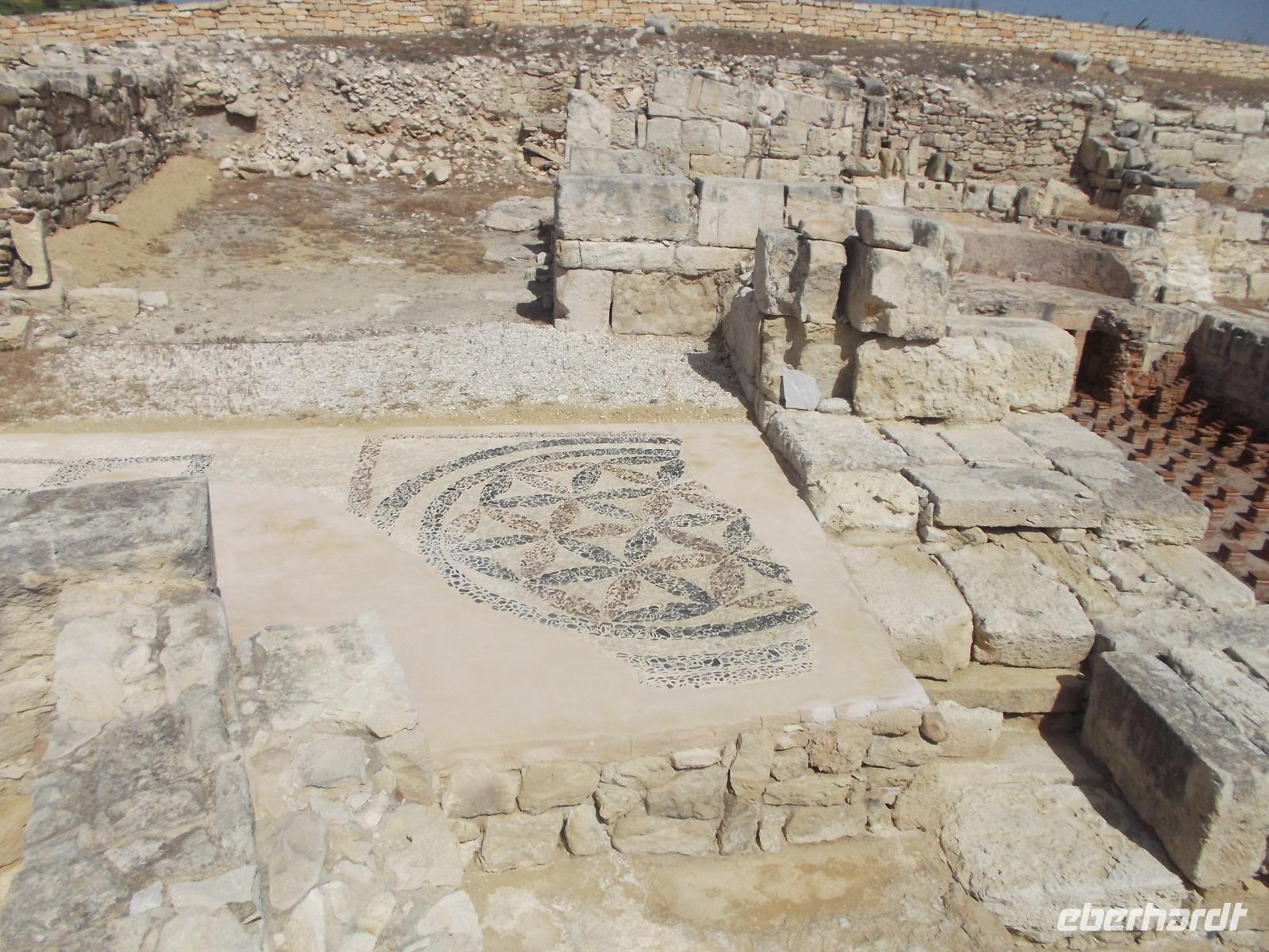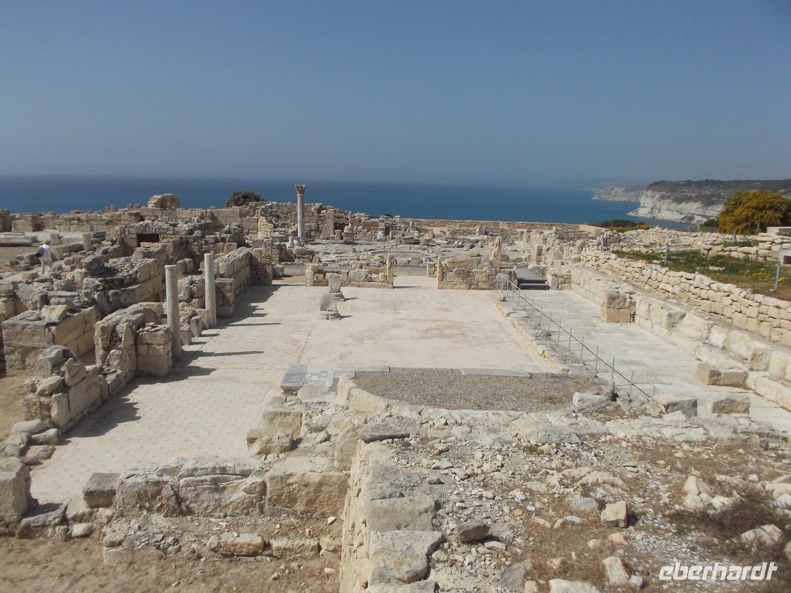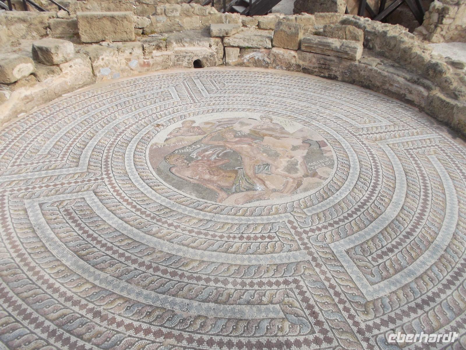 Westlich der Stadt Limassol liegt die Halbinsel Akrotiri, auf der sich bis heute ein großer britischer Armeestützpunkt befindet und an deren Rand befindet sich eine der bedeutendsten Ausgrabungsstädten Zyperns. Das ehemalige Stadtkönigreich Kourion ist wohl im 13. Vorchristlichen Jahrhundert als Kolonie von Argos gegründet worden, das als ältester kontinuierlich besiedelter Ort Europas gilt. Dennoch sind Dokumente über Kourion erst später überliefert, die ältesten stammen aus dem 7. Jh. v.Chr. Prunkstücke der Ausgrabungen sind mehrere Villen aus römischer Zeit mit gut erhaltenen Fußbodenmosaiken, von denen das sogenannte „Haus des Eustolios" die prächtigste und weitläufigste darstellt und fast schon als Palast bezeichnet werden kann. Hier sahen wir auch aufwendig gestaltete Thermen mit Heizungsanlagen, Wasserzufuhr etc. sowie gut erkennbar den typischen Aufbau einer römischen Villa.