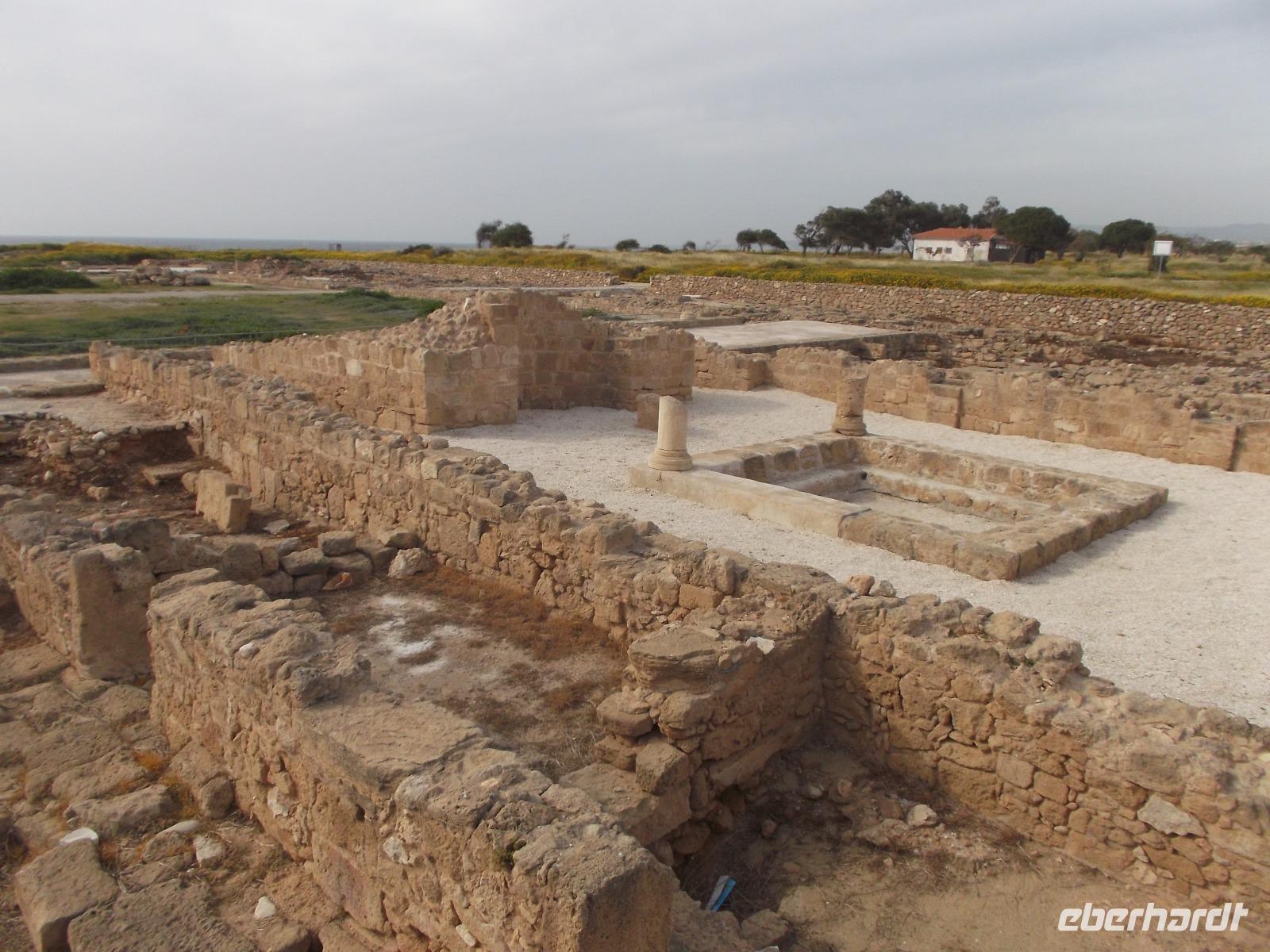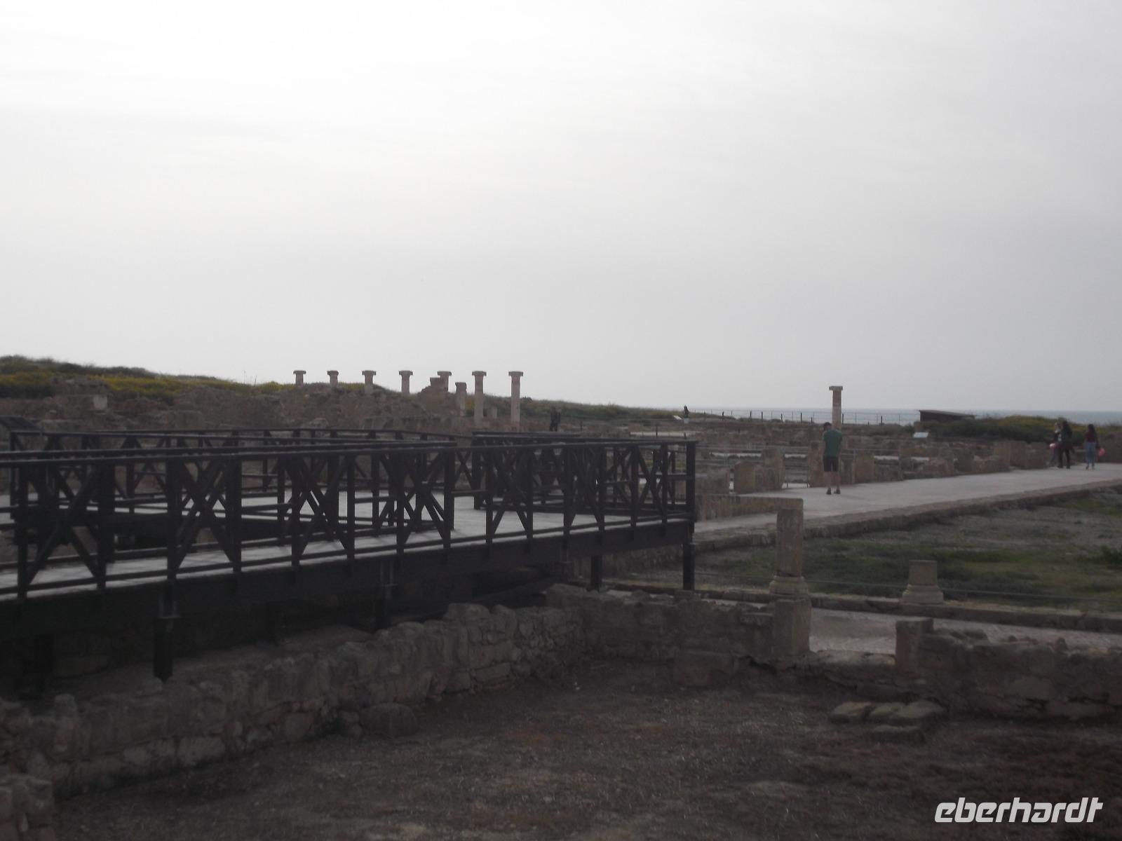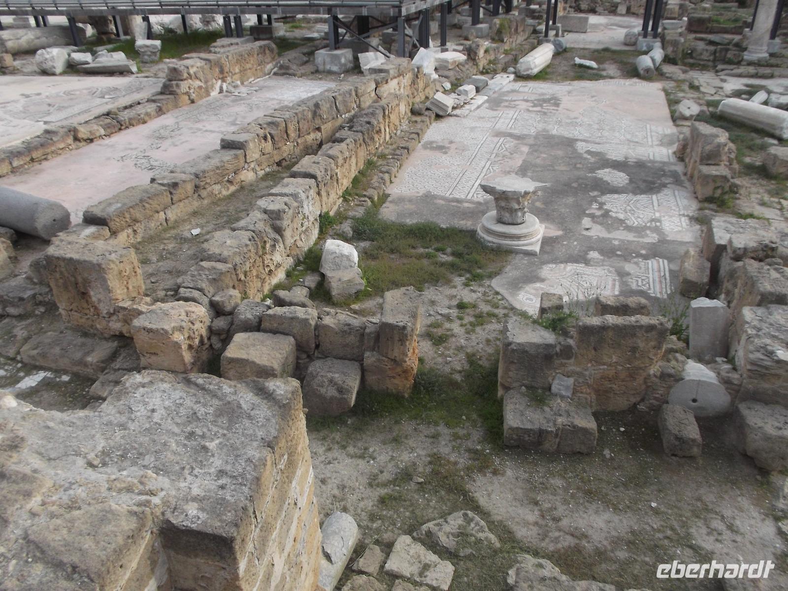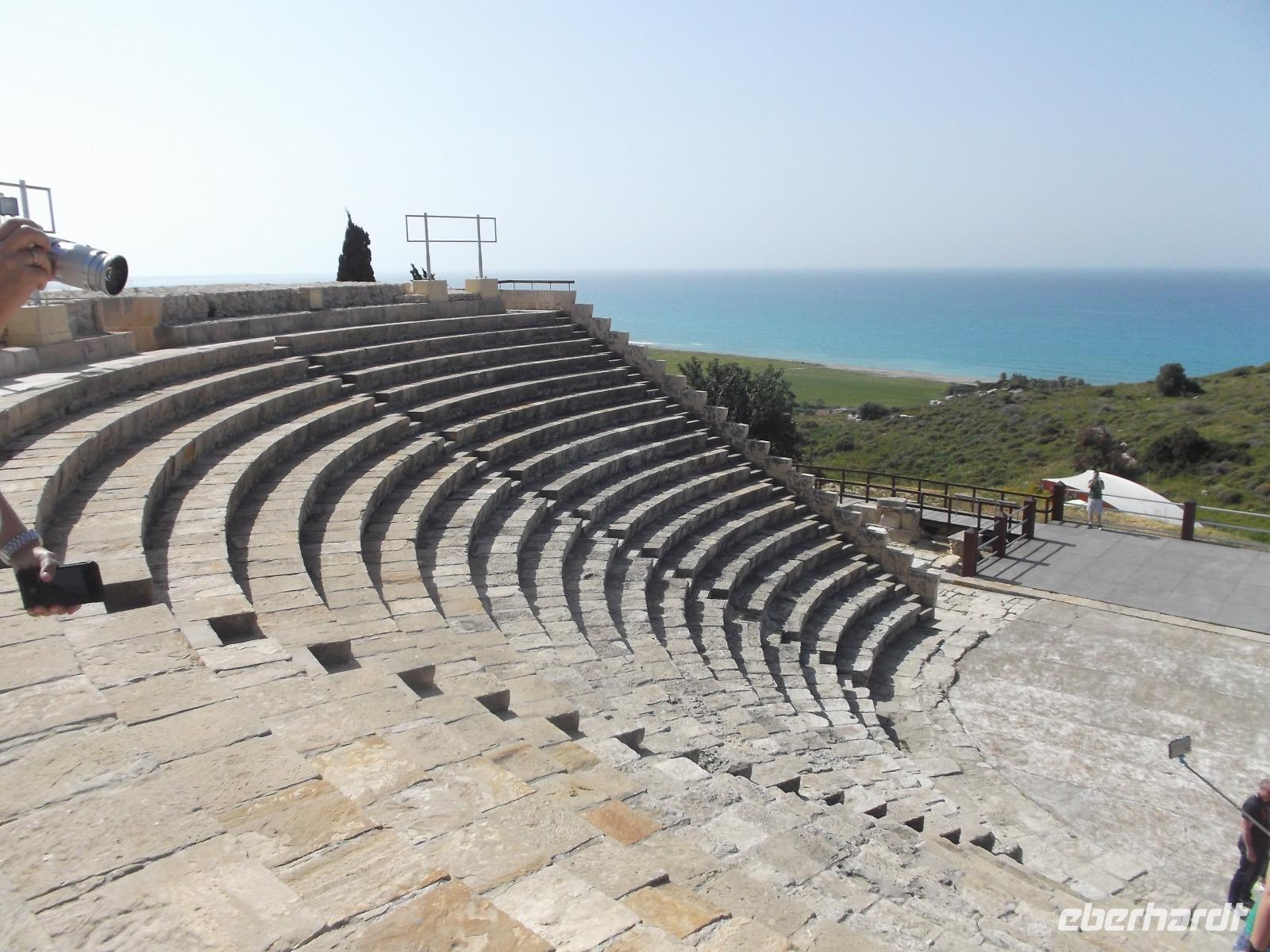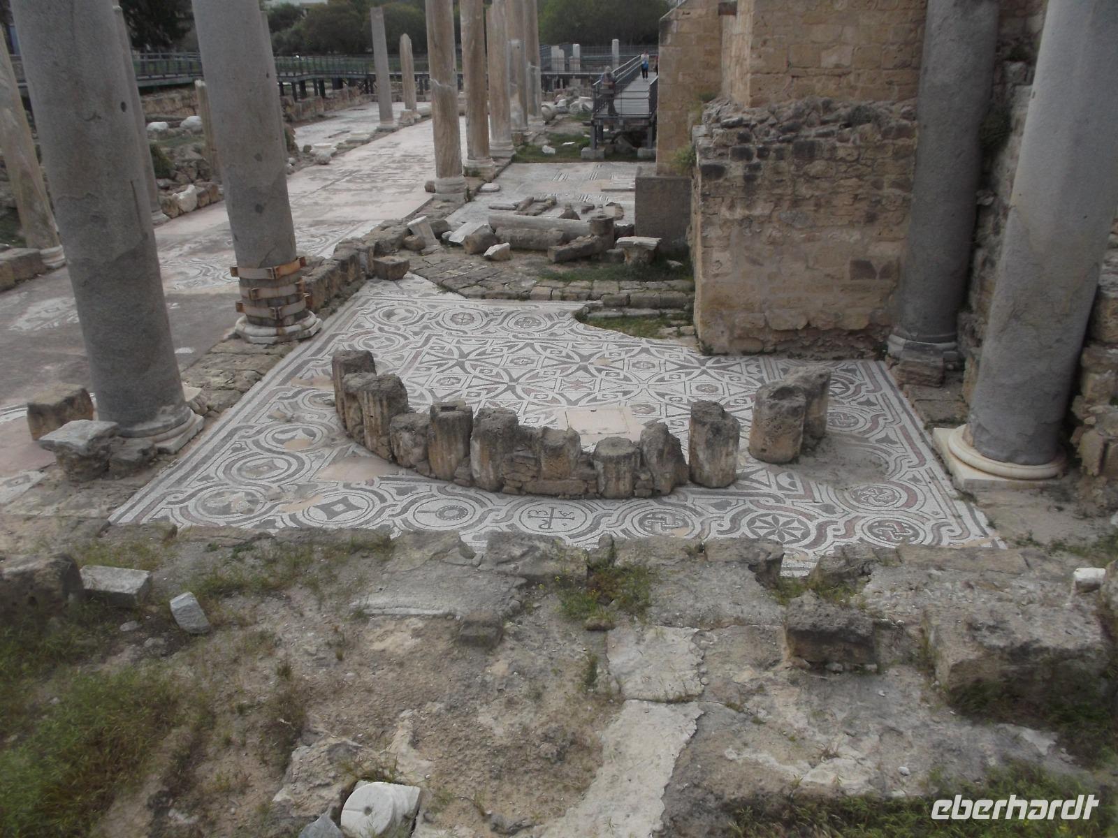 Westlich der Stadt Limassol liegt die Halbinsel Akrotiri, auf der sich bis heute ein großer britischer Armeestützpunkt befindet und an deren Rand befindet sich eine der bedeutendsten Ausgrabungsstädten Zyperns. Das ehemalige Stadtkönigreich Kourion ist wohl im 13. Vorchristlichen Jahrhundert als Kolonie von Argos gegründet worden, das als ältester kontinuierlich besiedelter Ort Europas gilt. Dennoch sind Dokumente über Kourion erst später überliefert, die ältesten stammen aus dem 7. Jh. v.Chr. Prunkstücke der Ausgrabungen sind mehrere Villen aus römischer Zeit mit gut erhaltenen Fußbodenmosaiken, von denen das sogenannte „Haus des Eustolios" die prächtigste und weitläufigste darstellt und fast schon als Palast bezeichnet werden kann. Hier sahen wir auch aufwendig gestaltete Thermen mit Heizungsanlagen, Wasserzufuhr etc. sowie gut erkennbar den typischen Aufbau einer römischen Villa.