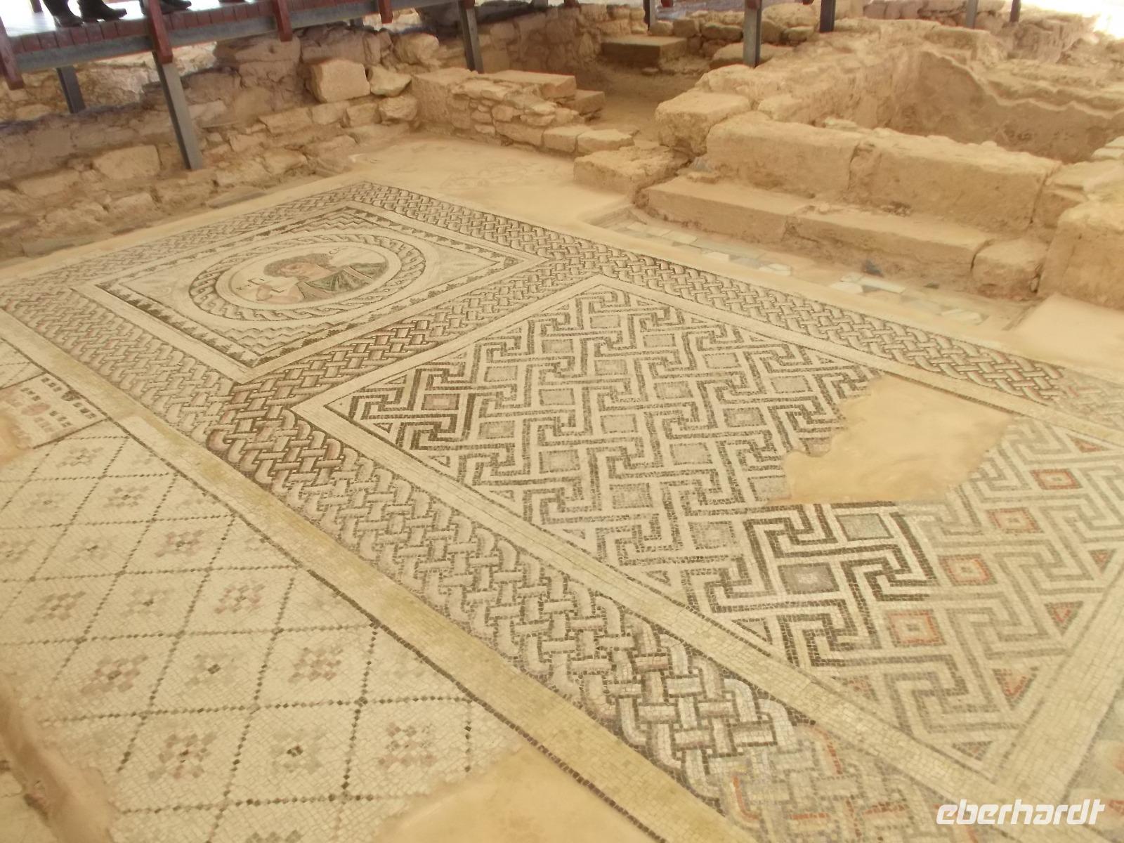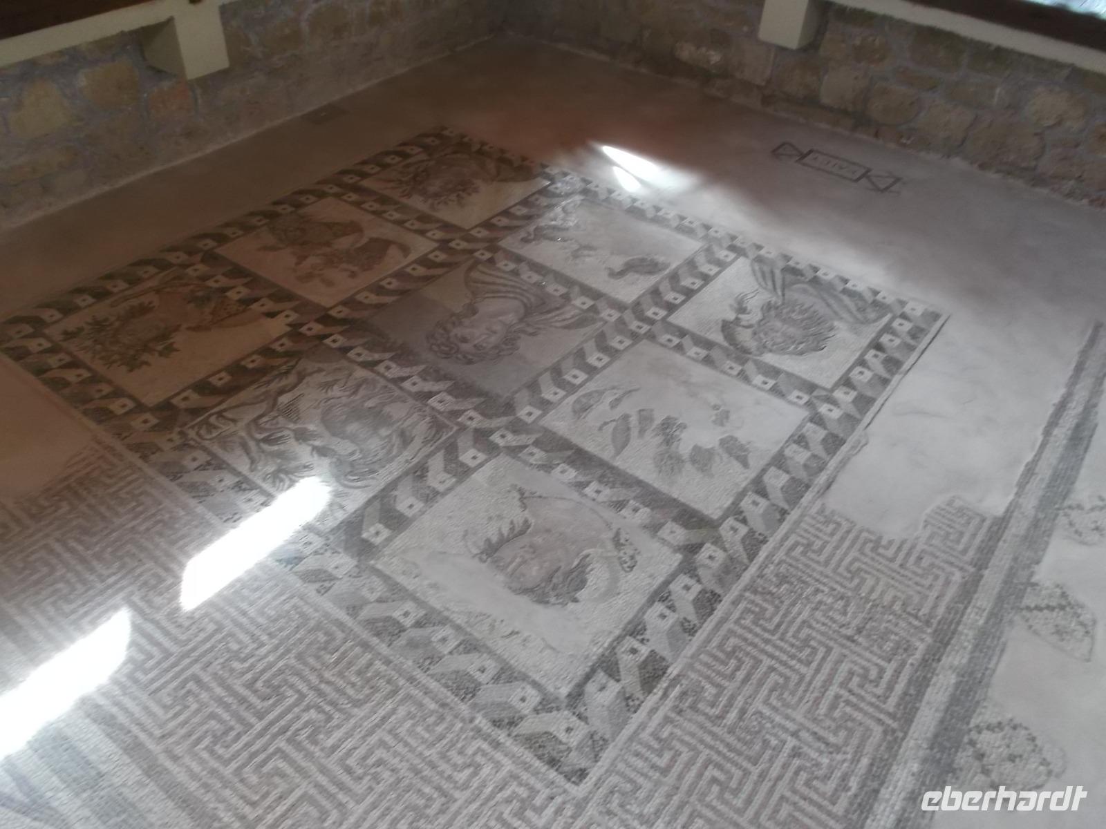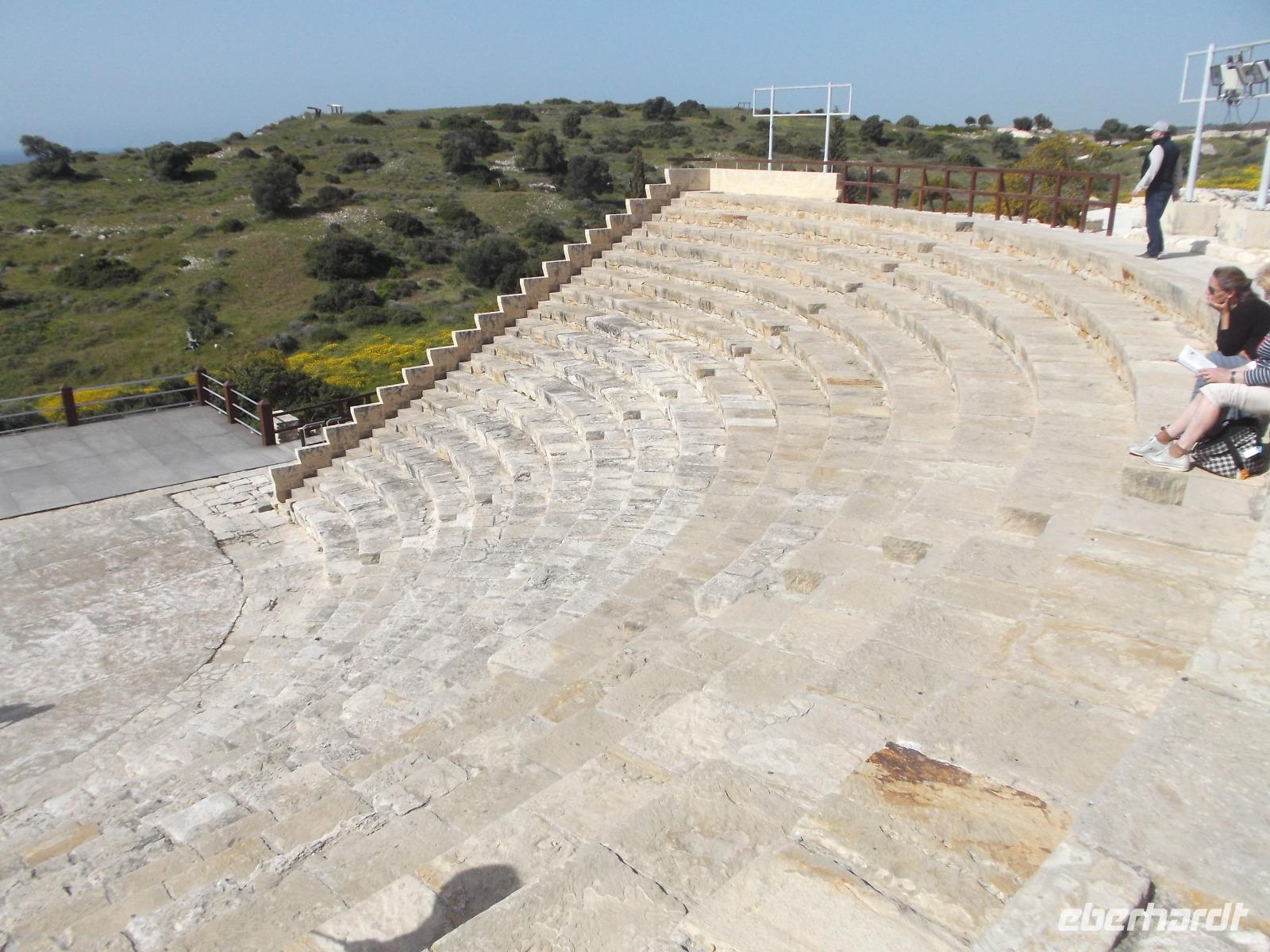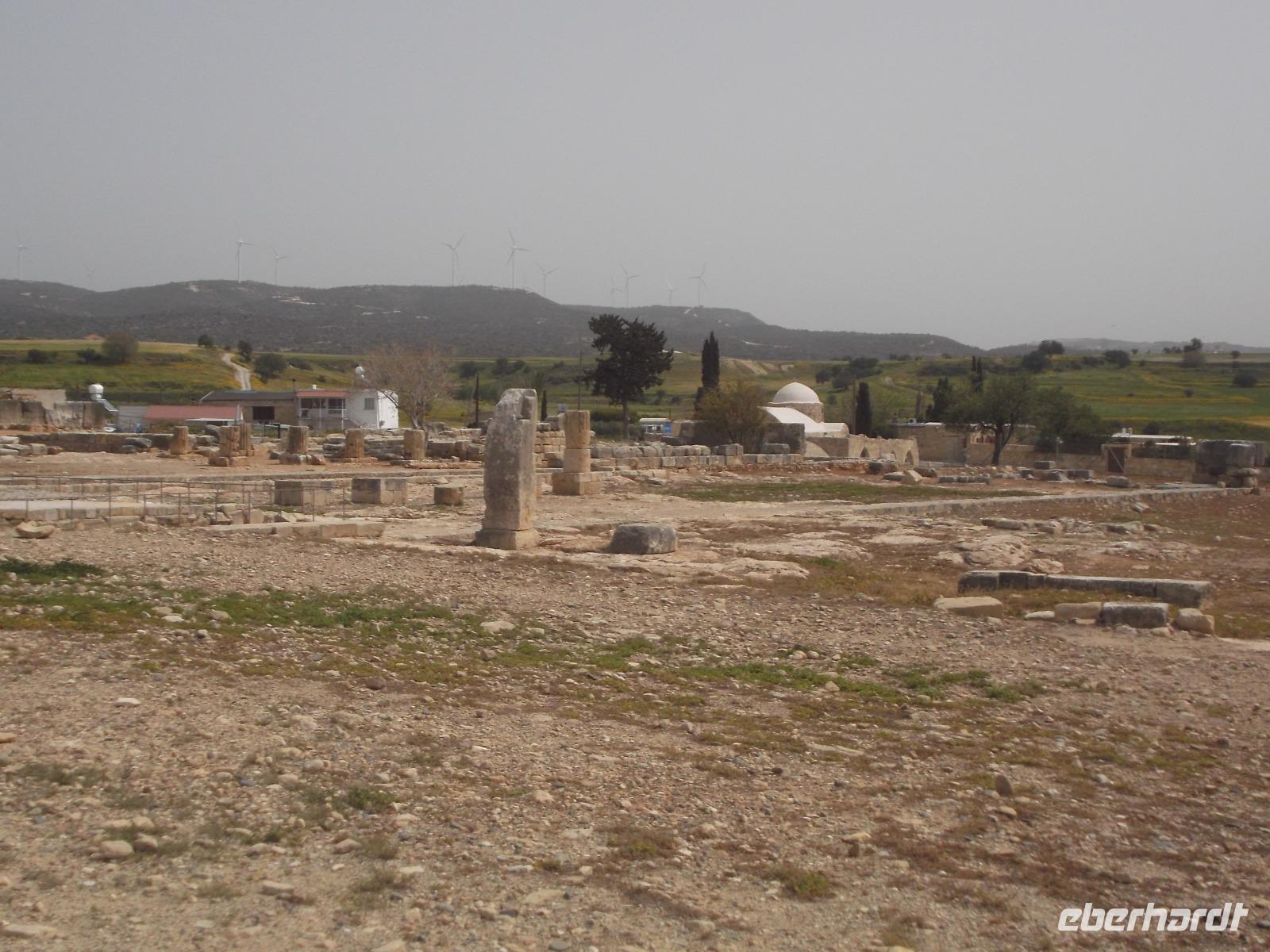 Westlich der Stadt Limassol liegt die Halbinsel Akrotiri, auf der sich bis heute ein großer britischer Armeestützpunkt befindet und an deren Rand befindet sich eine der bedeutendsten Ausgrabungsstädten Zyperns. Das ehemalige Stadtkönigreich Kourion ist wohl im 13. Vorchristlichen Jahrhundert als Kolonie von Argos gegründet worden, das als ältester kontinuierlich besiedelter Ort Europas gilt. Dennoch sind Dokumente über Kourion erst später überliefert, die ältesten stammen aus dem 7. Jh. v.Chr. Prunkstücke der Ausgrabungen sind mehrere Villen aus römischer Zeit mit gut erhaltenen Fußbodenmosaiken, von denen das sogenannte „Haus des Eustolios" die prächtigste und weitläufigste darstellt und fast schon als Palast bezeichnet werden kann. Hier sahen wir auch aufwendig gestaltete Thermen mit Heizungsanlagen, Wasserzufuhr etc. sowie gut erkennbar den typischen Aufbau einer römischen Villa.