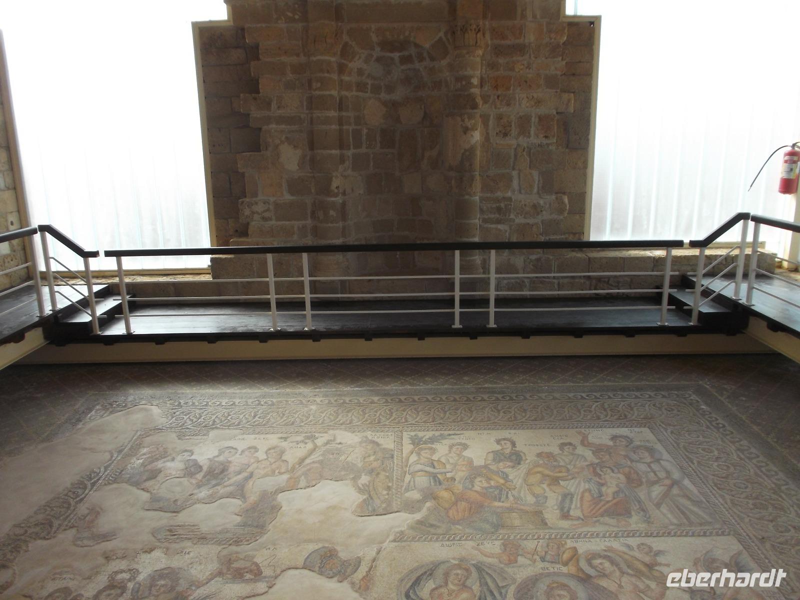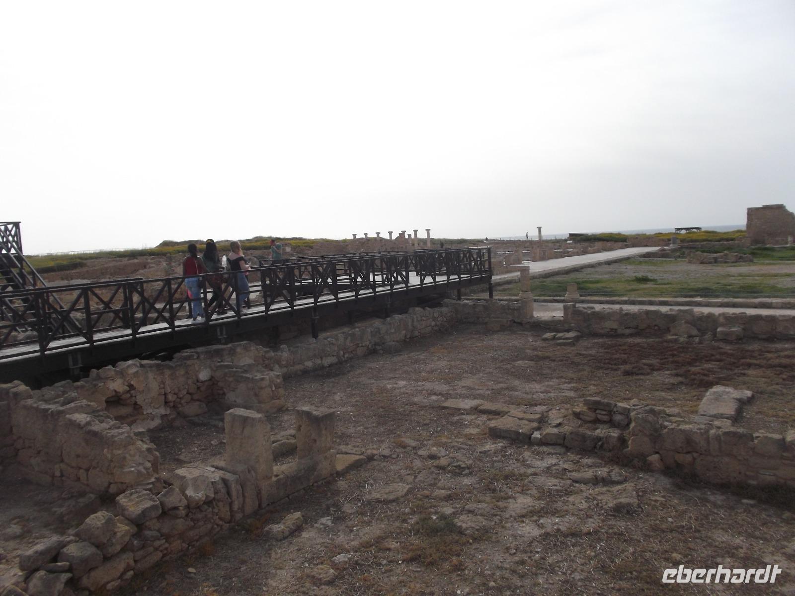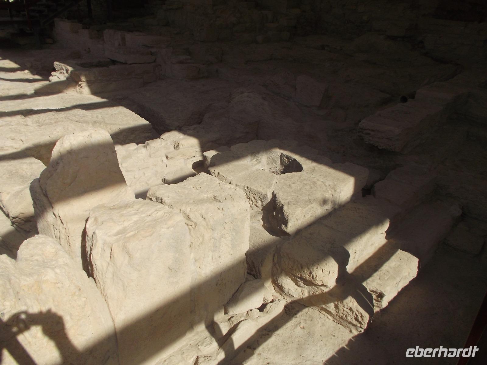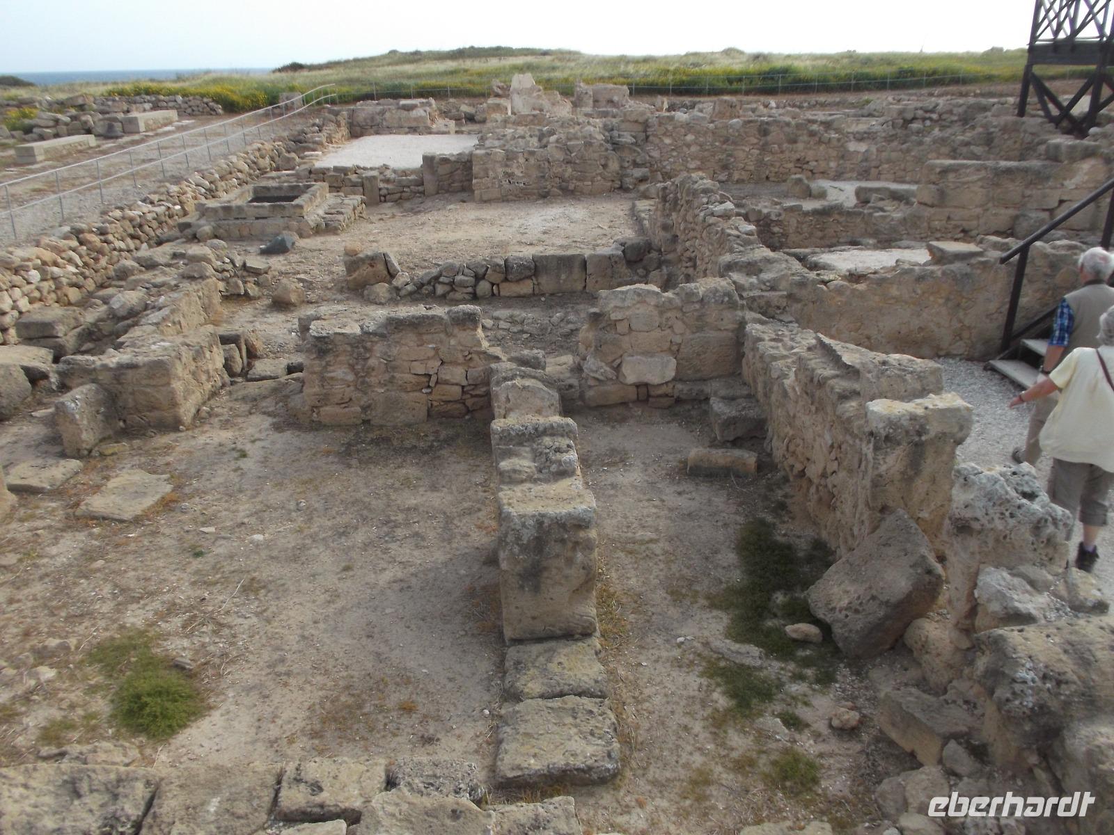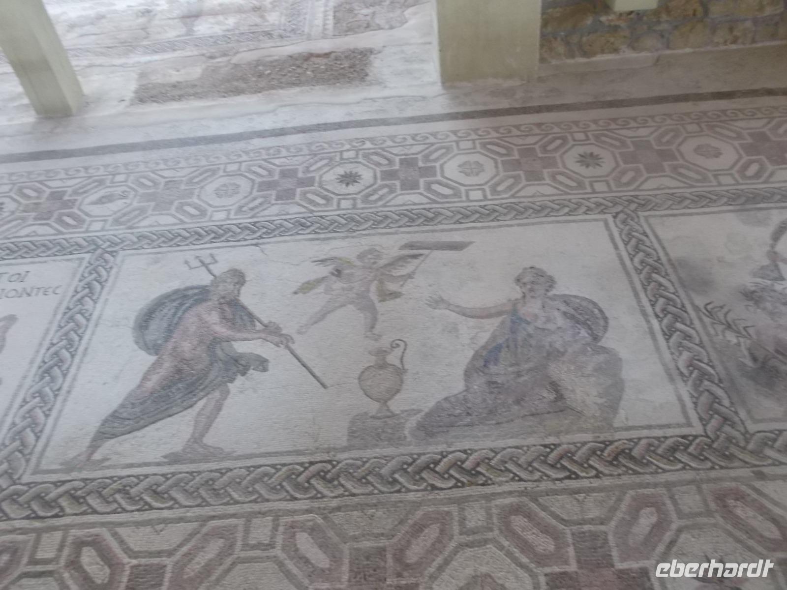 Westlich der Stadt Limassol liegt die Halbinsel Akrotiri, auf der sich bis heute ein großer britischer Armeestützpunkt befindet und an deren Rand befindet sich eine der bedeutendsten Ausgrabungsstädten Zyperns. Das ehemalige Stadtkönigreich Kourion ist wohl im 13. Vorchristlichen Jahrhundert als Kolonie von Argos gegründet worden, das als ältester kontinuierlich besiedelter Ort Europas gilt. Dennoch sind Dokumente über Kourion erst später überliefert, die ältesten stammen aus dem 7. Jh. v.Chr. Prunkstücke der Ausgrabungen sind mehrere Villen aus römischer Zeit mit gut erhaltenen Fußbodenmosaiken, von denen das sogenannte „Haus des Eustolios" die prächtigste und weitläufigste darstellt und fast schon als Palast bezeichnet werden kann. Hier sahen wir auch aufwendig gestaltete Thermen mit Heizungsanlagen, Wasserzufuhr etc. sowie gut erkennbar den typischen Aufbau einer römischen Villa.