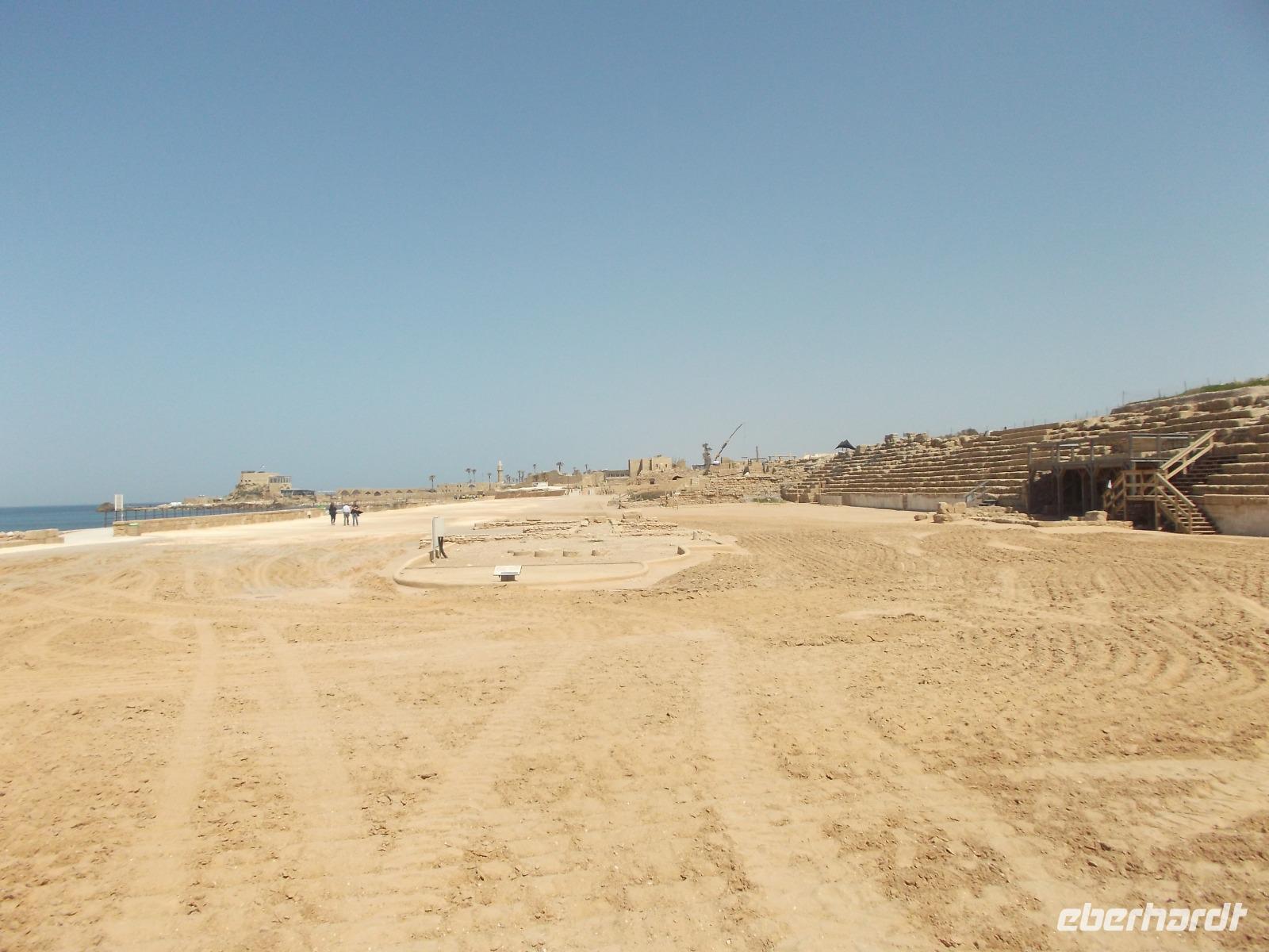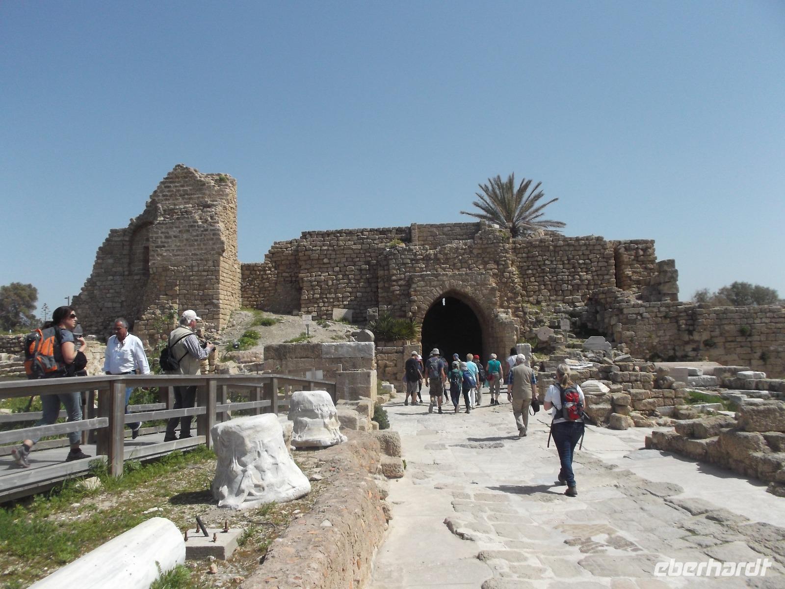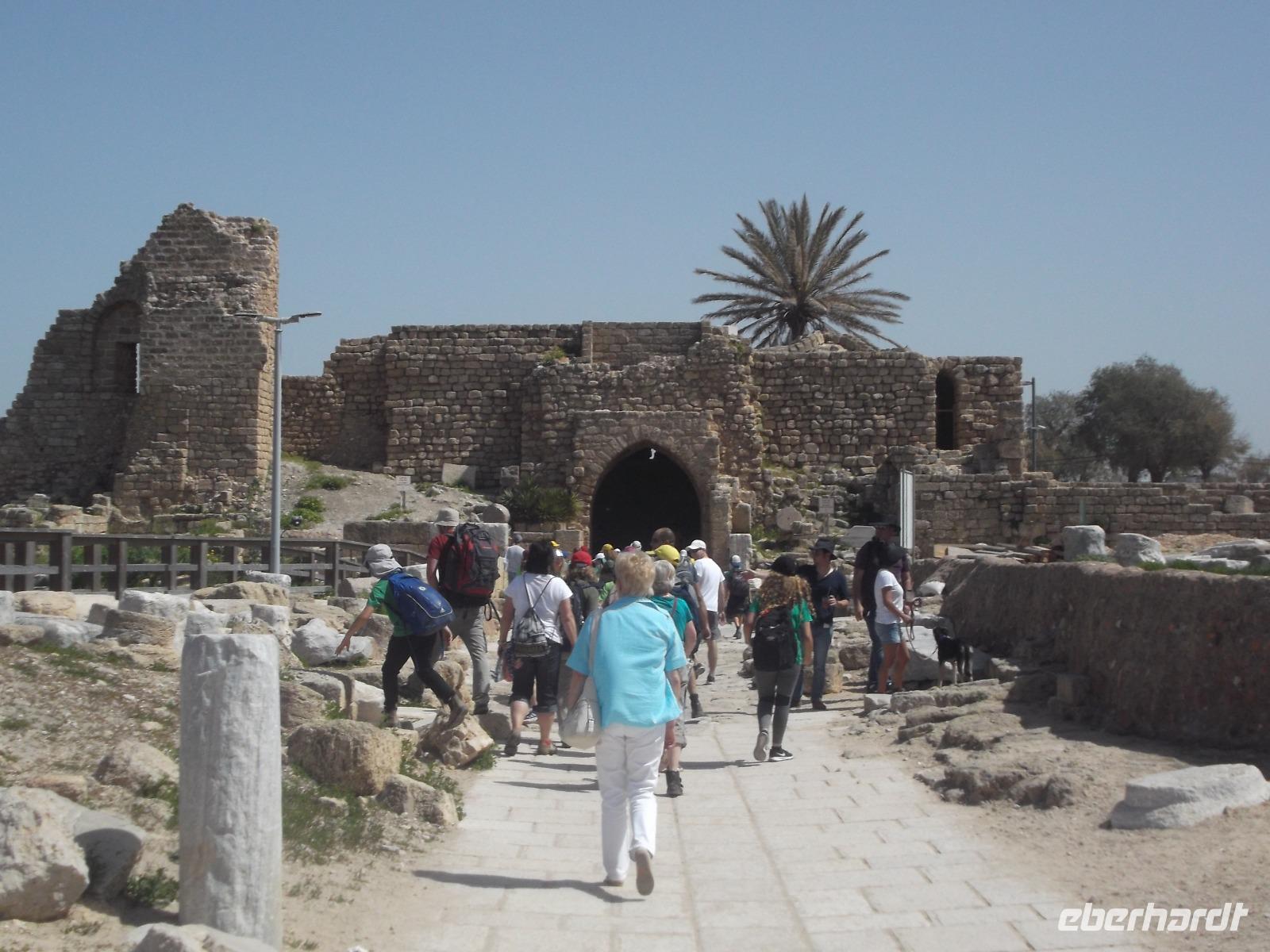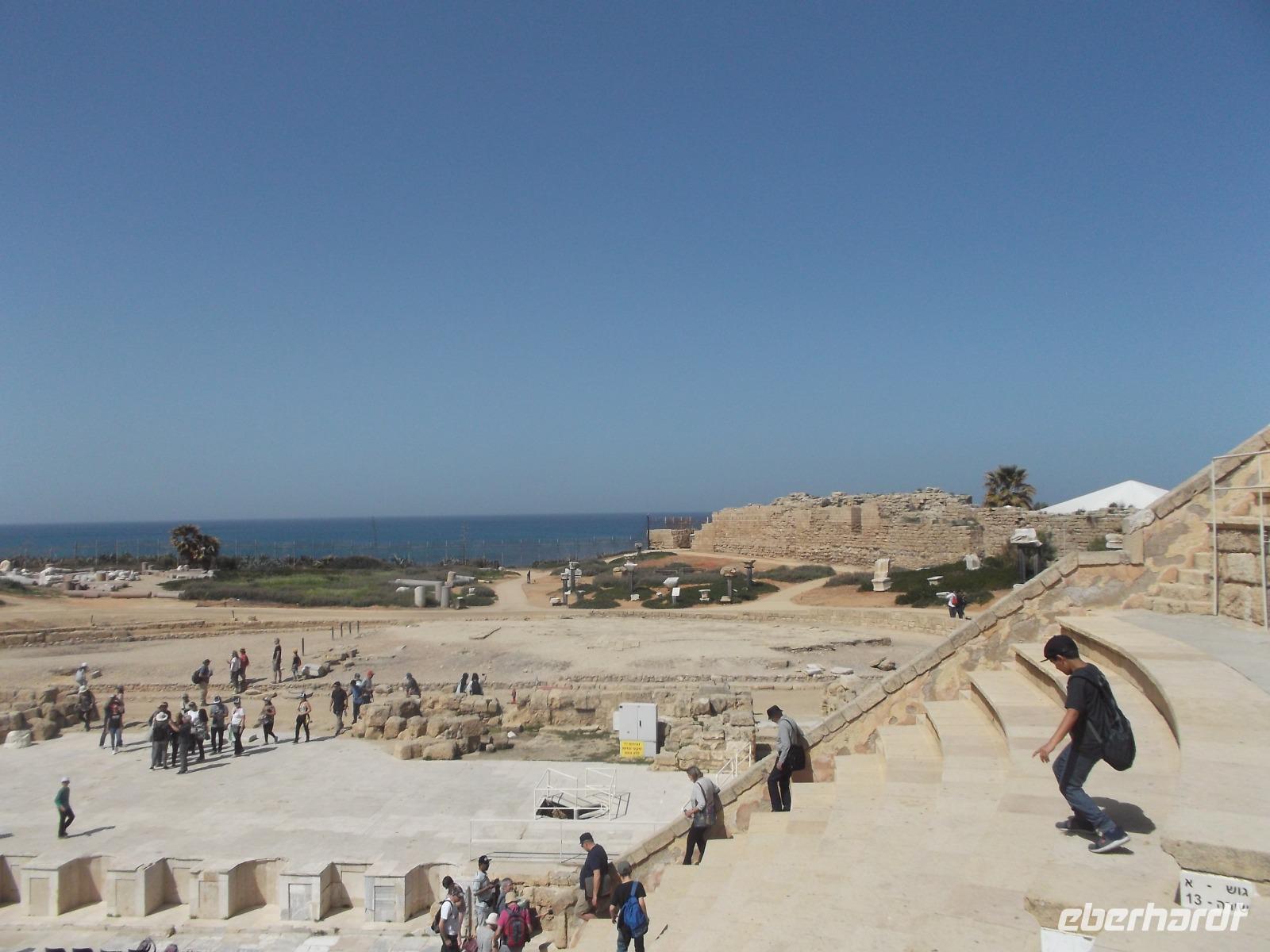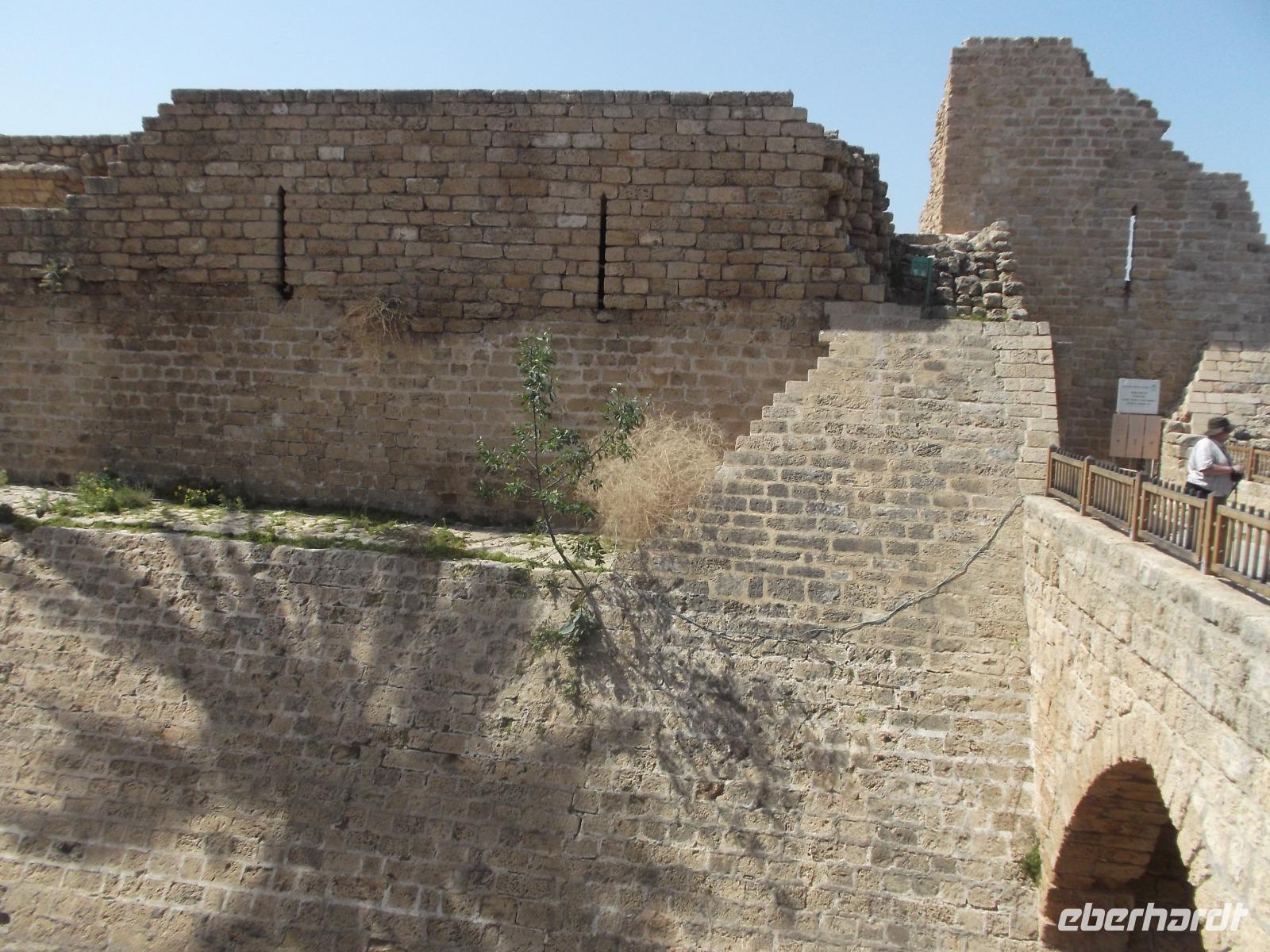 Das schöne Haifa verließen wir heute bereits wieder, um an der Mittelmeerküste entlang zu fahren. Unterwegs legten wir einen kurzen Fotostopp ein, der die Festung Atlit zeigte. Da sie als immer noch aktive Festung des israelischen Miltärs nicht für Besucher zugänglich ist, konnten wir nur von weitem den wuchtigen Festungsturm fotografieren. Als eine der größten Kreuzritterburgen im Heiligen Land Anfang des 13. Jh. von den Tempelrittern erbaut war das einstige Chateau Pelerin die einzige Festung, die nie erobert wurde. Zeitgleich mit dem Fall der Stadt Akkon wurde sie 1291 von ihrer Besatzung verlassen, da kein Nachschub mehr zu erwarten war. Nach einem weiteren Stopp mit kleinem Spaziergang zu den am Ufer des Mittelmeeres gelegenen Resten der Kreuzritterfestung Merle, ging es entlang der Mittelmeerküste nach Caesarea, das in römischer Zeit die größte Hafenstadt Israels war. Der Ort, heute eine der bedeutendsten Ausgrabungsstätten Israels, blickt auf eine lange, wechselhafte Geschichte zurück. Die Phönizier, Herodes der Große und der römische Kaiser Vespasian sind nur einige der Baumeister in dieser Stadt, die wie ein einziges gewaltiges Freilichtmuseum wirkt. Entscheidend war der Hafen, um den herum die antike Stadt entstand. Ihr berühmtes antikes Theater ist nicht nur Teil der Ausgrabungsstätte, sondern wird auch heute noch für Konzerte genutzt. Bei unserem interessanten Rundgang im heute als Nationalpark angelegten Ausgrabungsgelände sahen wir neben dem Theater und verschiedenen Resten von öffentlichen Bädern auch Überreste der alten Paläste und des gewaltigen Hippodroms, einer Kampfbahn für Pferde- und Wagenrennen. Später jedoch versandete der Hafen und die einst wohl bedeutendste Stadt der Region ging nieder - bis im 13. Jh. die Kreuzritter den Hafen erneut in Betrieb nahmen und die Stadt stark befestigten. Gut erhaltene Reste ihrer gewaltigen Stadtmauern sind bis heute zu sehen.
