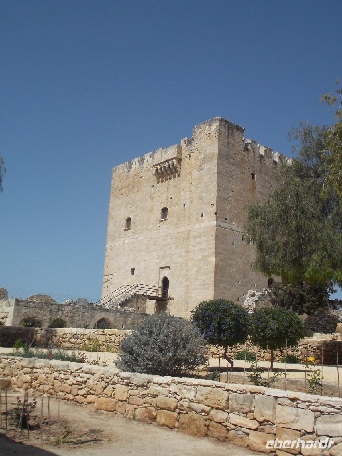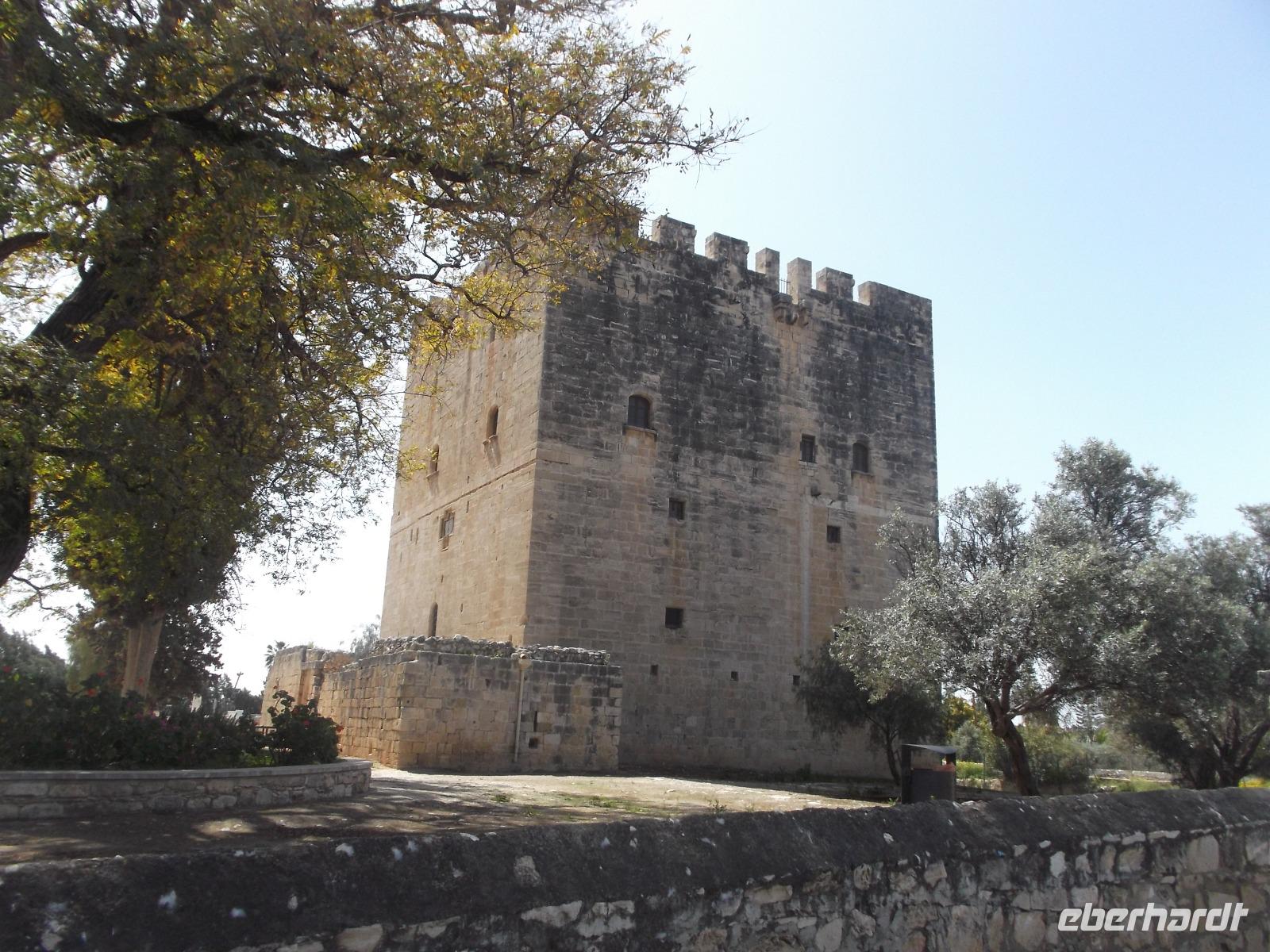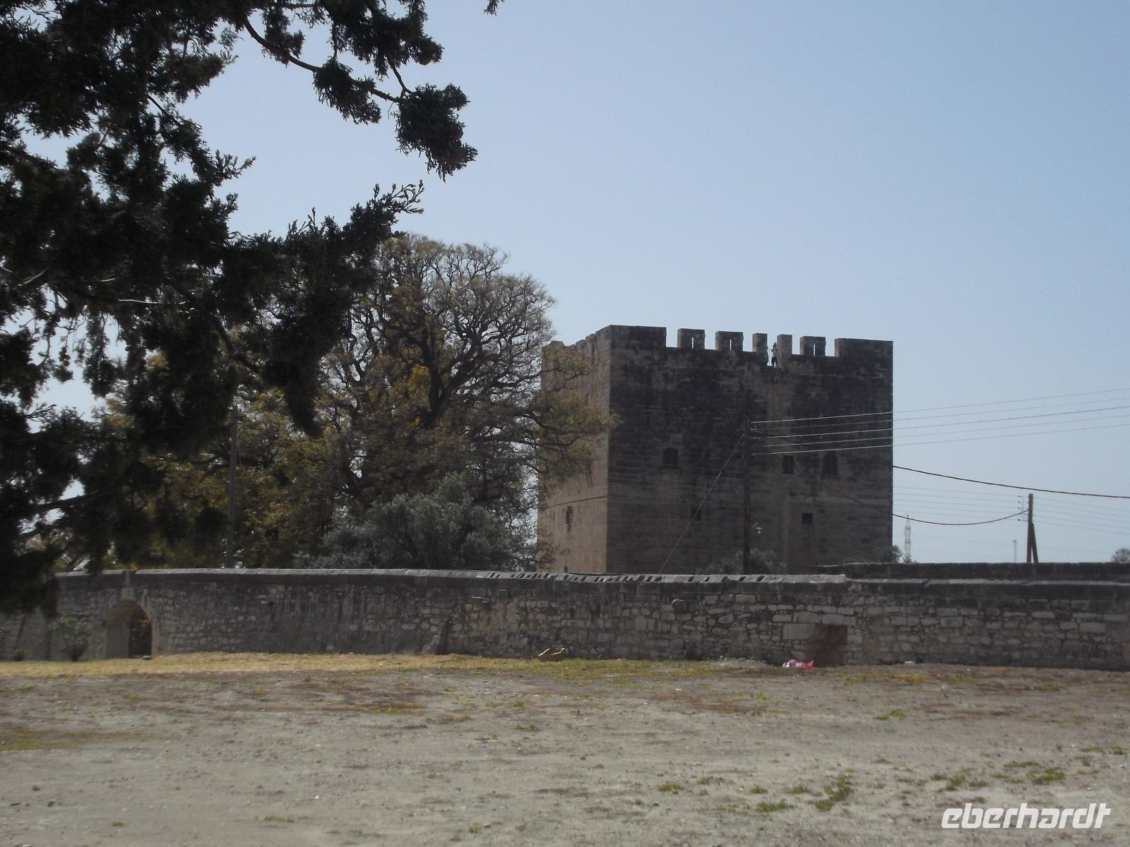 Von Kourion aus setzten wir unsere Besichtigungstour mit einem Abstecher nach Kolossi fort. Da wir ja auf den Spuren der Templer und der Kreuzritter wandelten, war dies die wichtigste diesbezügliche Sehenswürdigkeit in Zypern: eine Burg zur Verwaltung von Südzypern durch die Kreuzritter, und von höchster strategischer Bedeutung für die Ritterorden. Sie wurde als Sitz der Templer und der Johanniter genutzt, außerdem wurde hier Zuckerrohr verarbeitet und Zucker als eines der wichtigsten Exportgüter Zyperns im Mittelalter gelagert. Nach dem Fall der Stadt Akkon im Heiligen Land hatten sich die Johanniter und die Tempelritter hierher zurückgezogen und für einige Jahre war Zypern der Hauptsitz beider Orden, bis 1307 die Templer durch den französischen König verfolgt und 1312 nach Papstbeschluss aufgelöst wurden und die Johanniter sich ihrem neuen Hauptsitz auf Rhodos zuwandten. Die Hochburg ist eines der schönsten Zeugnisse mittelalterlicher Militärarchitektur auf Zypern, im 13. Jh. als „Donjon" (französisch etwa soviel wie „Bergfried") errichtet und im 15. Jh. zu seiner heutigen Form umgebaut. Die neben der Burg liegende Zuckerfabrik ist eines der frühesten gotischen profanen Hallenbauwerke in Europa und die kleine, ganz in der Nähe liegende byzantinische Kreuzkuppelkirche mit ihrem winzigen Vierungsturm aus dem 12. Jh. ist ein ebensolches Kleinod.