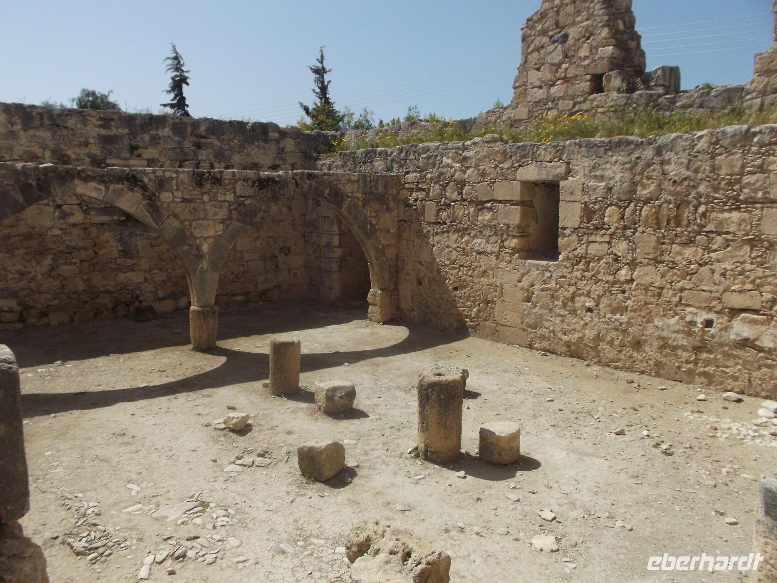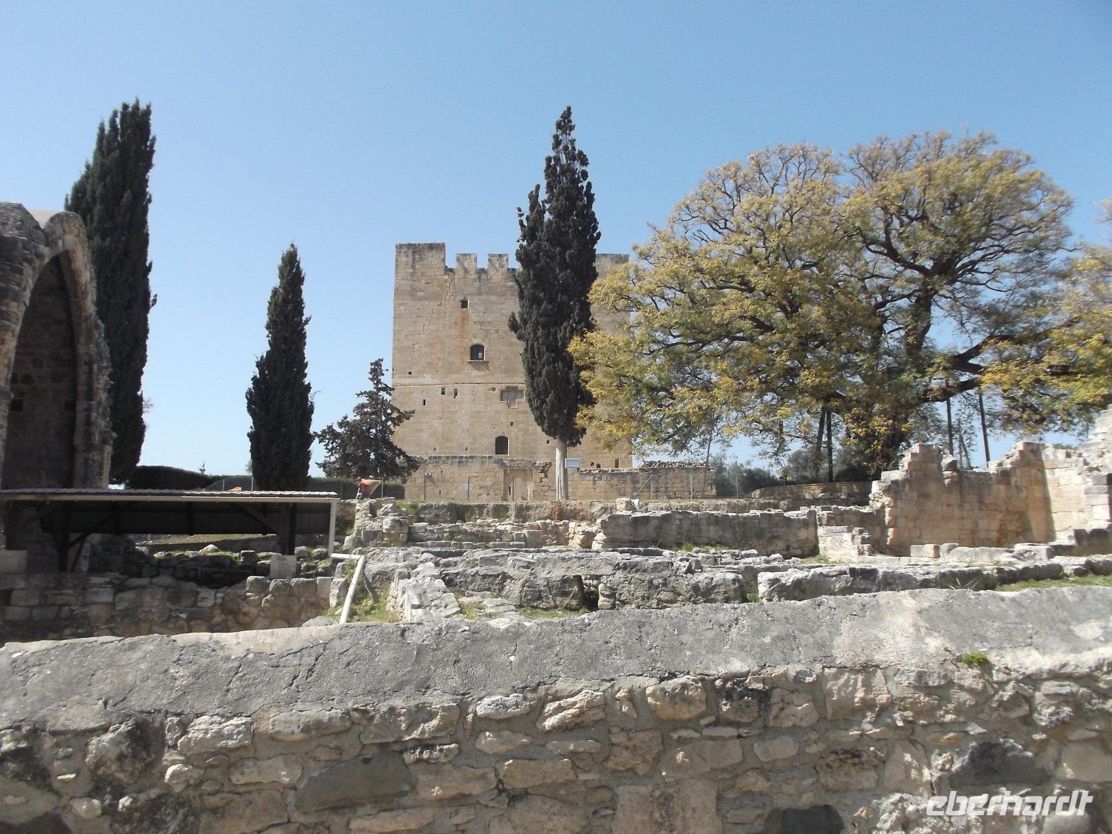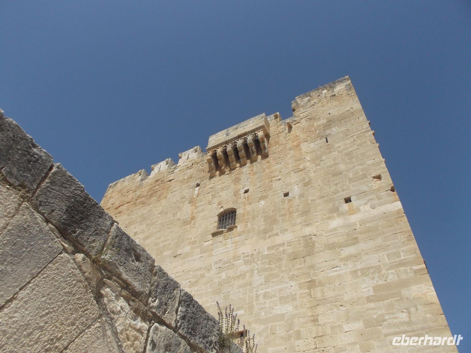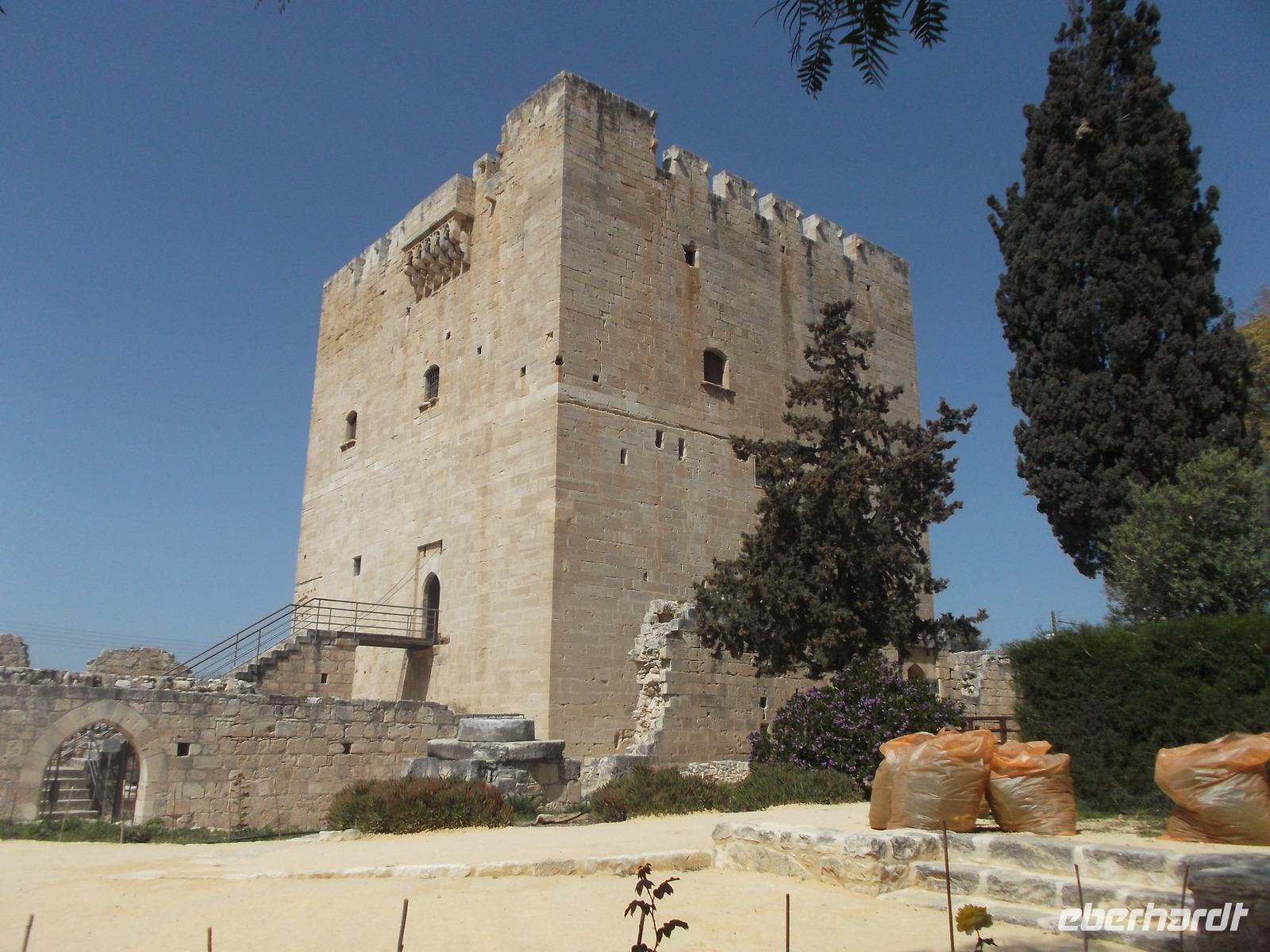 Von Kourion aus setzten wir unsere Besichtigungstour mit einem Abstecher nach Kolossi fort. Da wir ja auf den Spuren der Templer und der Kreuzritter wandelten, war dies die wichtigste diesbezügliche Sehenswürdigkeit in Zypern: eine Burg zur Verwaltung von Südzypern durch die Kreuzritter, und von höchster strategischer Bedeutung für die Ritterorden. Sie wurde als Sitz der Templer und der Johanniter genutzt, außerdem wurde hier Zuckerrohr verarbeitet und Zucker als eines der wichtigsten Exportgüter Zyperns im Mittelalter gelagert. Nach dem Fall der Stadt Akkon im Heiligen Land hatten sich die Johanniter und die Tempelritter hierher zurückgezogen und für einige Jahre war Zypern der Hauptsitz beider Orden, bis 1307 die Templer durch den französischen König verfolgt und 1312 nach Papstbeschluss aufgelöst wurden und die Johanniter sich ihrem neuen Hauptsitz auf Rhodos zuwandten. Die Hochburg ist eines der schönsten Zeugnisse mittelalterlicher Militärarchitektur auf Zypern, im 13. Jh. als „Donjon" (französisch etwa soviel wie „Bergfried") errichtet und im 15. Jh. zu seiner heutigen Form umgebaut. Die neben der Burg liegende Zuckerfabrik ist eines der frühesten gotischen profanen Hallenbauwerke in Europa und die kleine, ganz in der Nähe liegende byzantinische Kreuzkuppelkirche mit ihrem winzigen Vierungsturm aus dem 12. Jh. ist ein ebensolches Kleinod.