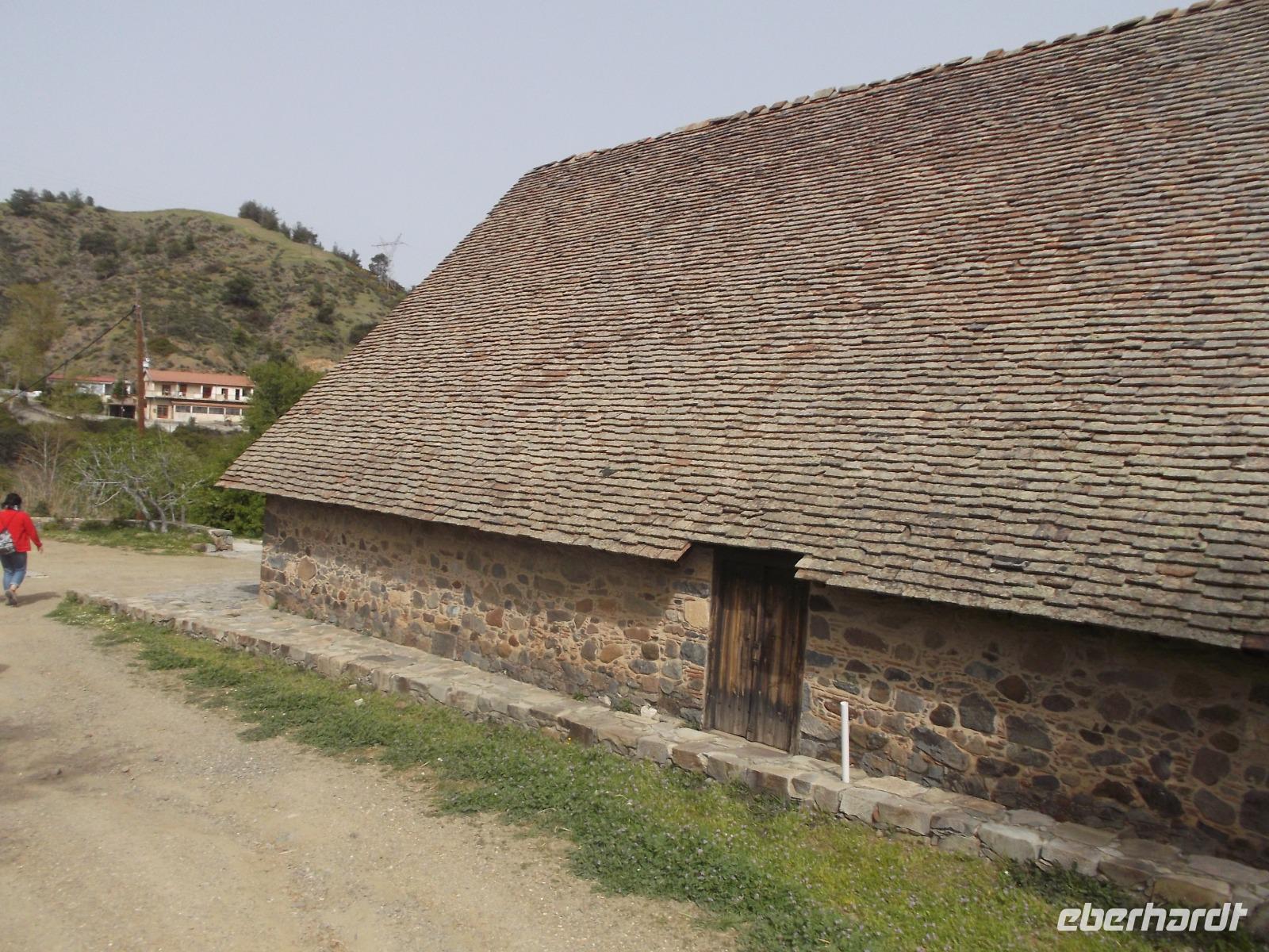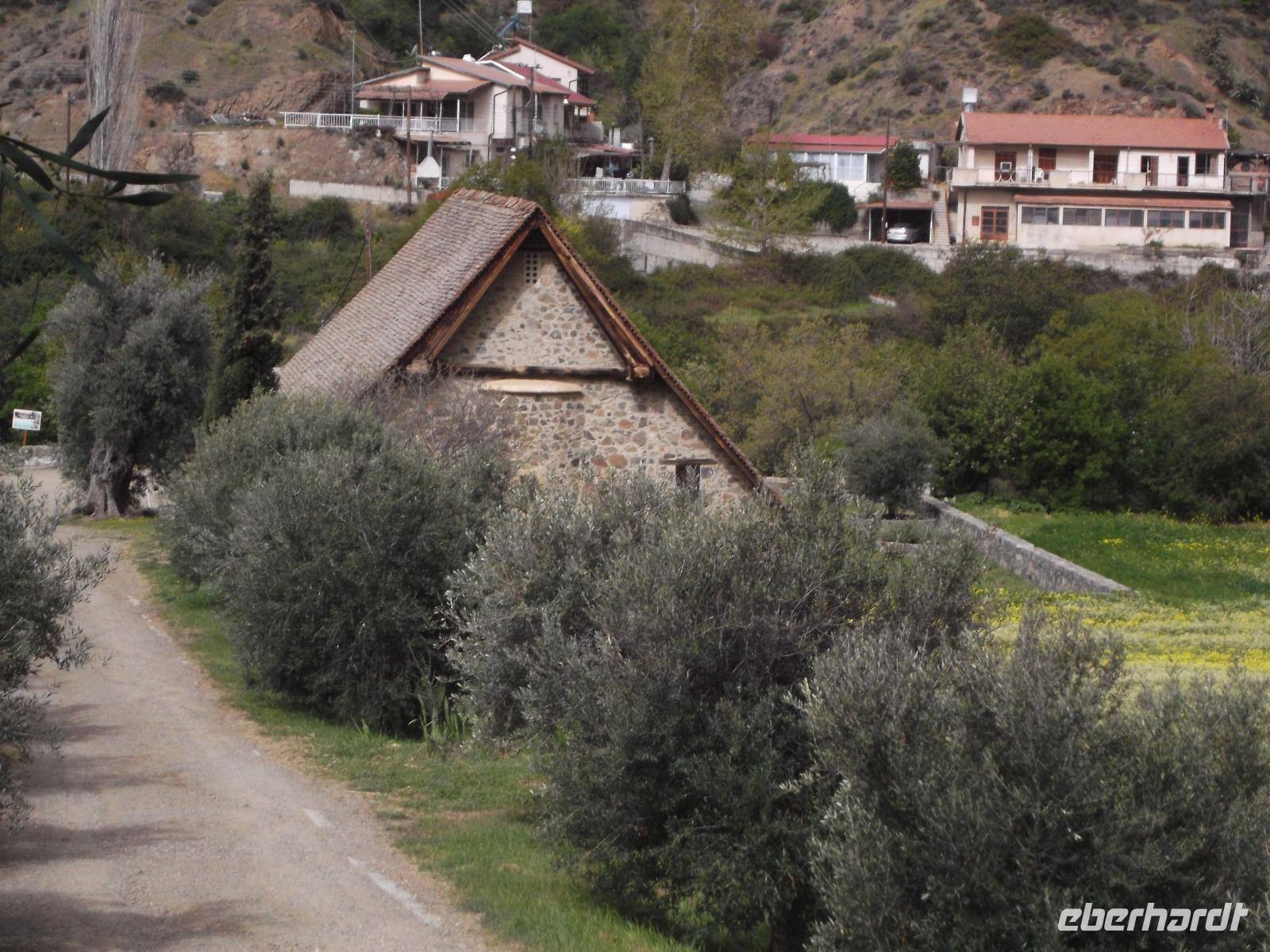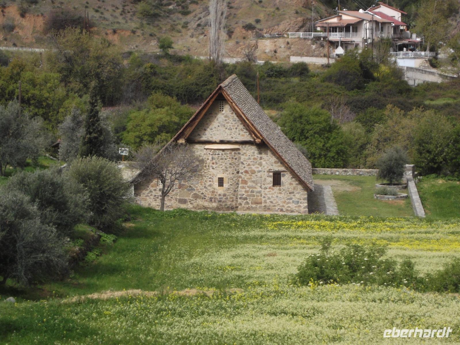 In der Nähe des historischen Dorfes Kakopetria liegt die dem Heiligen Nikolaus von Myra geweihte Scheunendachkirche Agios Nikolaos tis Stegis. Wir besuchten diesen UNESCO-Welterbe-Bau, der einige Besonderheiten aufweist. Bereits im 11. Jh. wurde das Kirchlein im byzantinischen Stil mit kleinem Vierungsturm erbaut, später erweitert und mit einem alles überdeckenden Scheunendach versehen. Fresken aus sechs Jahrhunderten schmücken ihr Inneres, die ältesten aus dem 12. Jh. von einem offensichtlich professionellen Ikonenmaler. Eine große Besonderheit neben Darstellungen aus dem Leben des Schutzpatrons St. Nikolaus ist ein Fresko, das die stillende Maria zeigt - ein ungewöhnliches und in der Geschichte der Kirchenmalerei zwar nicht einzigartiges, aber doch eher seltenes Motiv.