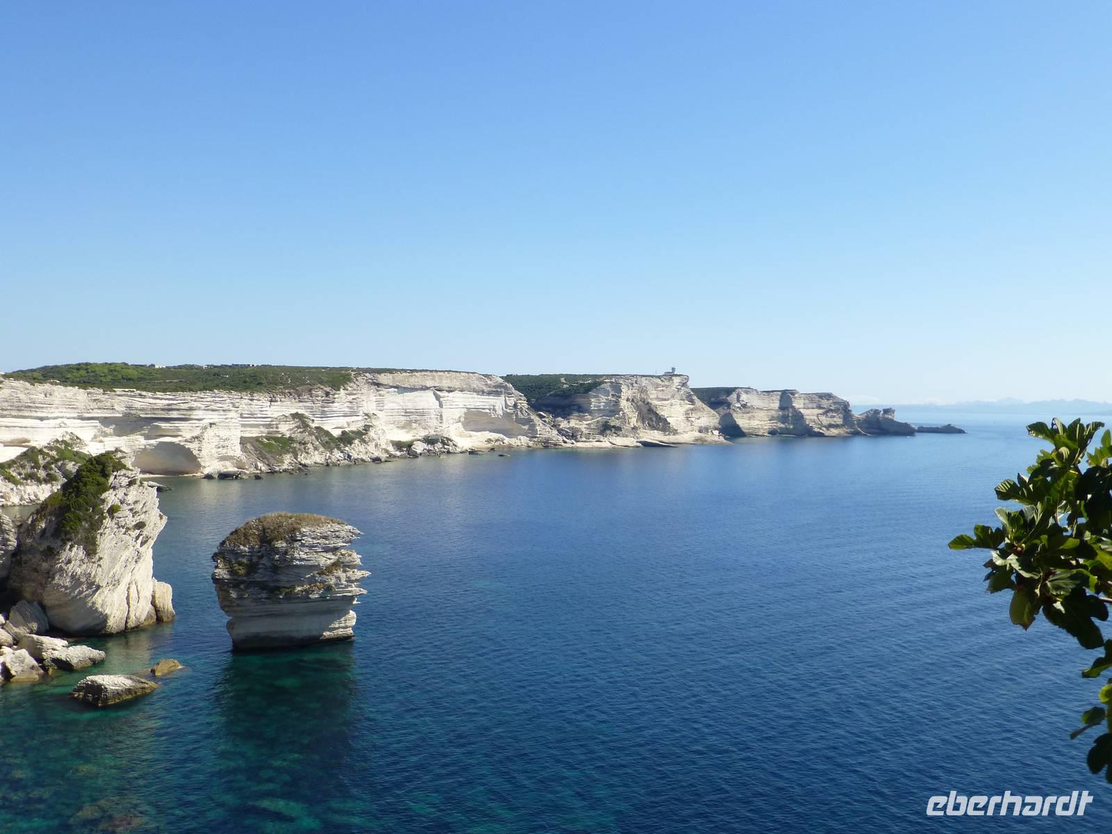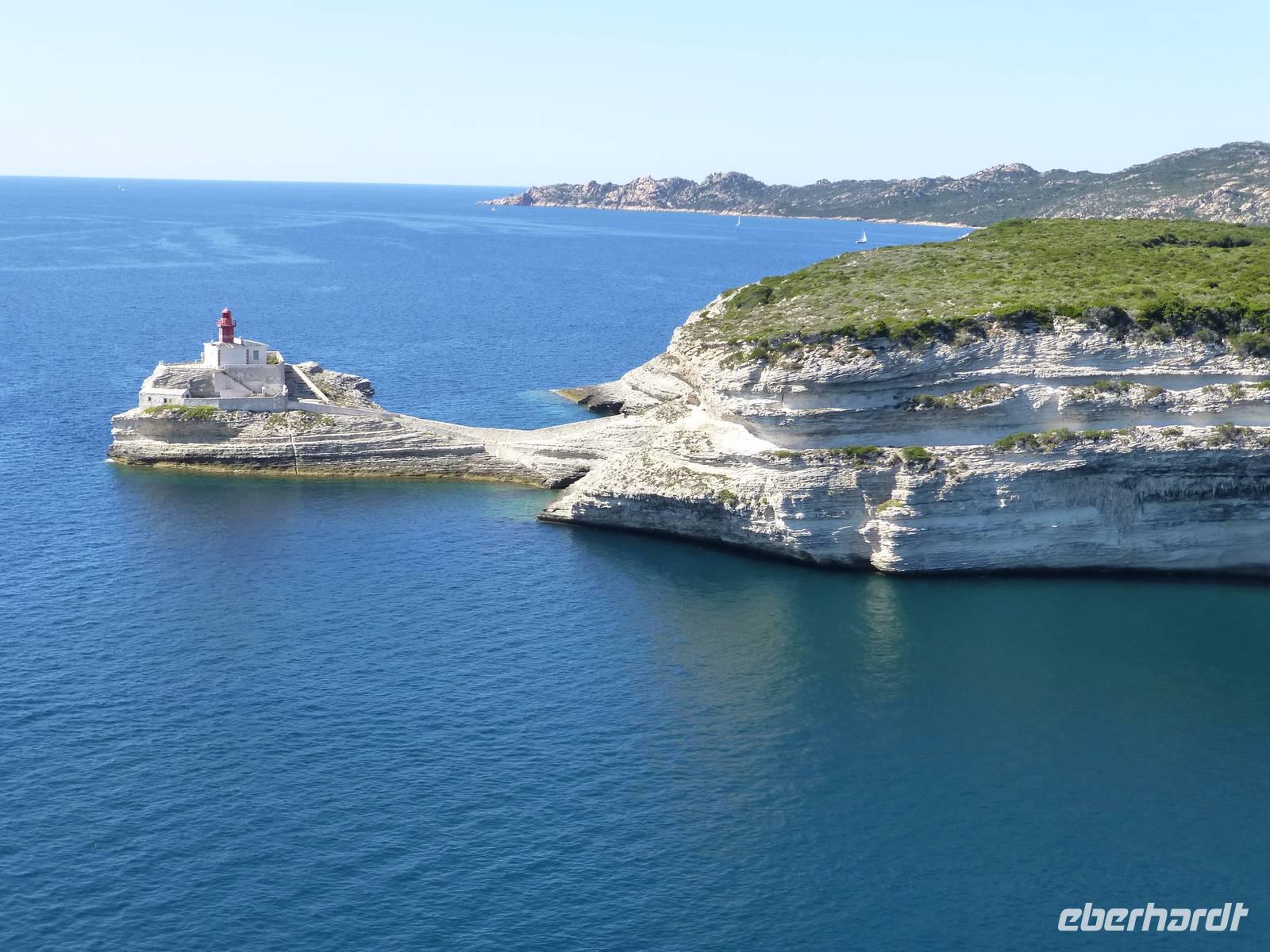 Dieser Tag begann recht früh am Morgen, denn wir wollten unsere Fähre nach Korsika nicht verpassen. Entlang der Nordwestküste Sardiniens fuhren wir Richtung Castelsardo. Dort wartete der bekannte und viel fotografierte Roccia dell´Elefante auf unseren Besuch. Der rund zehn Meer hohe, zu einem skurrilen Elefanten verwitterte Trachytfels, der seinen Rüssel weit über die Leitplanke schwingt, birgt mehrere Felskammergräber aus der Ozieri-Kultur. Von Santa Teresa Gallura setzten wir mit der Fähre über die Meerenge von Bonifacio nach Korsika über. Wir hatten Windstärke 4 - 5. Schon von weitem bekamen wir einen phantastischen Eindruck von der südlichsten Stadt Korsikas. Die Altstadt liegt auf einem weit ins Meer ragenden schmalen Felsrücken. Wir konnten die Treppe des Königs von Aragon sowie die Napoleonsgrotte vom Schiff aus bewundern. Bei unserem Spaziergang durch die mittelalterliche Altstadt entdeckten wir u.a. die Zitadelle, die Straße der zwei Kaiser (Napoleon und Karl V.) sowie die Loggia, die gleichzeitig der Eingang zur Hauptkirche darstellt. Das Panorama auf die Kalksteinklippen bis hin zum Pertusatokap war überwältigend.