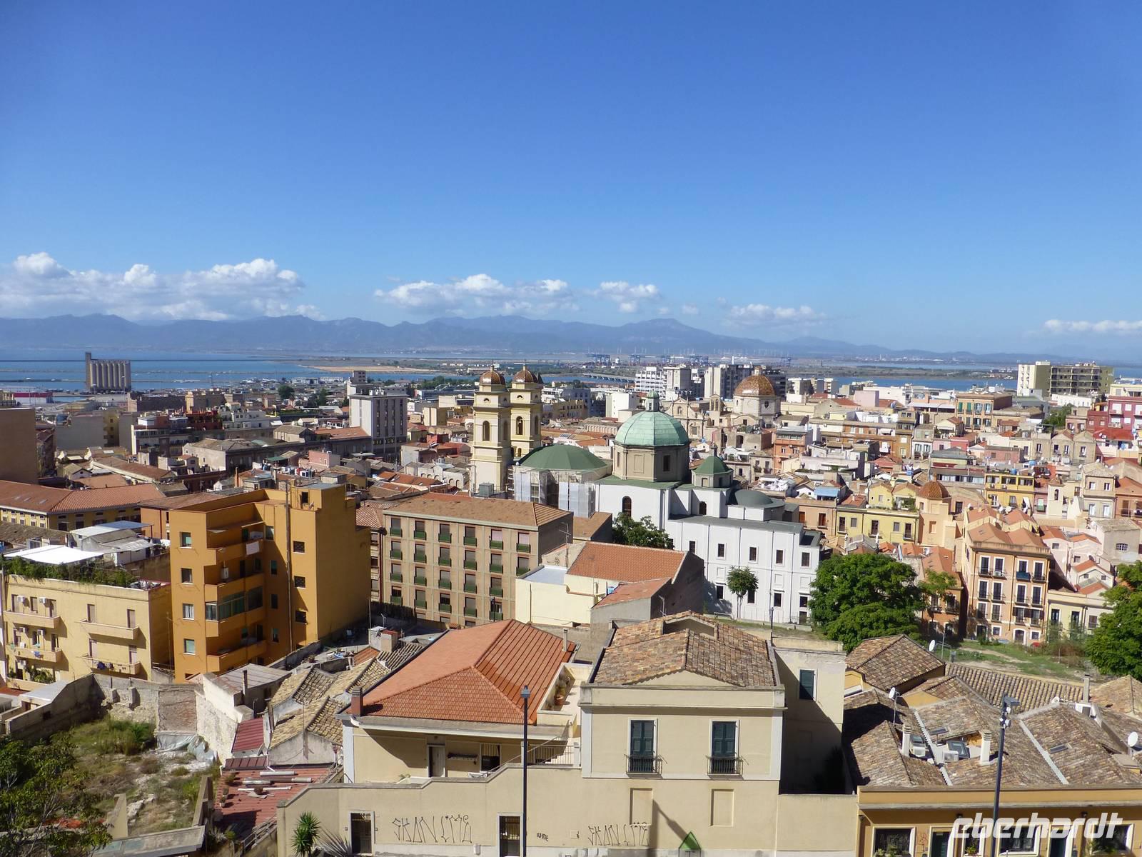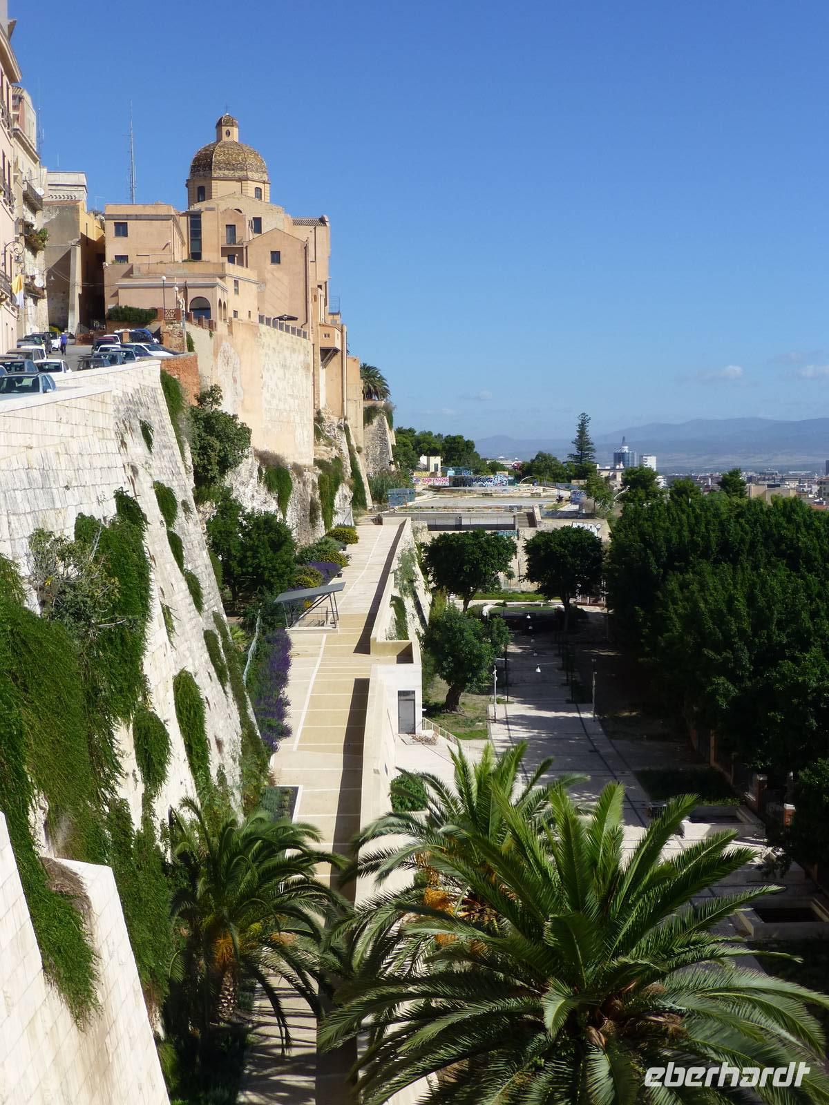 Durch das Stadtzentrum erreichten wir das Castello (Altstadt). Durch das mächtig Tor vom Torre S. Pancrazio erreichten wir die Altstadt. Auf unserem Rundgang besichtigten wir die Kathedrale Santa Maria di Castello. Bei dieser Besichtigung ließen wir auch die bekannte Krypta nicht aus. Besonders eindrucksvoll ist das mit unzähligen Rosetten verzierte Tonnengewölbe. Vorbei am Elefantenturm, der seinen Namen nach einer Marmorstatue, einem kleine Elefanten als Sinnbild von Weisheit und Stärke erhalten hat, verließen wir die Altstadt und erreichten den Platz Yenne. Auf diesem lebhaften Platz steht eine Ziersäule aus rotem Porphyr, davor erhebt sich das Standbild König Carlo Felice, des Auftraggebers der hier beginnenden Schnellstraße Cagliari - Porto Torres.