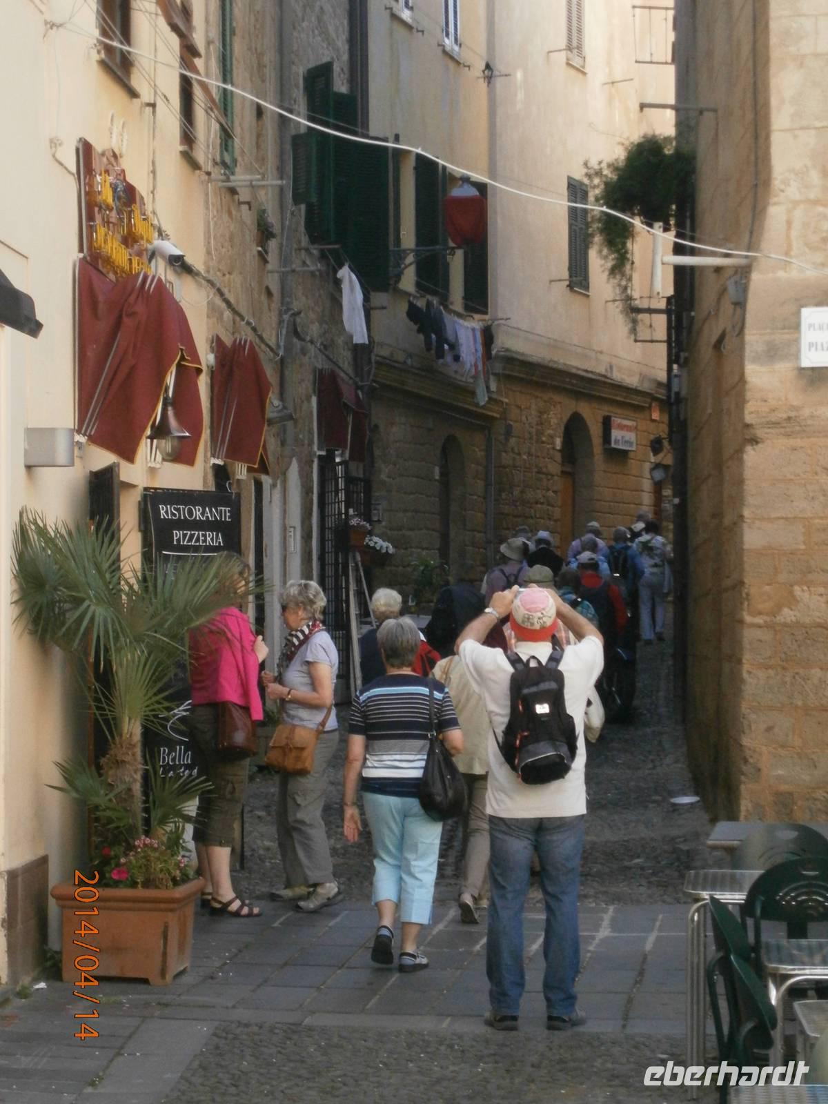 Am heutigen Tag erkundeten wir mit unserer Reiseleitung Cidalia die Stadt Alghero. Die Altstadt der spanischsten Stadt der Insel liegt gedrängt auf einer Landzunge umgeben von der Festungsmauer. Trotz der schweren Zerstörungen des Zweiten Weltkrieges ist das Zentrum der Altstadt zum größten Teil intakt. Während unseres Stadtrundganges sahen wir Piazza Civica, der „guten Stube" der Bürger von Algheros. Wir gelangten zur Kathedrale Santa Maria mit ihrem ungewöhnlich achteckigen Glockenturm. Durch die Altstadtgassen erreichten wir die San Francesco Kirche. Hinter der schlichten Fassade verbirgt sich ein sehenswertes Inneres sowie ein, aus 22 Säulen bestehender Kreuzgang aus Sandstein.