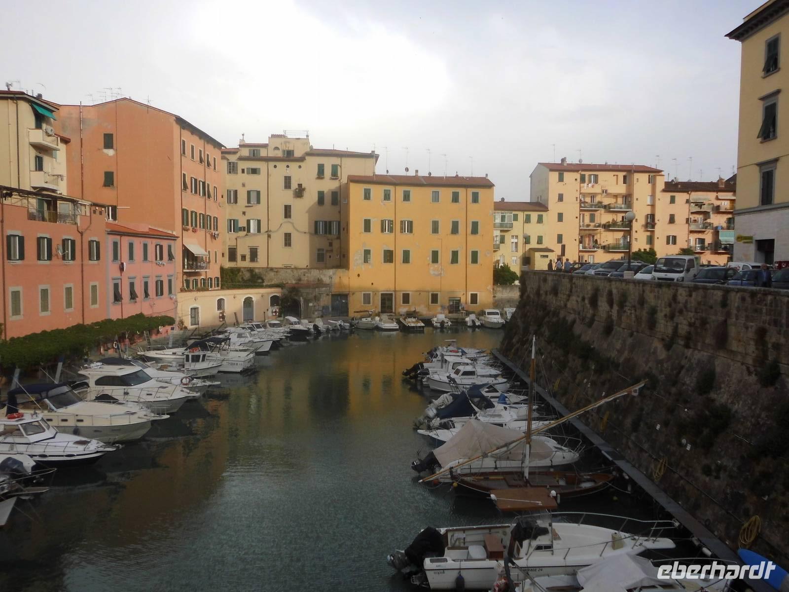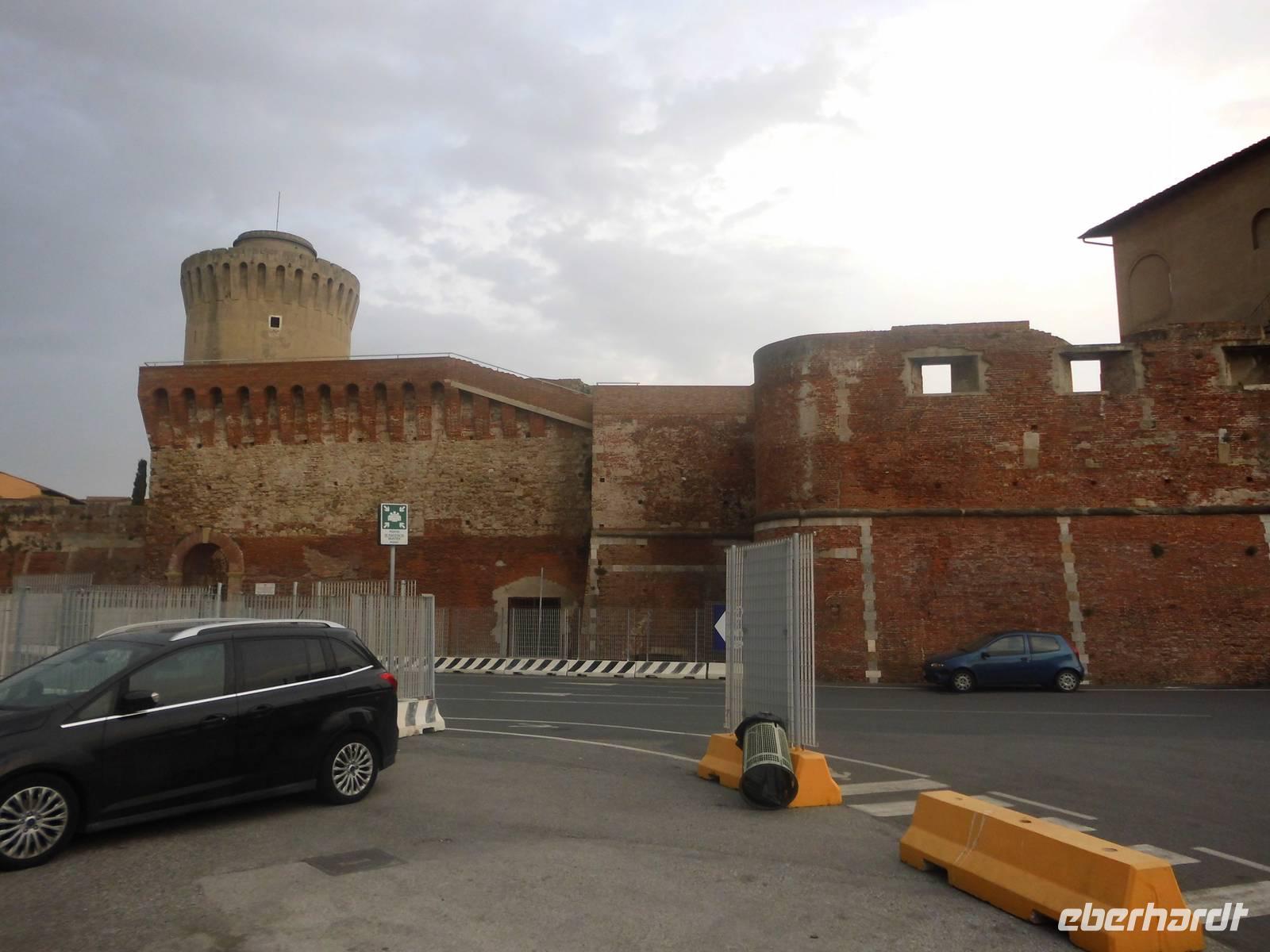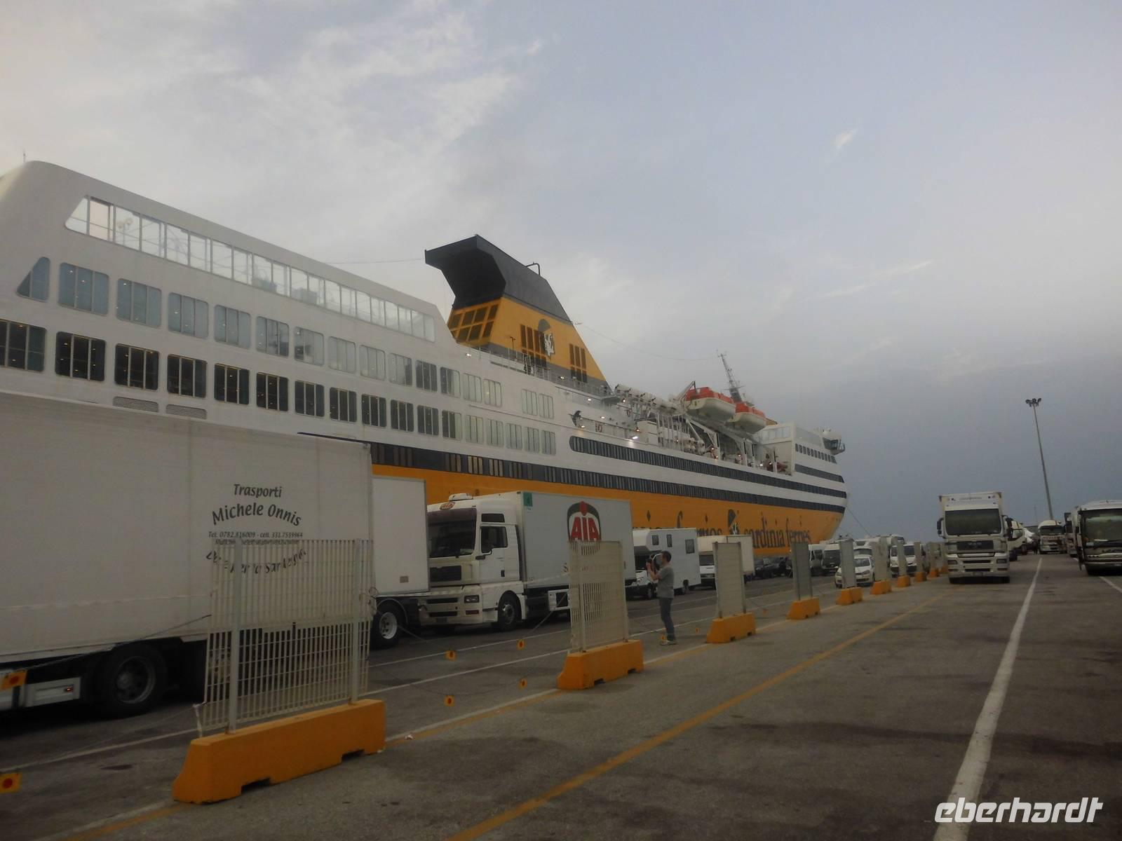 Der neue Handelshafen schlägt Öl, Container und Autos um und der historische alte Hafen nahe der Altstadt, dem Florentiner Geschlecht der Medici nach bis heute „Porto Mediceo" genannt, ist Anlegeort für Kreuzfahrtschiffe, vor allem aber das „Tor" nach Sardinien, Korsika und Inseln des Toskanischen Archipels. Die recht großzügig angelegte Altstadt wird noch immer von zwei großen Festungen beherrscht, hinter der älteren davon lag unser Fährschiff. Zunächst hatten wir noch eine Stunde Zeit, um uns ins Getümmel des auf der zentralen Piazza della Repubblica stattfindenden Volksfestes zu stürzen, uns die Stadt etwas anzusehen oder noch etwas zu essen, falls man dies nicht im Schiffsrestaurant tun wollte. Dann wurde es Zeit für den Aufbruch zum Hafen, wo wir nach Check in am Ticketoffice zu Fuß an Bord des Fährschiffes „Mega Express" gelangten. Nach kurzem Warten an der Bordrezeption konnte ich auch die Frühstücksvoucher ausgeben und wir bezogen unsere Kabinen.