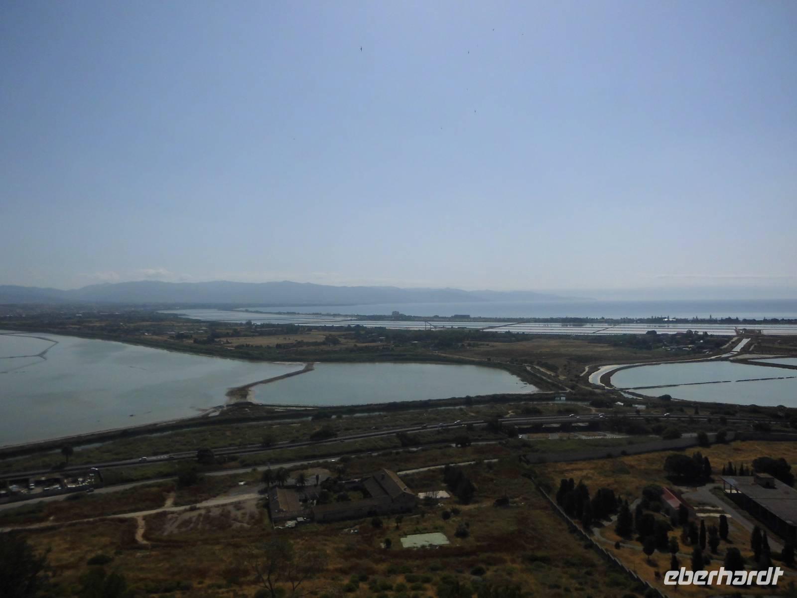 Unsere örtliche Stadtführerin trafen wir auf dem Weg vom Hotel zur Innenstadt. Kaum eingestiegen, entführte sie uns zunächst an den Strand von Poetta mit der dahinterliegenden Lagune, in der sich zahllose Flamingos tummelten. Strand und Lagune waren auch vom Aussichtspunkt Monte Urbino, unserem nächten Ziel, sehr gut zu sehen und natürlich auch die Stadt Cagliari, die sich weithin in um Zentrum verstreuten Siedlungen erstreckt. Nächstes Zielk war die „Basilika", die viel Besuchte Wallfahrtskirche „Unsere liebe Frau von Bonaria". Auf einer Anhöhe gelegen, von der eine breite Freitreppe zum Ufer hinunterführt, ist die Barockfassade von unten ebenso gut zu sehen wie von oben der „Engelsgolf", der vorgelagerte „Golfo degli angeli". Hier soll der namengebenden Legende zufolge im 14. Jh. bei einem Sturm eine Kiste mit einer Madonnenfigur angespült worden sein, in deren Hand noch die Kerzen brannten, als die Bewohner die Kiste öffneten. Die Madonna wurde Schutzpatronin der Fischer und Seeleute und schließlich von ganz Sardinien, ihre Kirche „Nostra Signora di Bonaria" zu den meistbesuchten Heiligtümern der Insel.